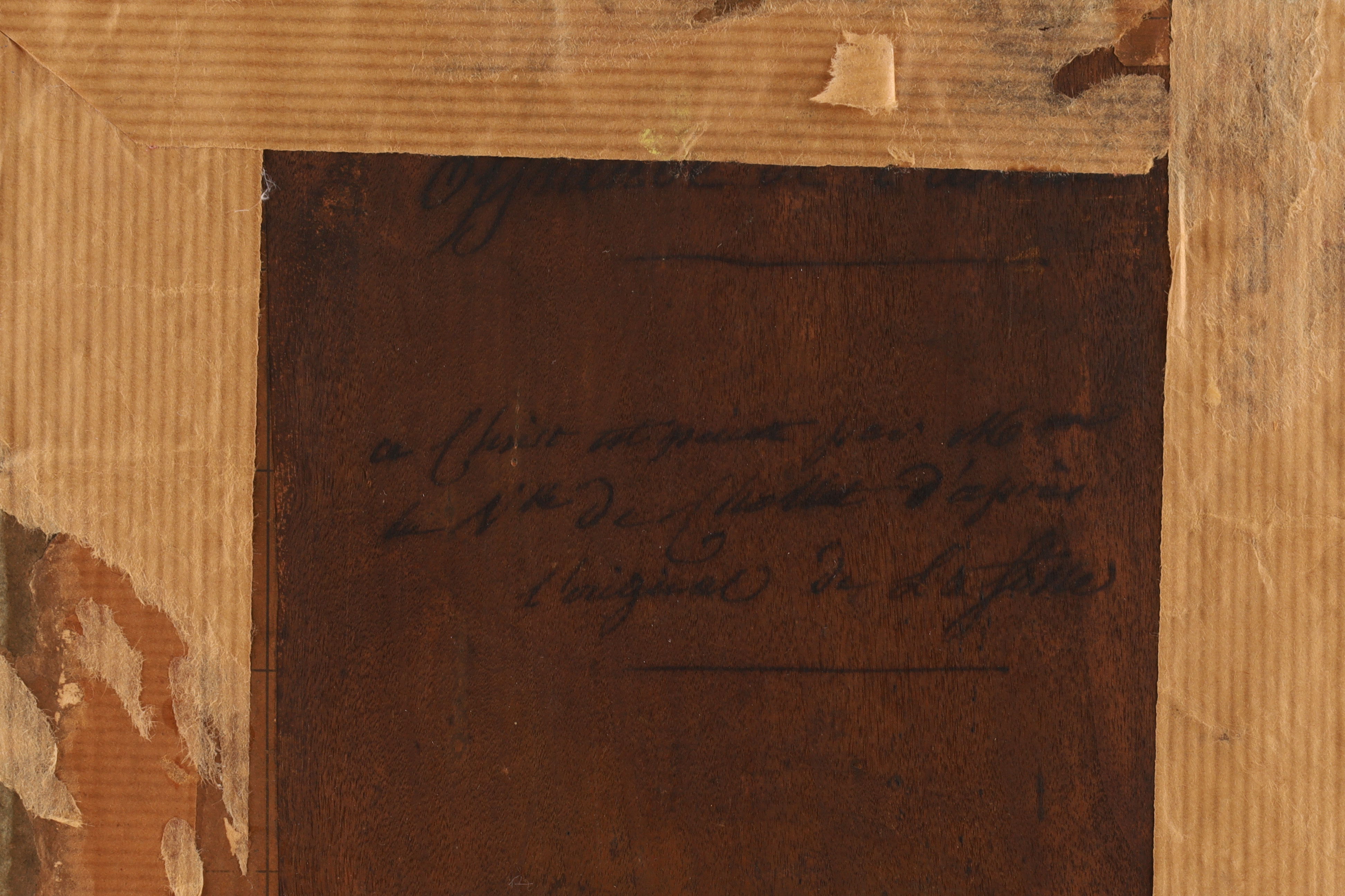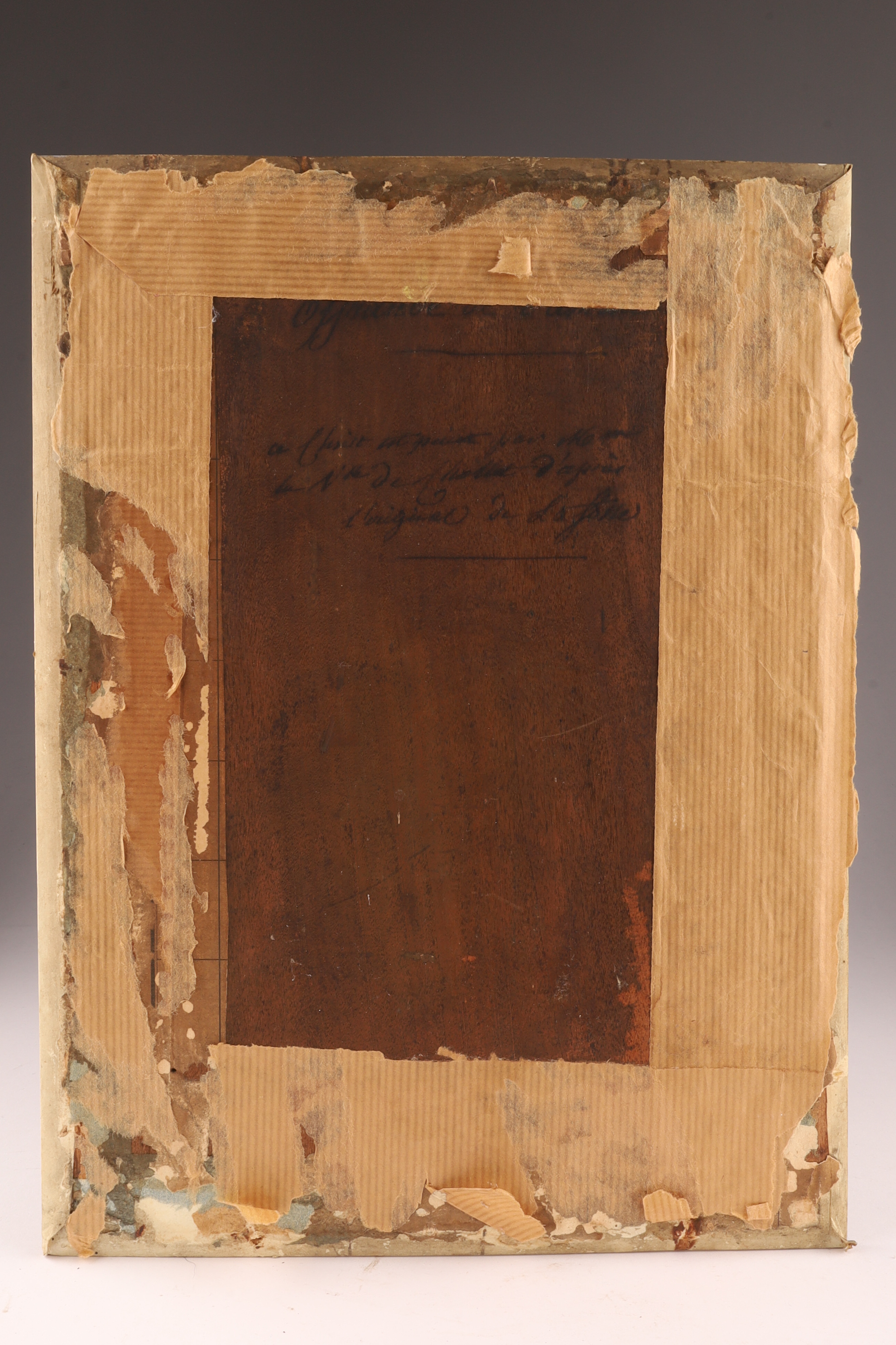 The reverse bears a contemporary inscription reading « a été copié par Monsieur De La Fosse d’après l’original de Le Sueur », referencing a member of the distinguished De La Fosse / Delafosse artistic lineage—possibly Charles de La Fosse (1636-1716), painter to Louis XIV, or Jean-Charles Delafosse (1734-1791), architect and designer of the Louis XVI period. This inscription situates the piece within the French academic tradition of reproducing revered masters for study and devotion.
