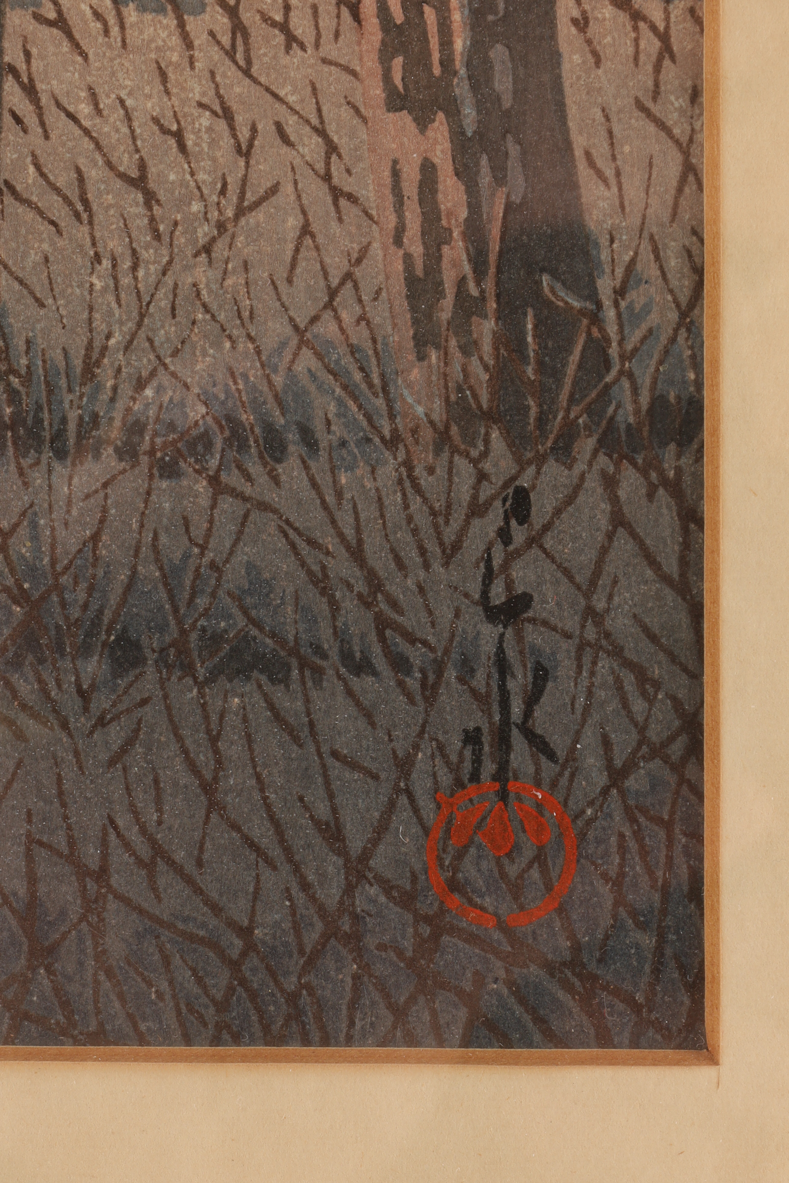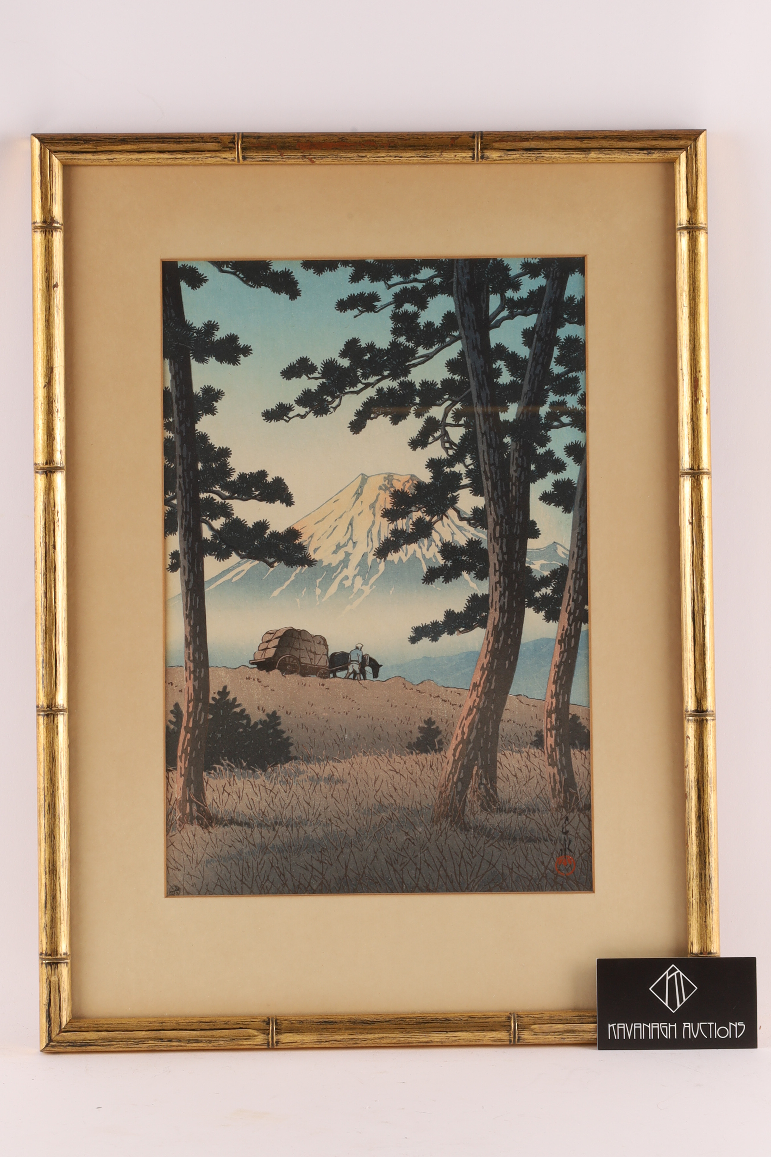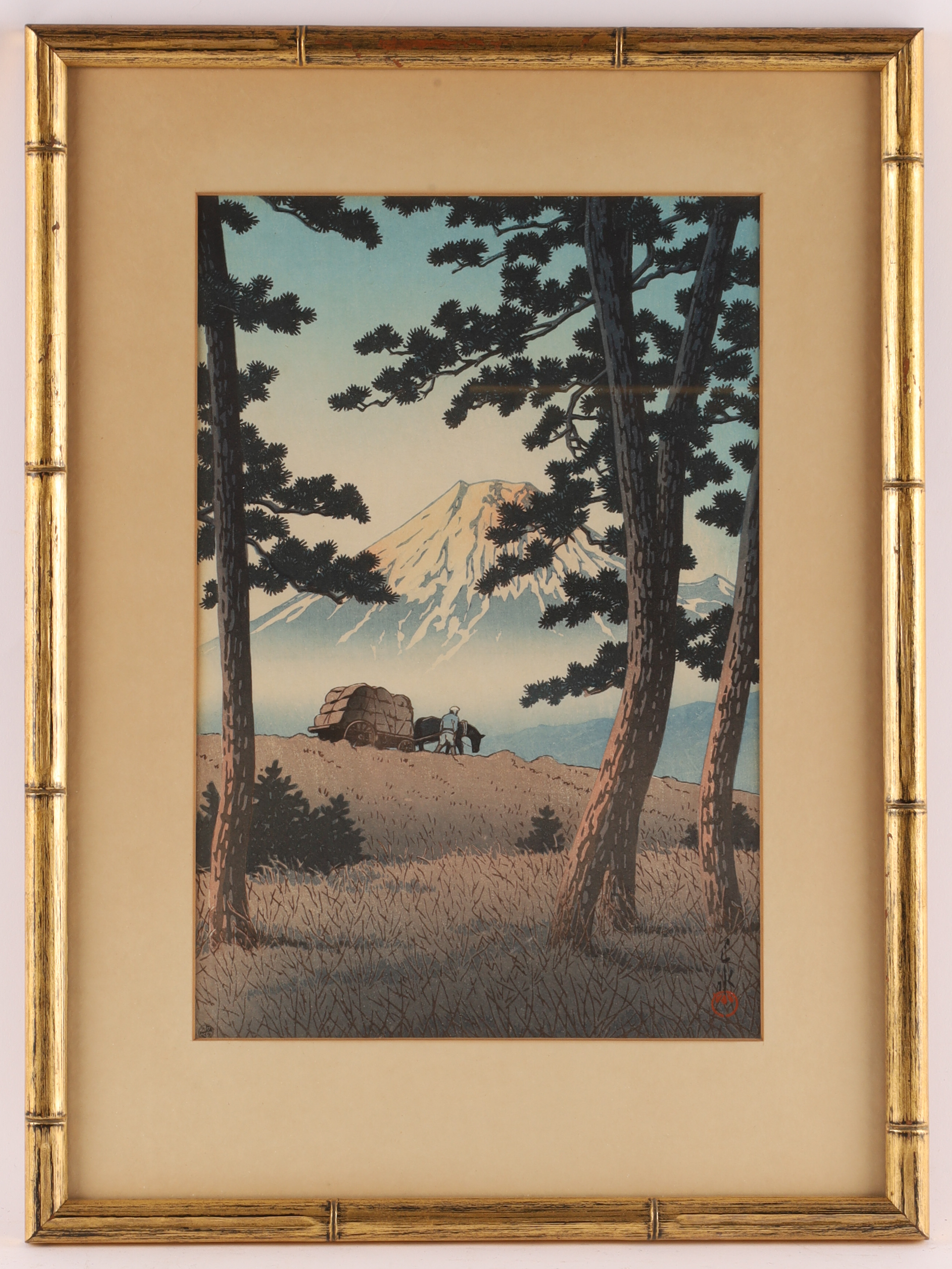 Japanese Woodblock Print Kawase Hasui (1883-1957), Evening at Tagonoura. Image measures 14 inches H x 9.5 W, frame measures 20 x 15 inches.