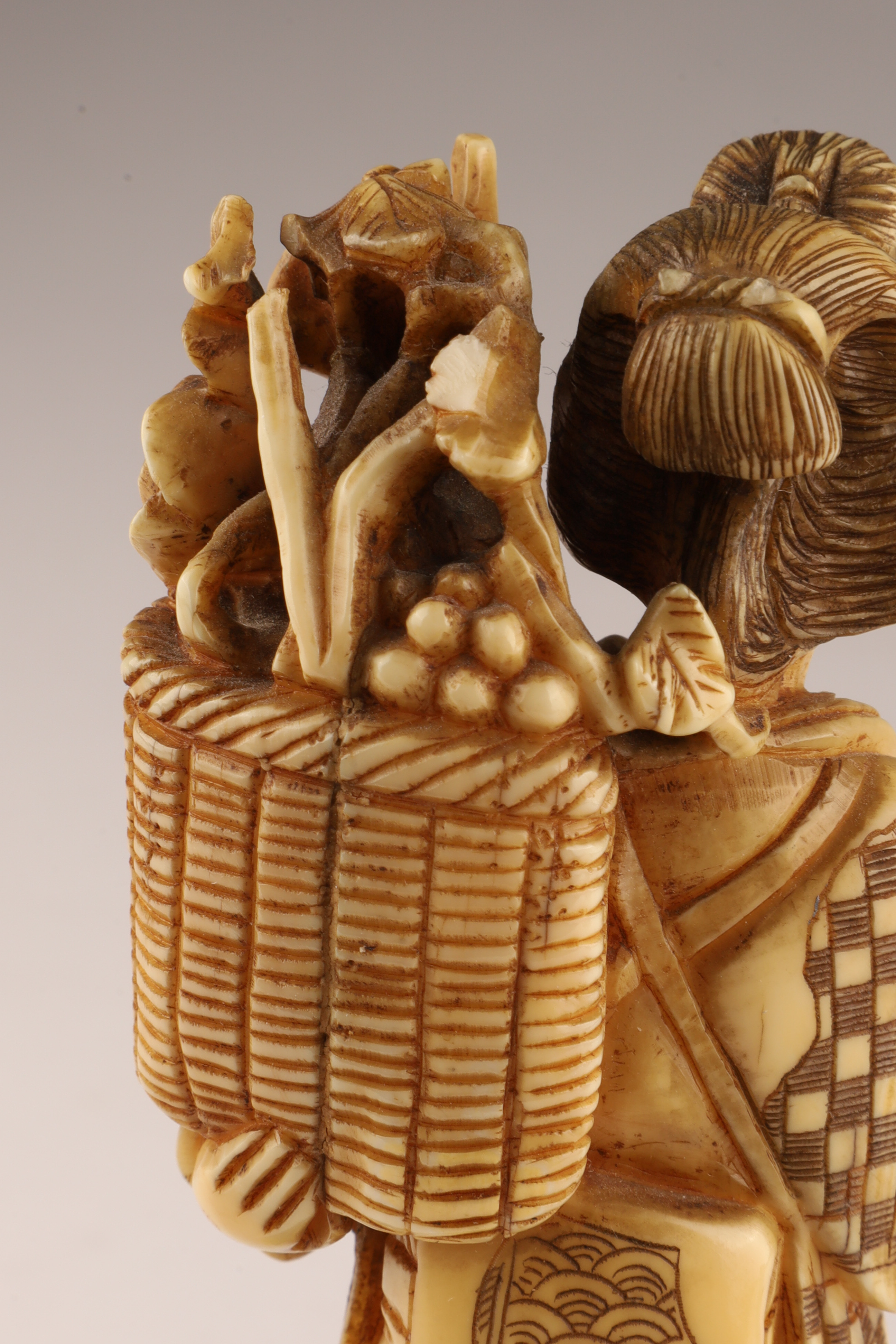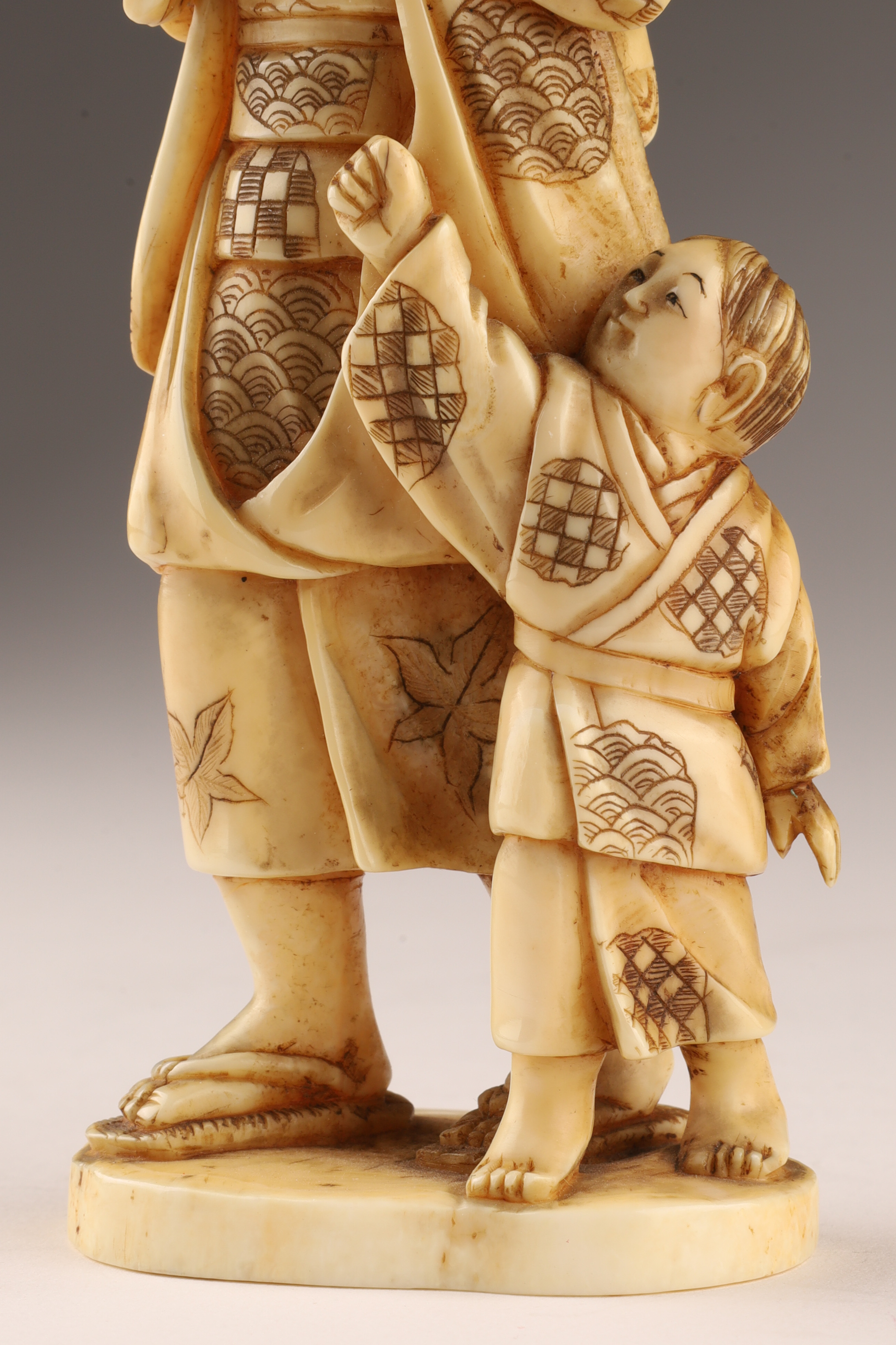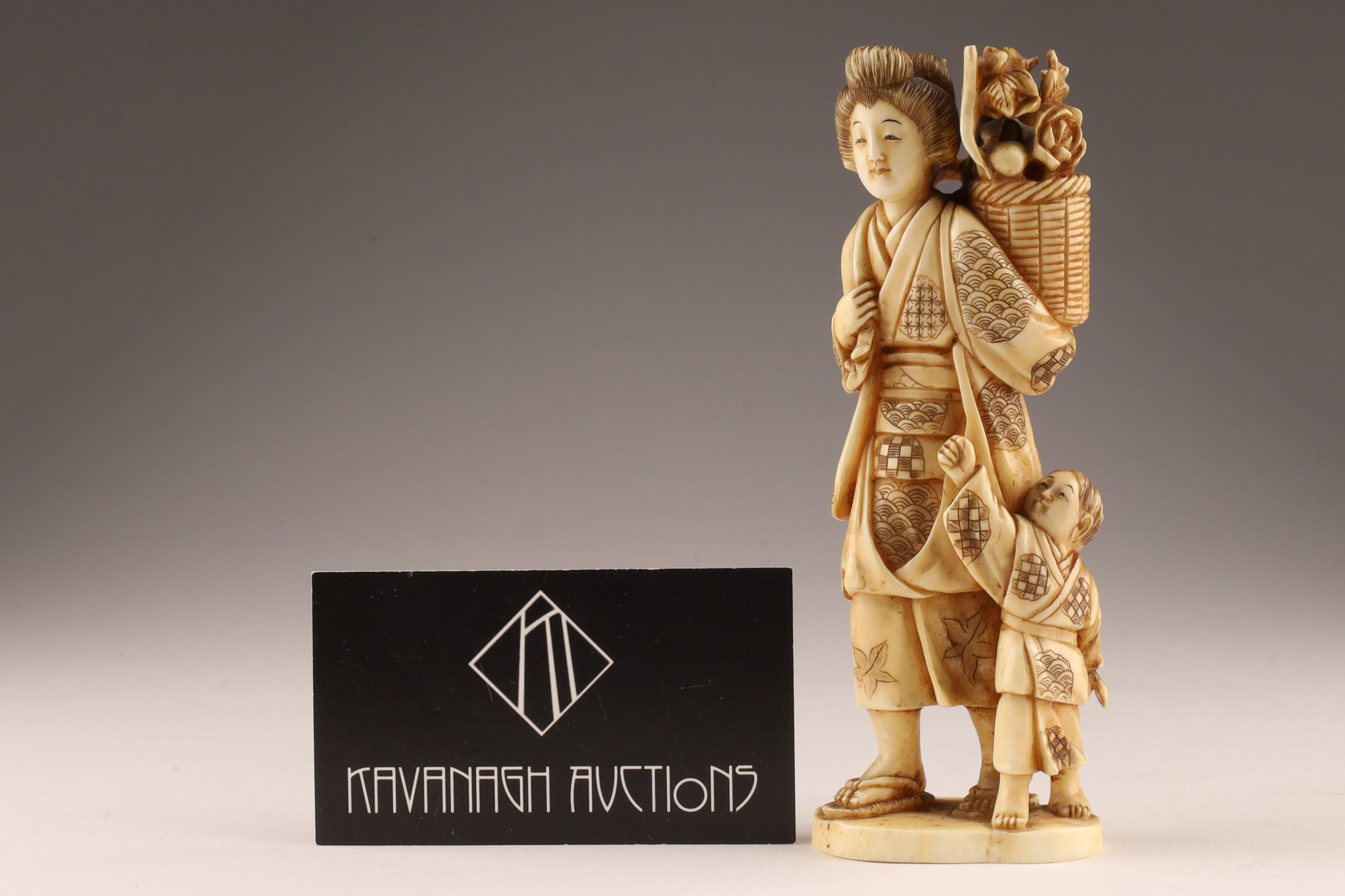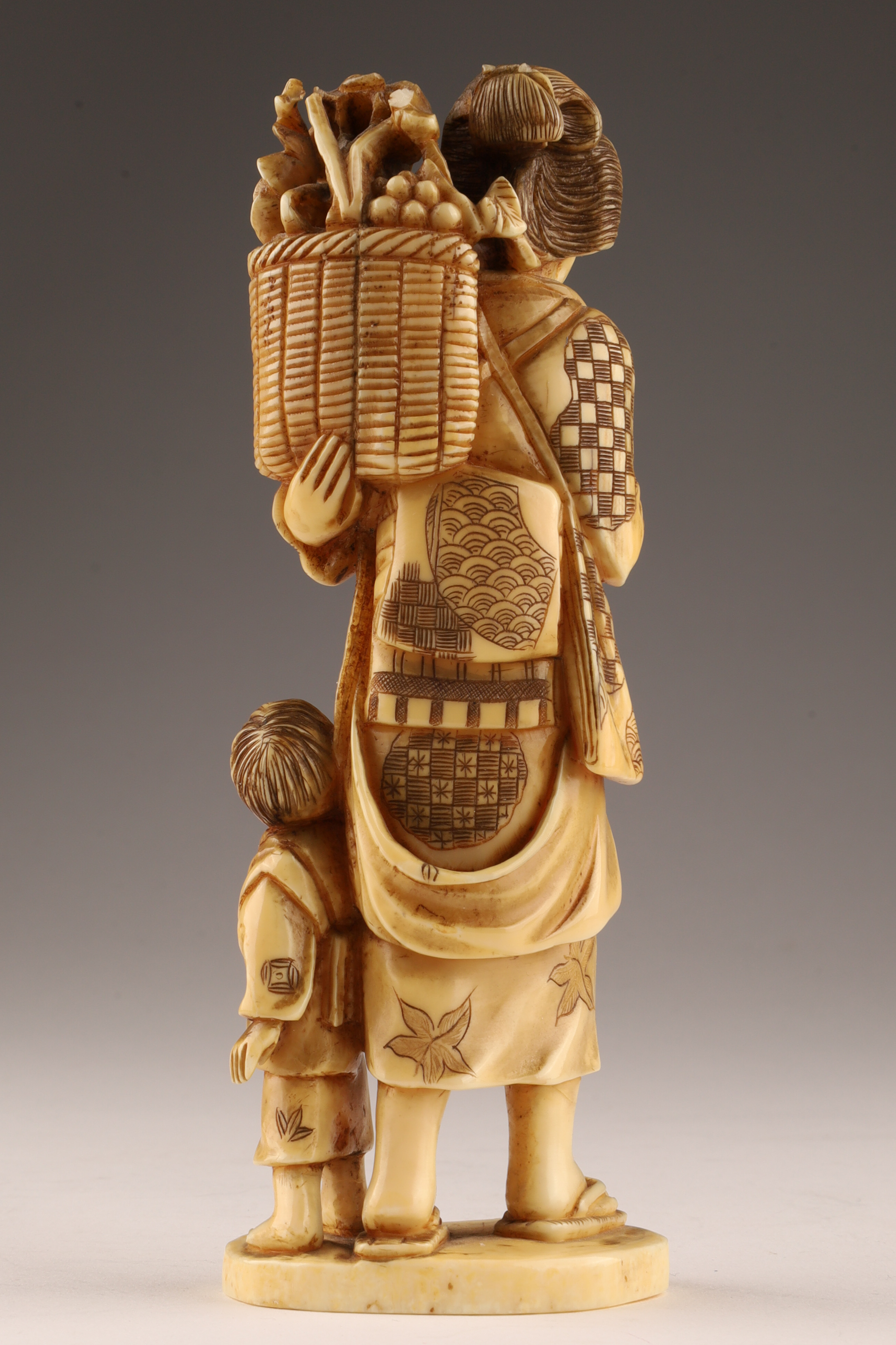Antique Japanese Okimono Signed Figure, Woman Farmer with Child