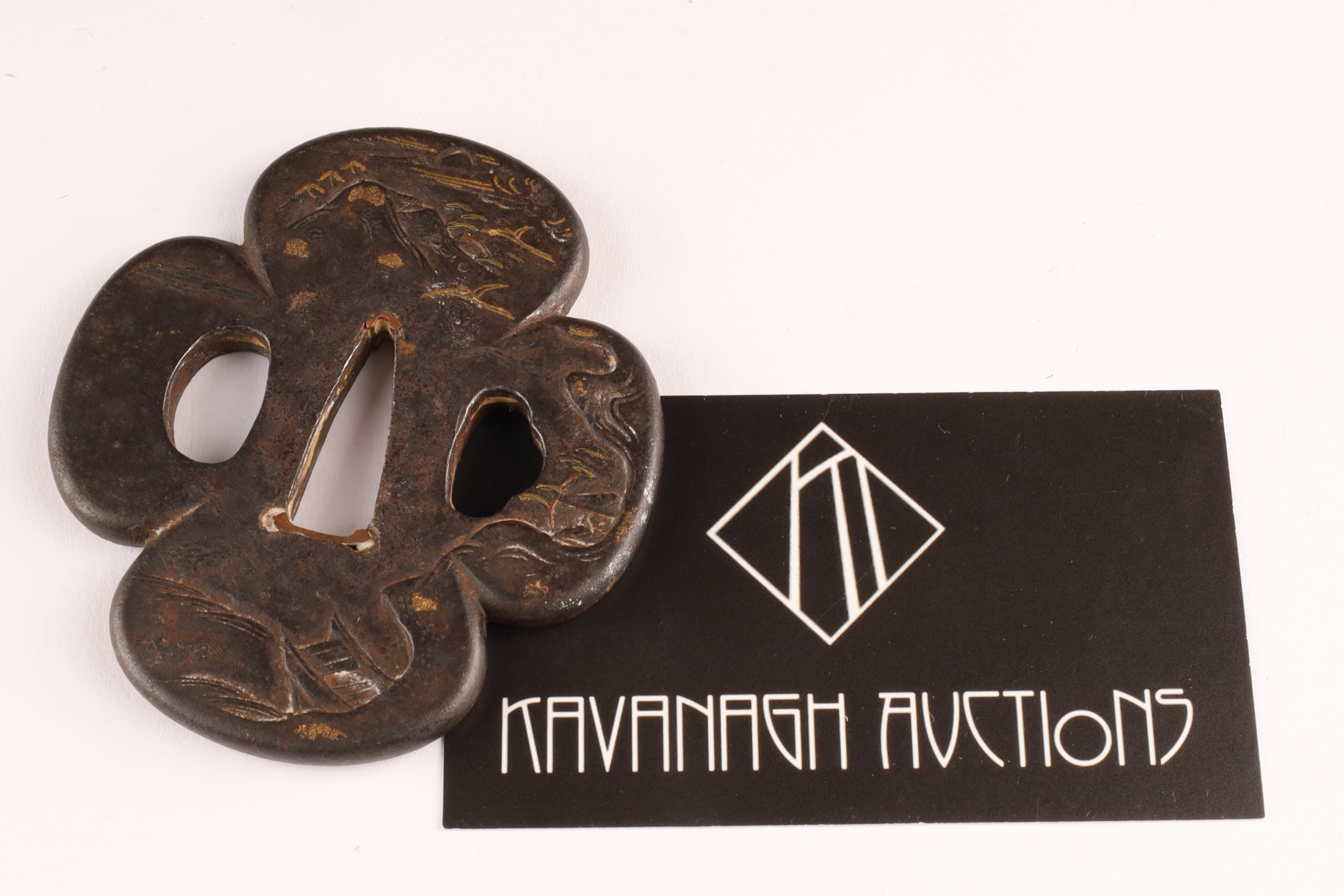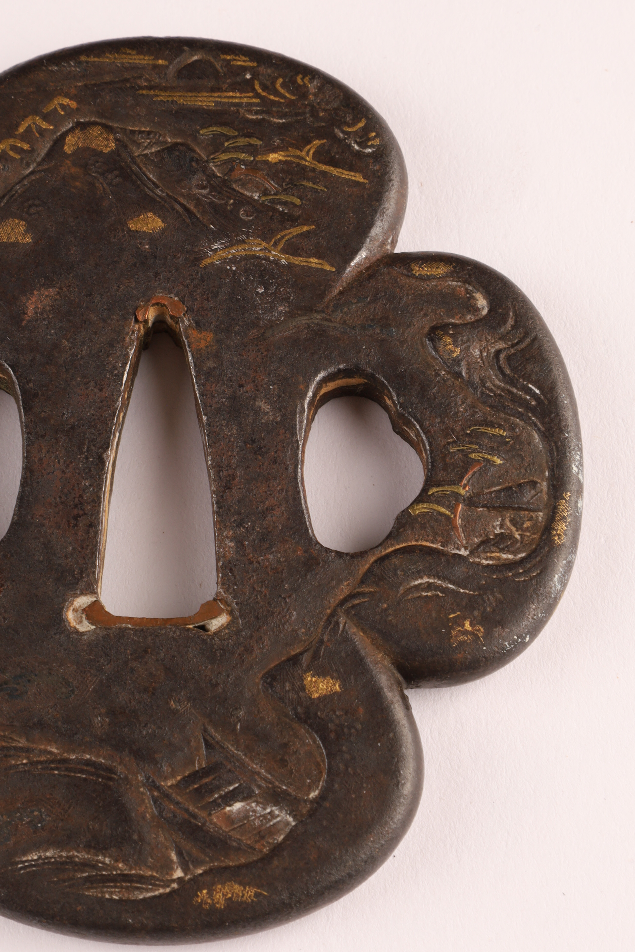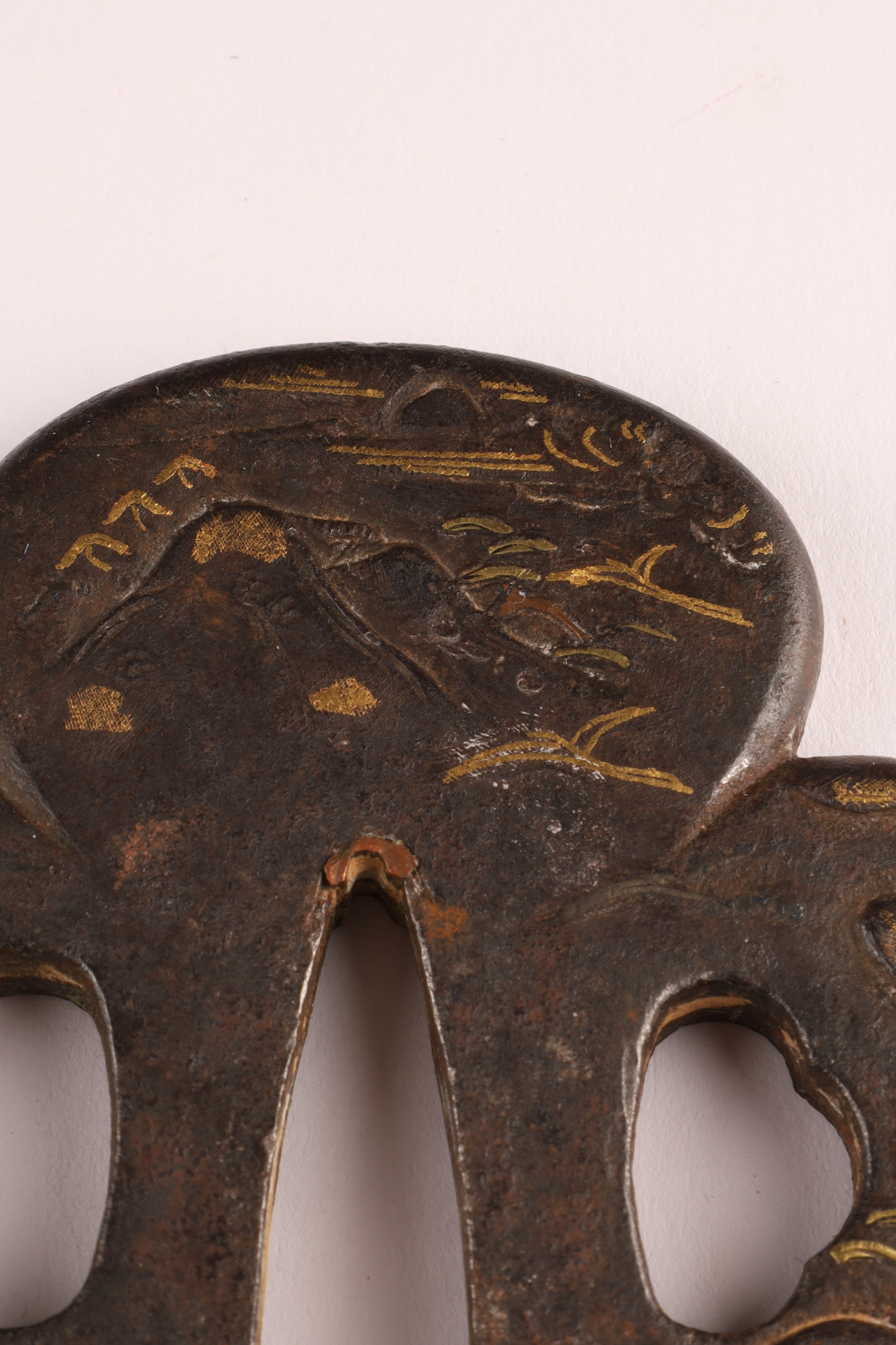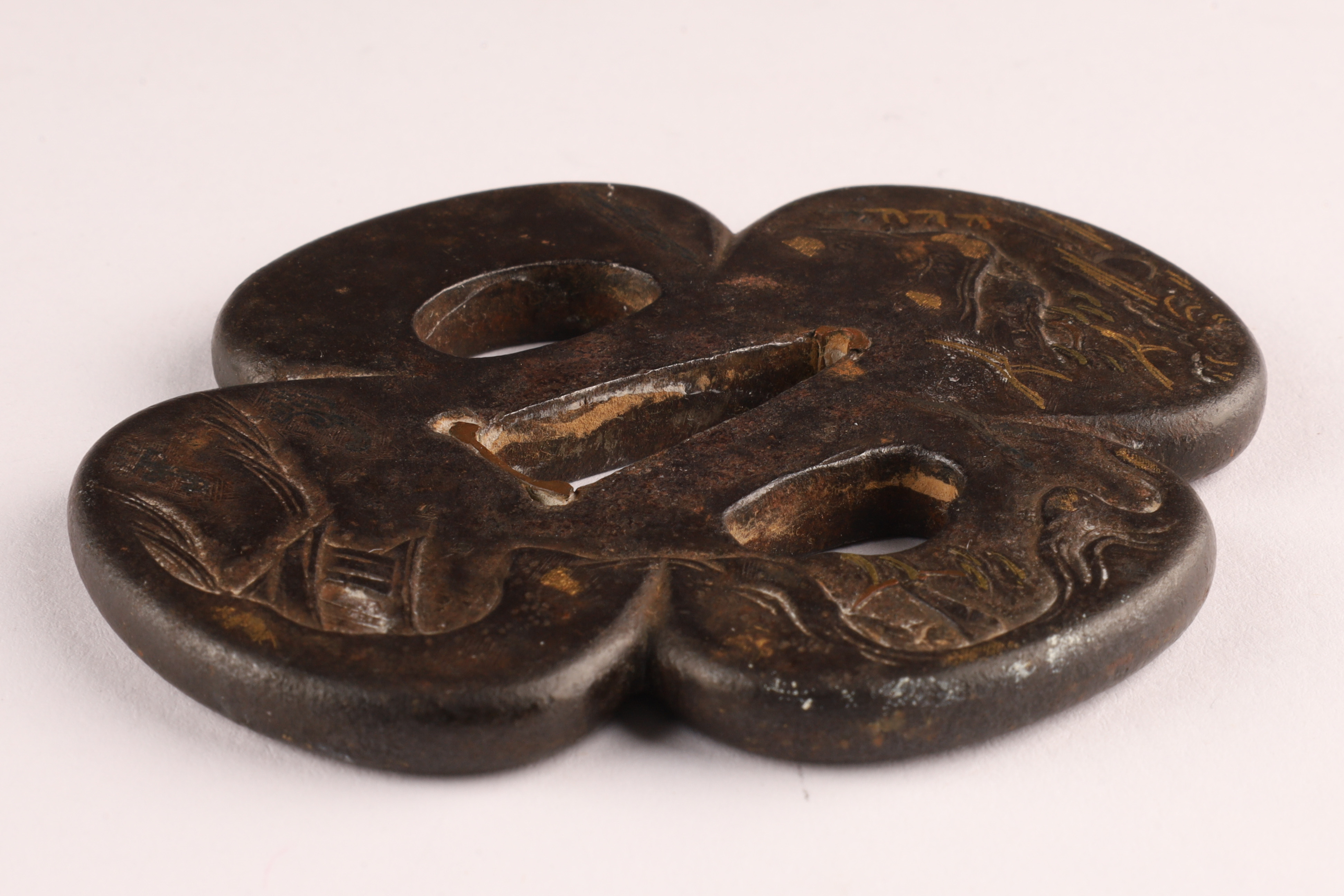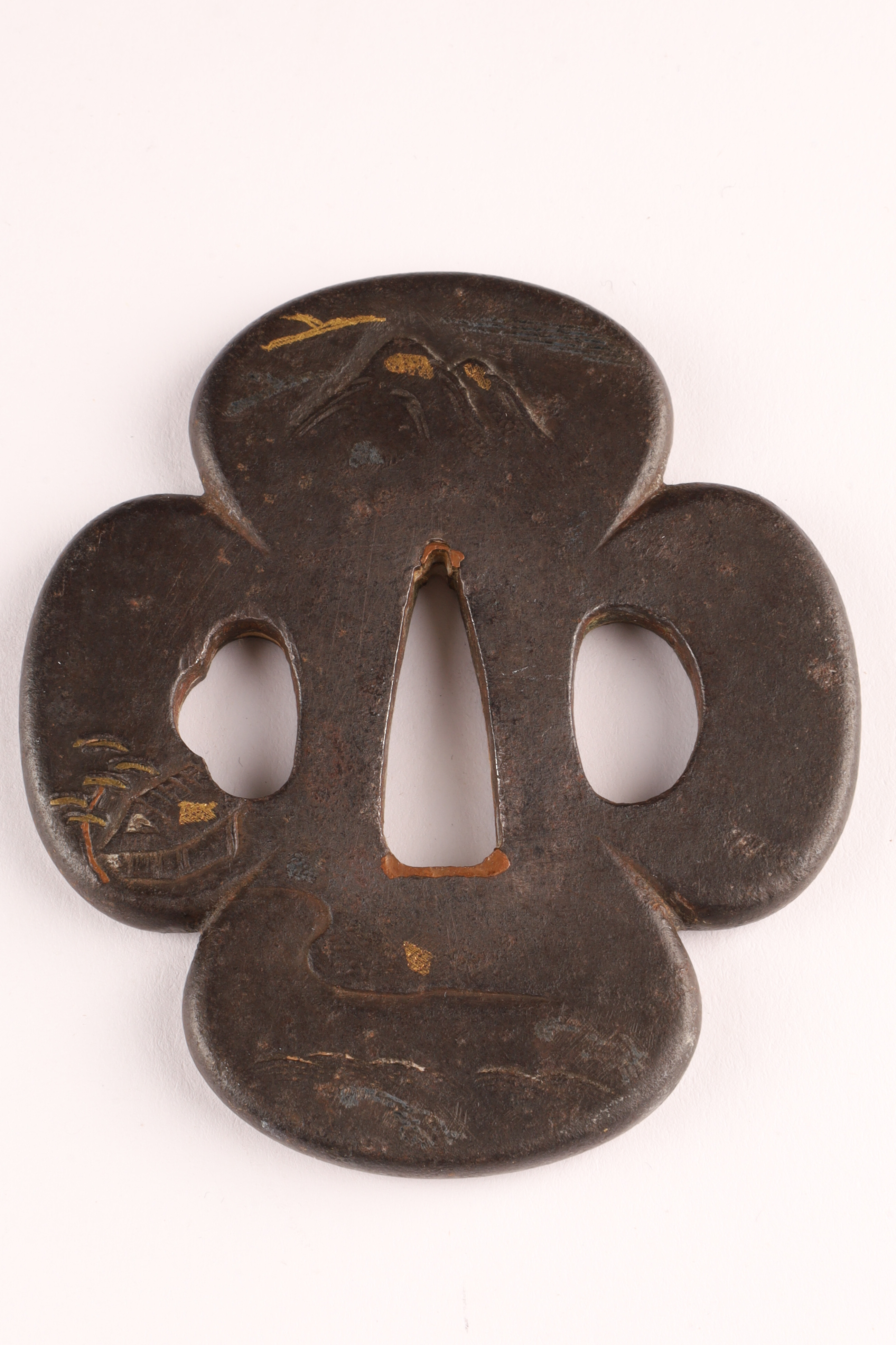 Antique Japanese Bronze Inlaid Mixed Metals Tsuba / sword guard decorated with a landscape measuring 3 inches x 2.75.