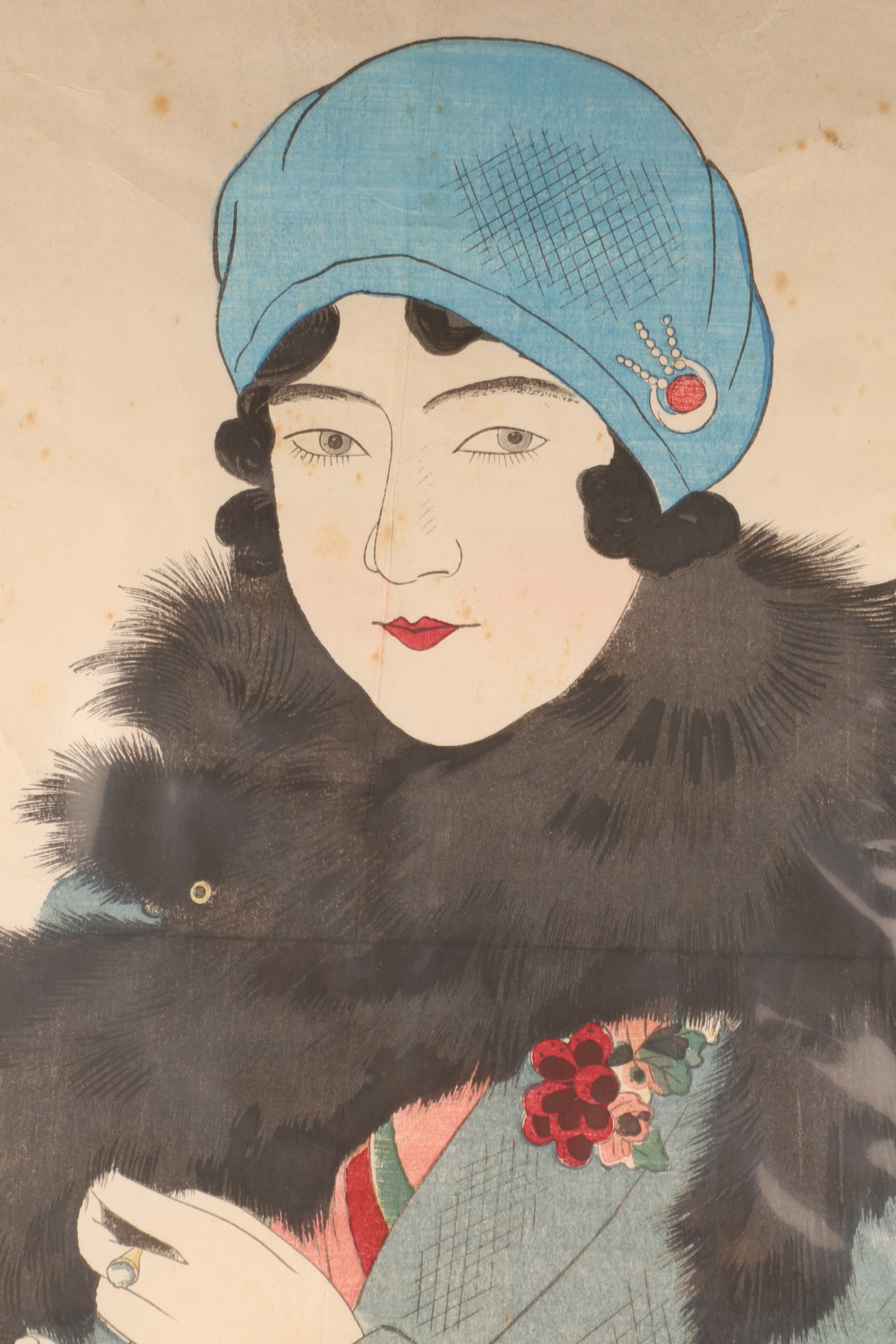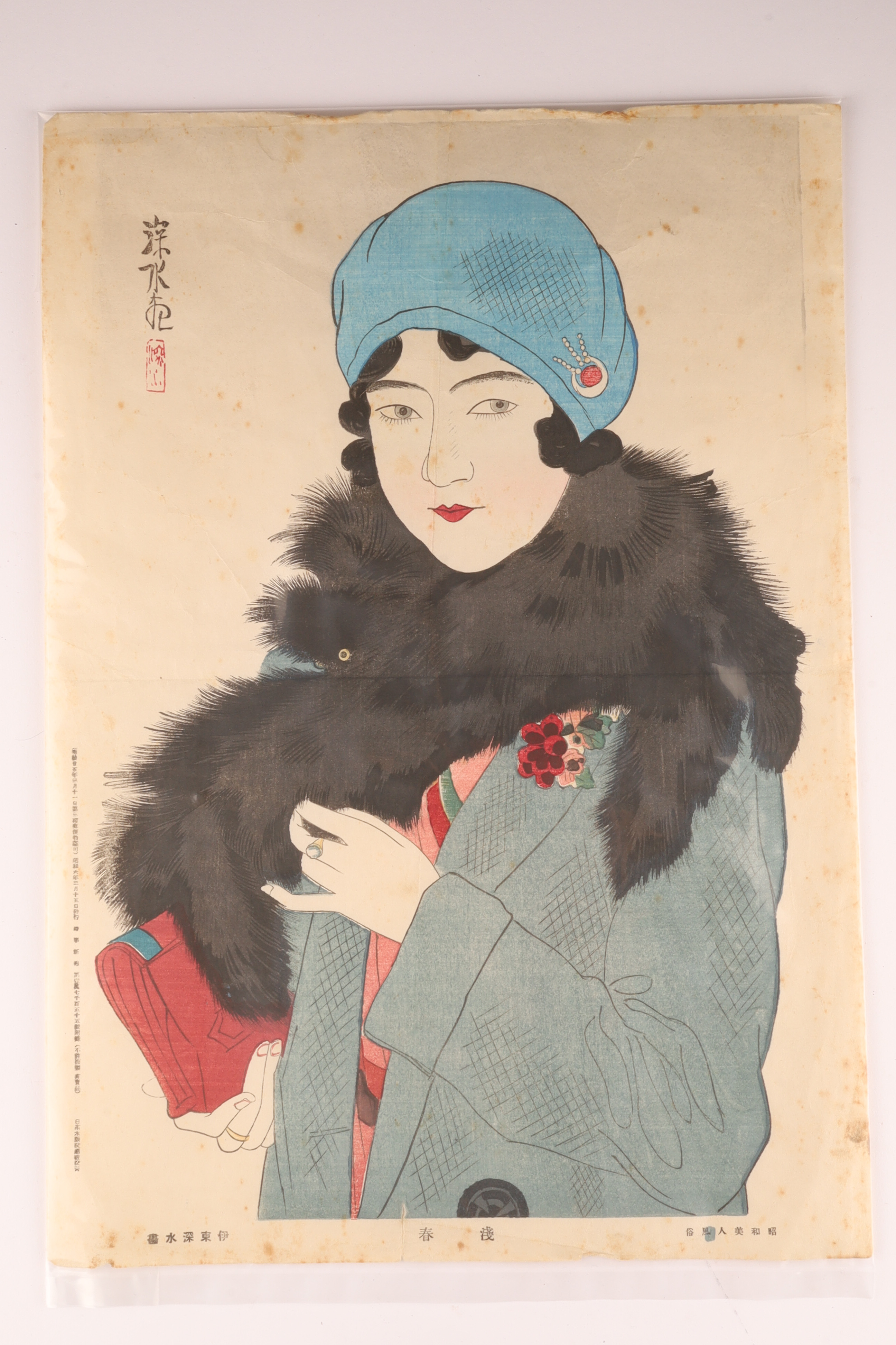 A refined Shin-Hanga portrait of a modern Japanese woman in winter attire, her cloche hat and fur collar reflecting the Western-influenced fashions of early Showa-era Tokyo. Shinsui’s delicate facial modeling and richly layered color exemplify the sophistication of Watanabe-published bijin-ga.