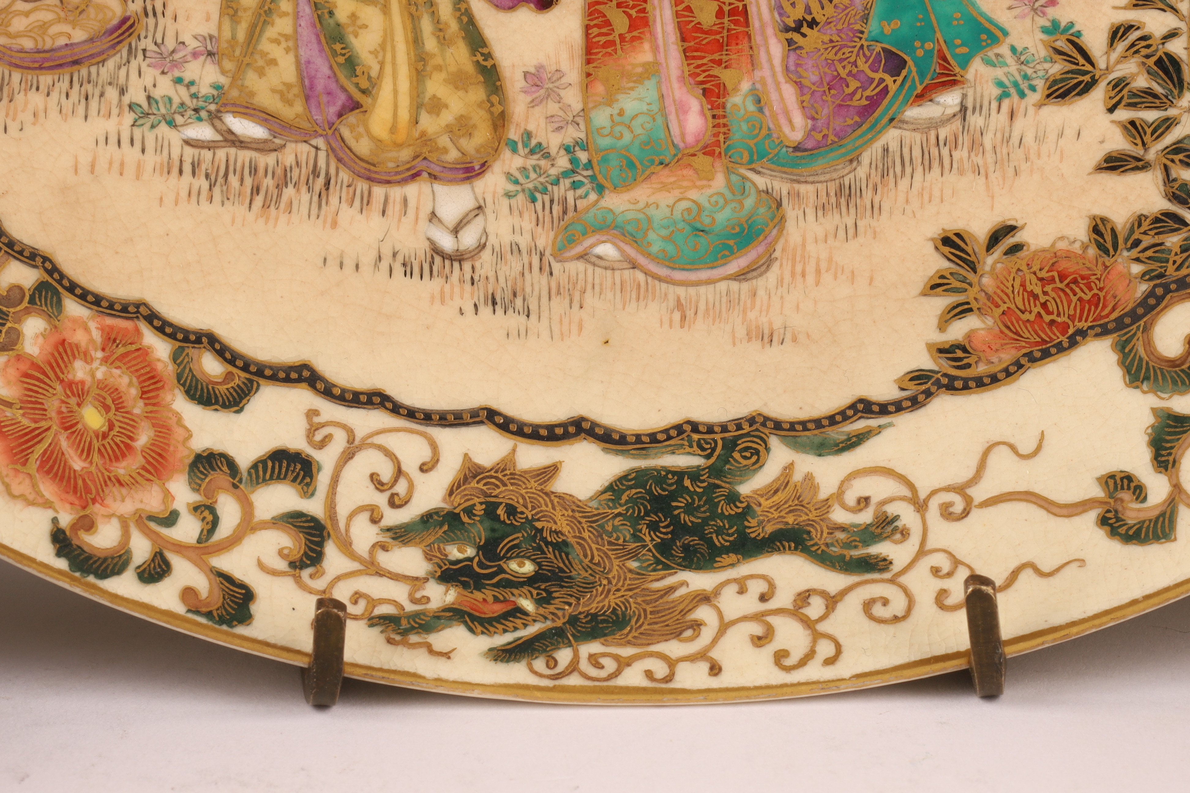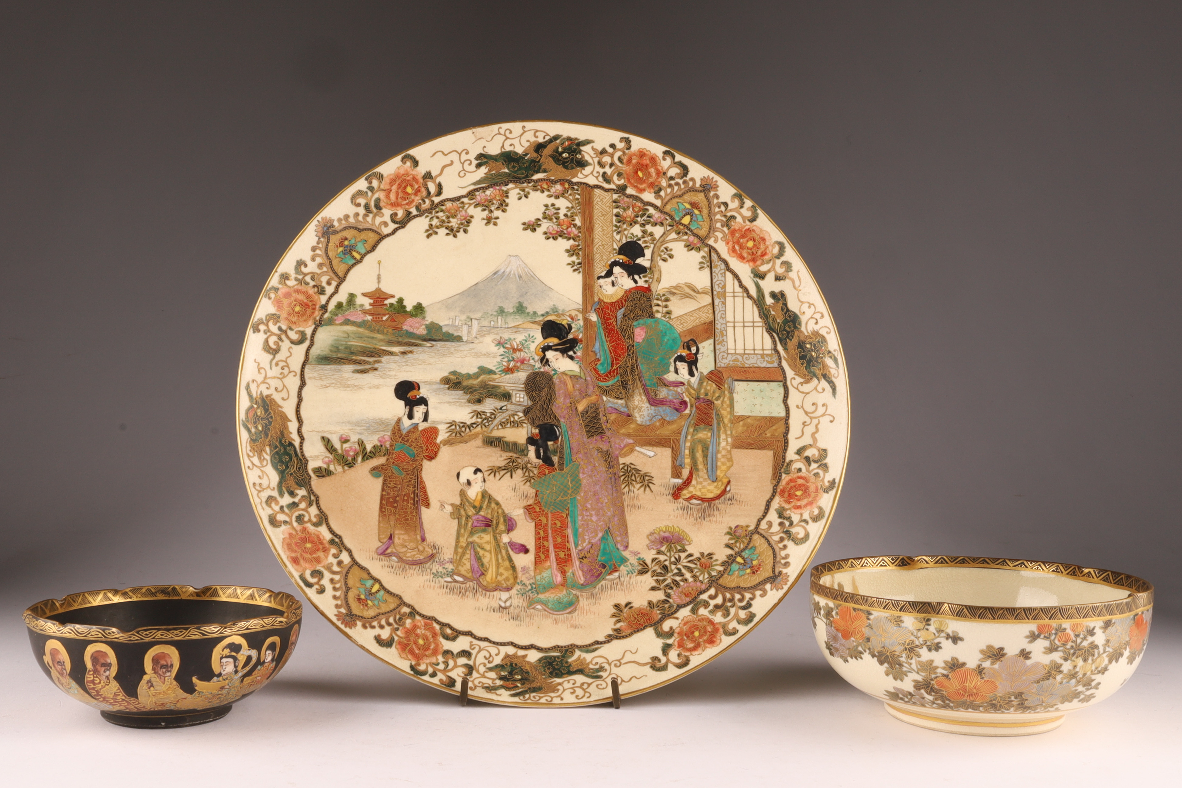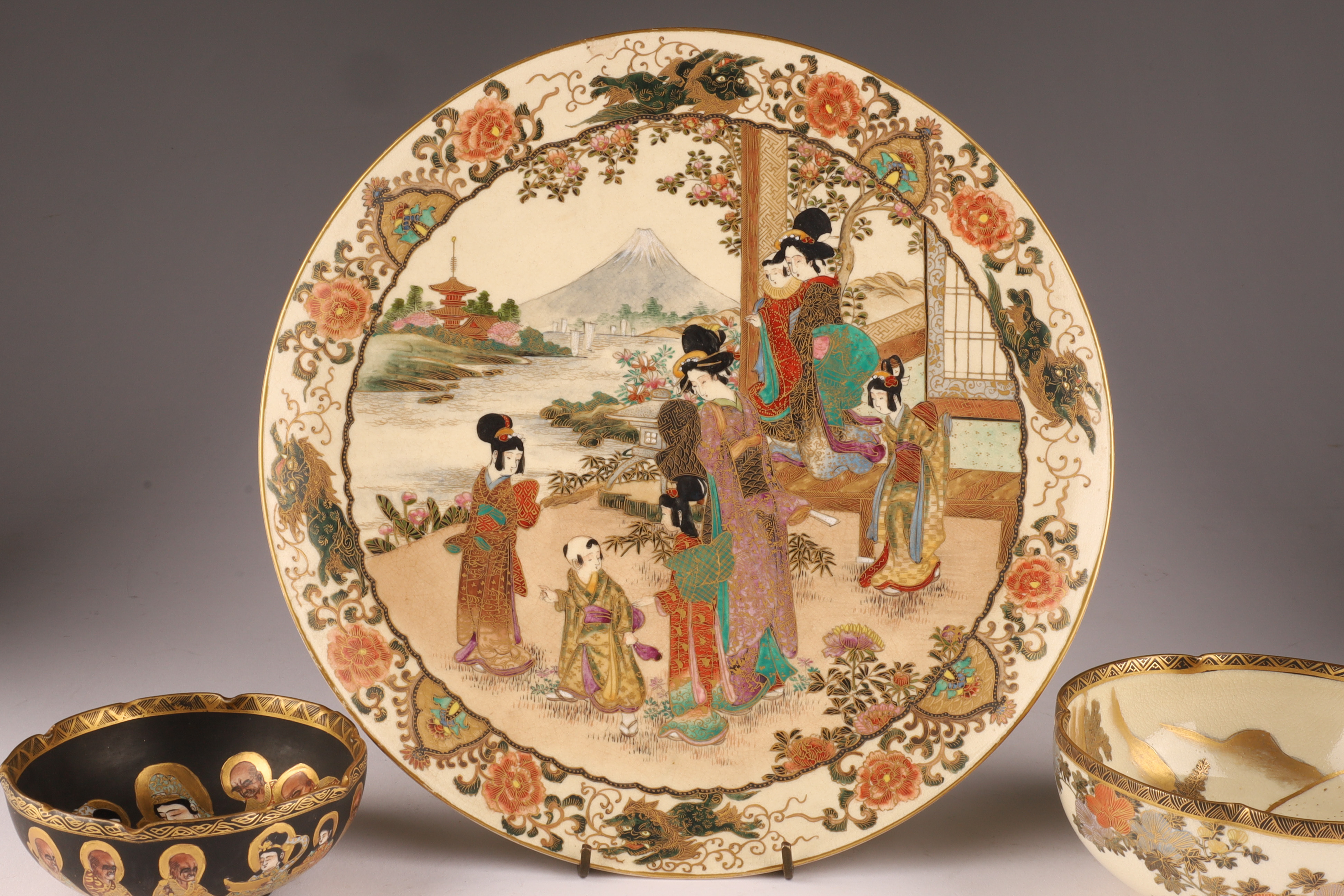One large plate (10 in) richly painted with court figures before a landscape with Mt. Fuji, surrounded by a chrysanthemum and mythical lion border in raised polychrome and gilt.