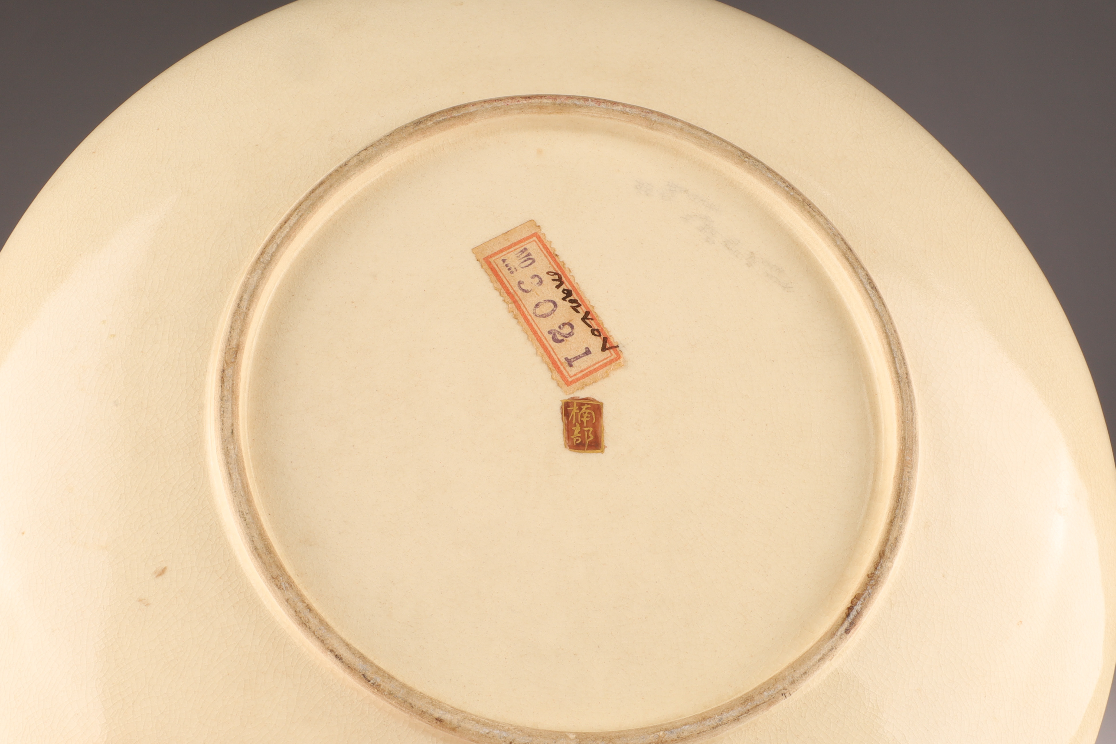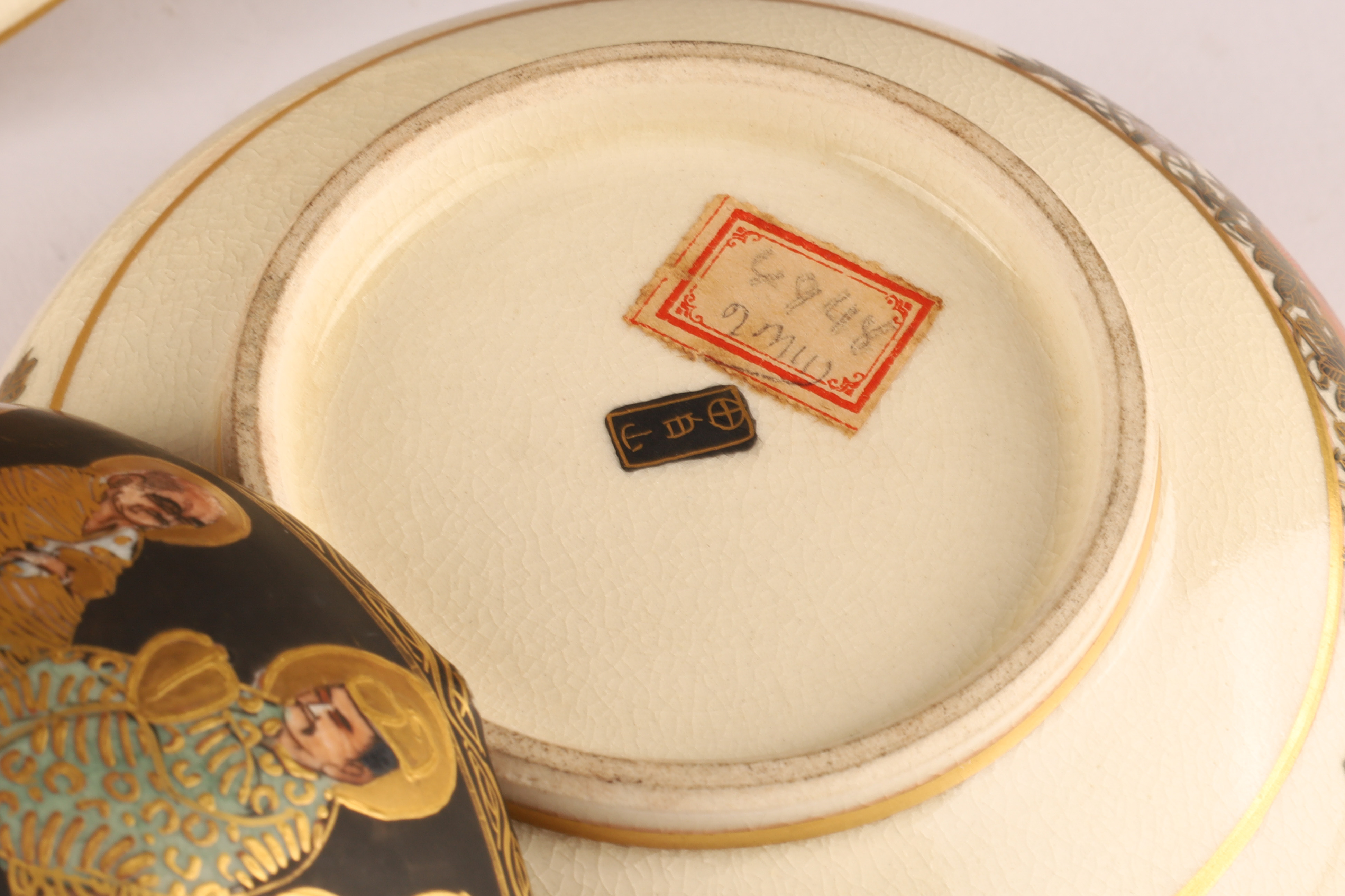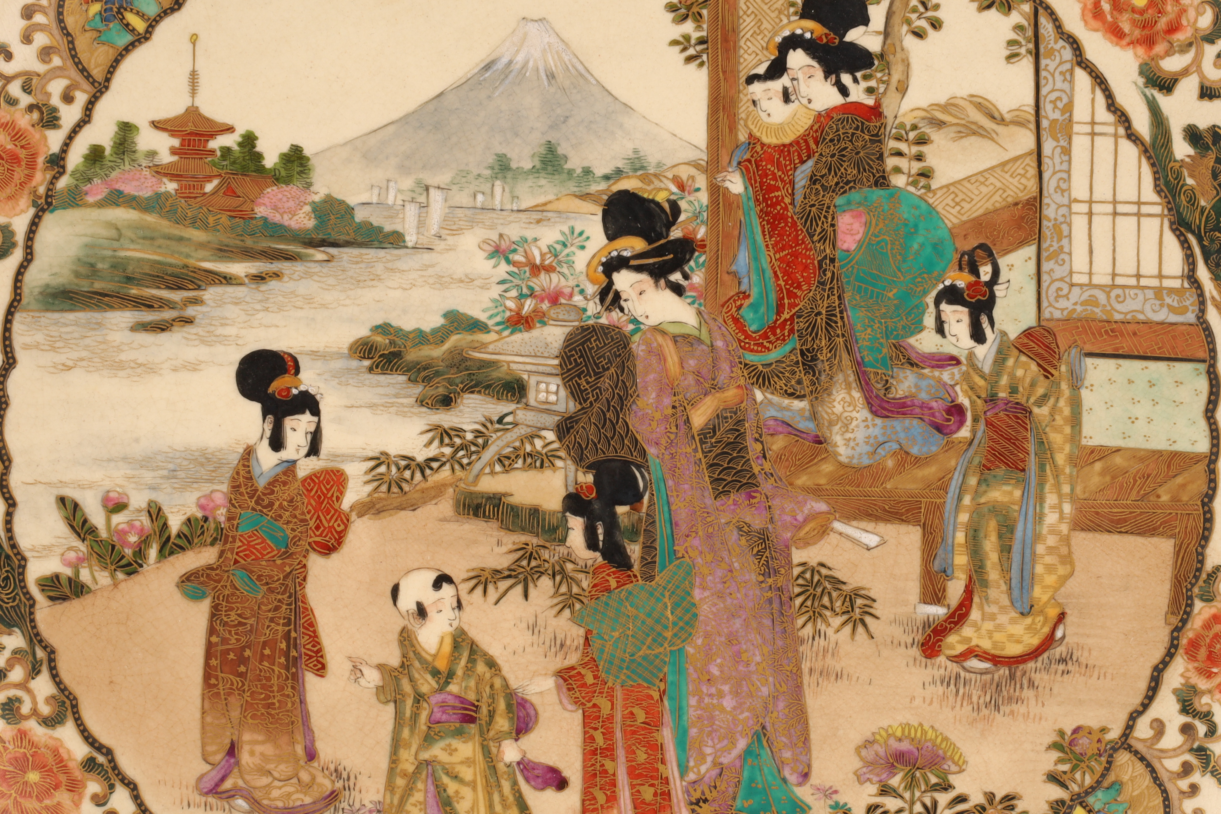 One large plate (10 in) richly painted with court figures before a landscape with Mt. Fuji, surrounded by a chrysanthemum and mythical lion border in raised polychrome and gilt.