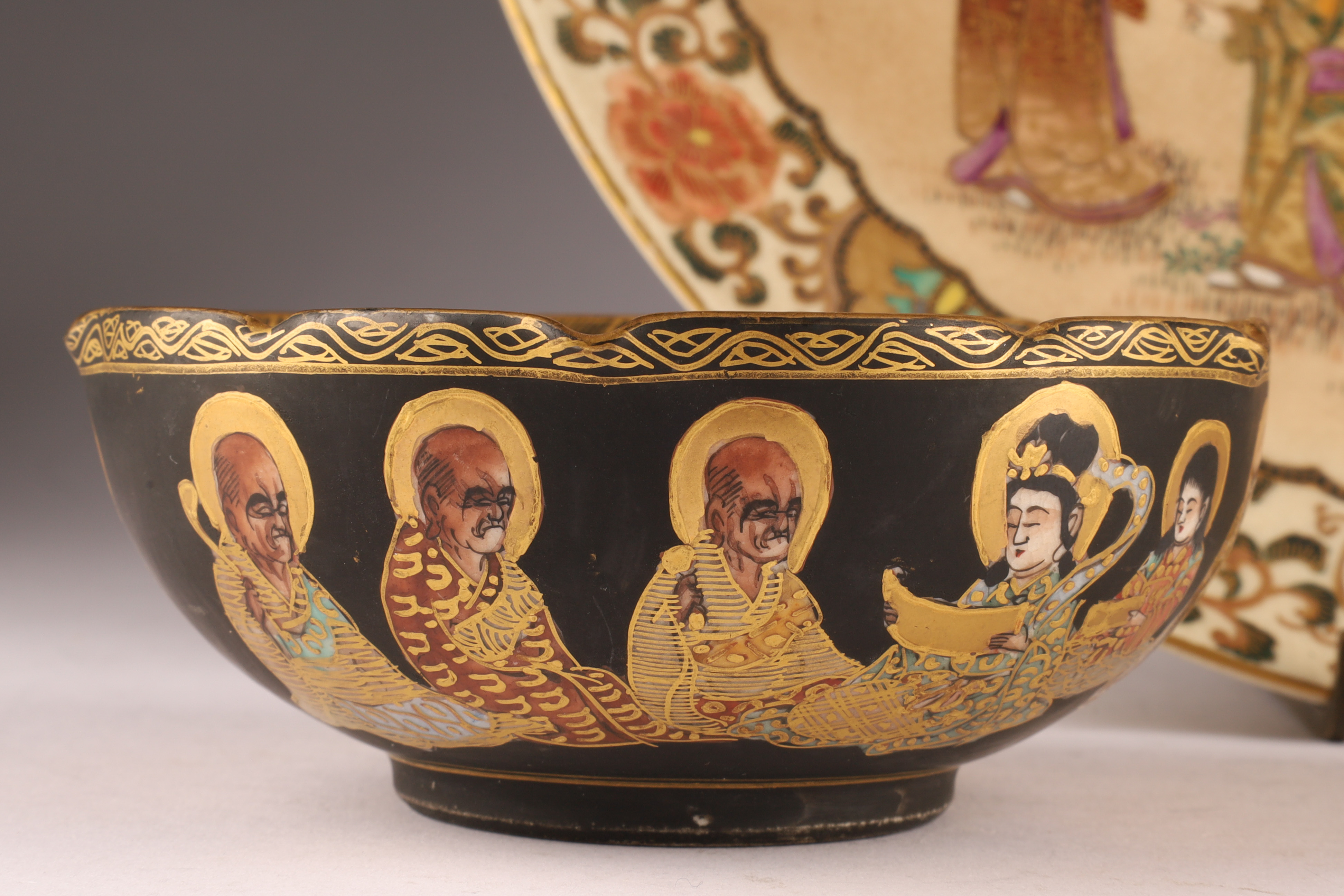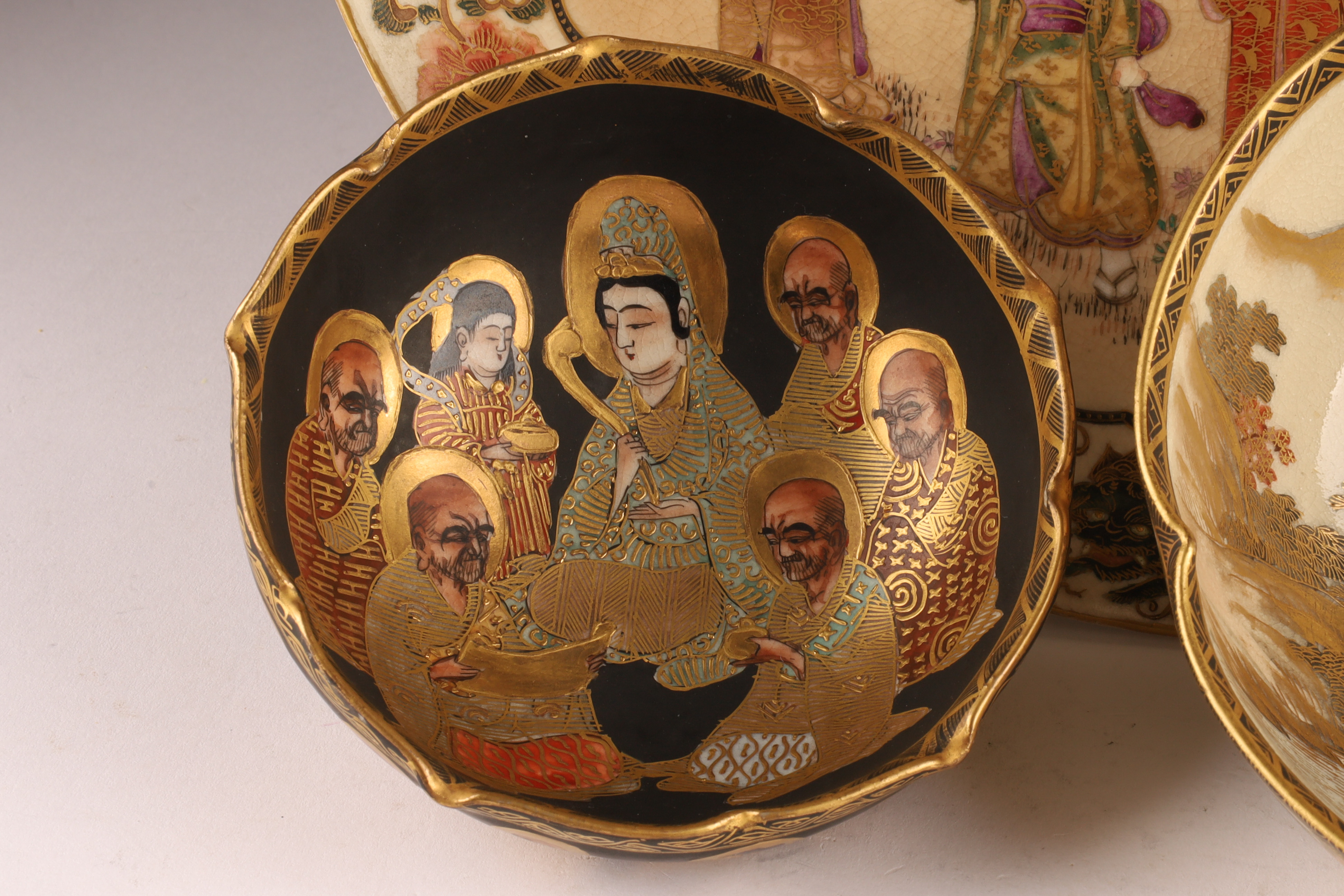 One small bowl (5 in) with black interior ground, depicting the Seven Lucky Gods (Shichifukujin) in vivid gilt and brocade patterns.