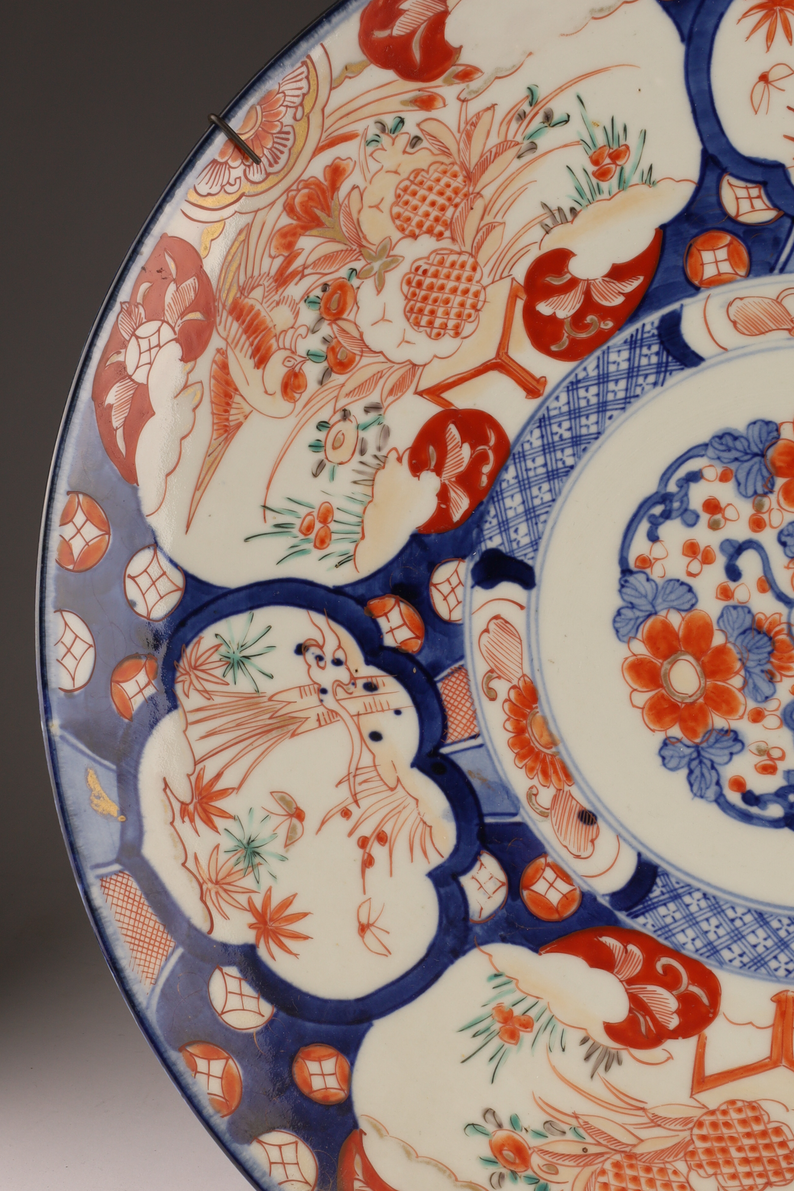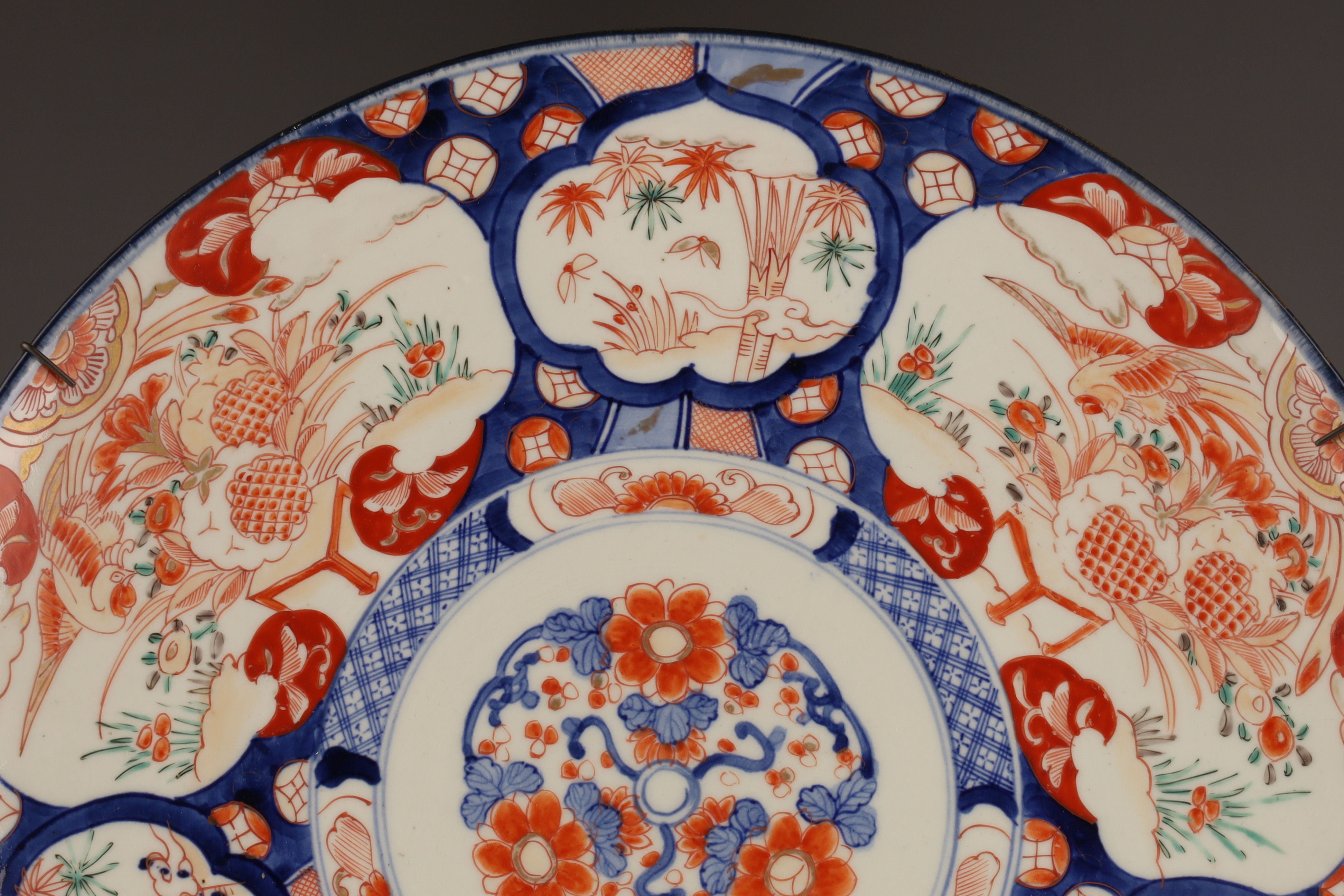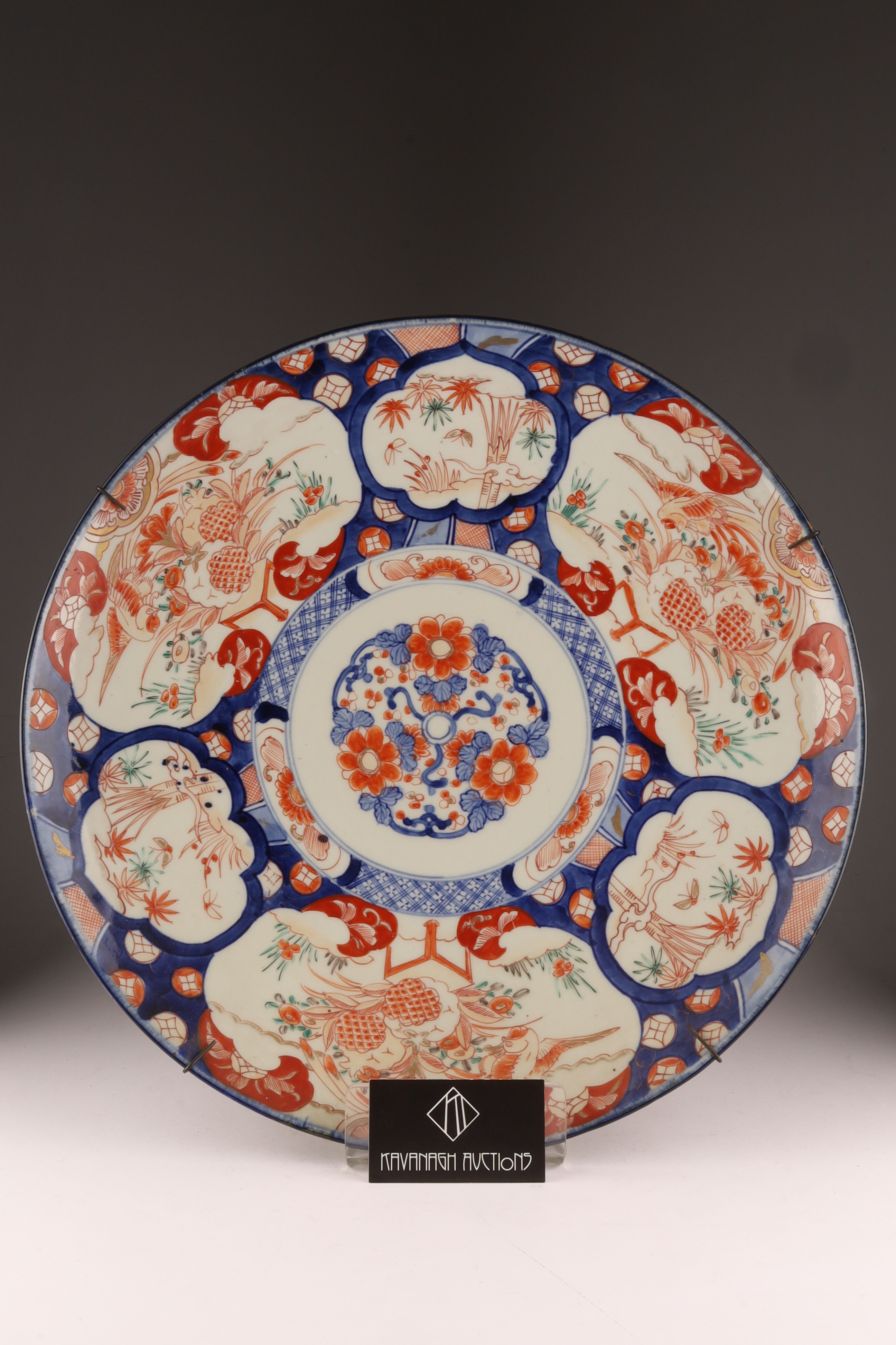 Large Japanese Imari Charger decorated in blue and red with a wire plate hanger. 18 inches diameter.