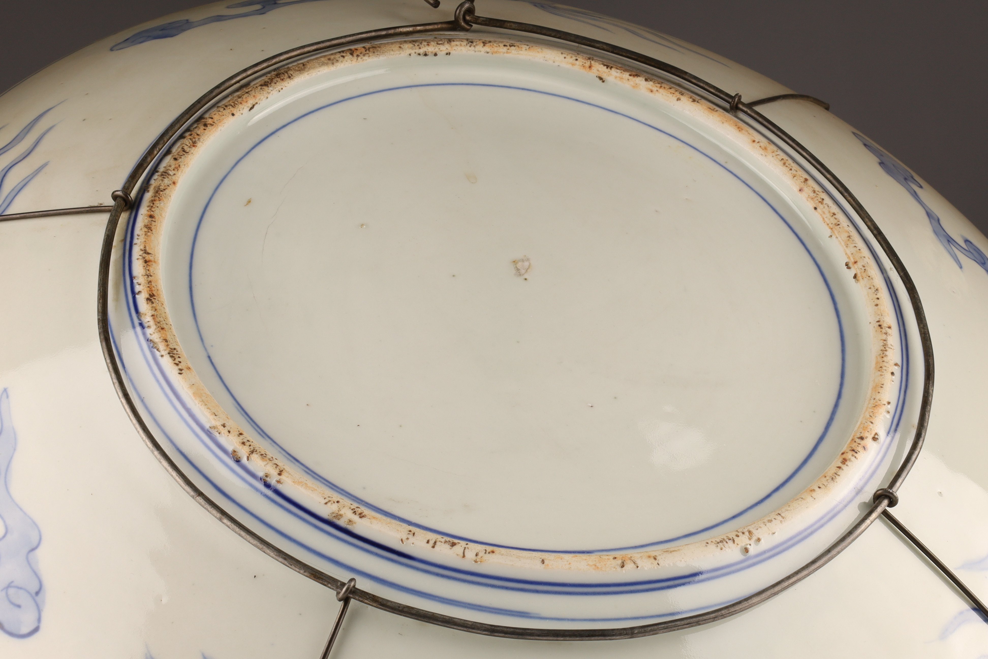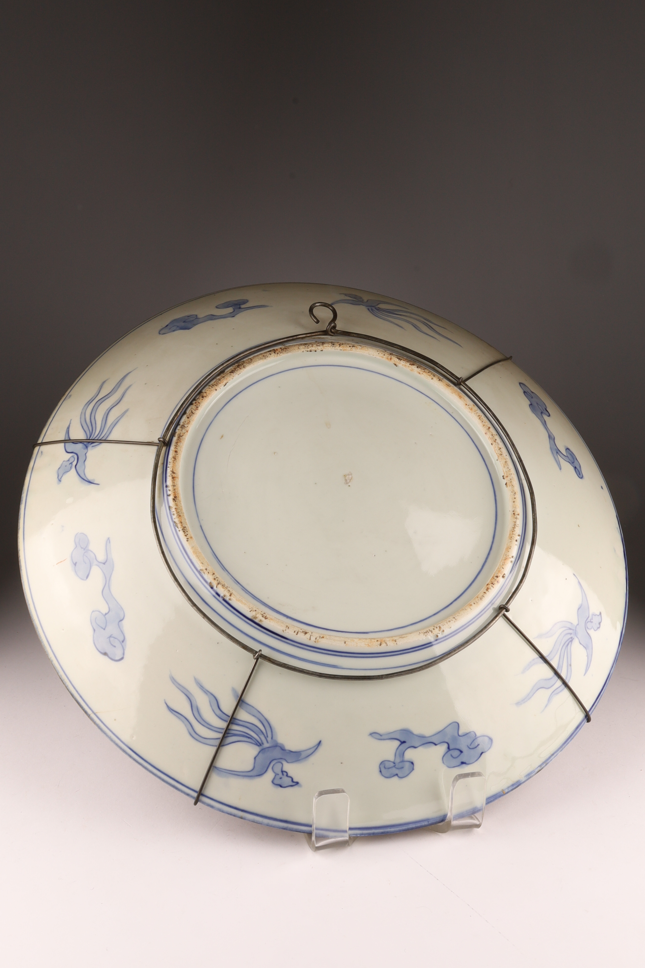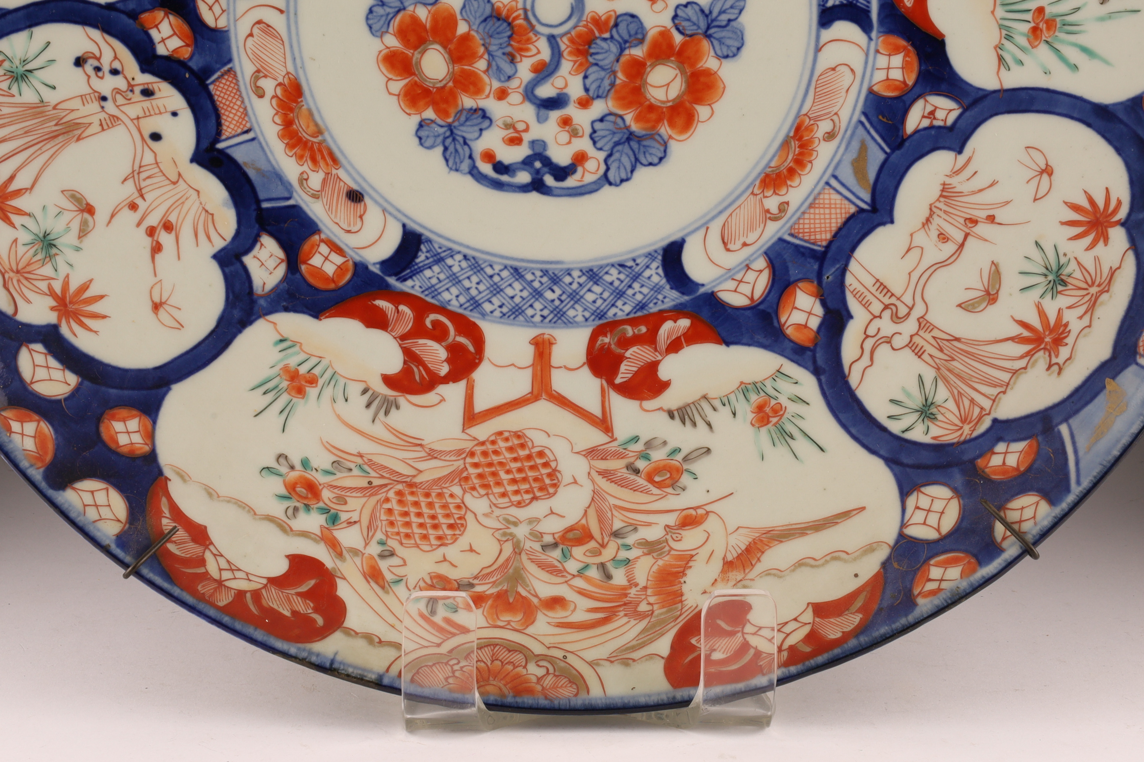 Large Japanese Imari Charger decorated in blue and red with a wire plate hanger. 18 inches diameter.