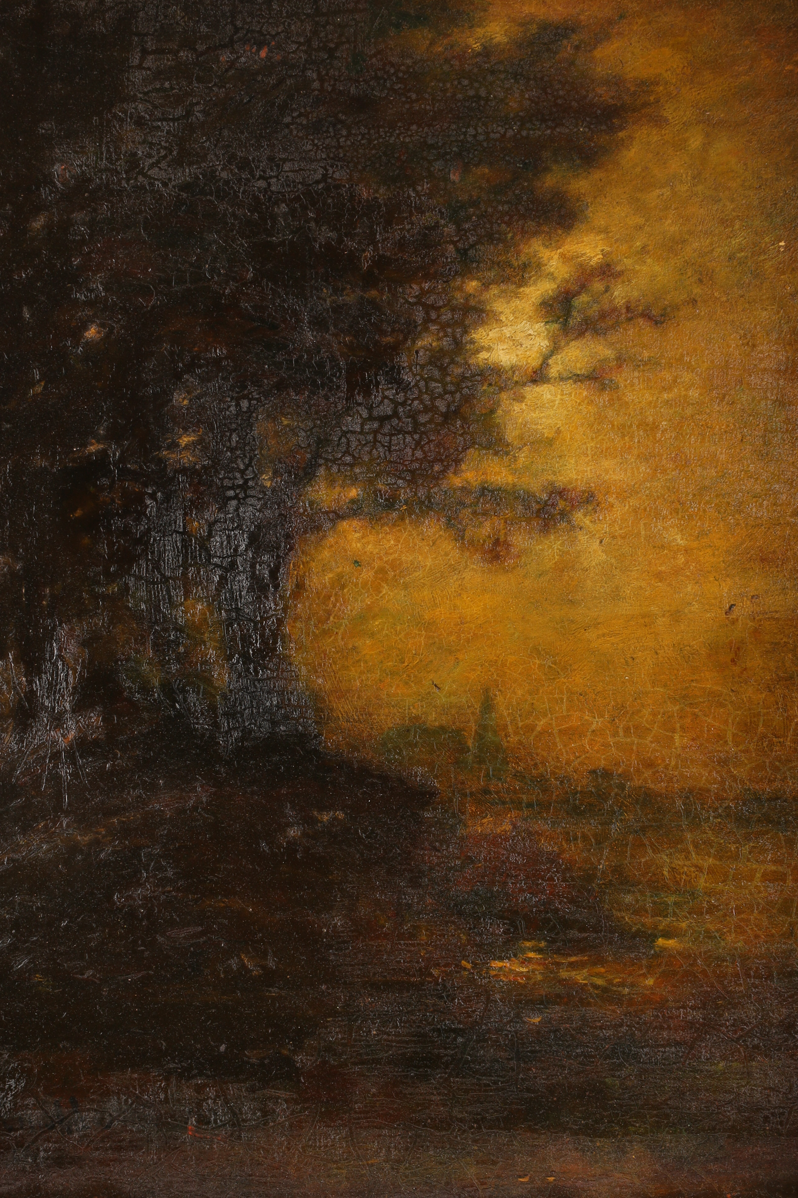 A fine example of Romantic-era landscape painting, merging British pastoral sensibility with the tonal naturalism of the French Barbizon school. The painting’s glowing light and meditative atmosphere evoke the poetic landscapes of mid-century Europe.