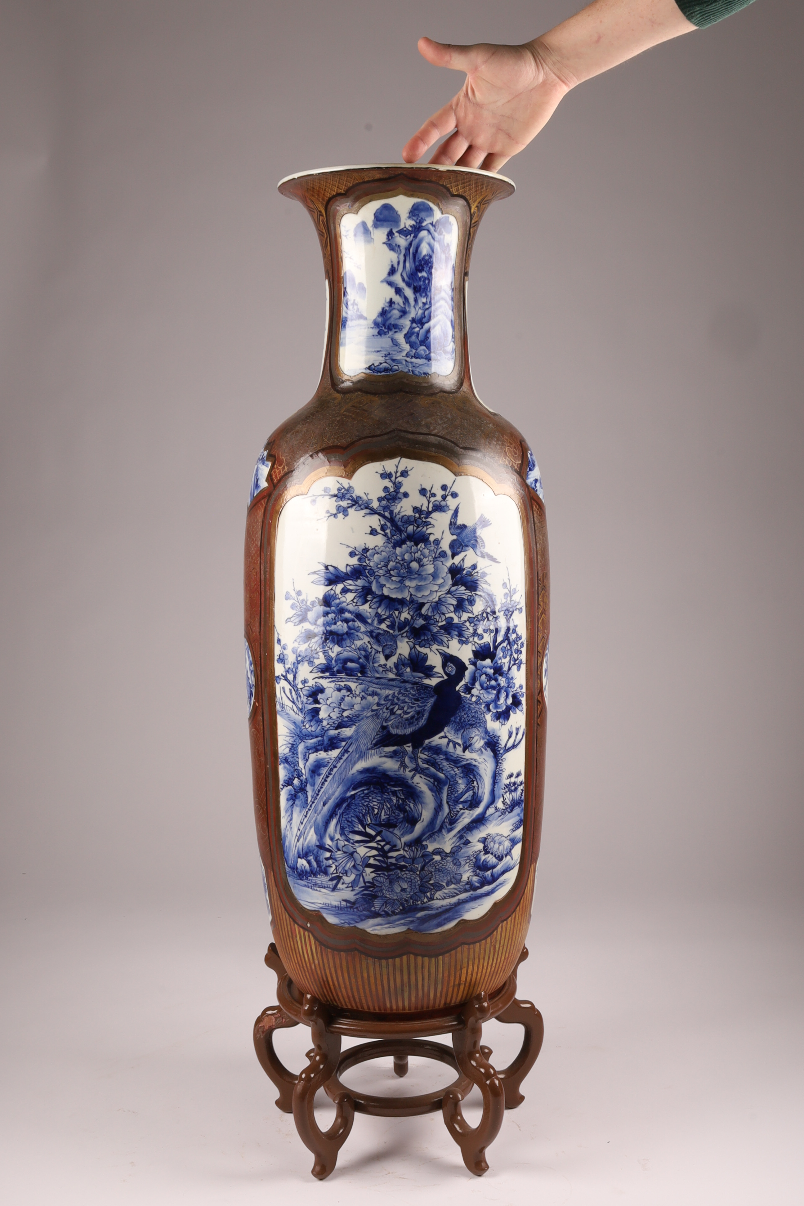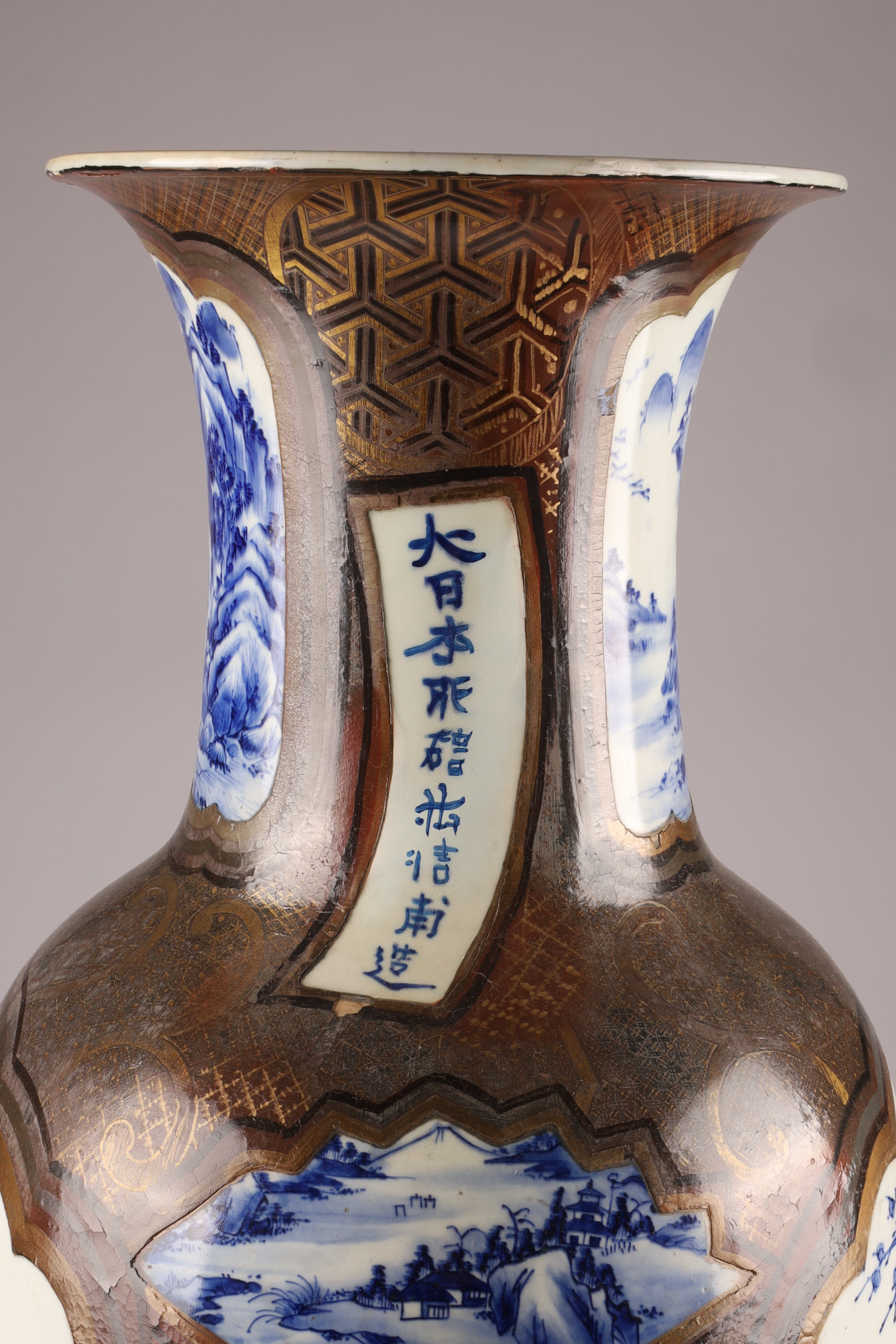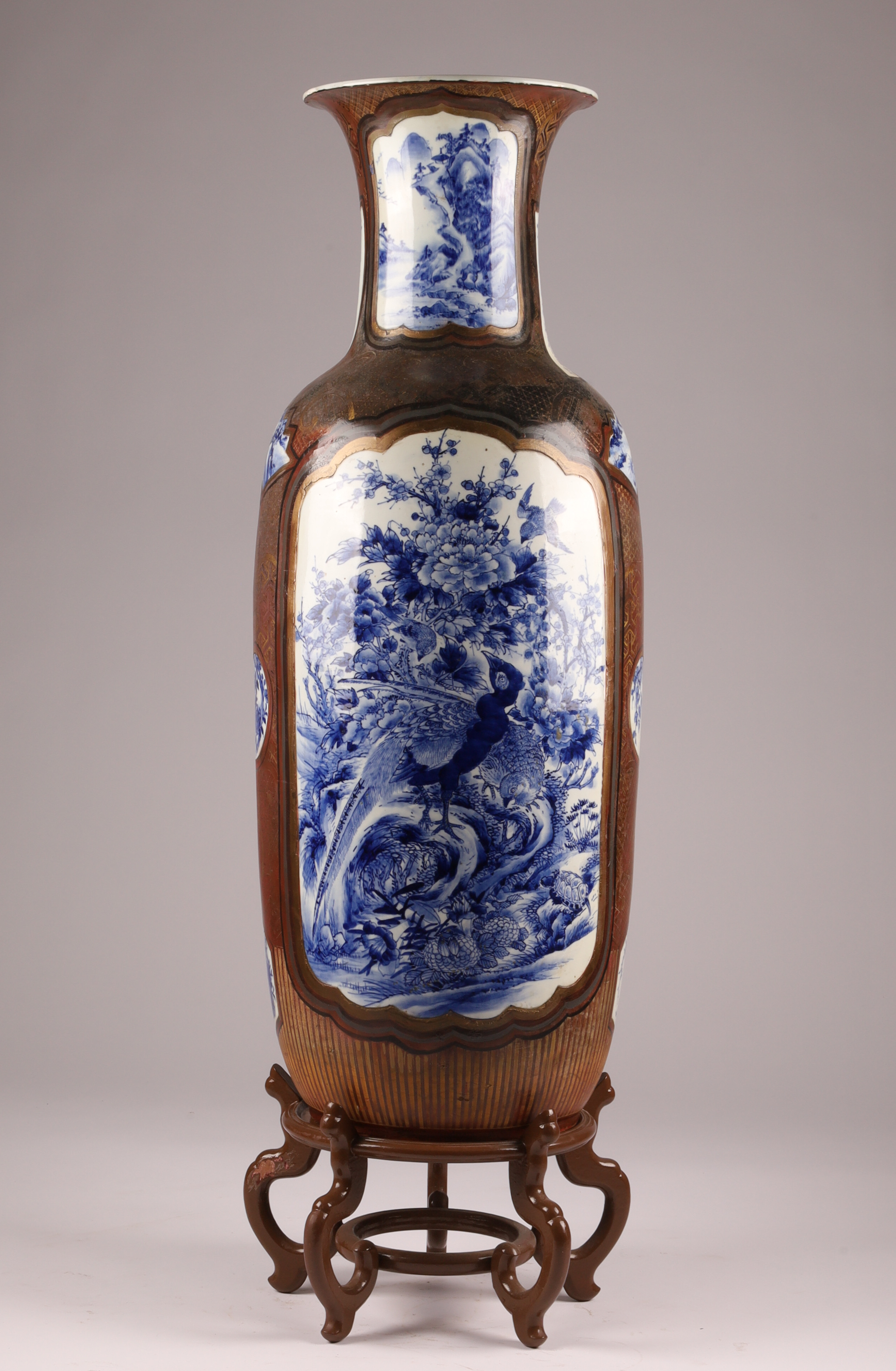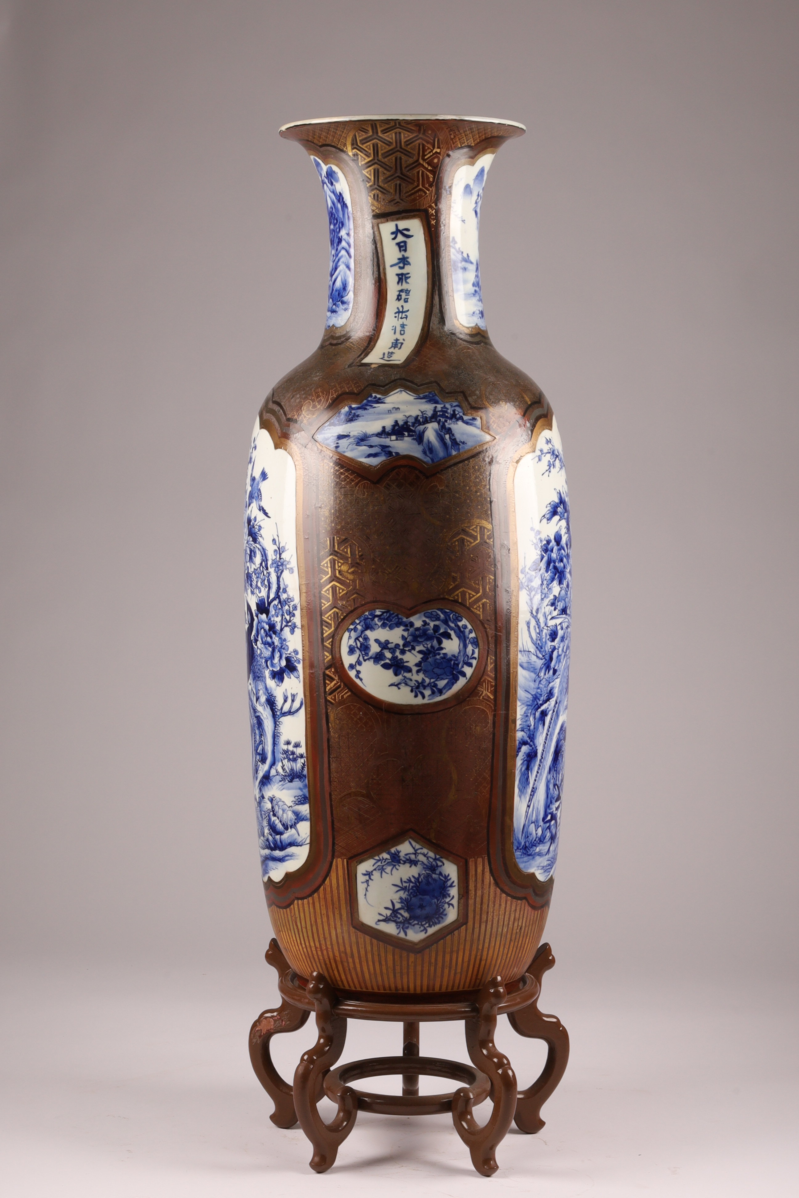 Very Large Antique Japanese Blue and White Floor Vase, Brown and Gilt Decoration, baluster form with flared rim, with calligraphy on neck. Decorated with landscapes of mountains, peonies and cherry blossoms with birds. On stand, measuring 44 inches H x 12 W.