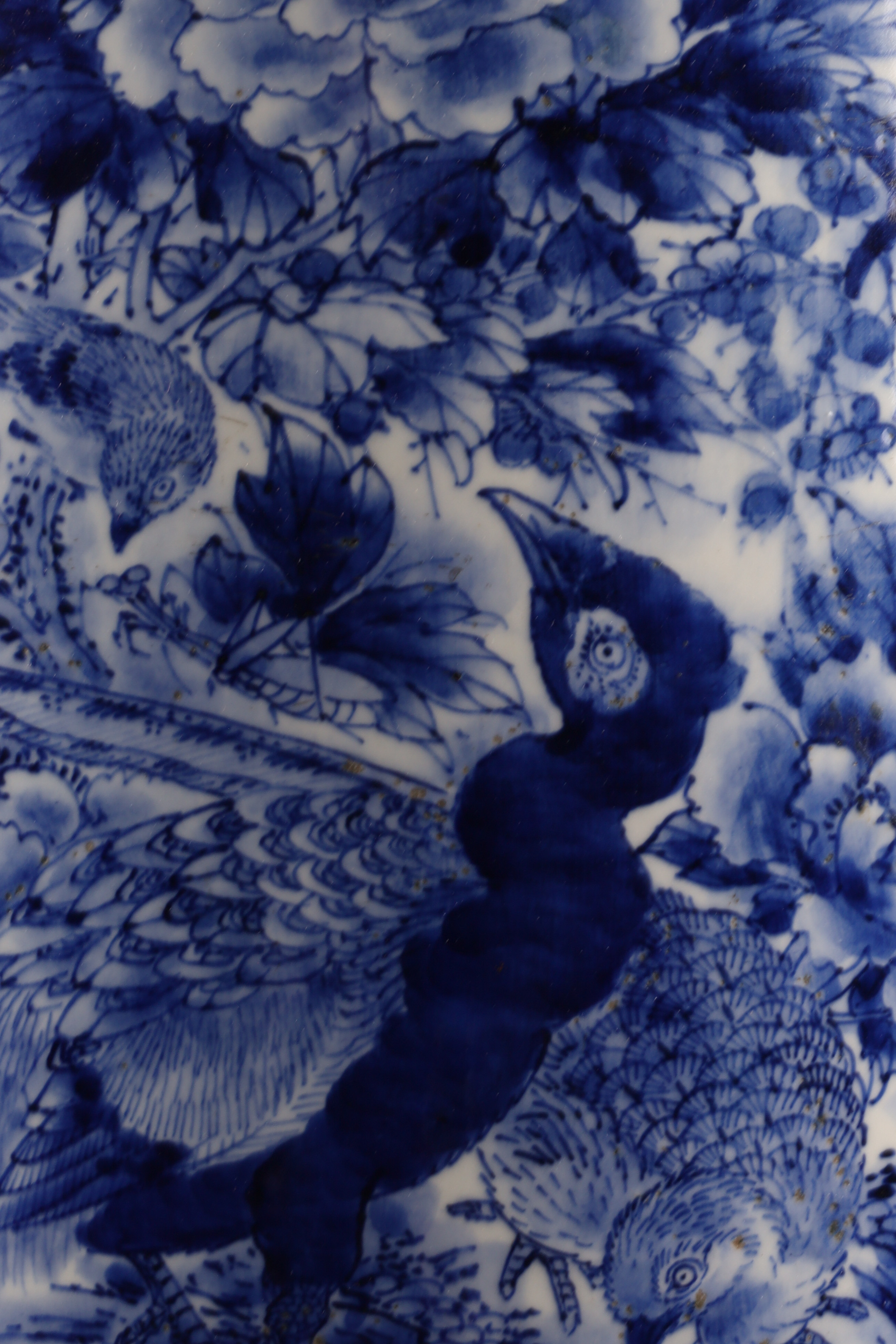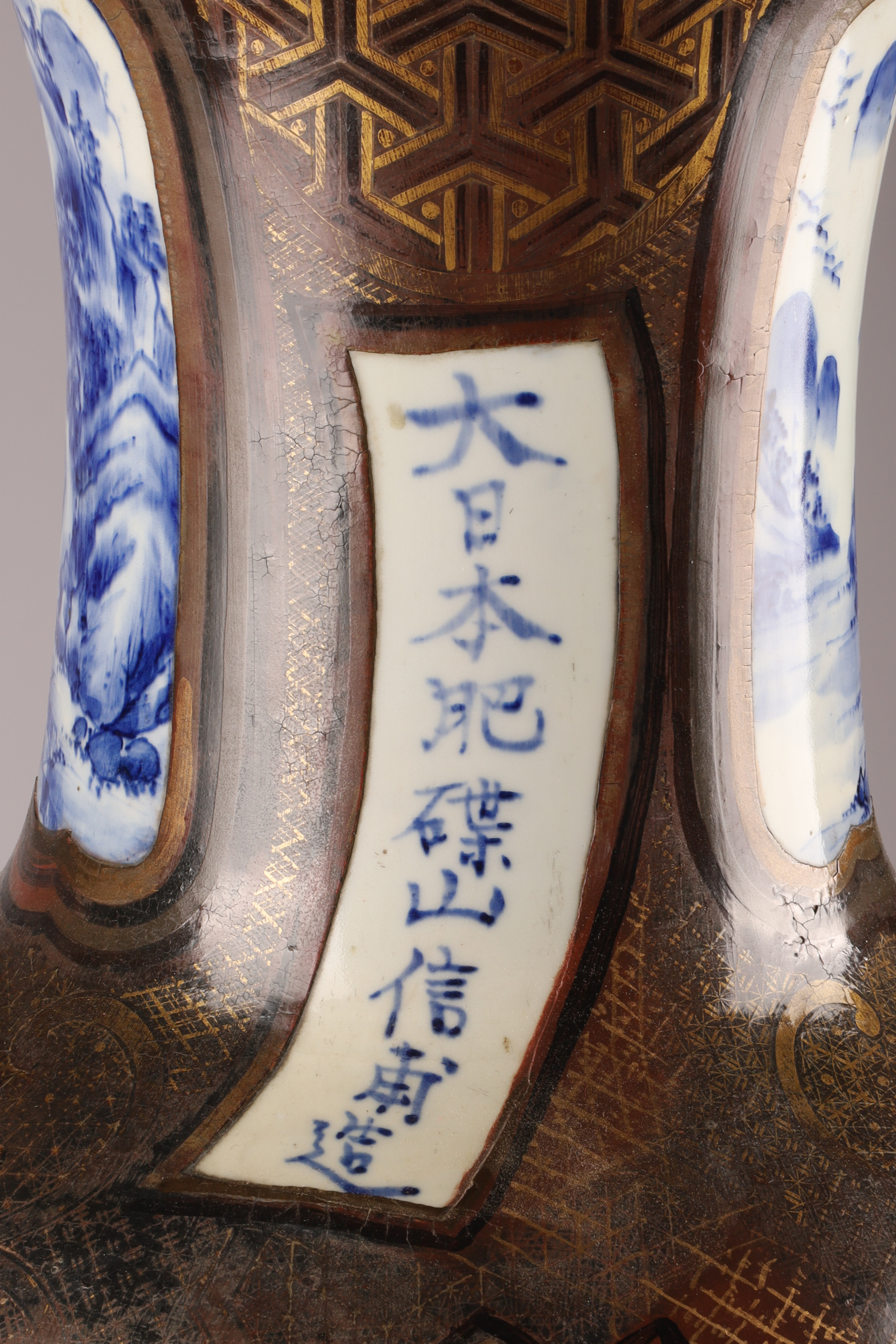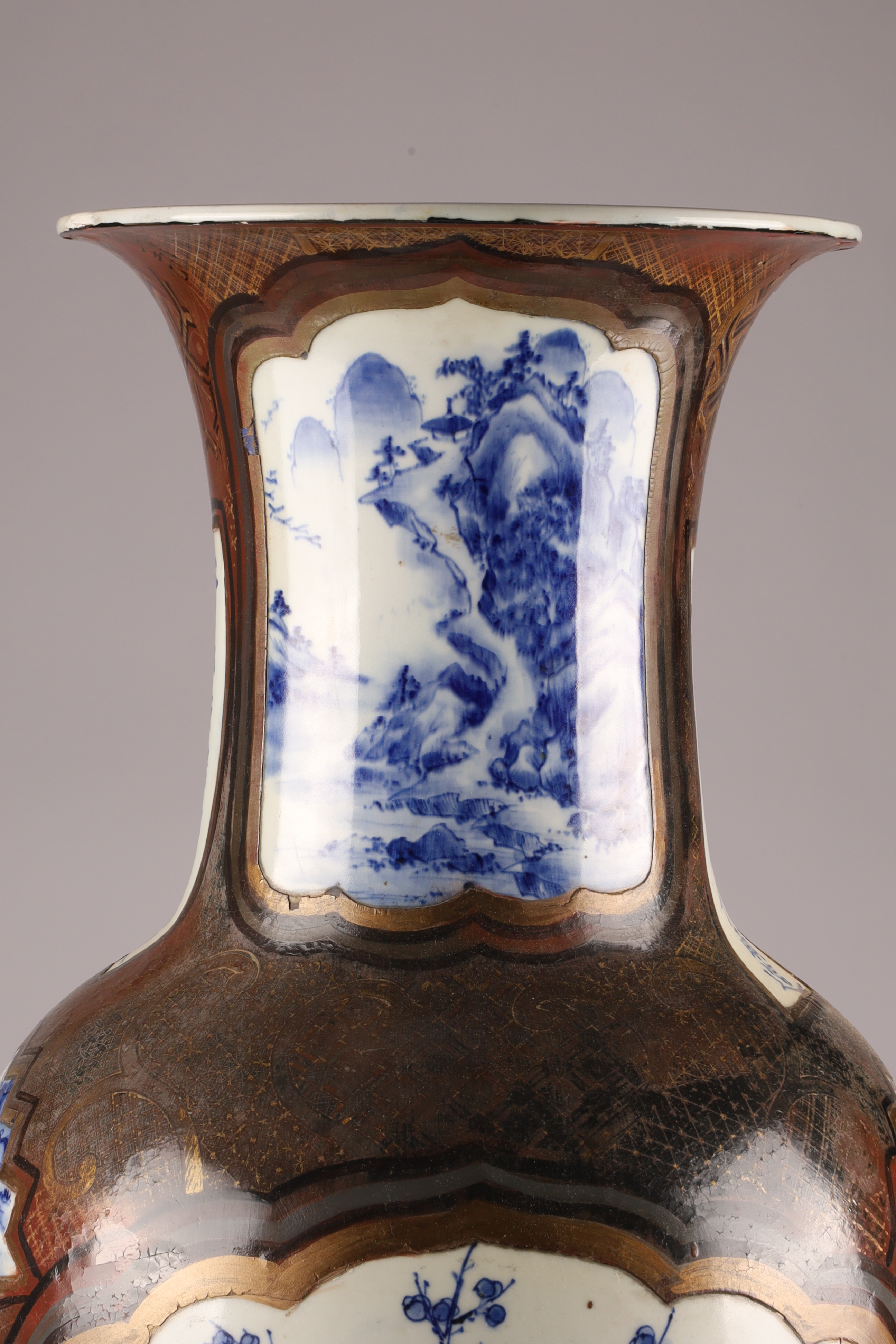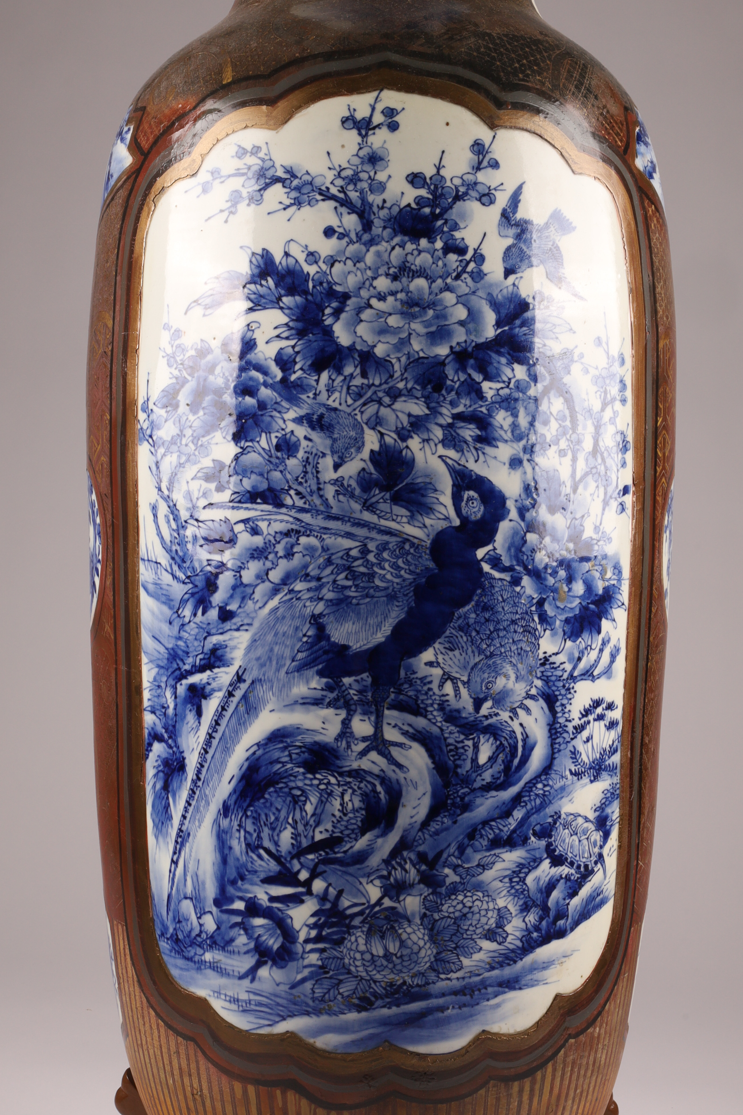 Very Large Antique Japanese Blue and White Floor Vase, Brown and Gilt Decoration, baluster form with flared rim, with calligraphy on neck. Decorated with landscapes of mountains, peonies and cherry blossoms with birds. On stand, measuring 44 inches H x 12 W.