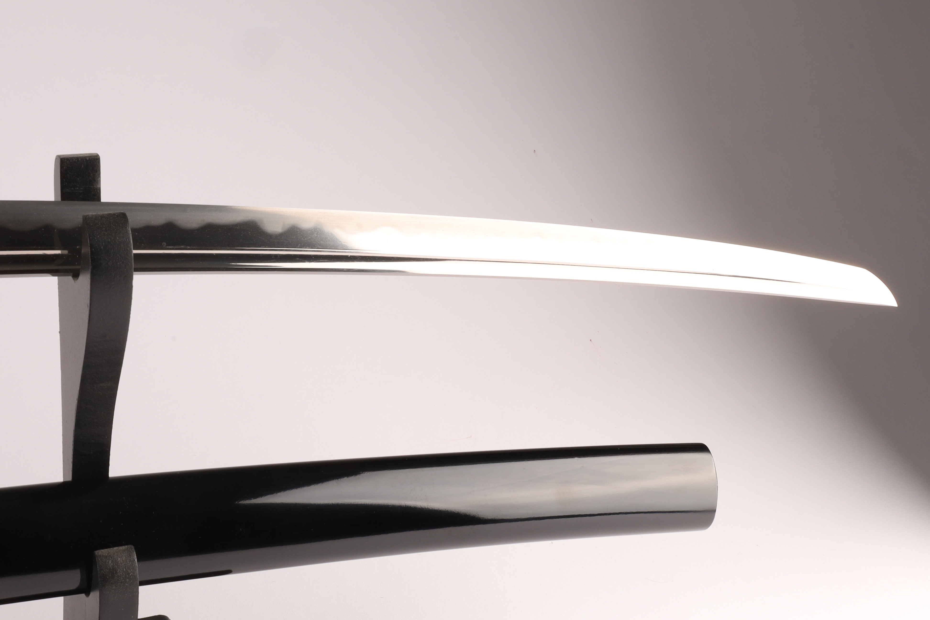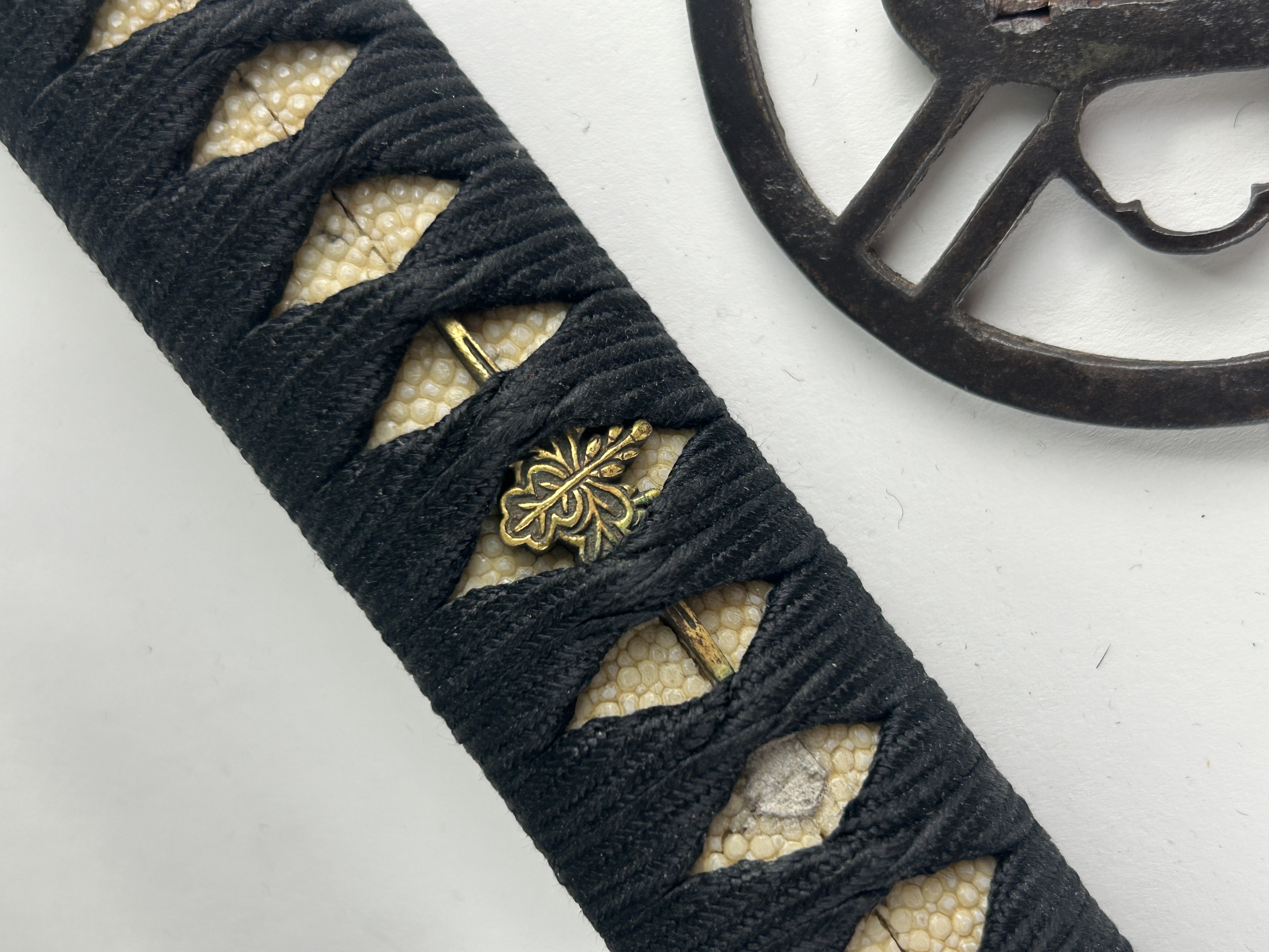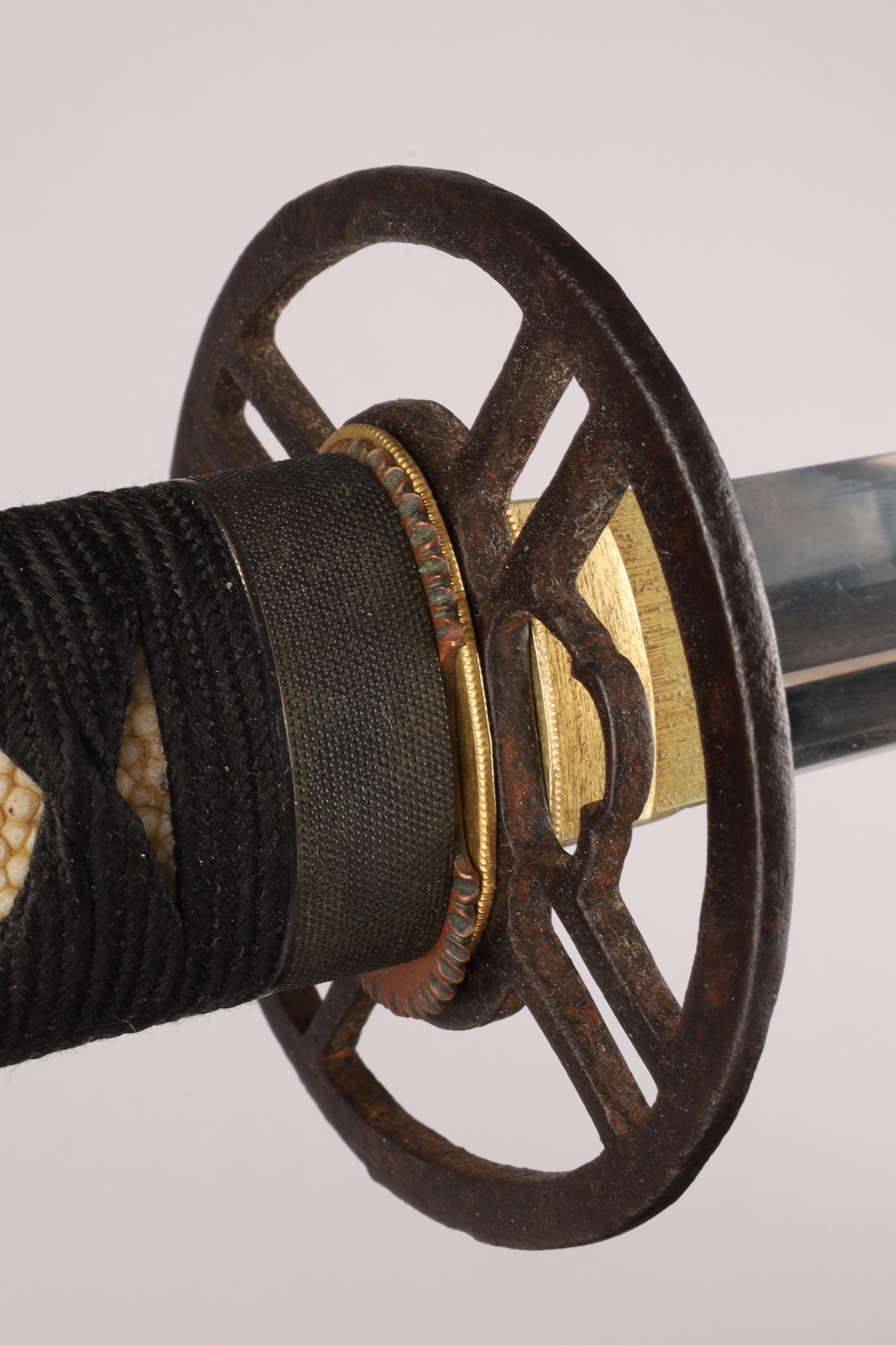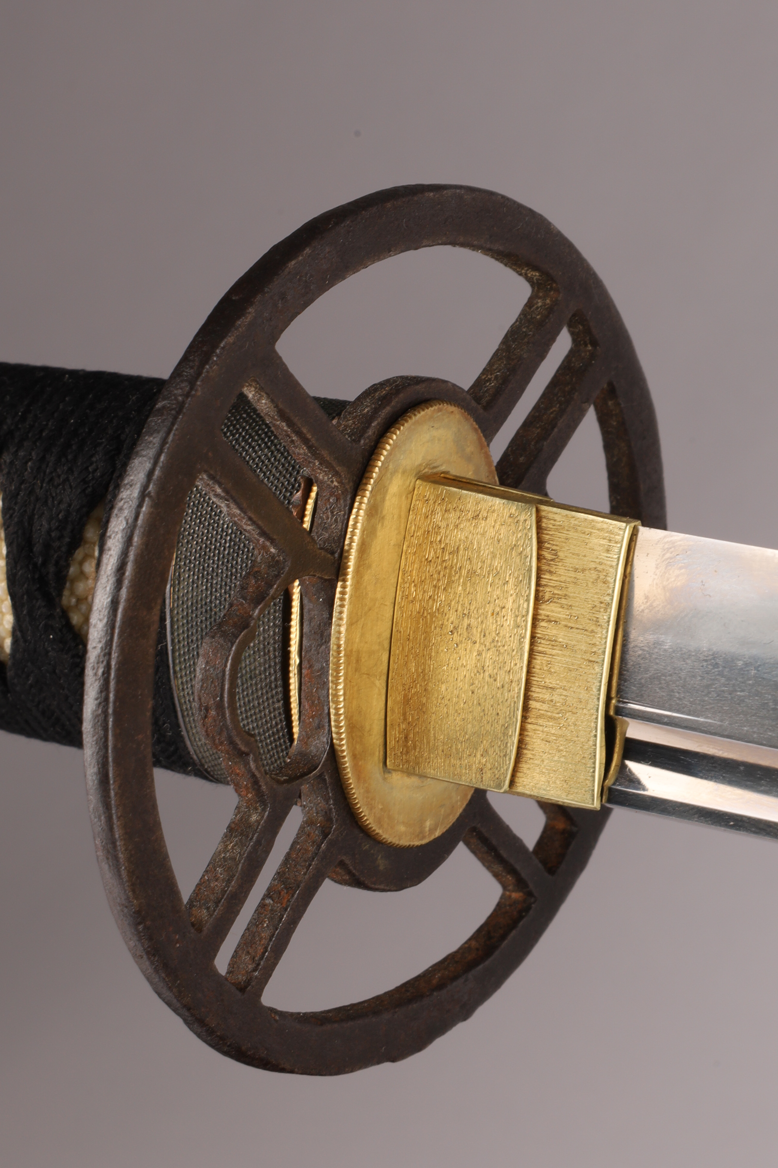 Muromachi period (1336-1573) long katana NBTHK attributed to Kashu Norimitsu in the Muromachi period. The swordsmith was active in the early 16th century. Kashu resided in the Kaga province that was ruled by Maeda clan when Norimitsu was alive. The Kaga province was very rich at the time, and it is believed that Norimitsu might have forged swords for samurai warriors living in the Kaga domain since he served Maeda clan. The mumei (unsigned) blade is 26.9 inches, just beautiful, free of blemishes and scratches, almost perfect. The Hamon, (or temperline) is wonderful. The koshirae is superb, with an iron forged Sukashi tsuba, a very complex carved shaped guard. The Habaki is copper. The blade has been attributed to Kashu Norimitsu through Tokubetsu Kicho Token as especially precious in the former system (1948-1982). With papers and silk bag. Circa 1800-1850. In koshirae, sword measures 39.5 inches L, blade measures 27.5 inches x 1 inch.