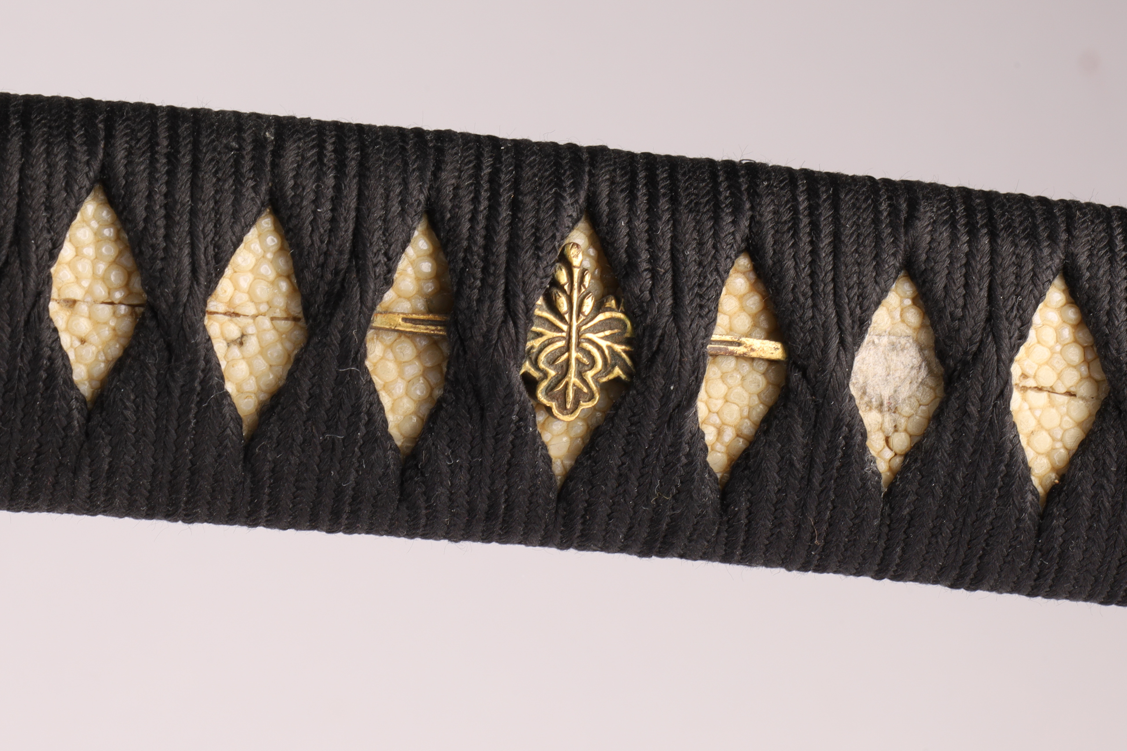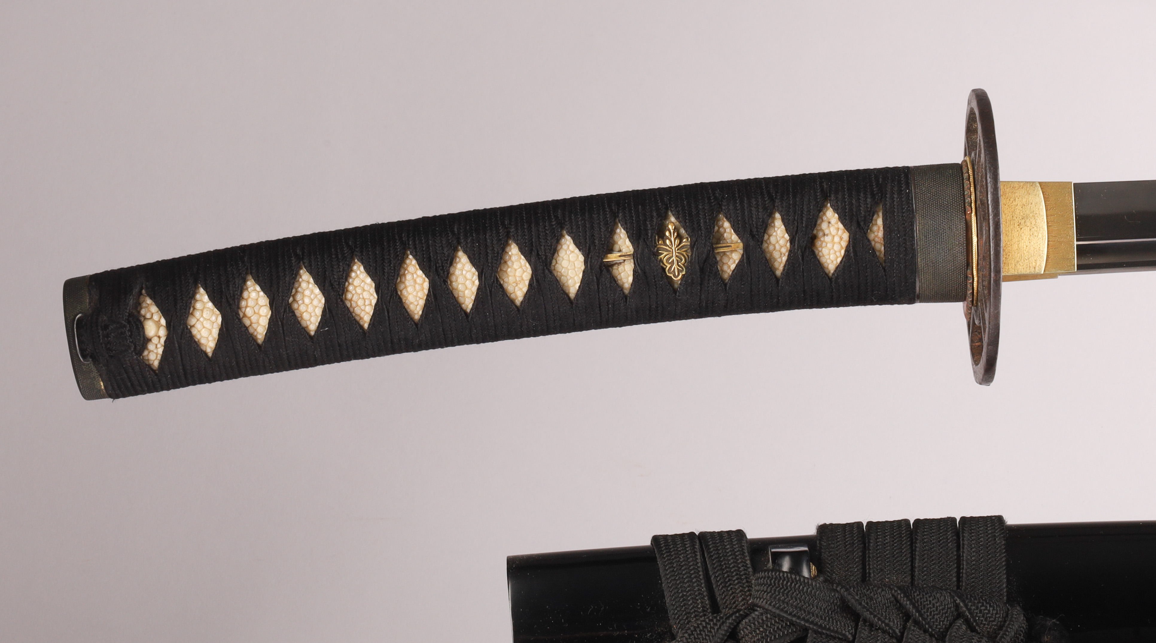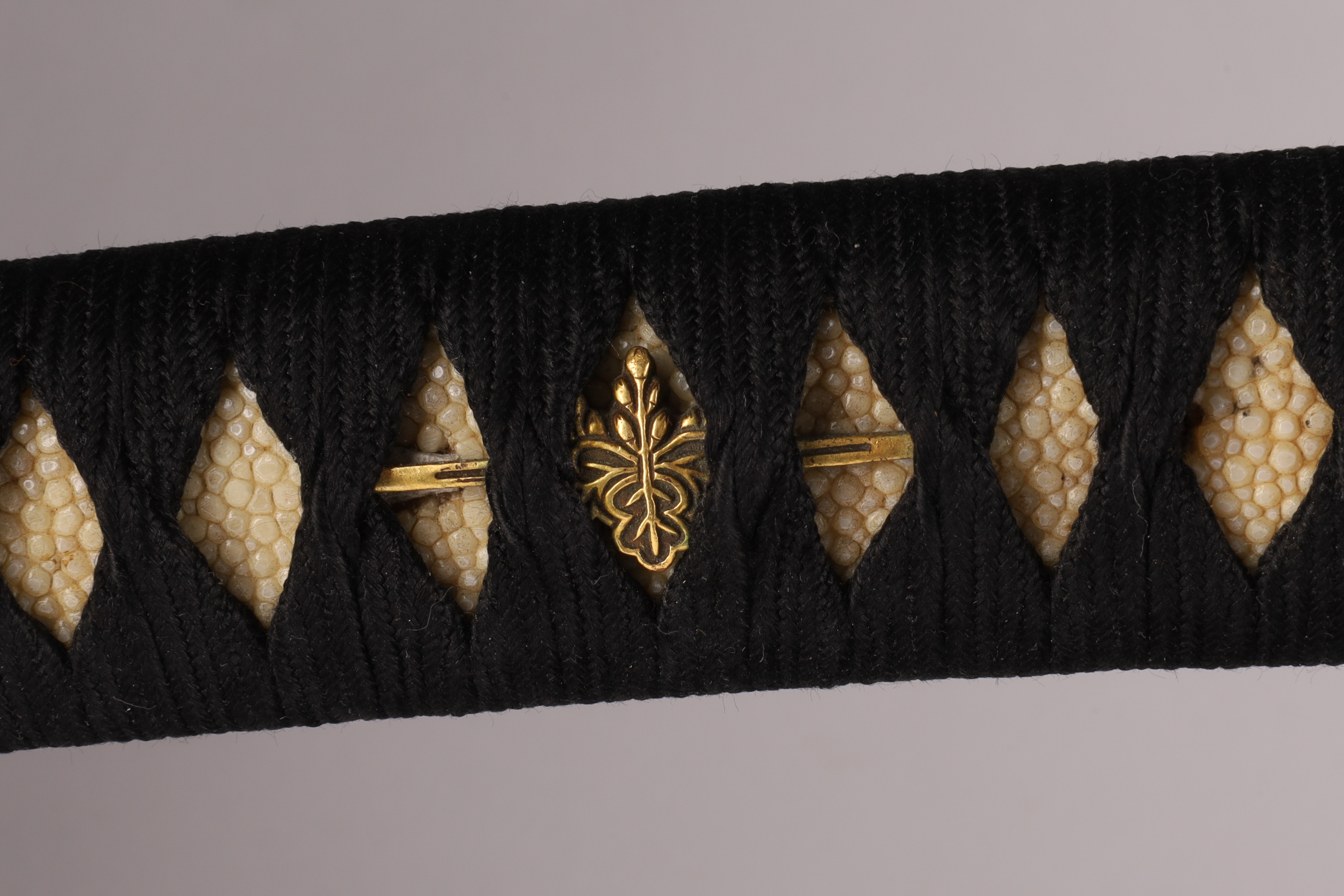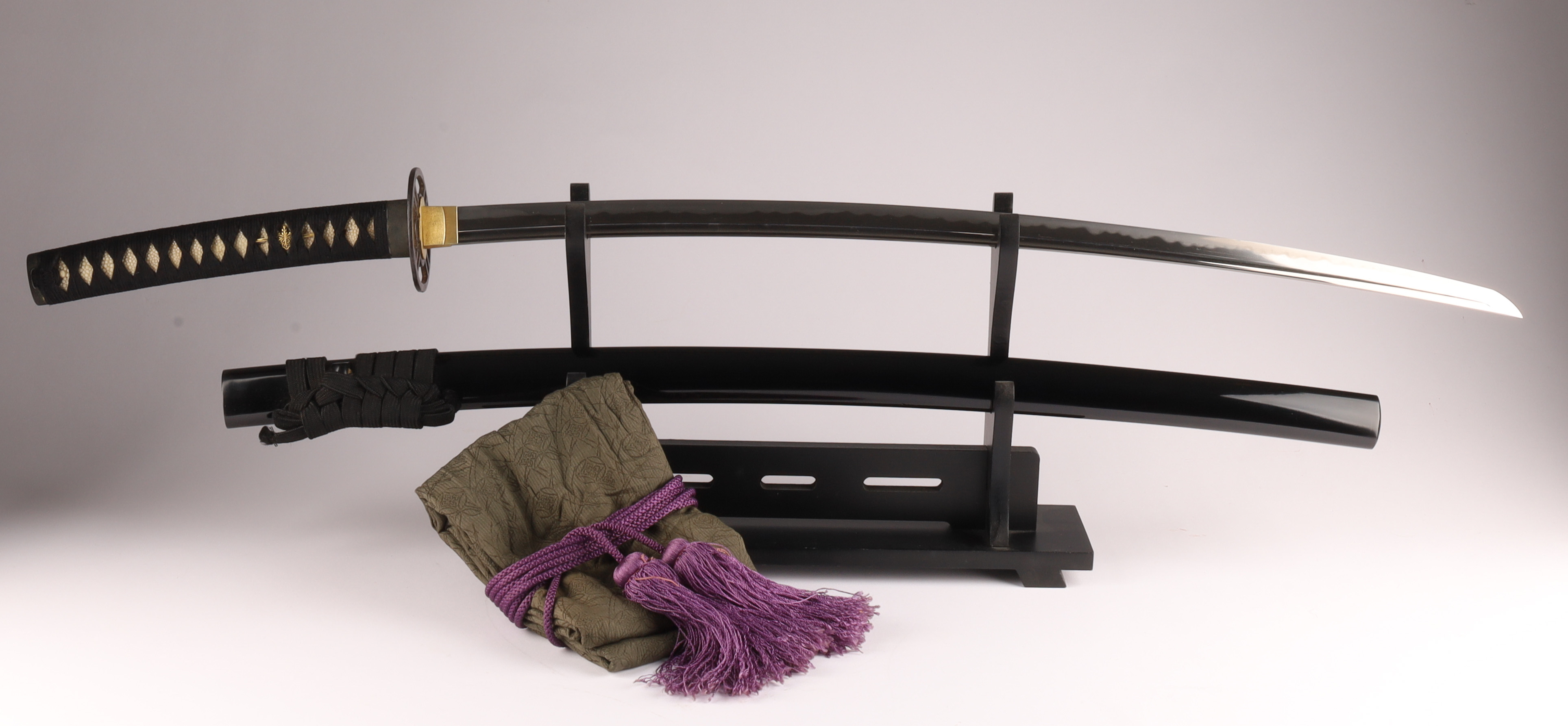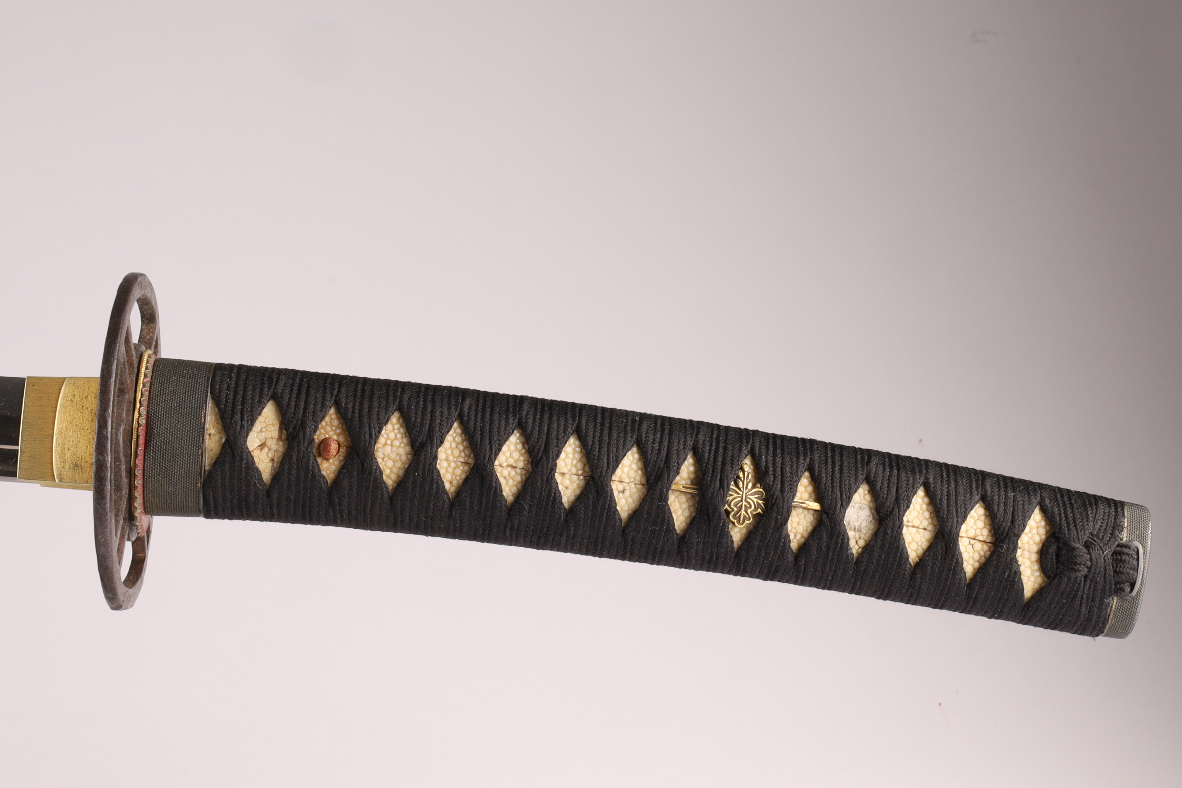 Muromachi period (1336-1573) long katana NBTHK attributed to Kashu Norimitsu in the Muromachi period. The swordsmith was active in the early 16th century. Kashu resided in the Kaga province that was ruled by Maeda clan when Norimitsu was alive. The Kaga province was very rich at the time, and it is believed that Norimitsu might have forged swords for samurai warriors living in the Kaga domain since he served Maeda clan. The mumei (unsigned) blade is 26.9 inches, just beautiful, free of blemishes and scratches, almost perfect. The Hamon, (or temperline) is wonderful. The koshirae is superb, with an iron forged Sukashi tsuba, a very complex carved shaped guard. The Habaki is copper. The blade has been attributed to Kashu Norimitsu through Tokubetsu Kicho Token as especially precious in the former system (1948-1982). With papers and silk bag. Circa 1800-1850. In koshirae, sword measures 39.5 inches L, blade measures 27.5 inches x 1 inch.