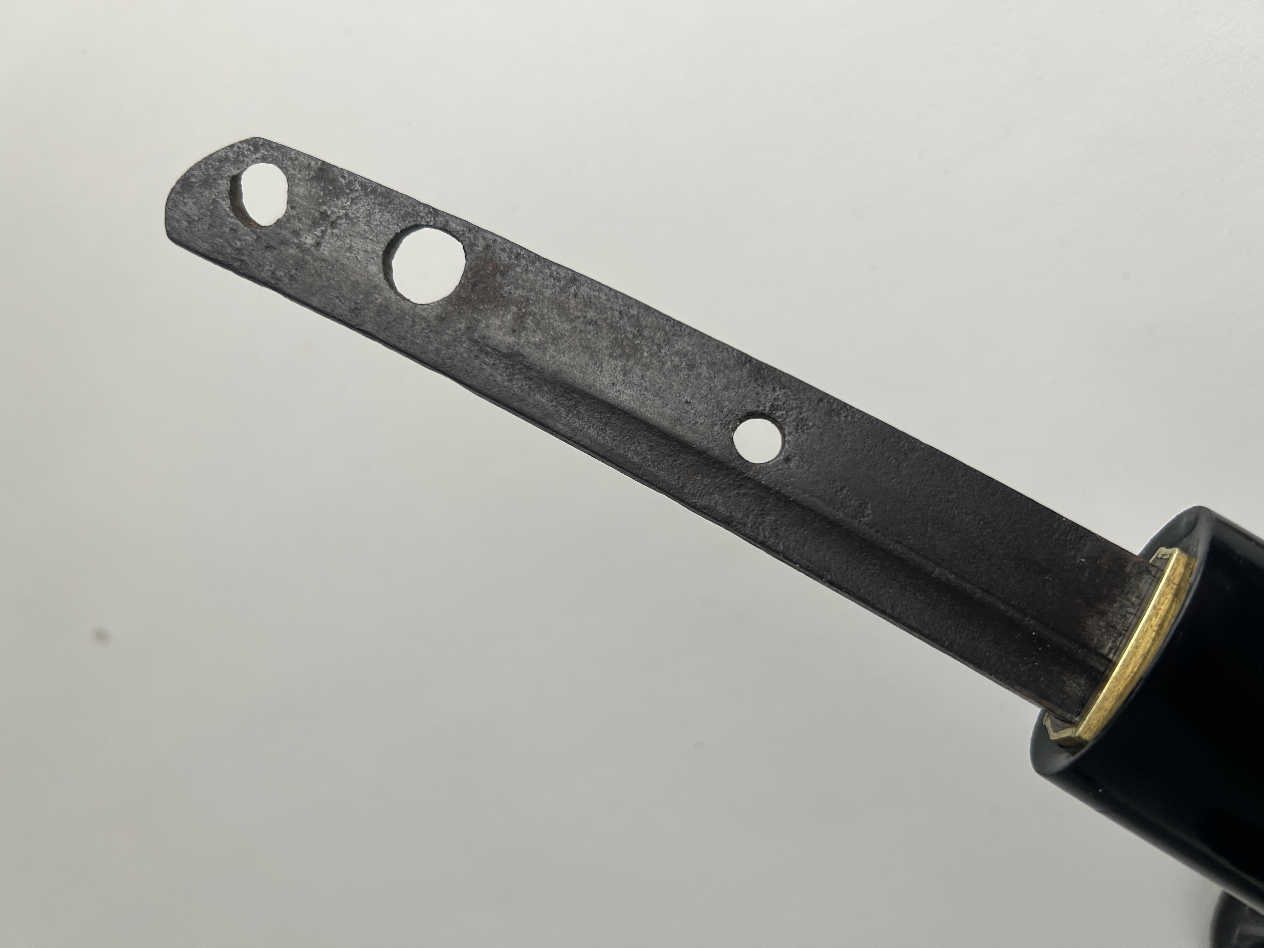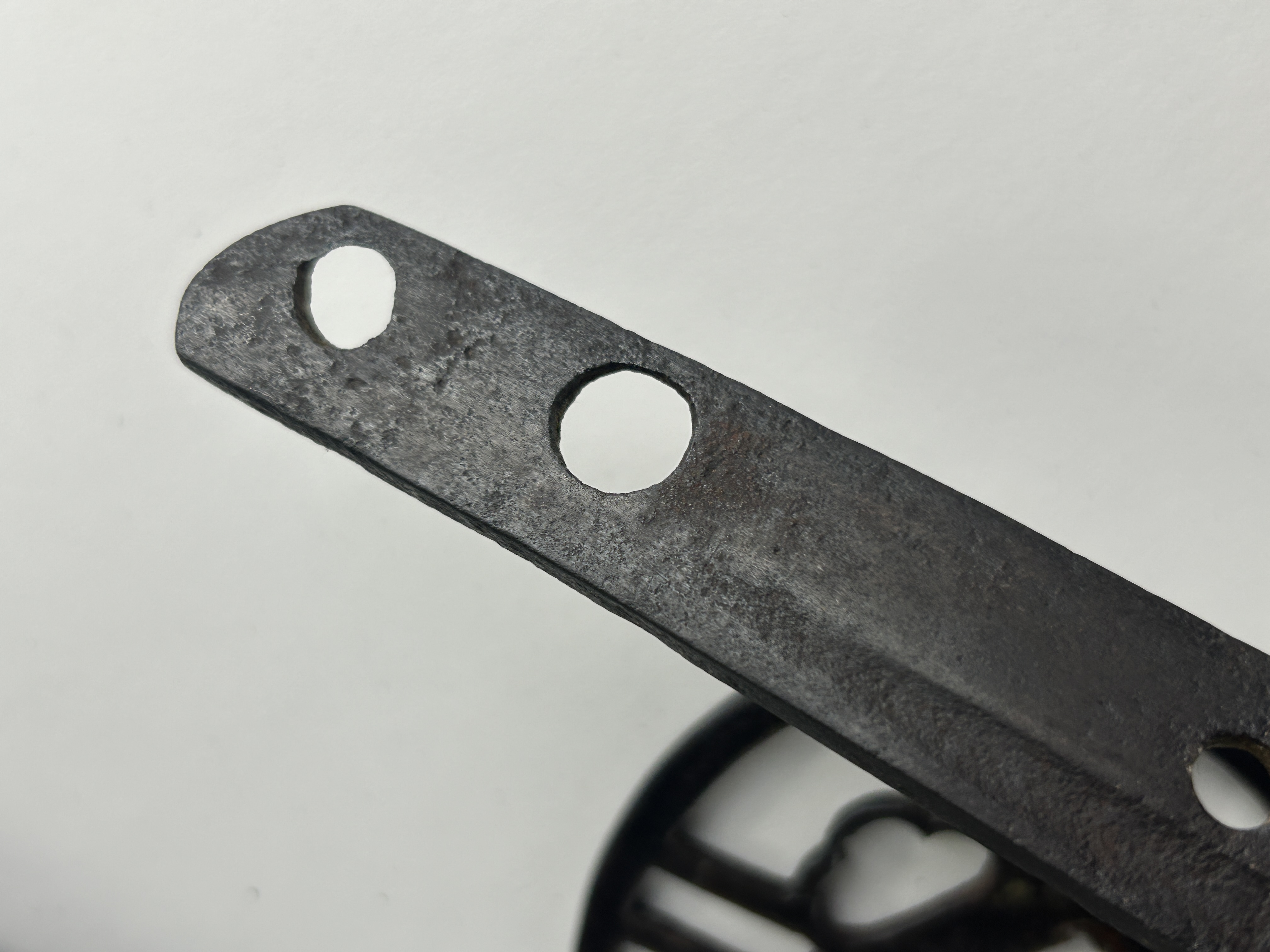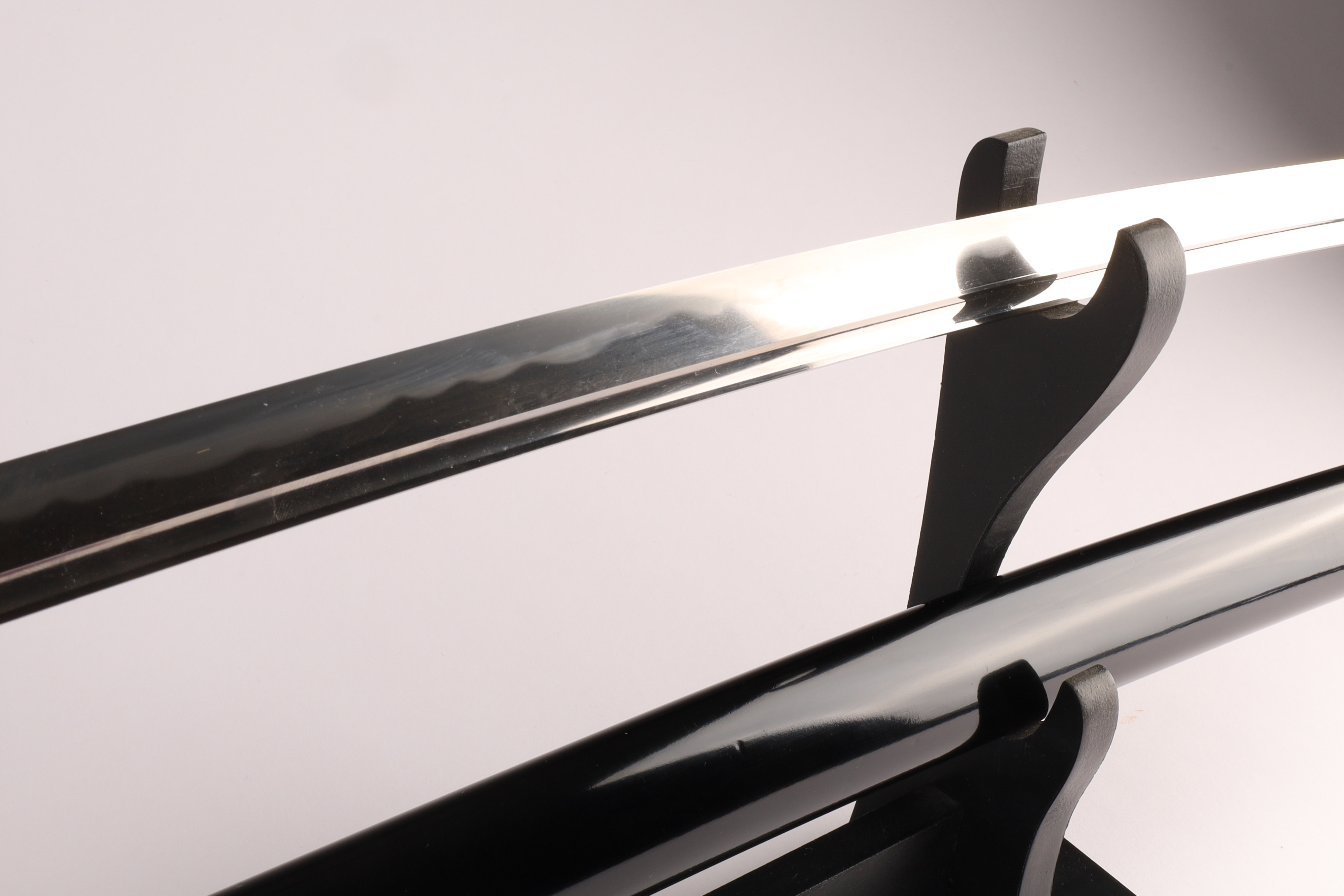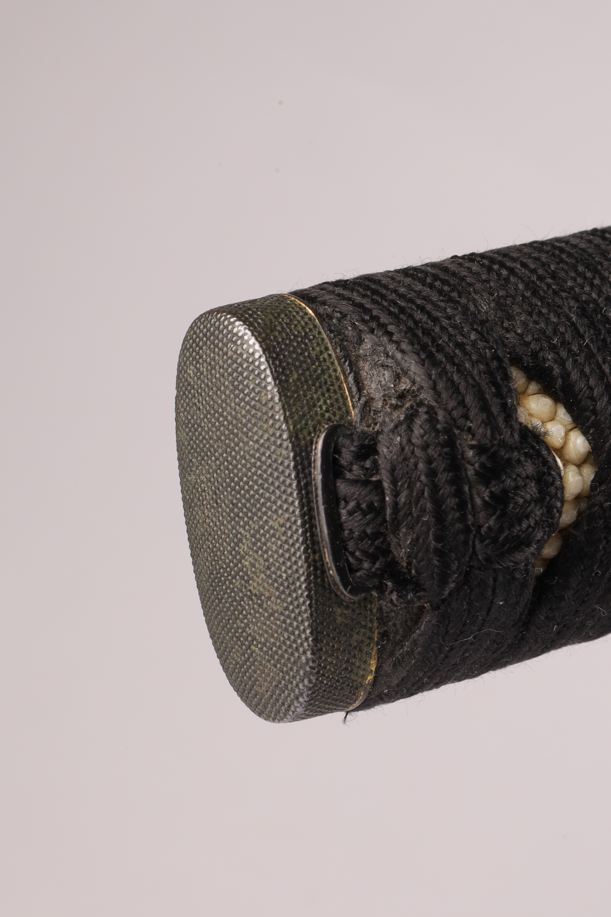 Muromachi period (1336-1573) long katana NBTHK attributed to Kashu Norimitsu in the Muromachi period. The swordsmith was active in the early 16th century. Kashu resided in the Kaga province that was ruled by Maeda clan when Norimitsu was alive. The Kaga province was very rich at the time, and it is believed that Norimitsu might have forged swords for samurai warriors living in the Kaga domain since he served Maeda clan. The mumei (unsigned) blade is 26.9 inches, just beautiful, free of blemishes and scratches, almost perfect. The Hamon, (or temperline) is wonderful. The koshirae is superb, with an iron forged Sukashi tsuba, a very complex carved shaped guard. The Habaki is copper. The blade has been attributed to Kashu Norimitsu through Tokubetsu Kicho Token as especially precious in the former system (1948-1982). With papers and silk bag. Circa 1800-1850. In koshirae, sword measures 39.5 inches L, blade measures 27.5 inches x 1 inch.