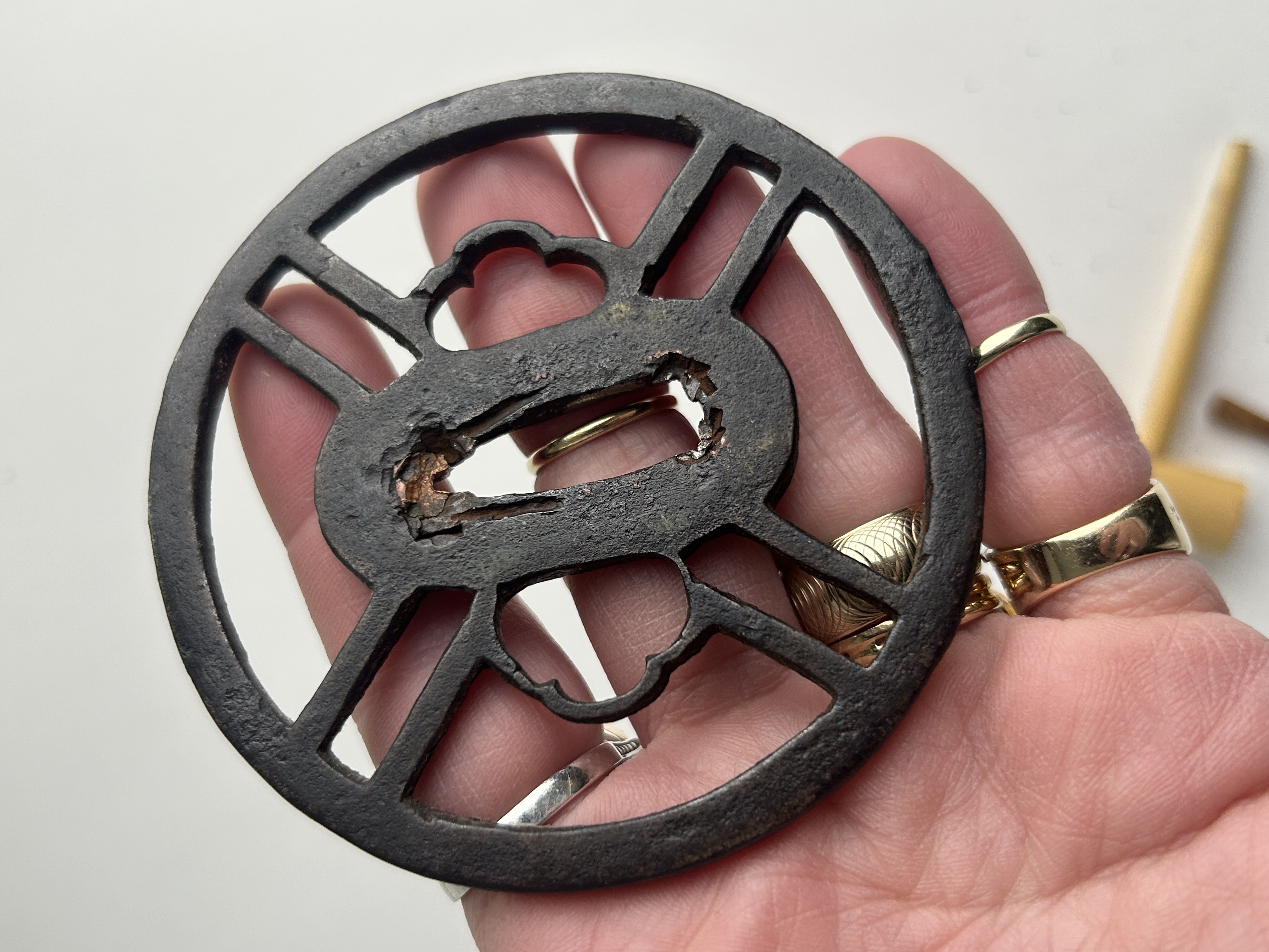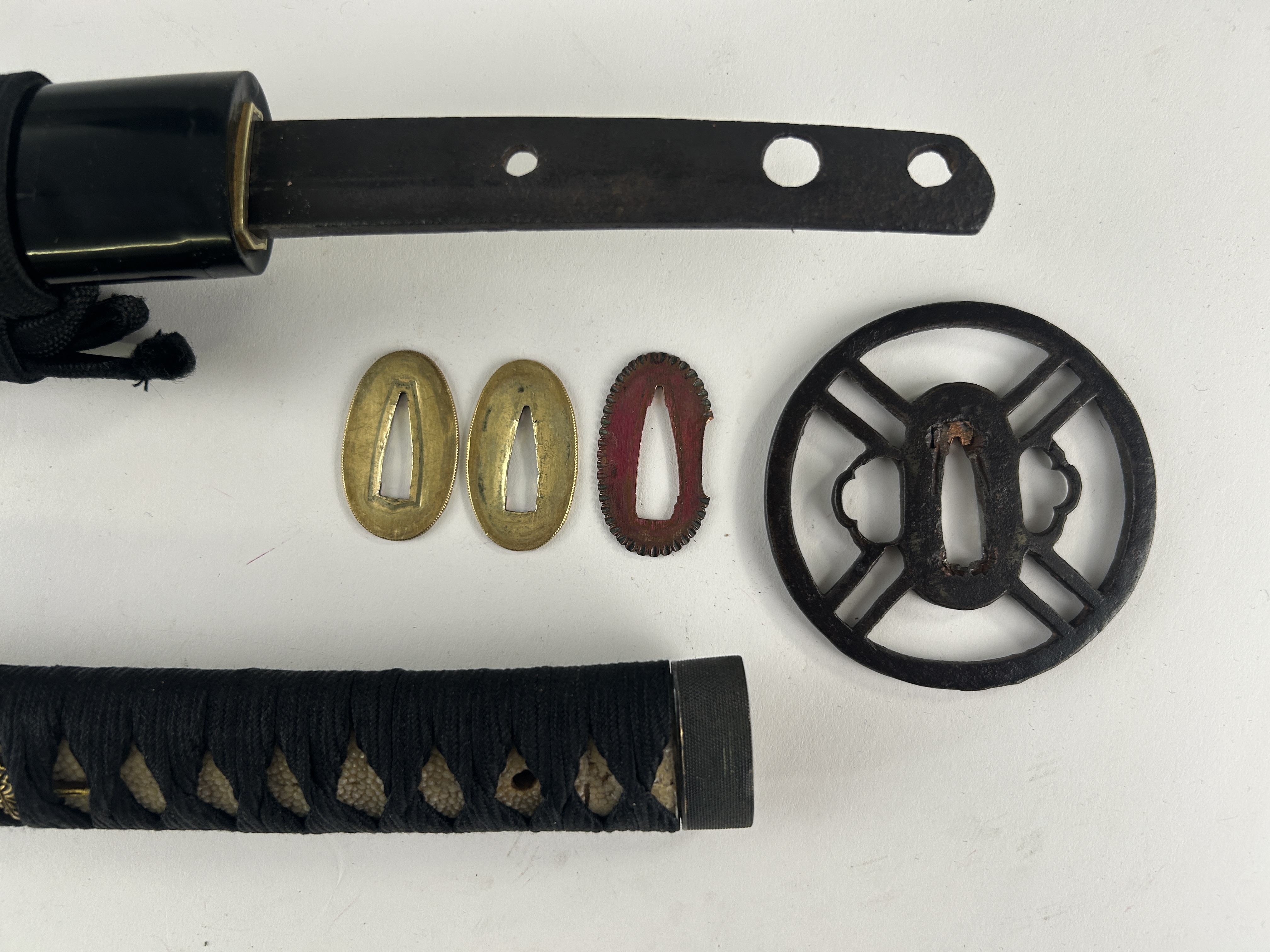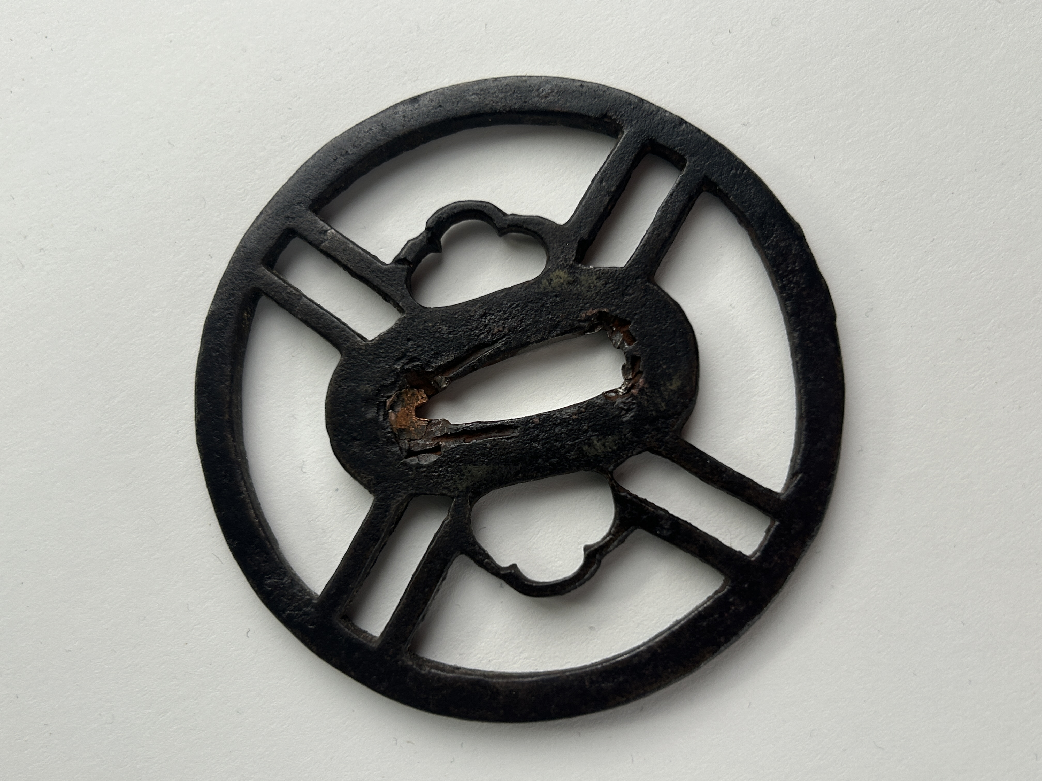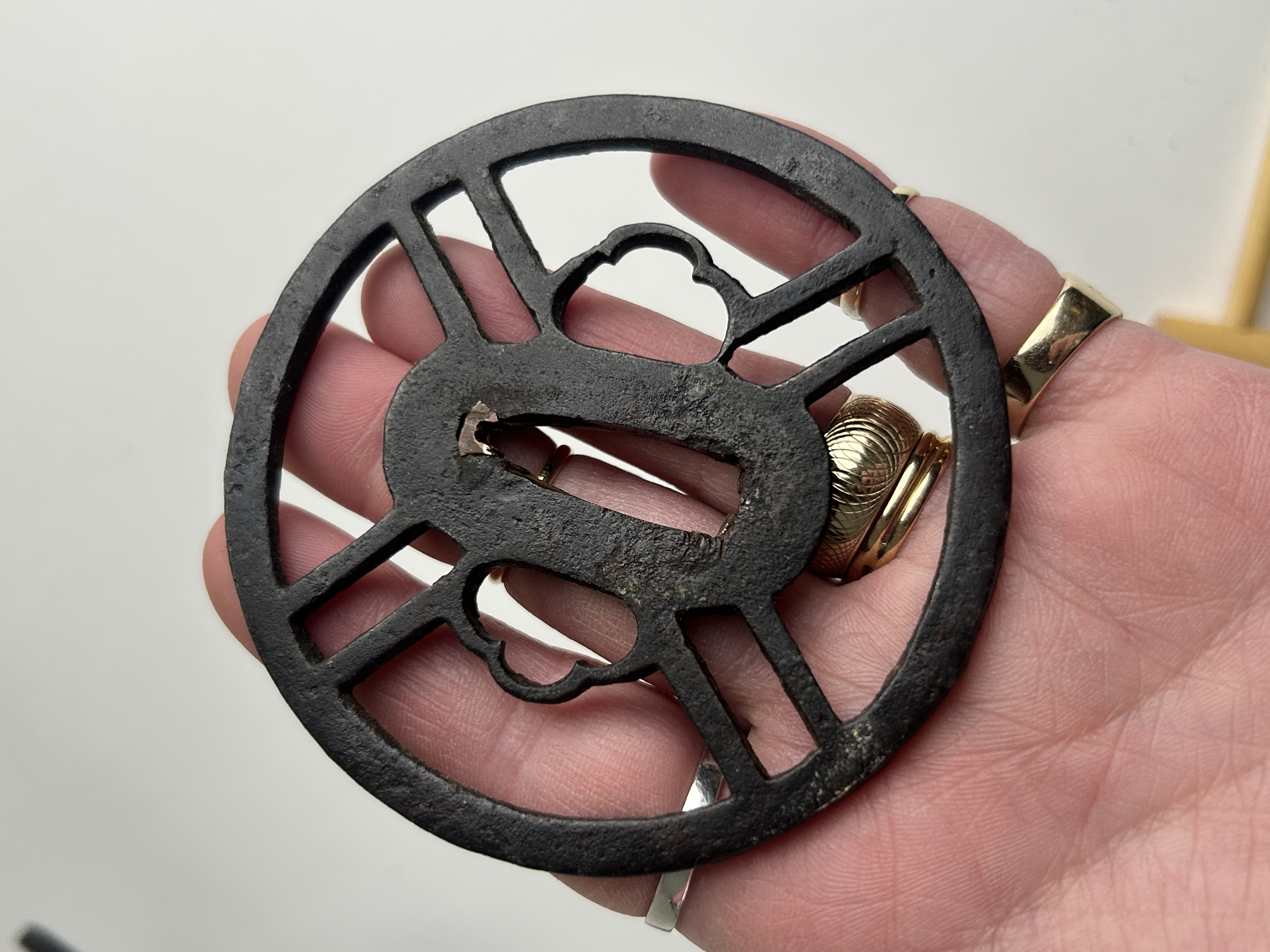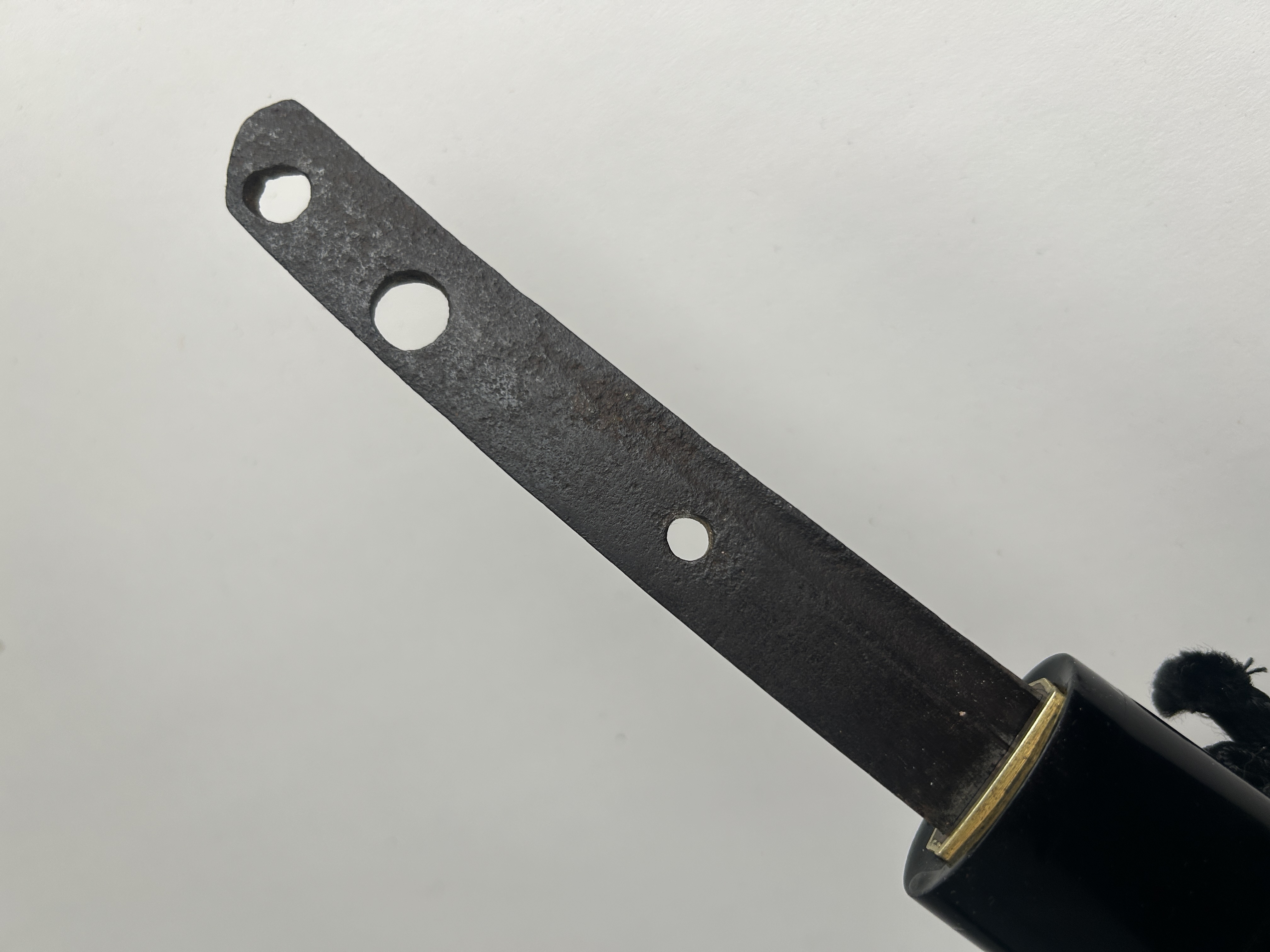 Muromachi period (1336-1573) long katana NBTHK attributed to Kashu Norimitsu in the Muromachi period. The swordsmith was active in the early 16th century. Kashu resided in the Kaga province that was ruled by Maeda clan when Norimitsu was alive. The Kaga province was very rich at the time, and it is believed that Norimitsu might have forged swords for samurai warriors living in the Kaga domain since he served Maeda clan. The mumei (unsigned) blade is 26.9 inches, just beautiful, free of blemishes and scratches, almost perfect. The Hamon, (or temperline) is wonderful. The koshirae is superb, with an iron forged Sukashi tsuba, a very complex carved shaped guard. The Habaki is copper. The blade has been attributed to Kashu Norimitsu through Tokubetsu Kicho Token as especially precious in the former system (1948-1982). With papers and silk bag. Circa 1800-1850. In koshirae, sword measures 39.5 inches L, blade measures 27.5 inches x 1 inch.