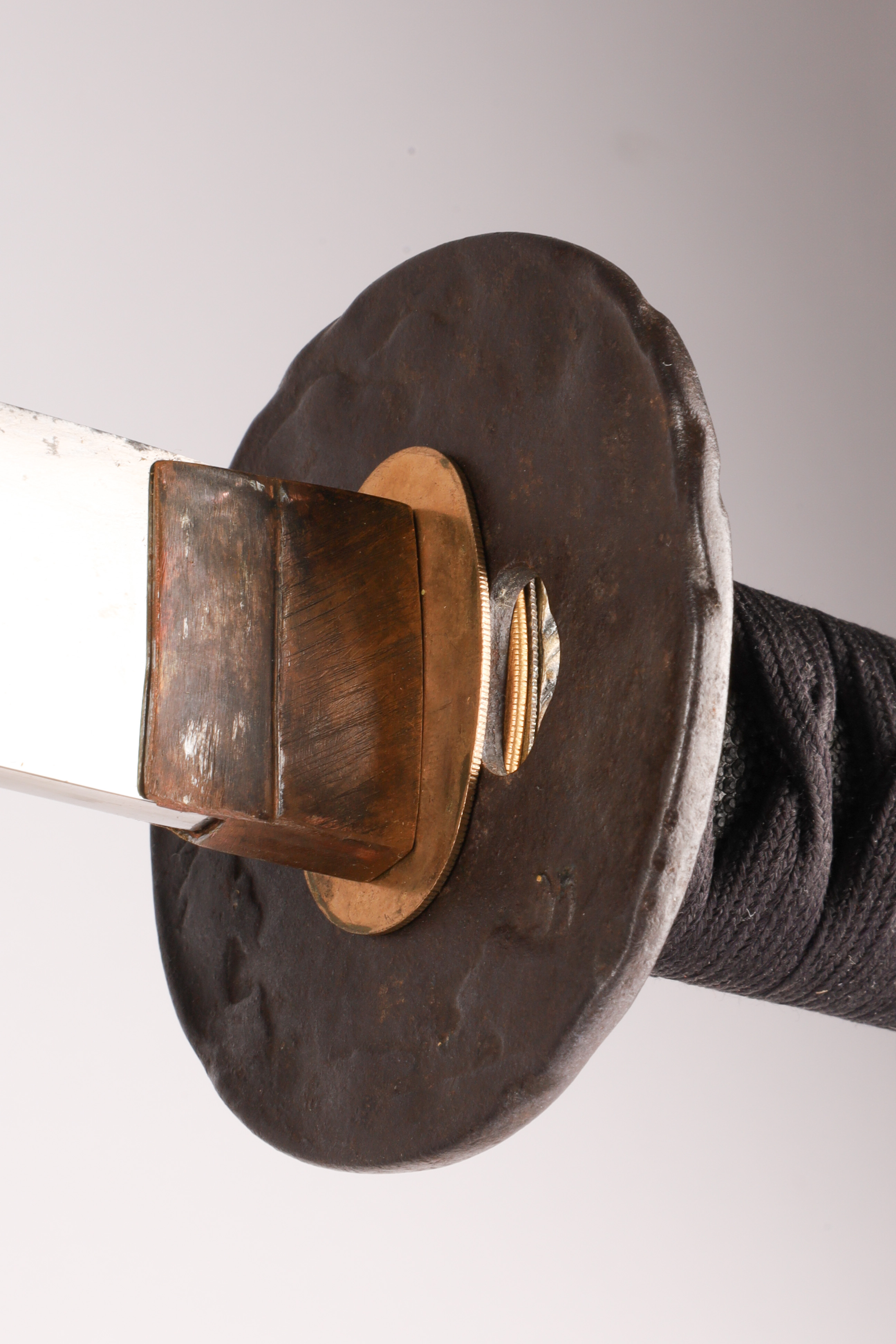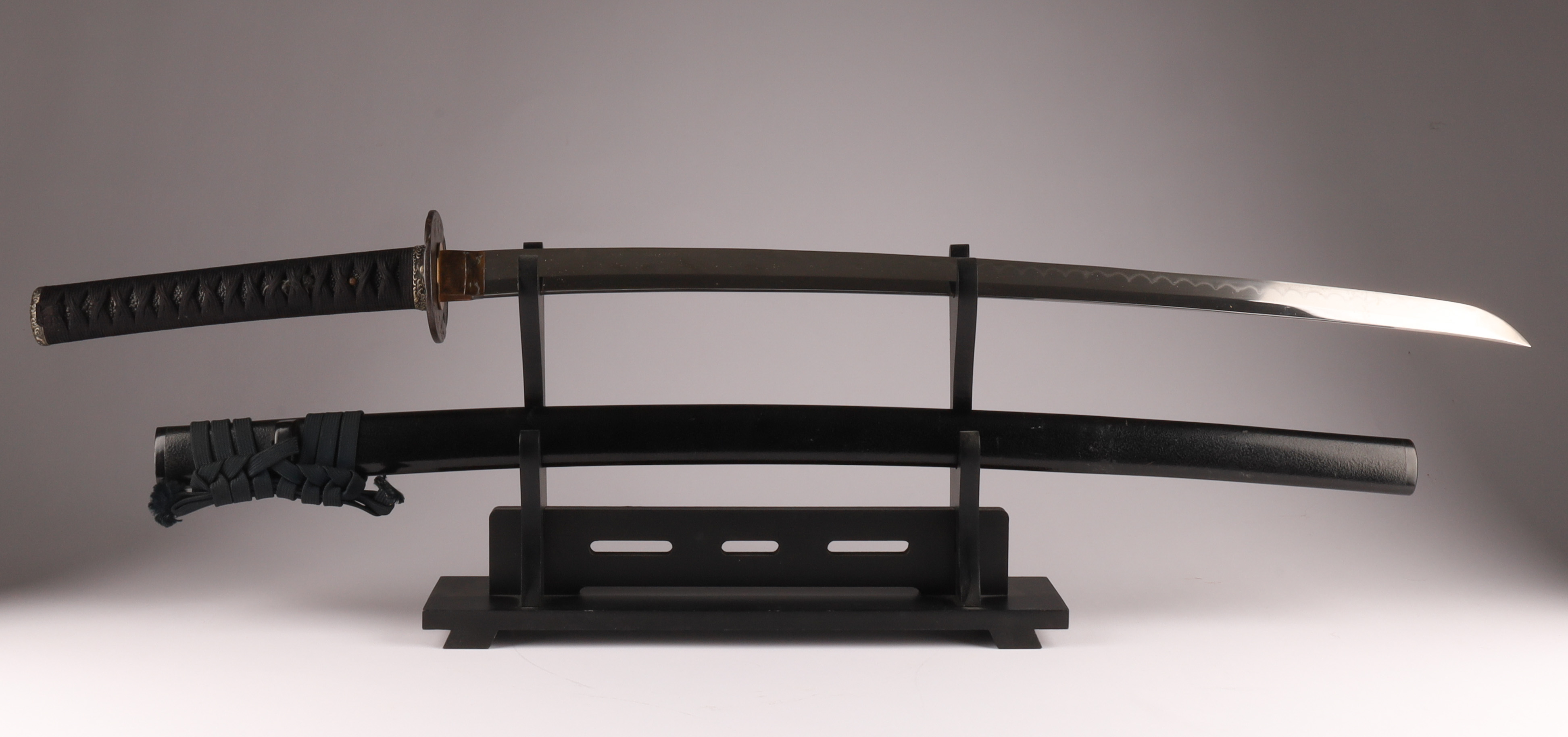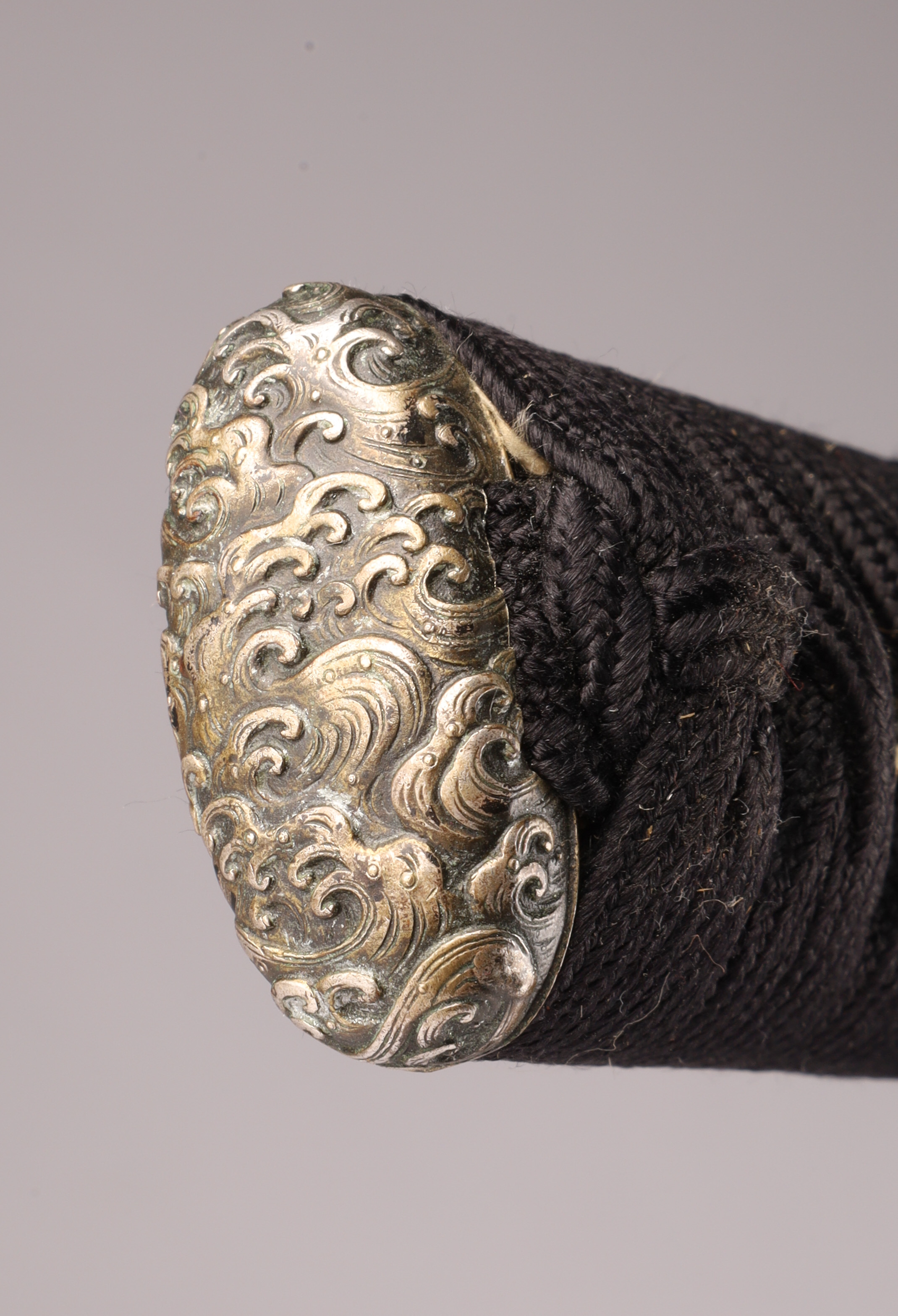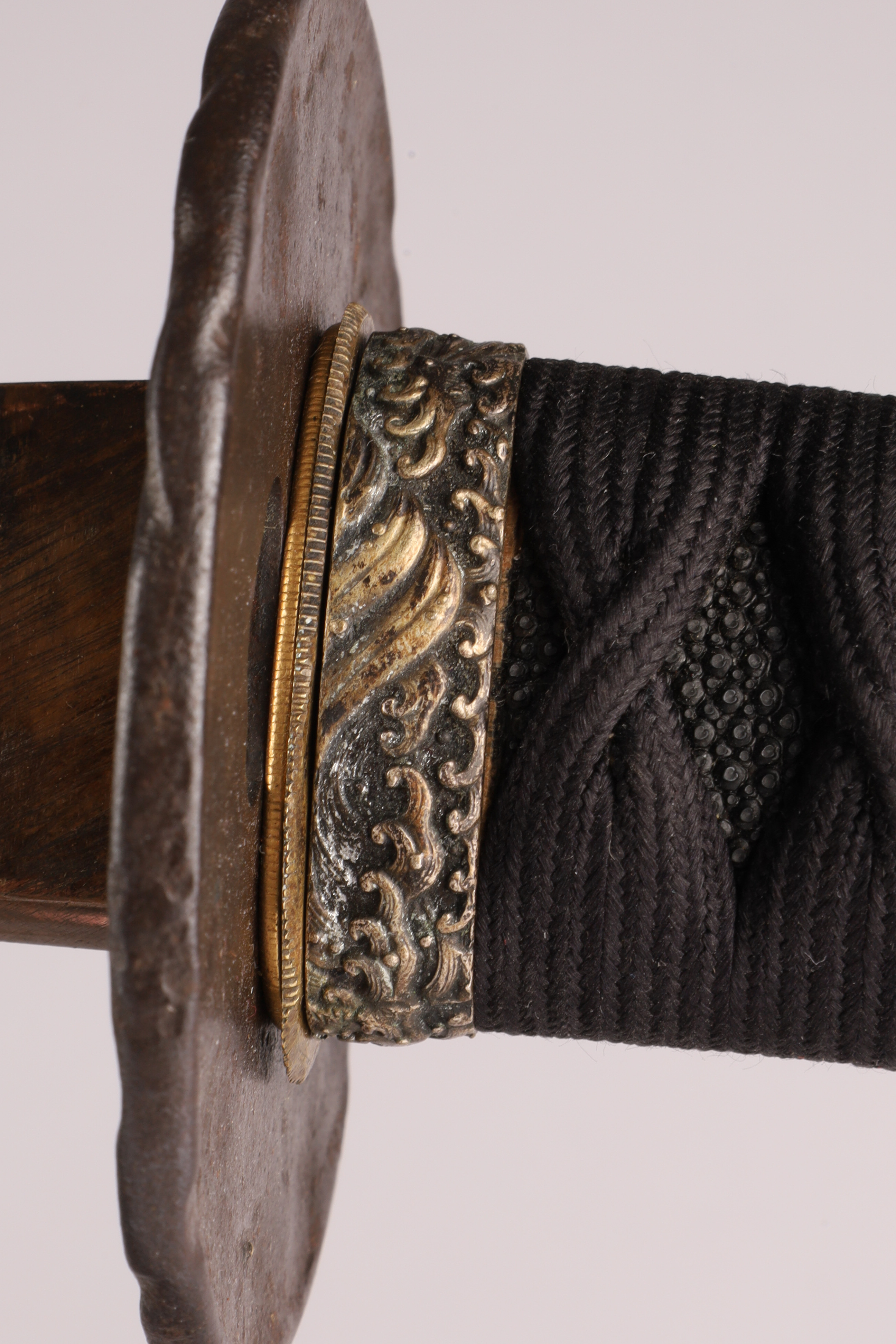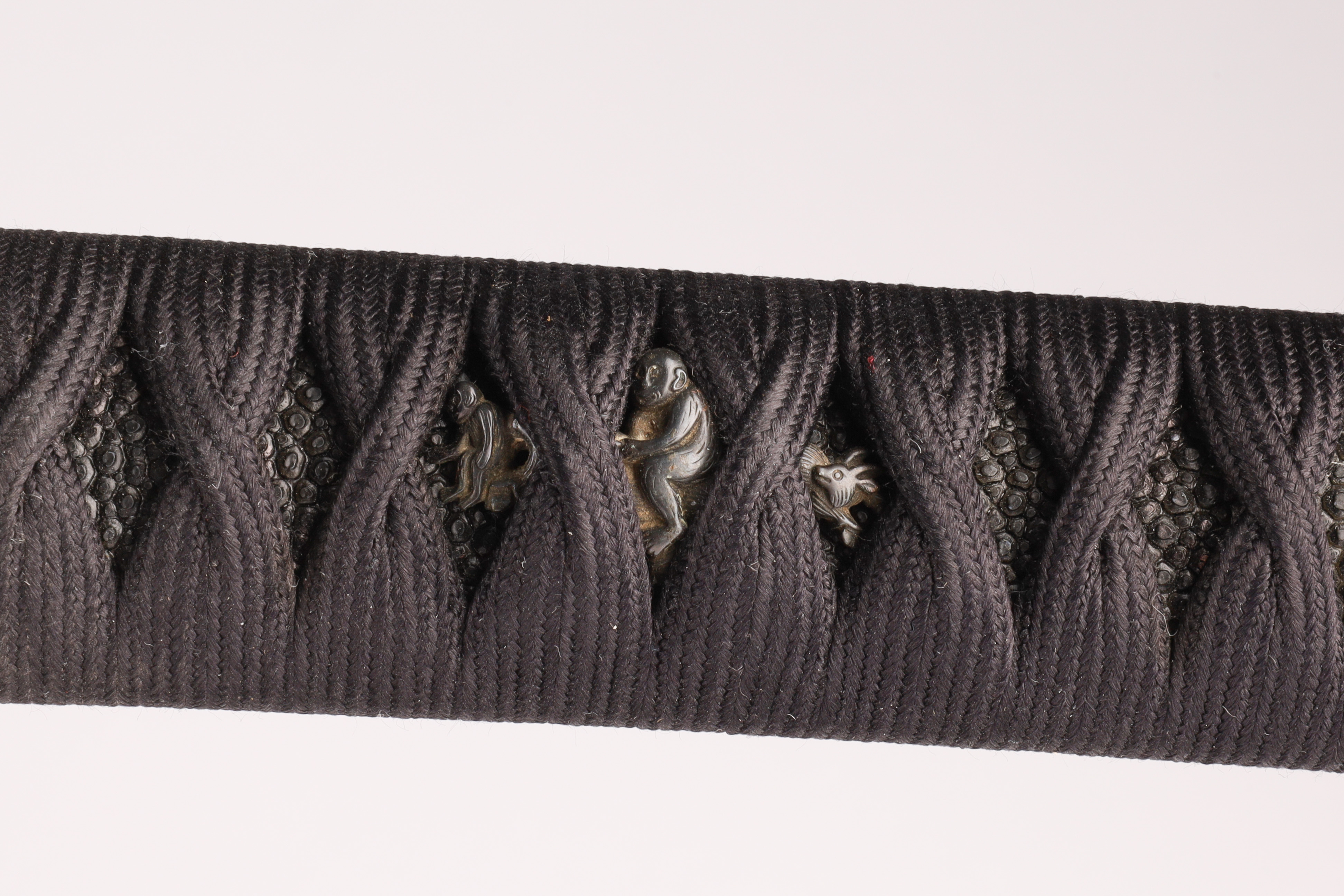 Edo period (1603-1868) Japanese samurai dark long katana . The blade is mumei, or unsigned, an. 26.1 inches , overall 40.9 inches with saya or scabbard. The blade has very stunning Hamon with a few blemishes. The dark koshirae is in perfect shape and very good-looking. The Fuchi and Kashira are made in a wave pattern called ‘Hiranami’ style, a design of broad, crashing waves. The tsuba is iron, an armorer’s tsuba, signed, and very attractive. It is wavy with faint scenes of landscape and skies. The wooden saya is in excellent shape also. Overall a very collectible and handsome Japanese samurai sword. Circa 1800-1850. Sword measures 40.5 inches, blade measures 26.5 inches L.