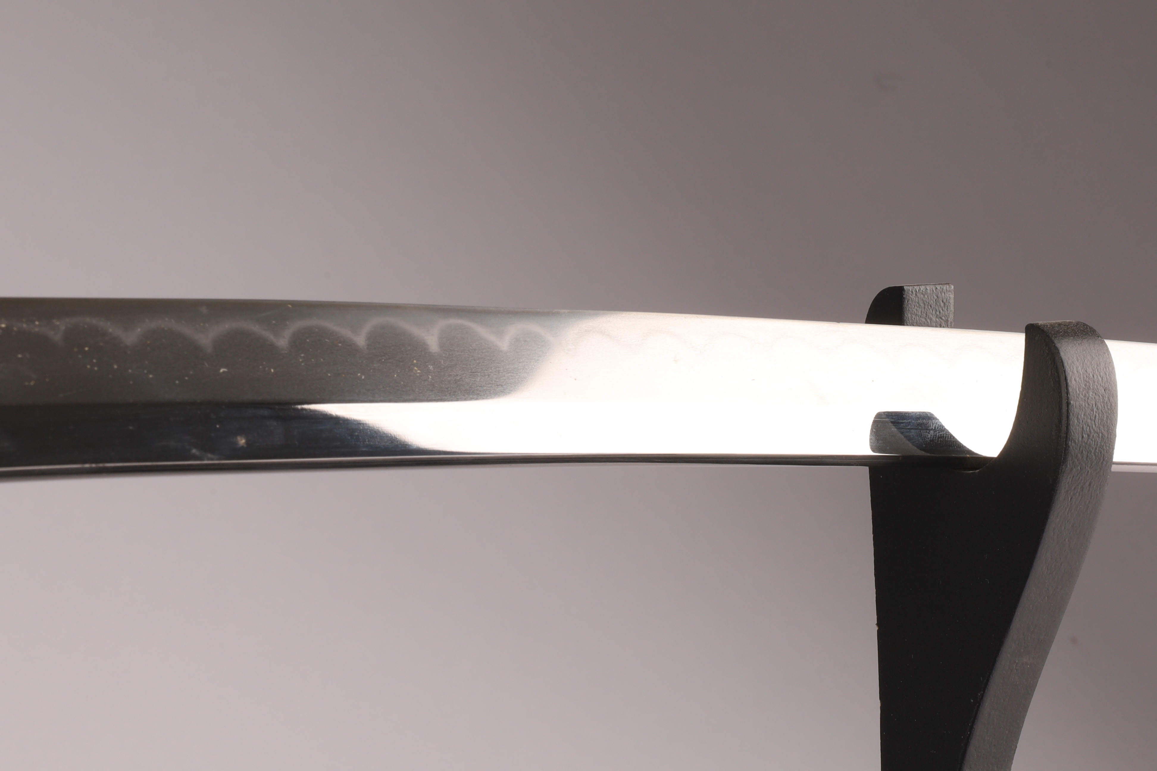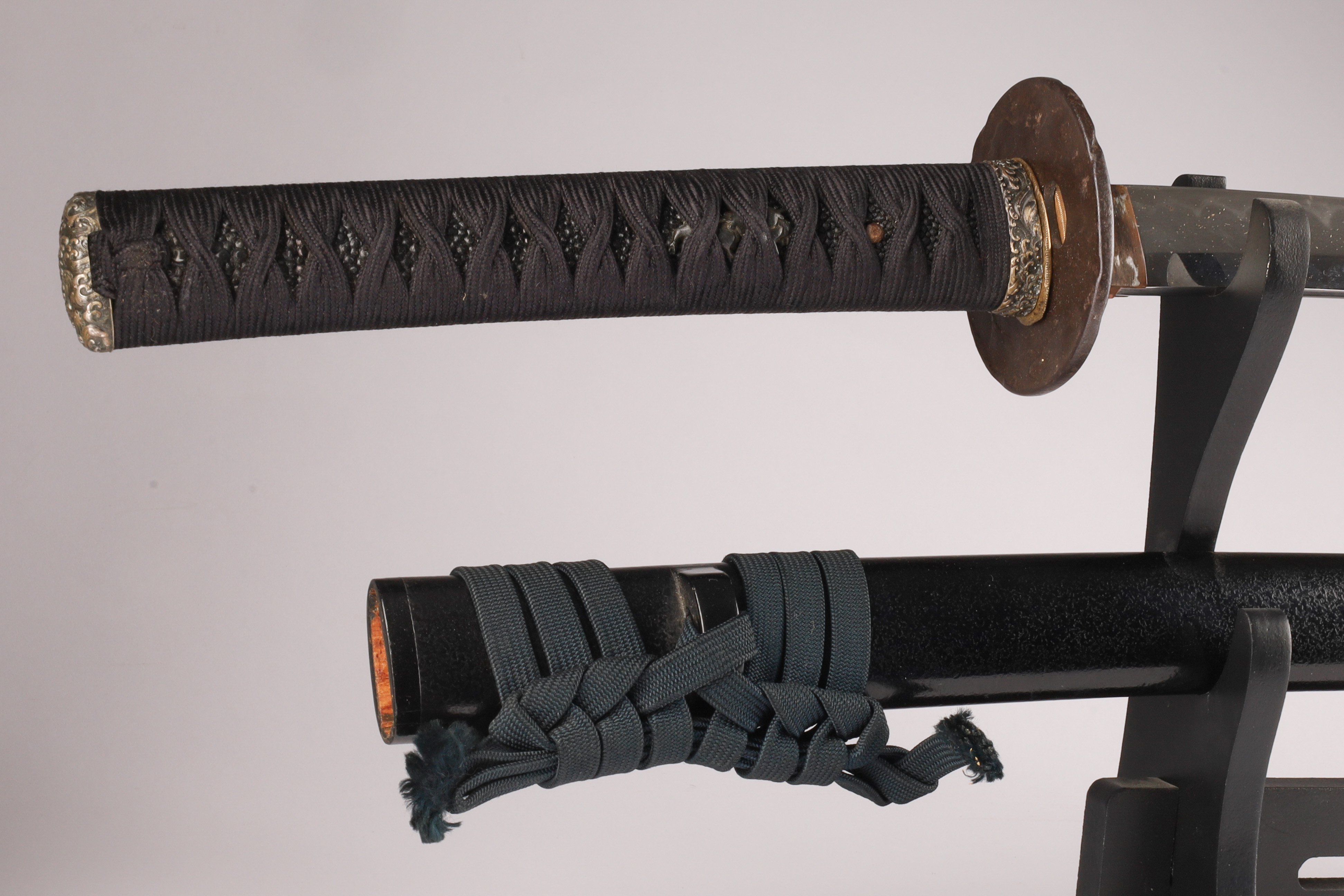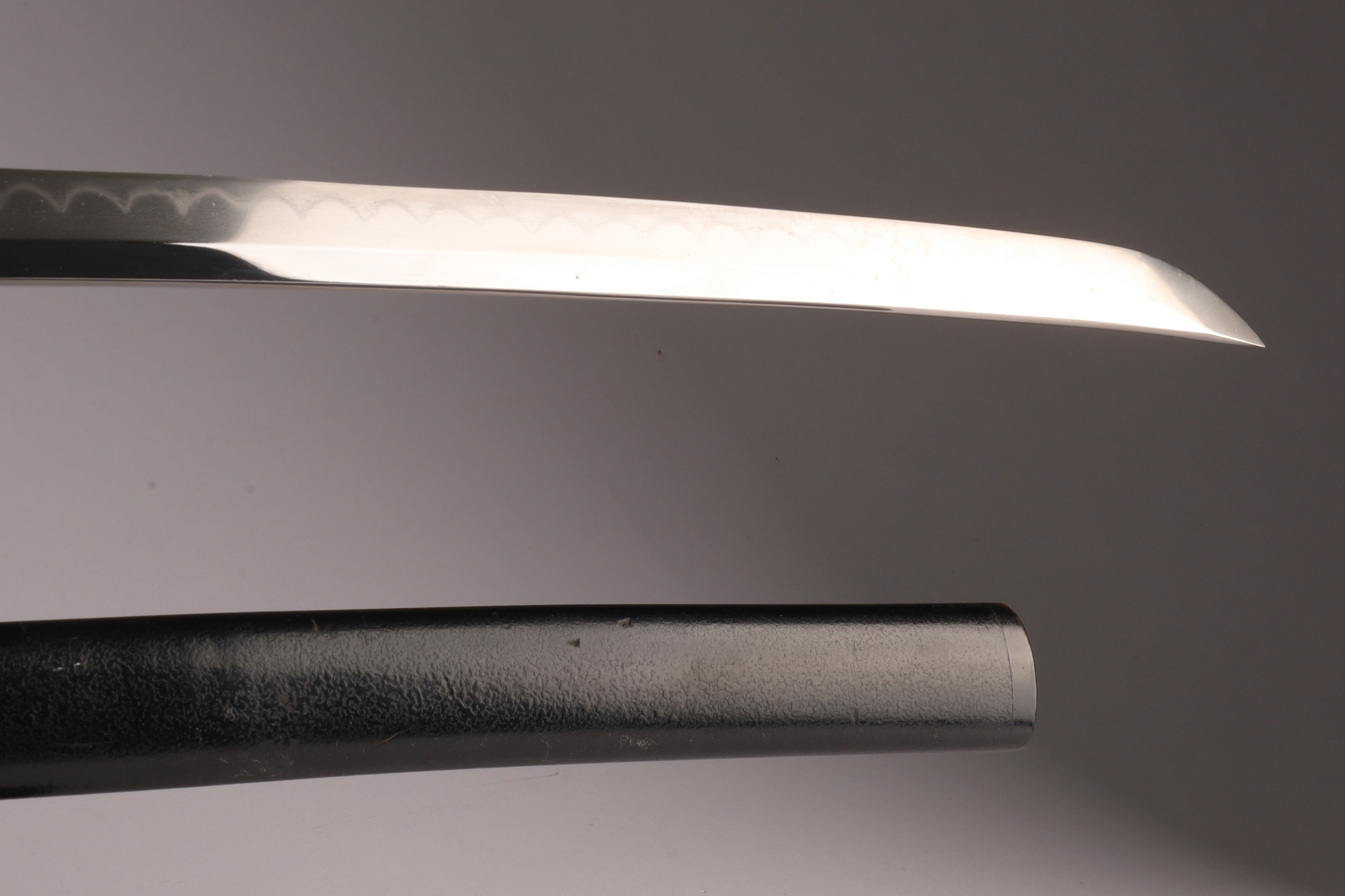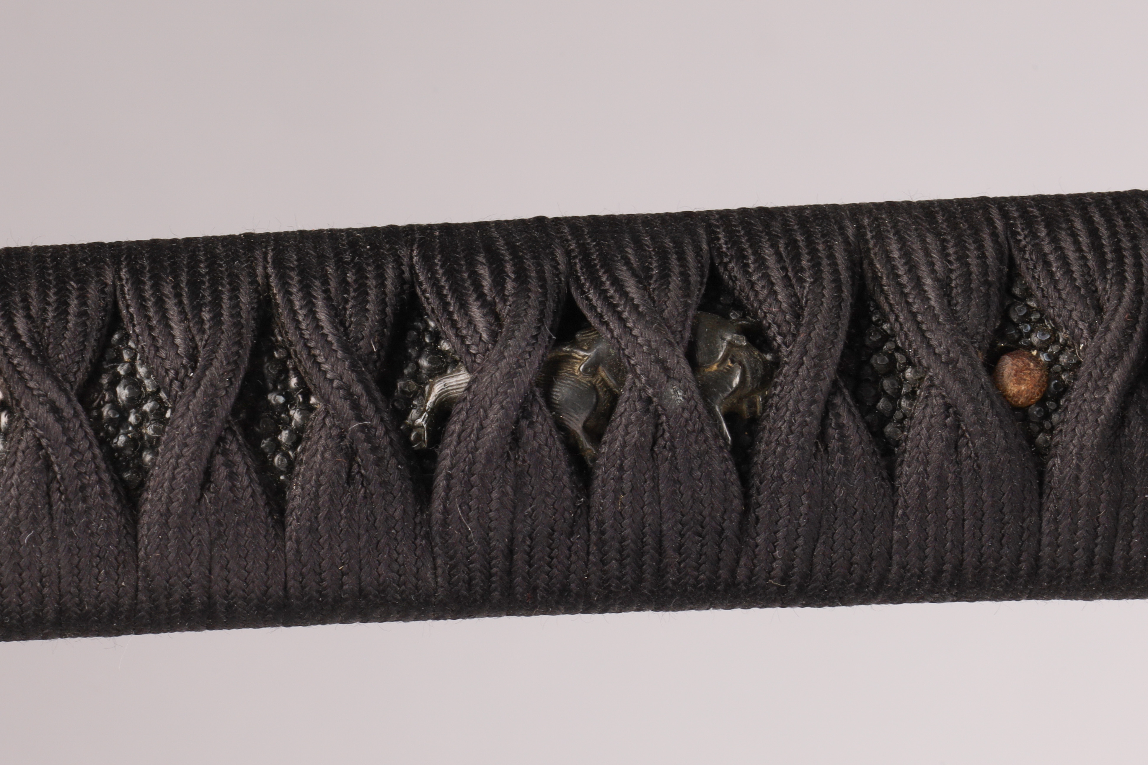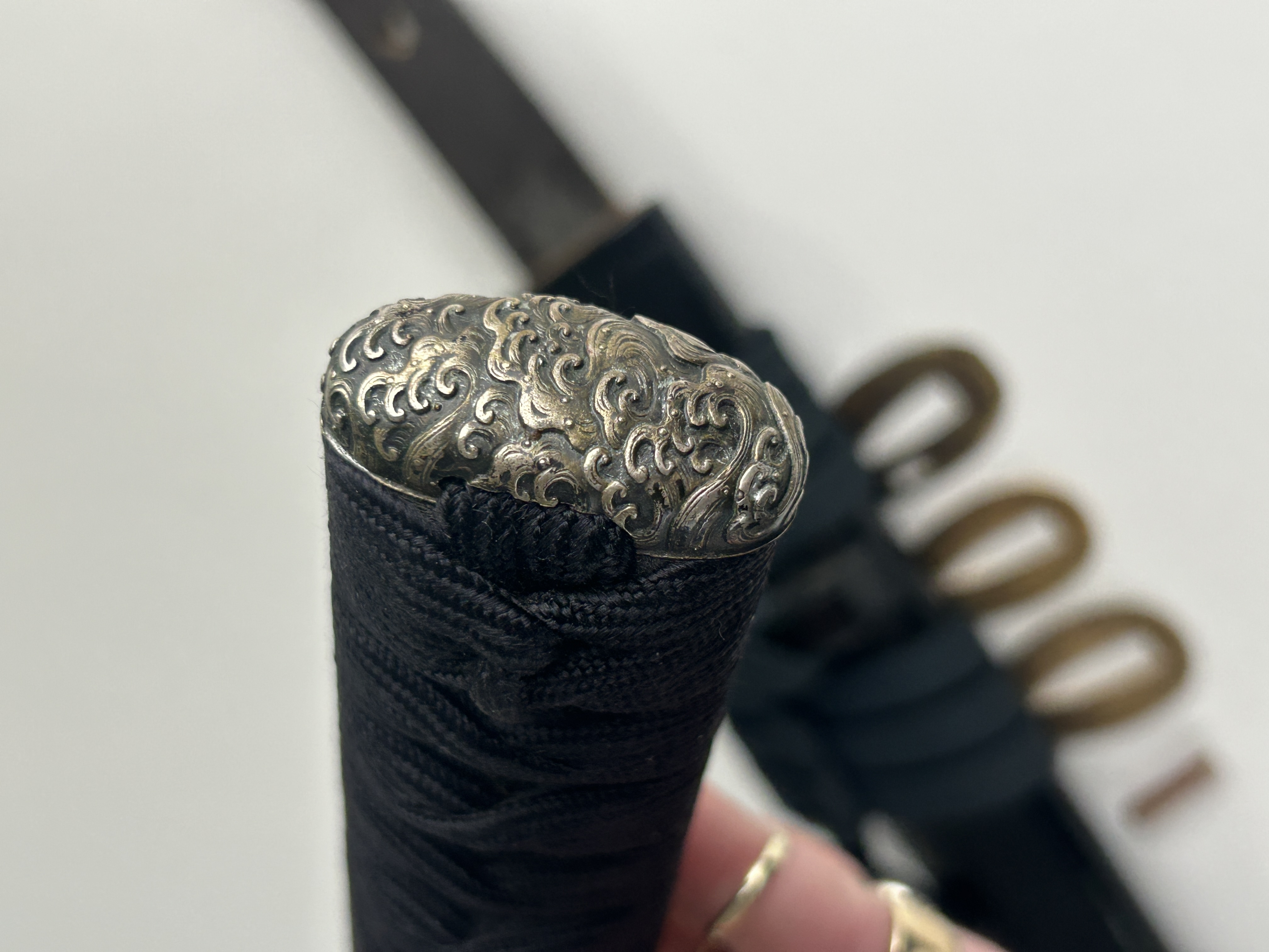 Edo period (1603-1868) Japanese samurai dark long katana . The blade is mumei, or unsigned, an. 26.1 inches , overall 40.9 inches with saya or scabbard. The blade has very stunning Hamon with a few blemishes. The dark koshirae is in perfect shape and very good-looking. The Fuchi and Kashira are made in a wave pattern called ‘Hiranami’ style, a design of broad, crashing waves. The tsuba is iron, an armorer’s tsuba, signed, and very attractive. It is wavy with faint scenes of landscape and skies. The wooden saya is in excellent shape also. Overall a very collectible and handsome Japanese samurai sword. Circa 1800-1850. Sword measures 40.5 inches, blade measures 26.5 inches L.