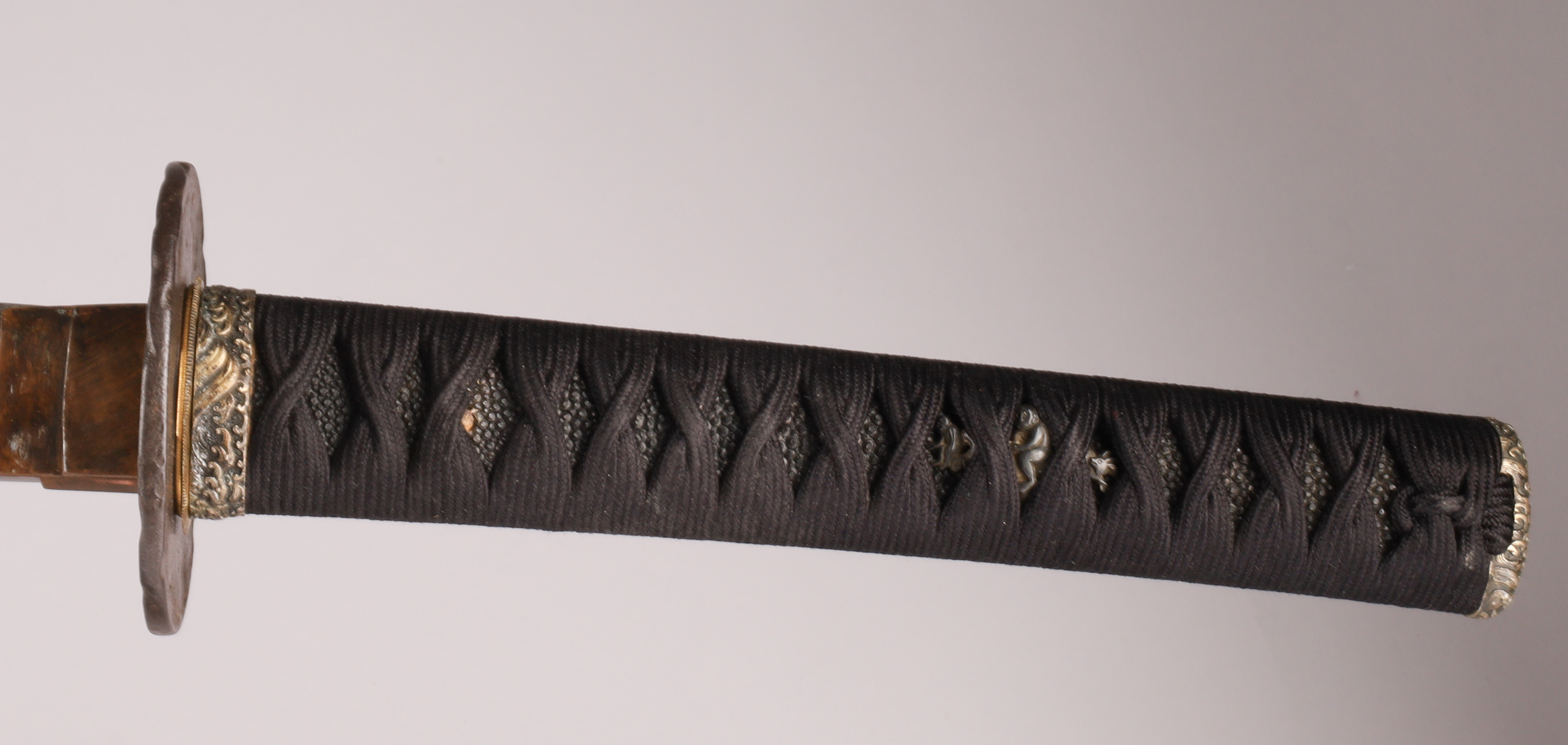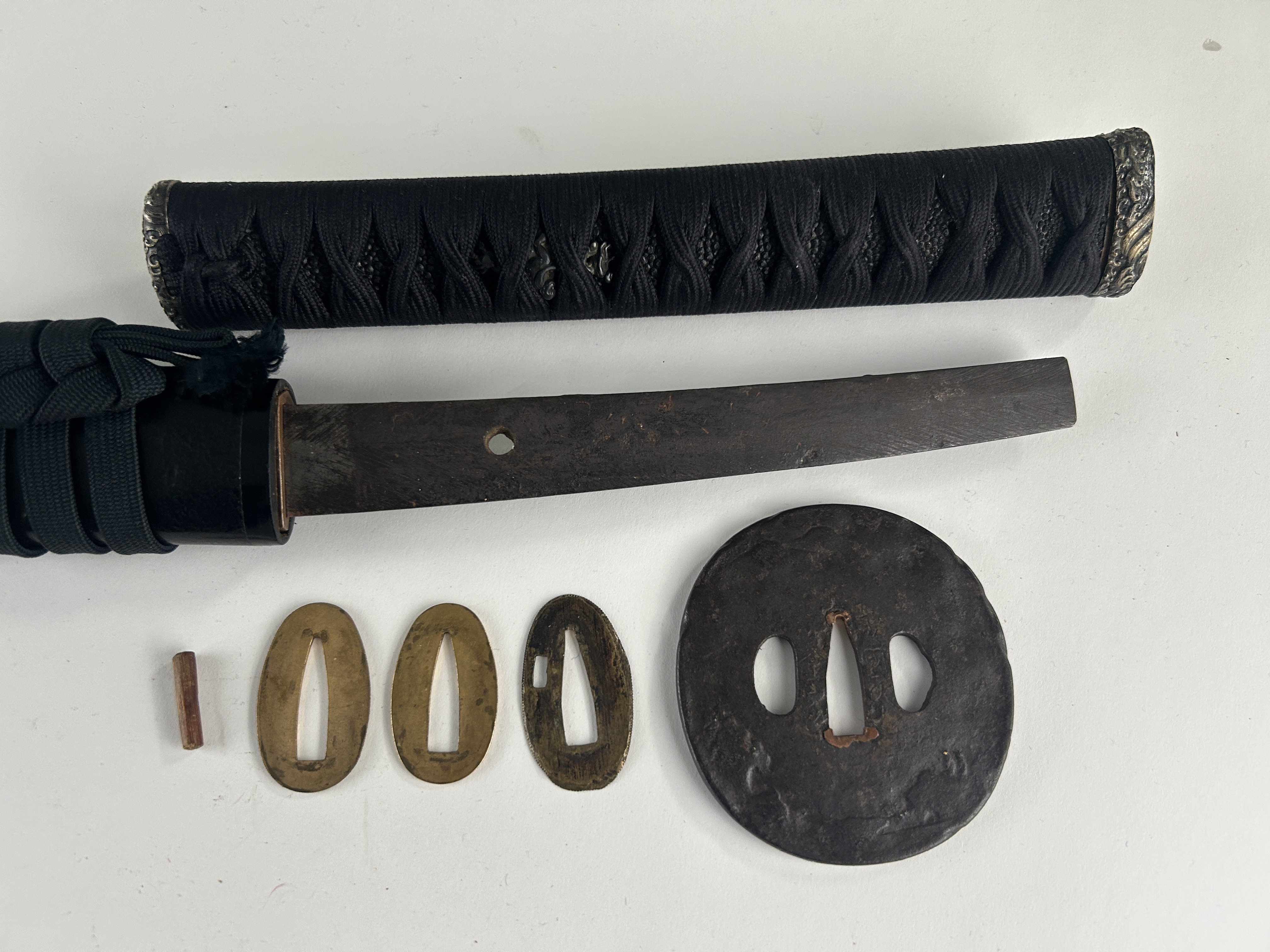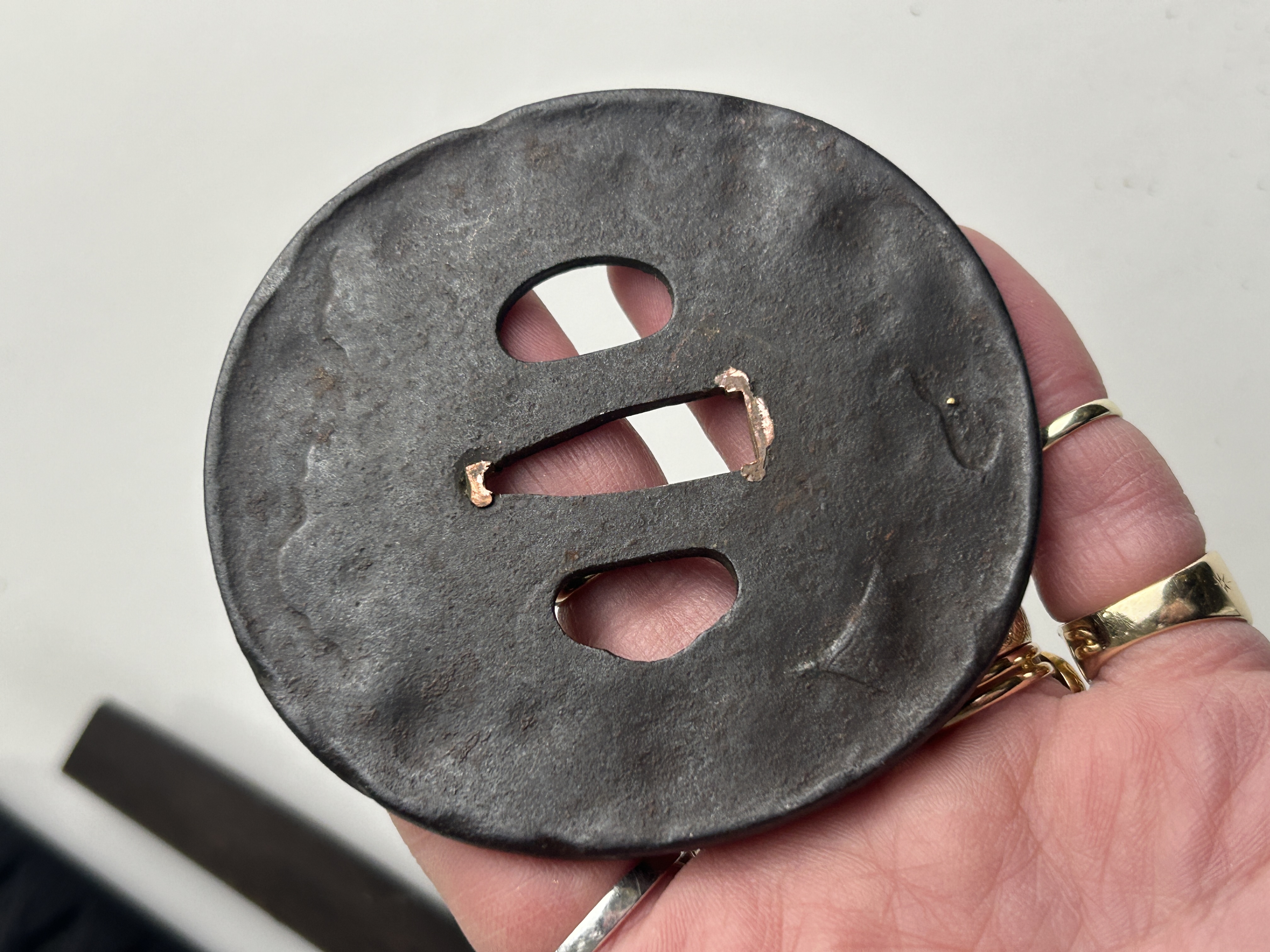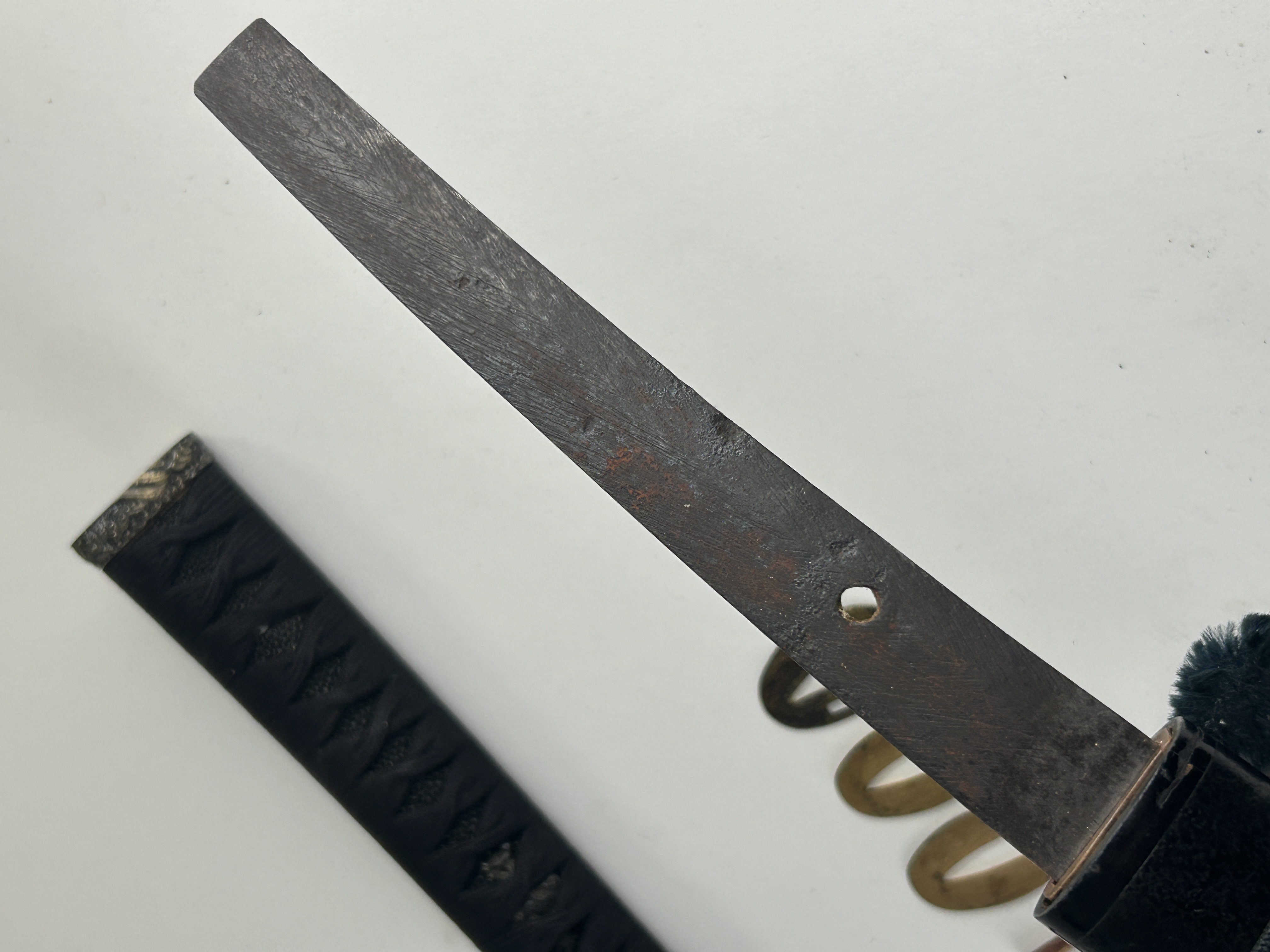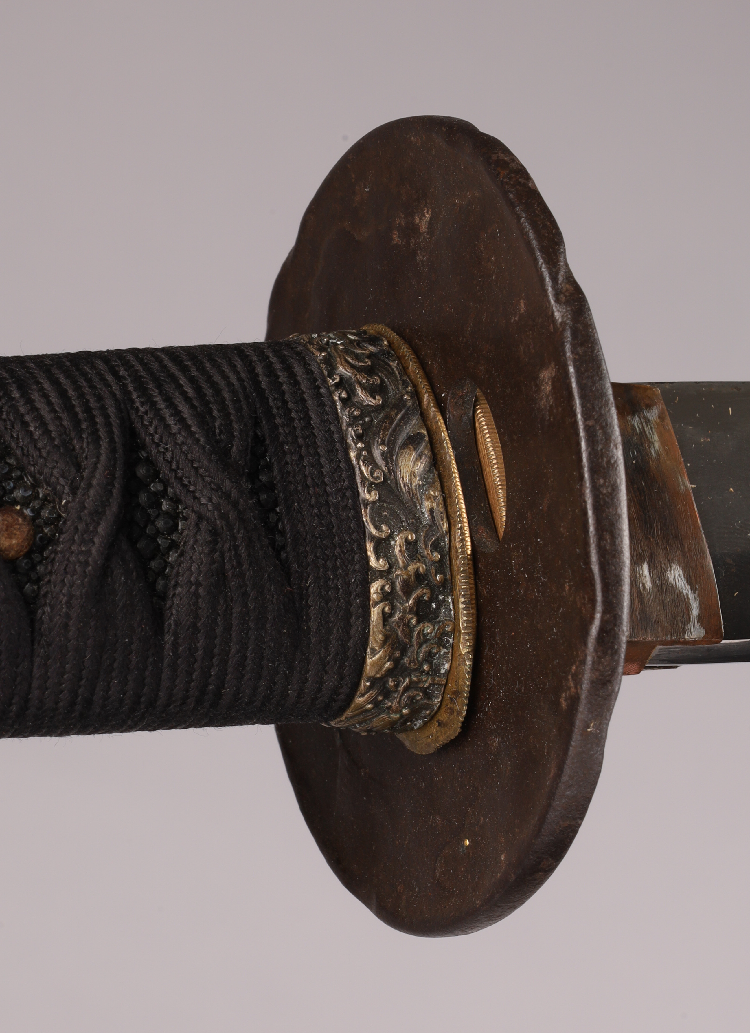 Edo period (1603-1868) Japanese samurai dark long katana . The blade is mumei, or unsigned, an. 26.1 inches , overall 40.9 inches with saya or scabbard. The blade has very stunning Hamon with a few blemishes. The dark koshirae is in perfect shape and very good-looking. The Fuchi and Kashira are made in a wave pattern called ‘Hiranami’ style, a design of broad, crashing waves. The tsuba is iron, an armorer’s tsuba, signed, and very attractive. It is wavy with faint scenes of landscape and skies. The wooden saya is in excellent shape also. Overall a very collectible and handsome Japanese samurai sword. Circa 1800-1850. Sword measures 40.5 inches, blade measures 26.5 inches L.