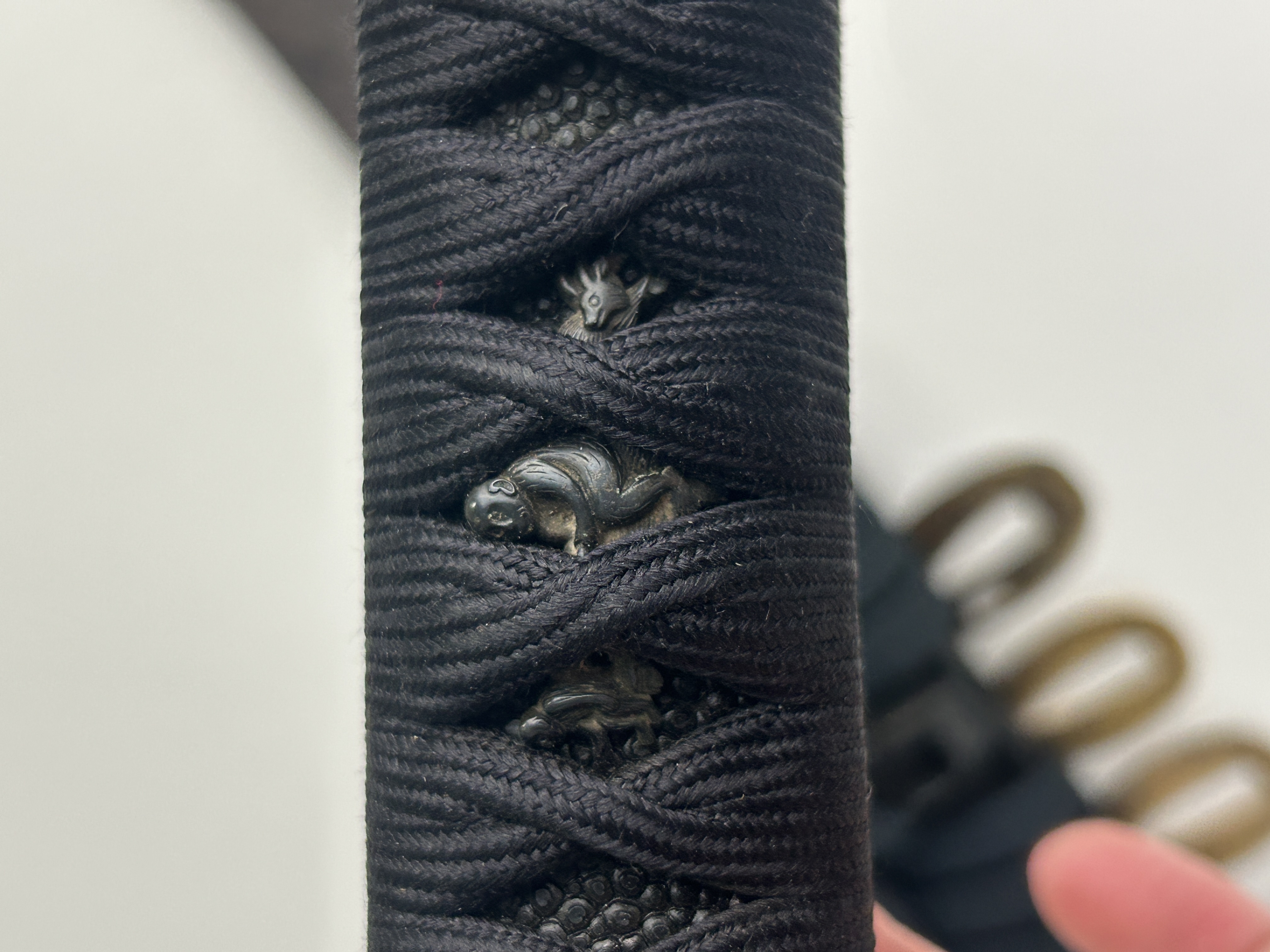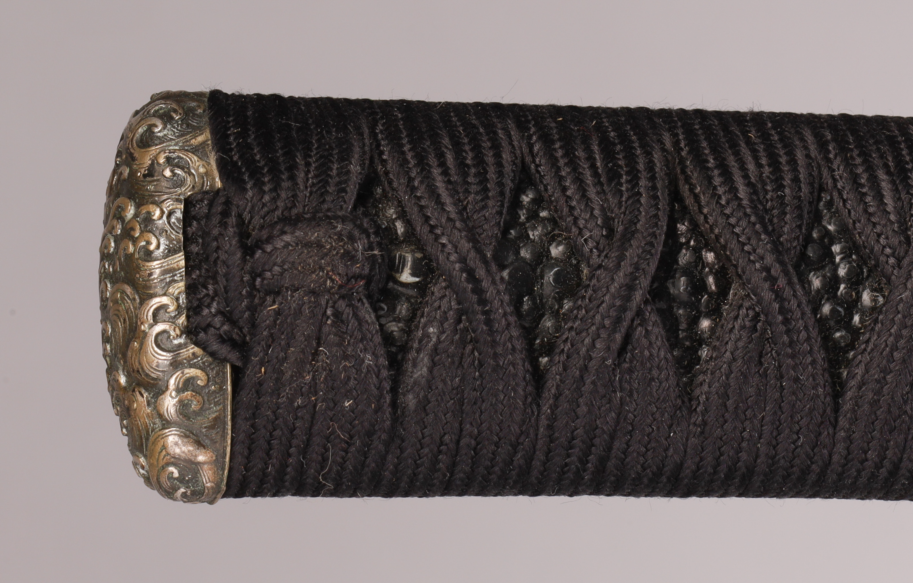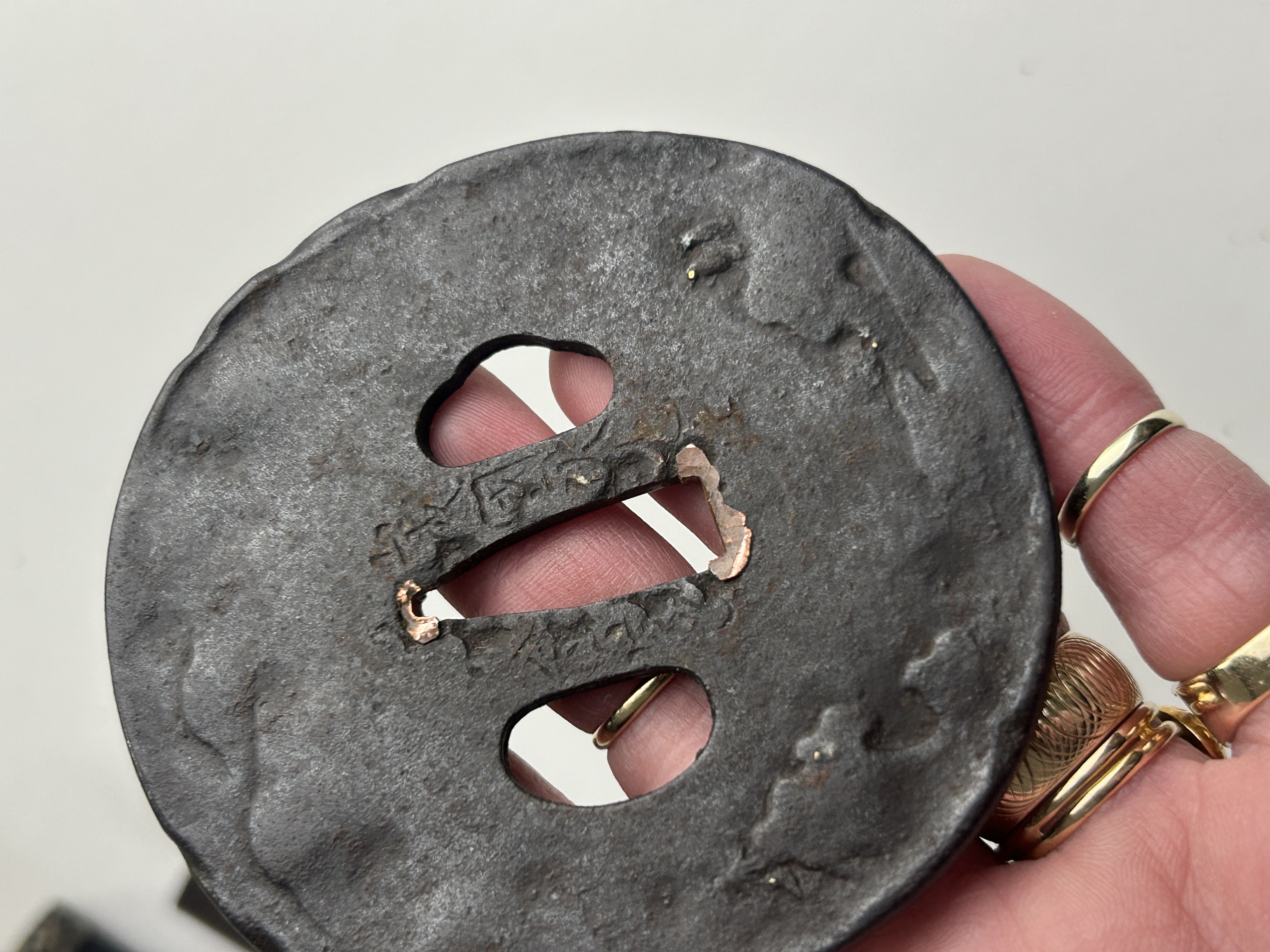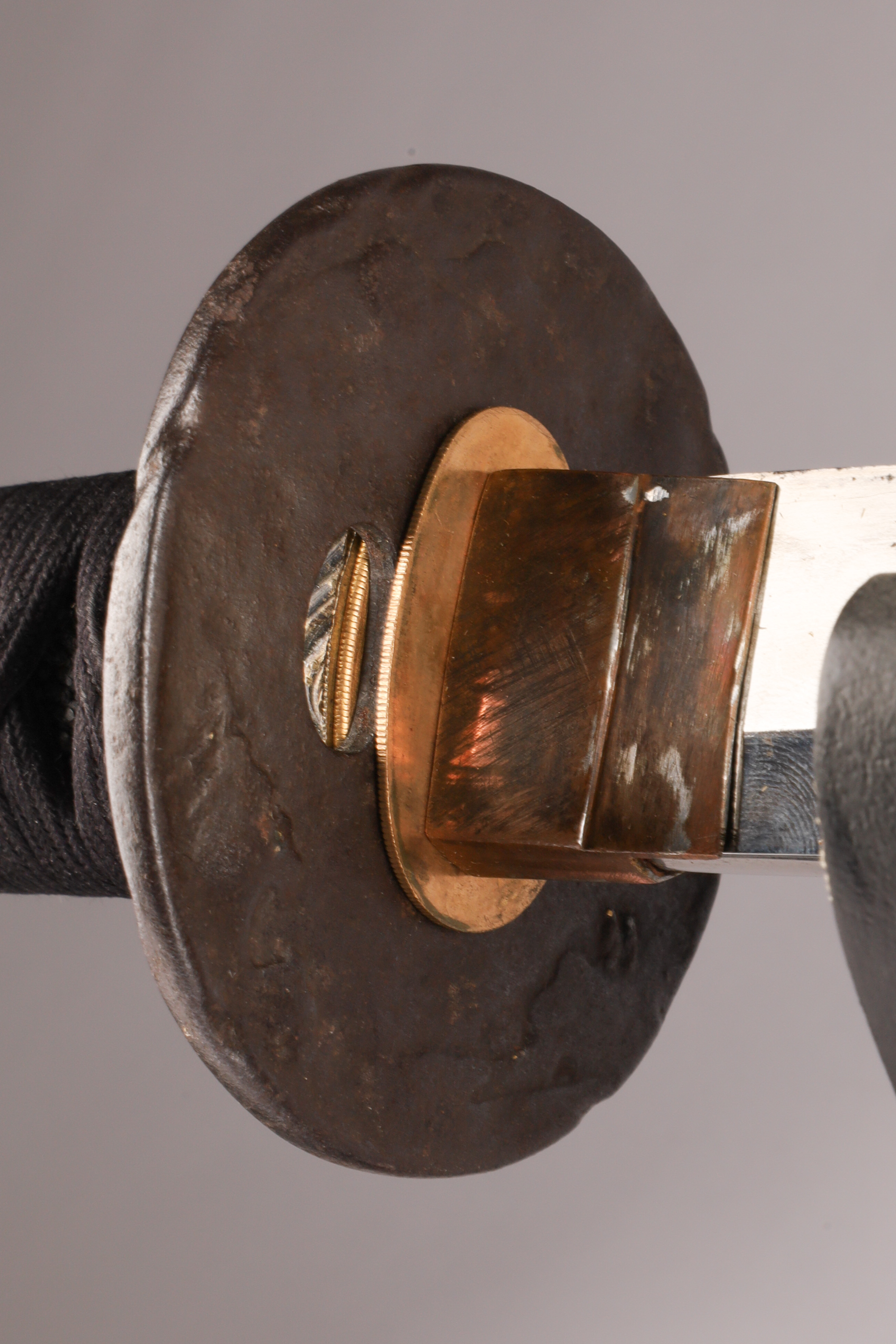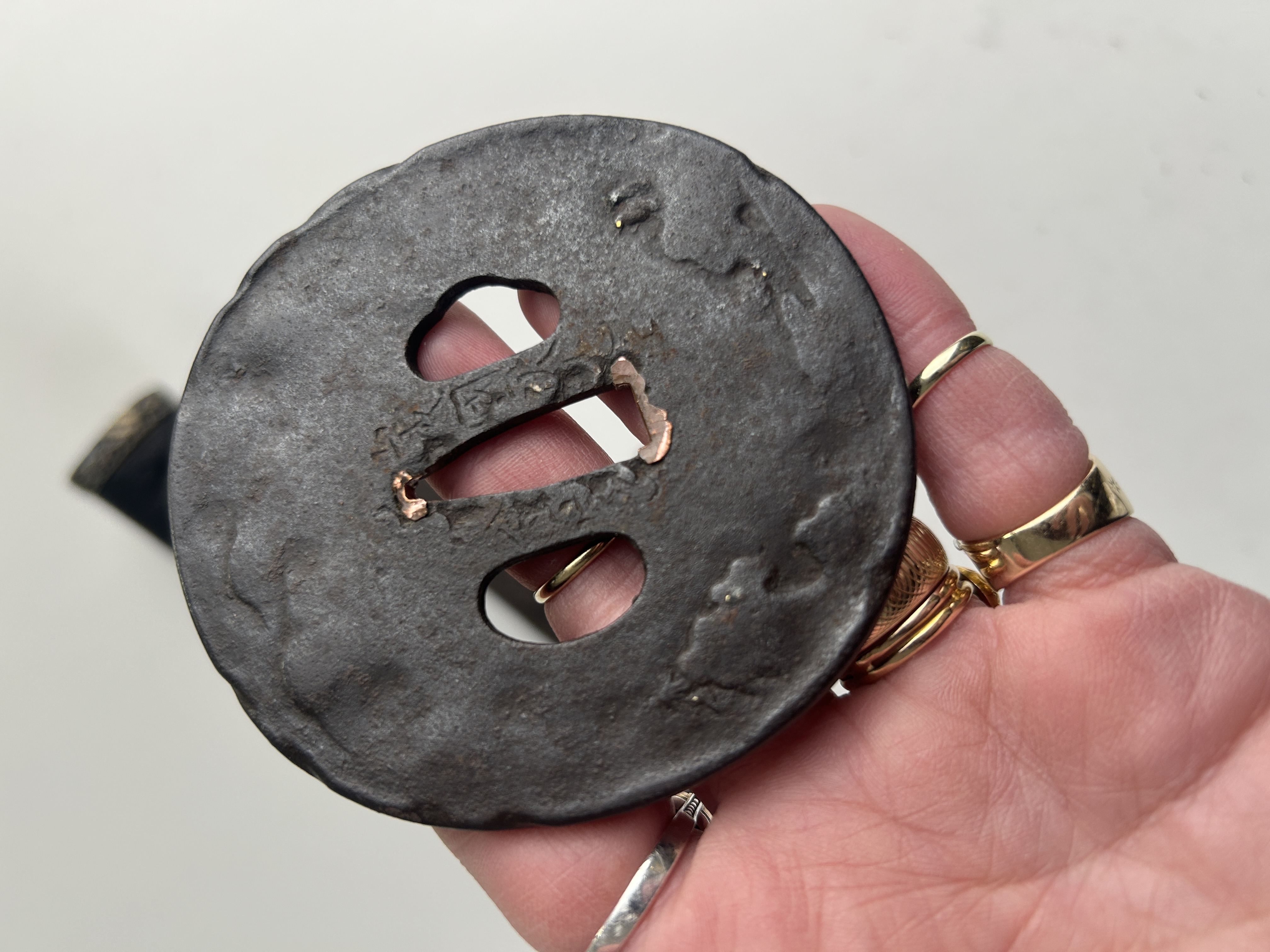 Edo period (1603-1868) Japanese samurai dark long katana . The blade is mumei, or unsigned, an. 26.1 inches , overall 40.9 inches with saya or scabbard. The blade has very stunning Hamon with a few blemishes. The dark koshirae is in perfect shape and very good-looking. The Fuchi and Kashira are made in a wave pattern called ‘Hiranami’ style, a design of broad, crashing waves. The tsuba is iron, an armorer’s tsuba, signed, and very attractive. It is wavy with faint scenes of landscape and skies. The wooden saya is in excellent shape also. Overall a very collectible and handsome Japanese samurai sword. Circa 1800-1850. Sword measures 40.5 inches, blade measures 26.5 inches L.