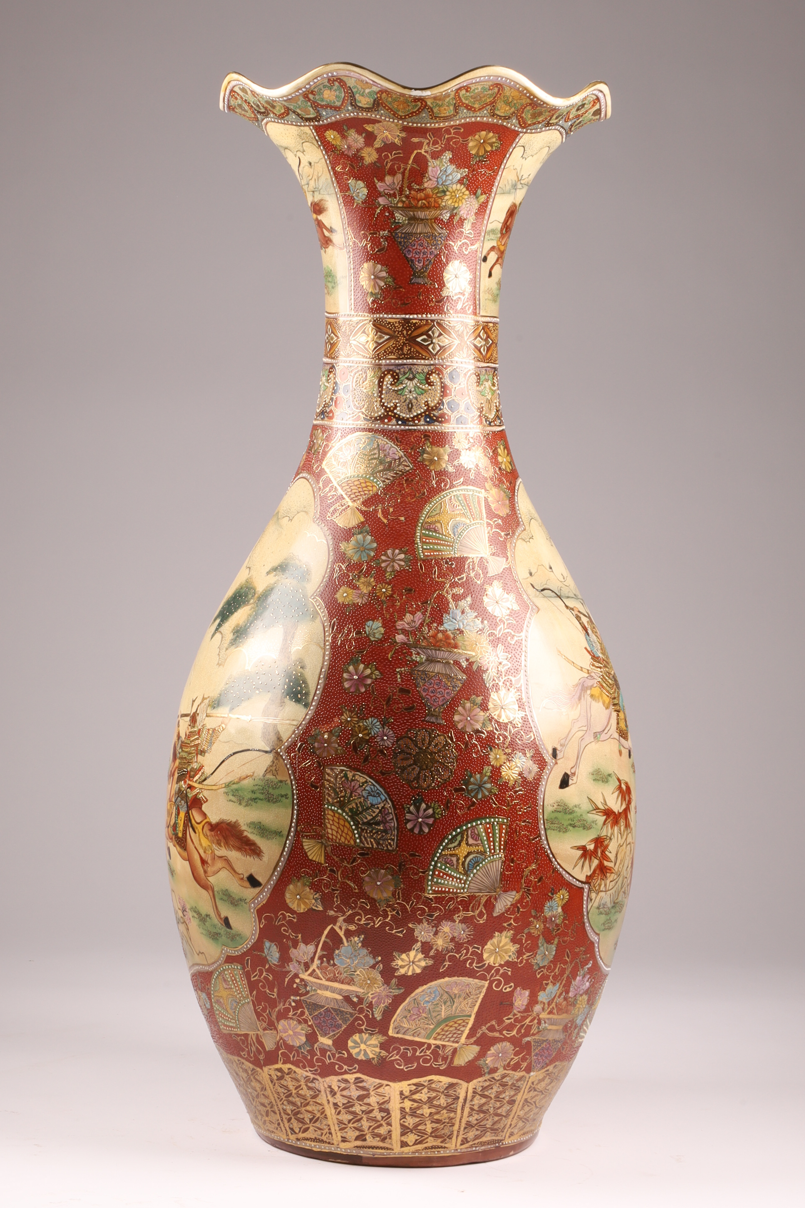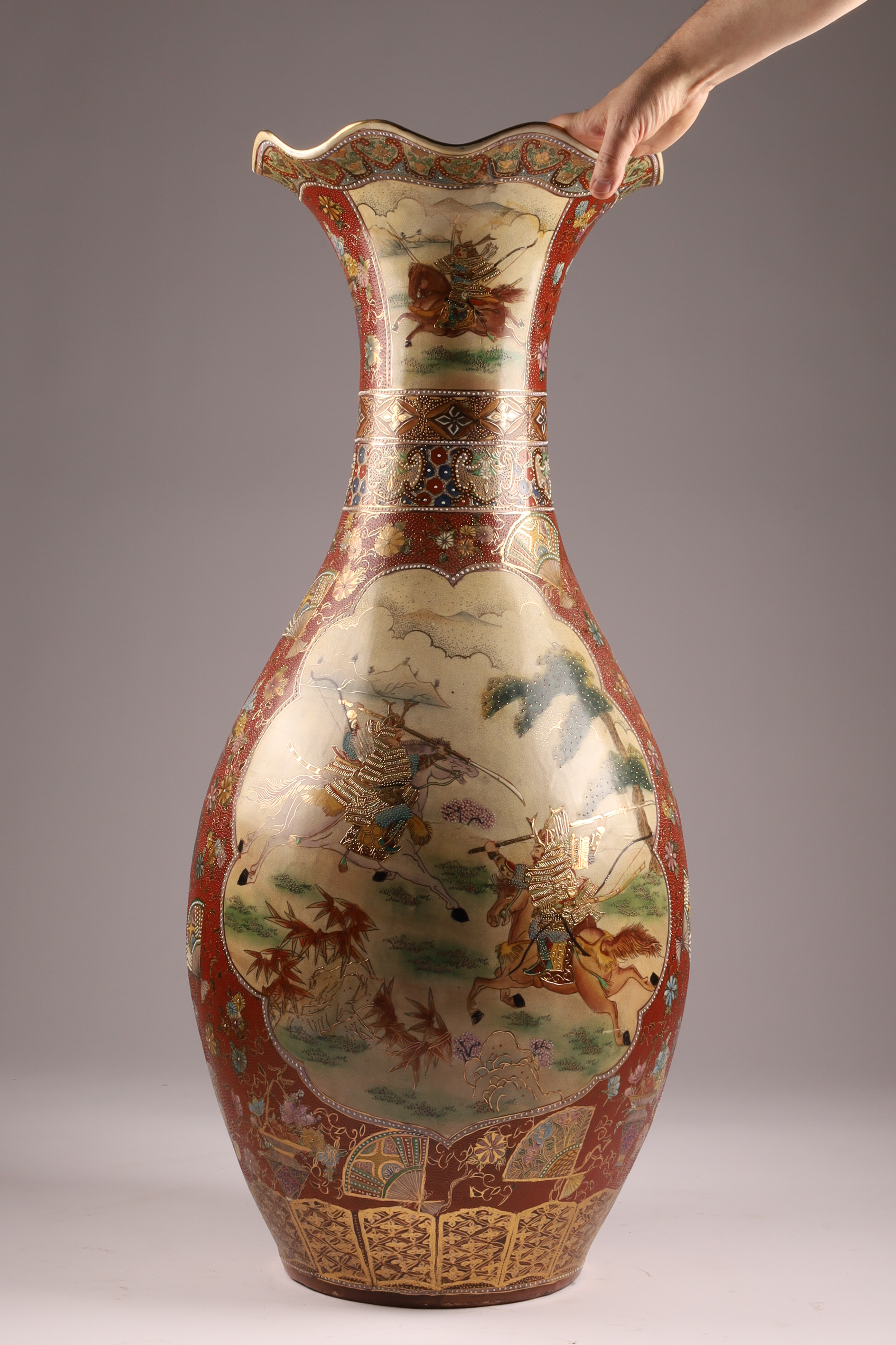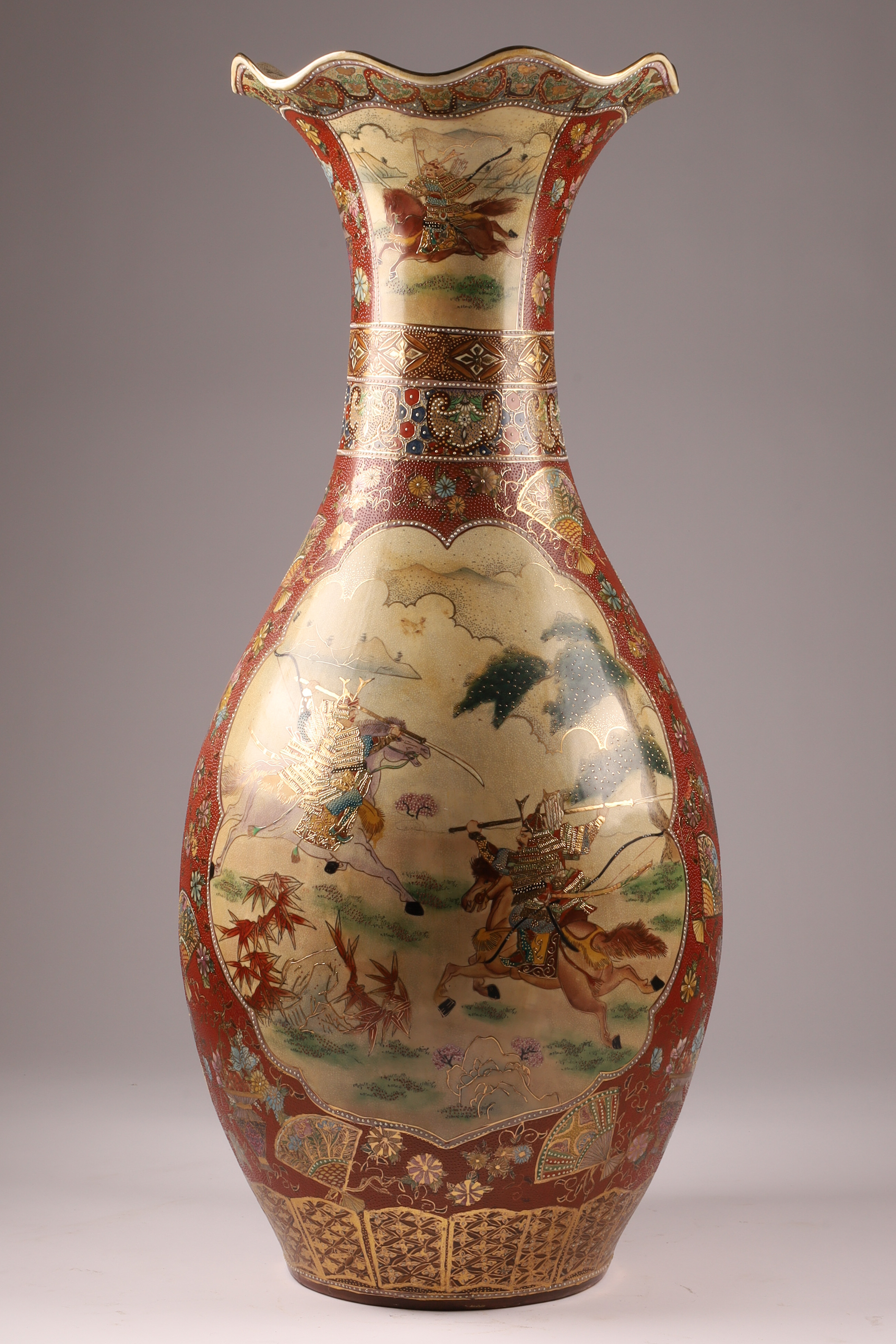 Large Japanese Satsuma Samurai Battle Floor Vase, Ruffled Top