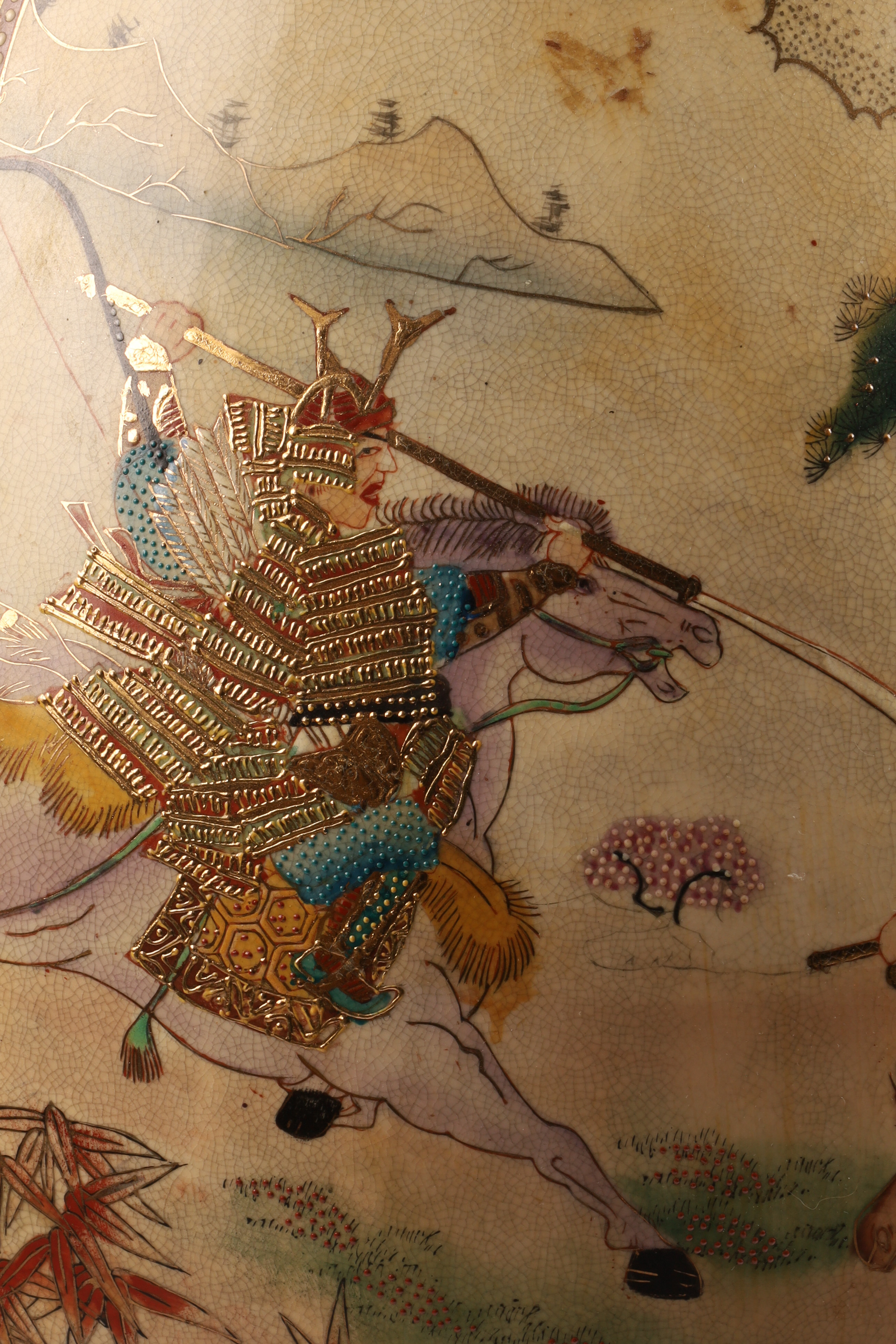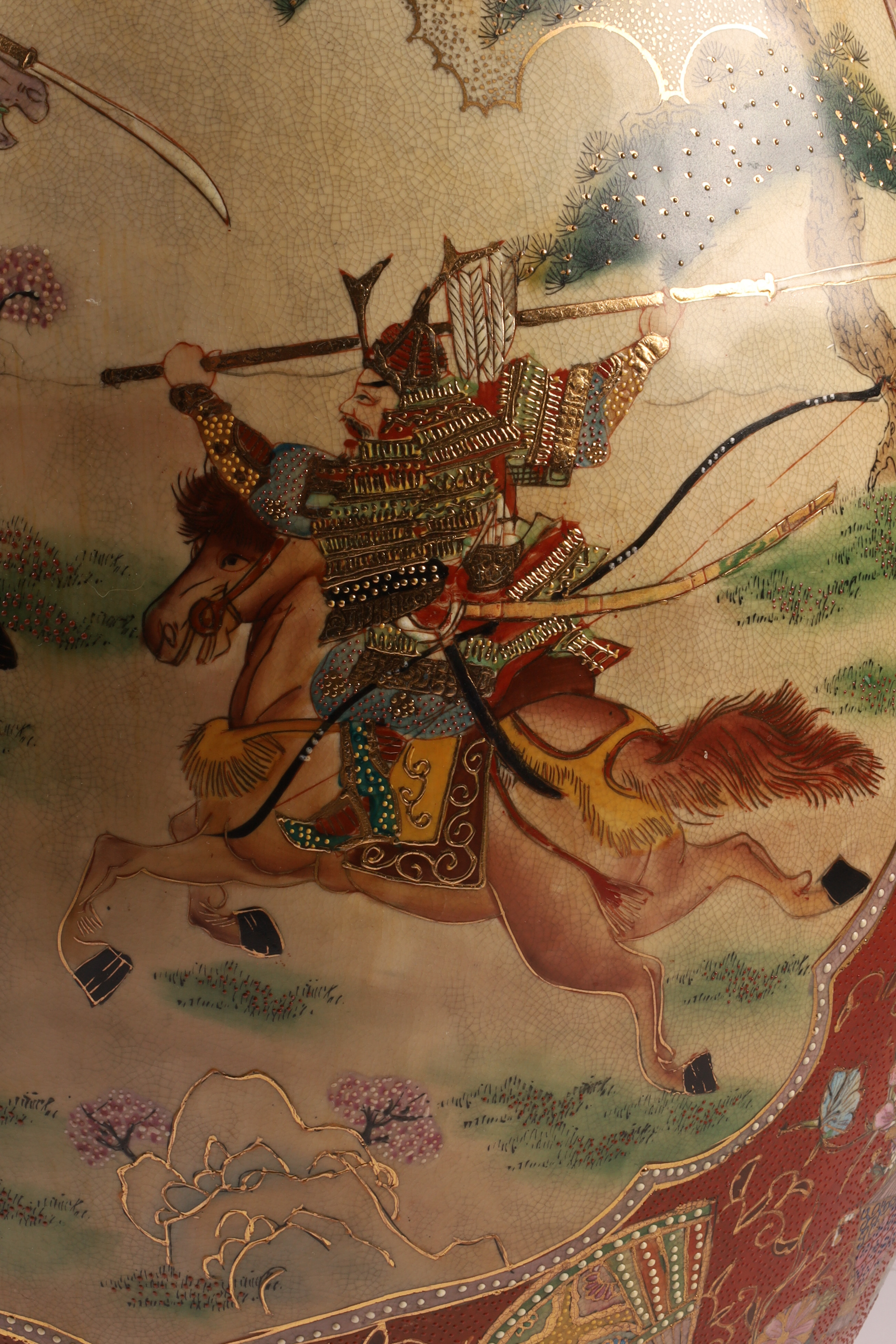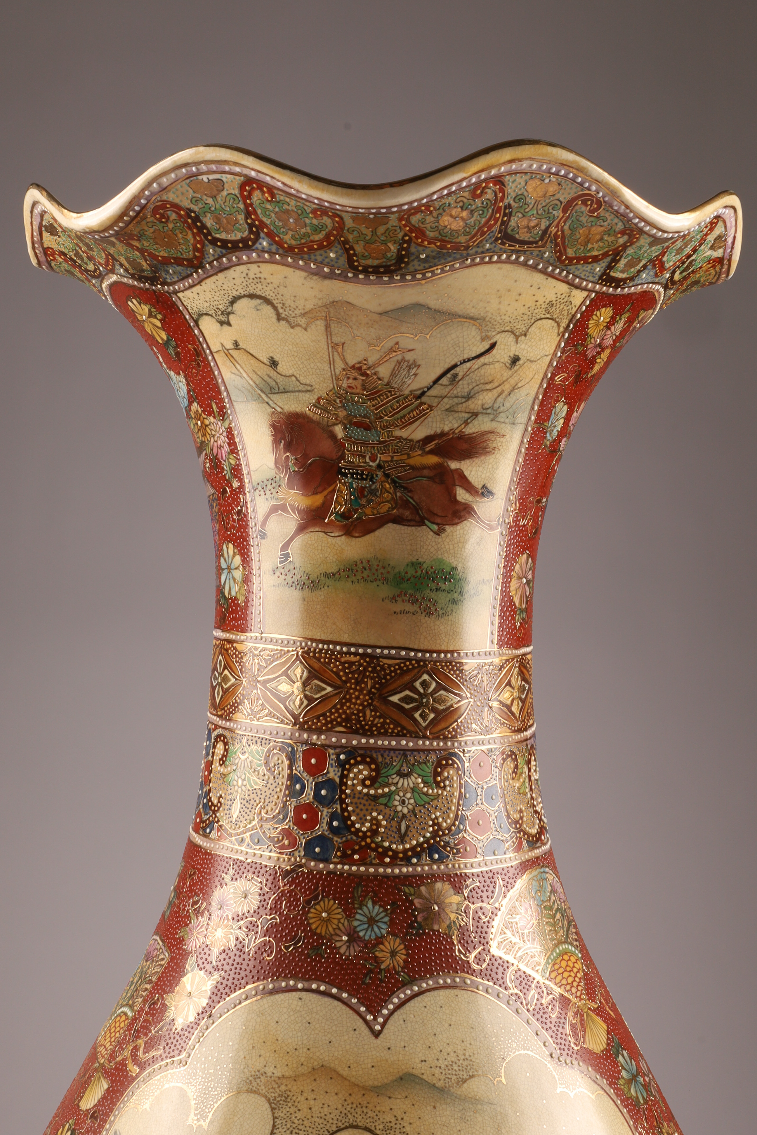 Large Japanese Satsuma Samurai Battle Floor Vase, Ruffled Top