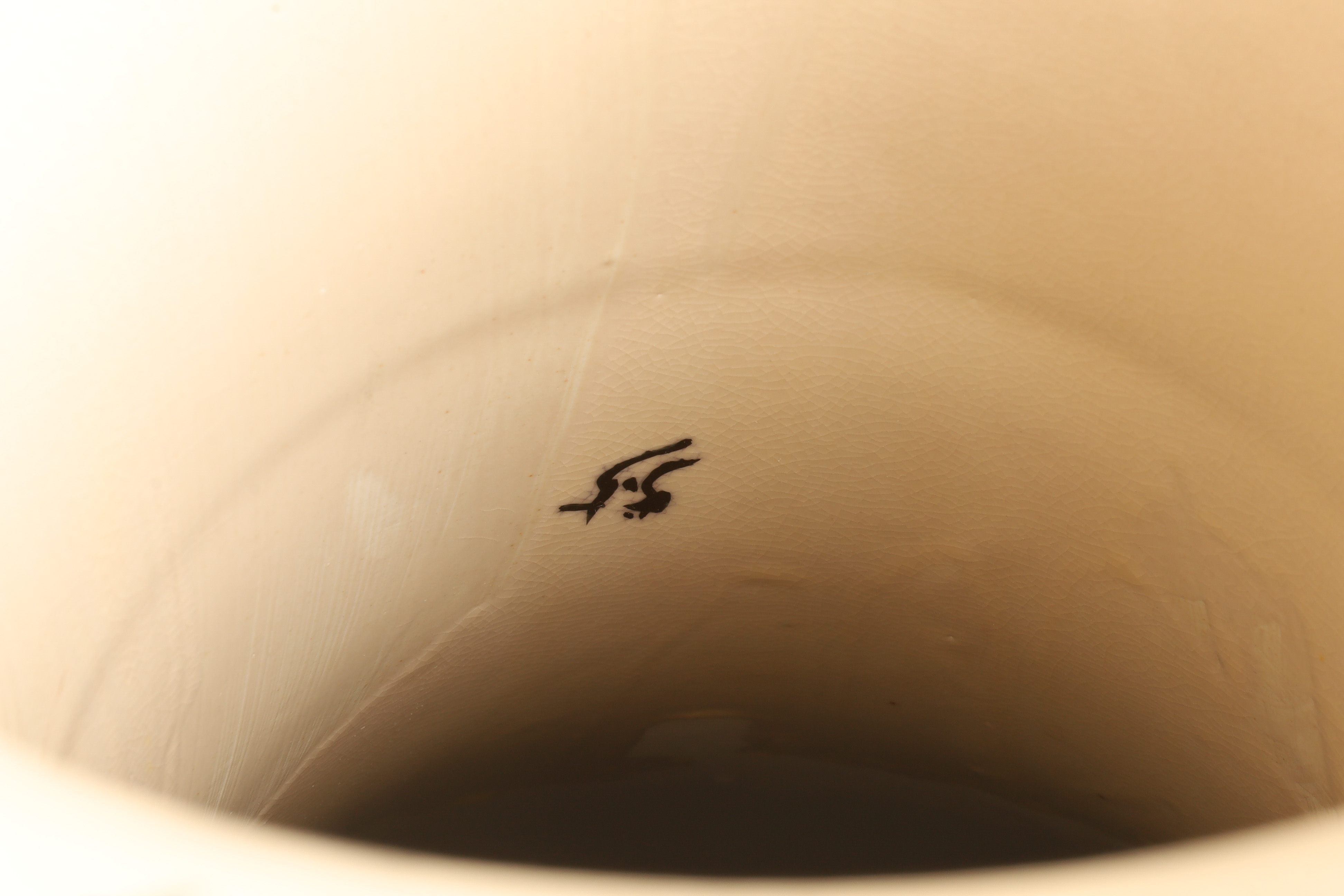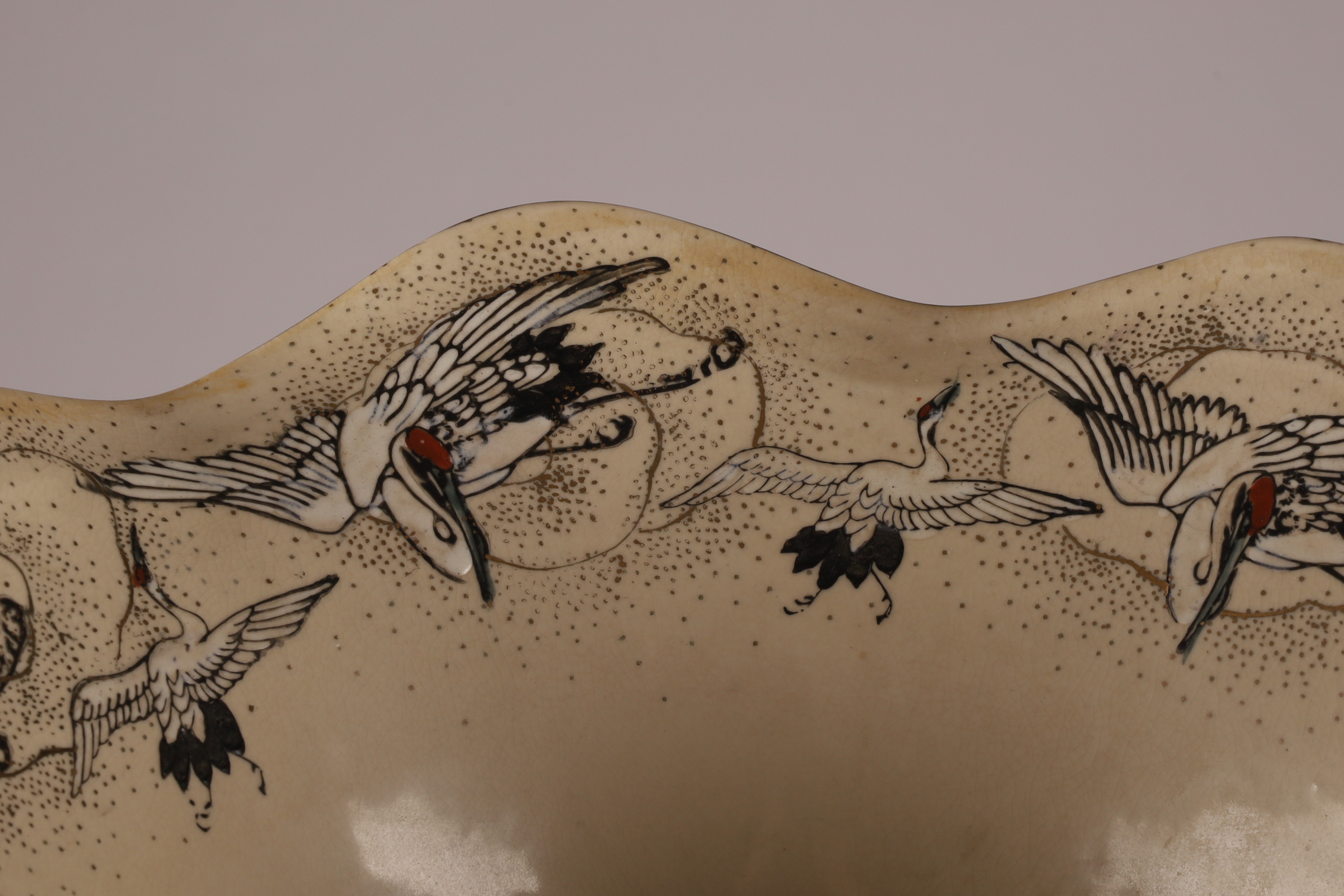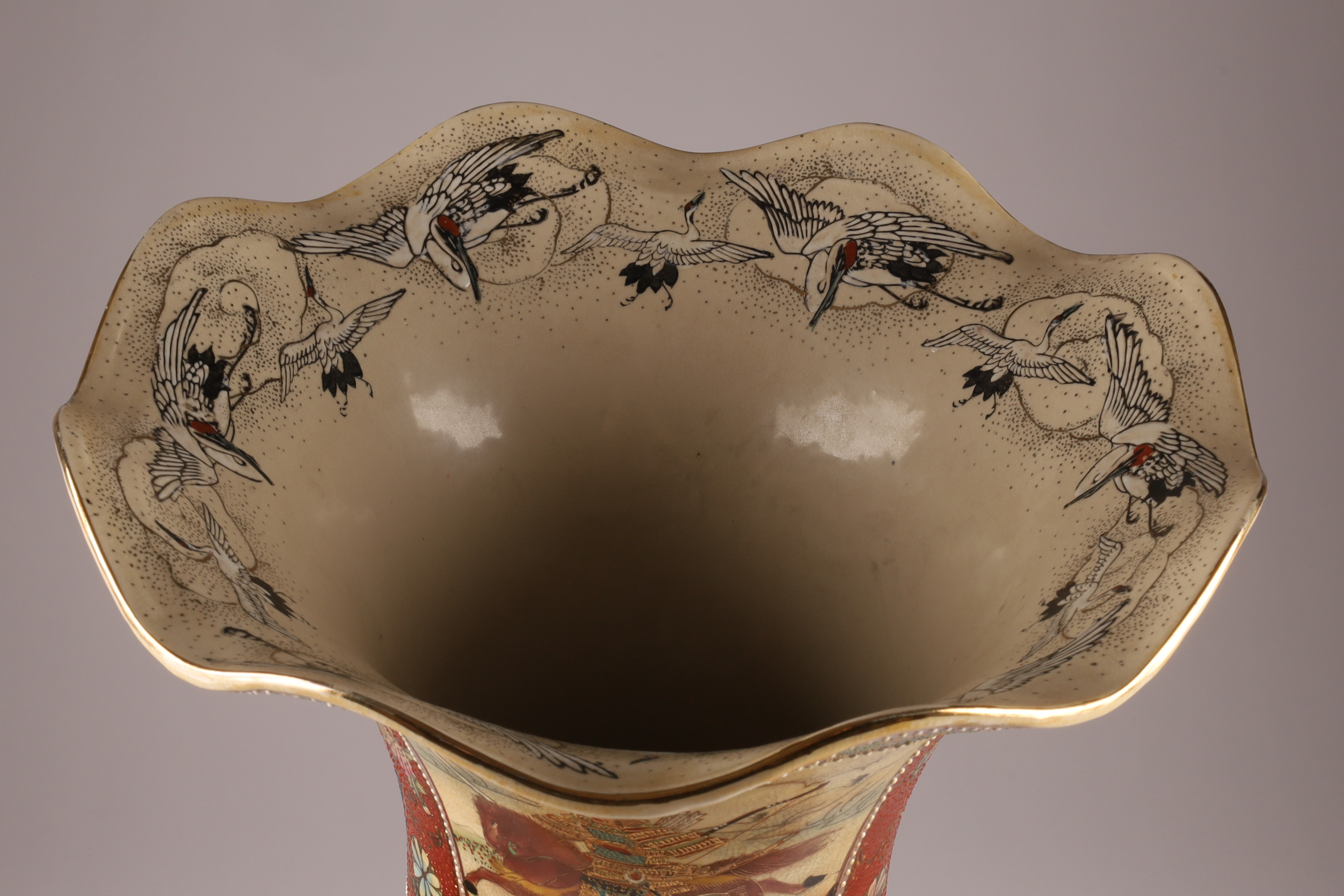 Large Japanese Satsuma Floor Vase, Ruffled Top, depicting a samurai battle on horseback decorated with herons or cranes around the rim of the vase. With raised moriage decoration of flowers and fans. 38 inches H.