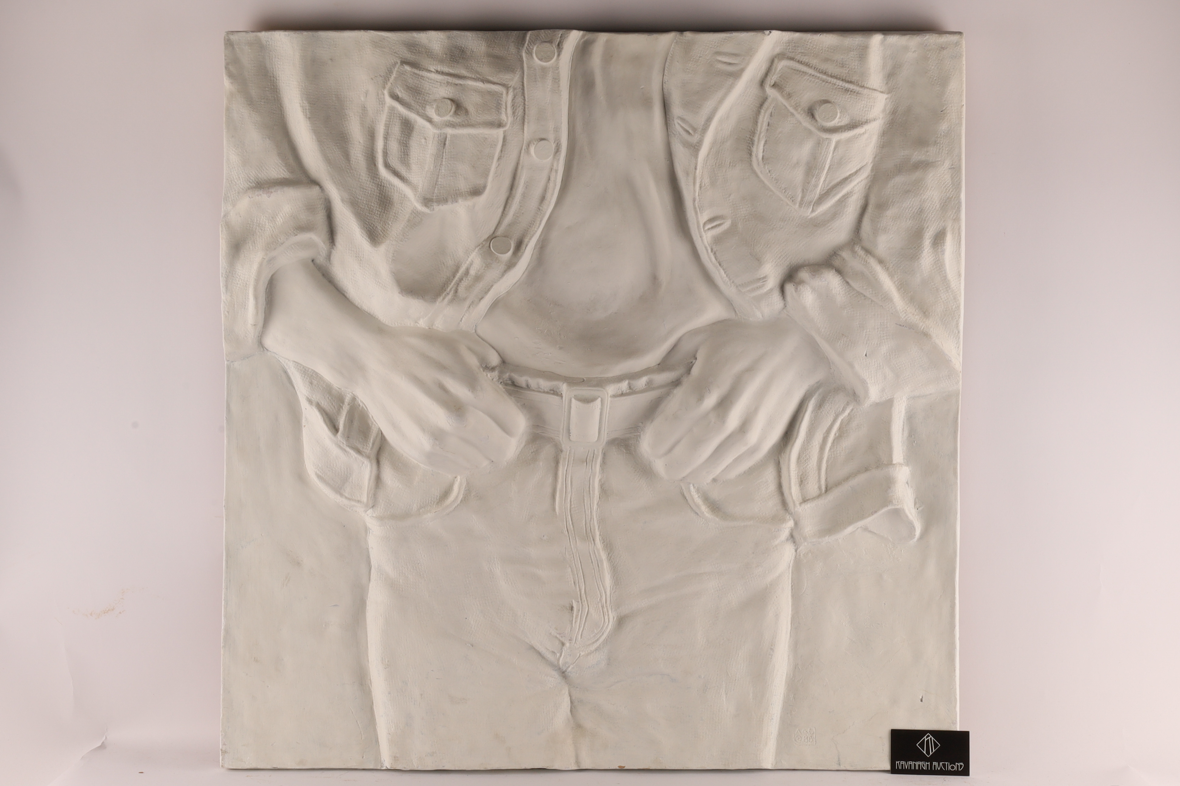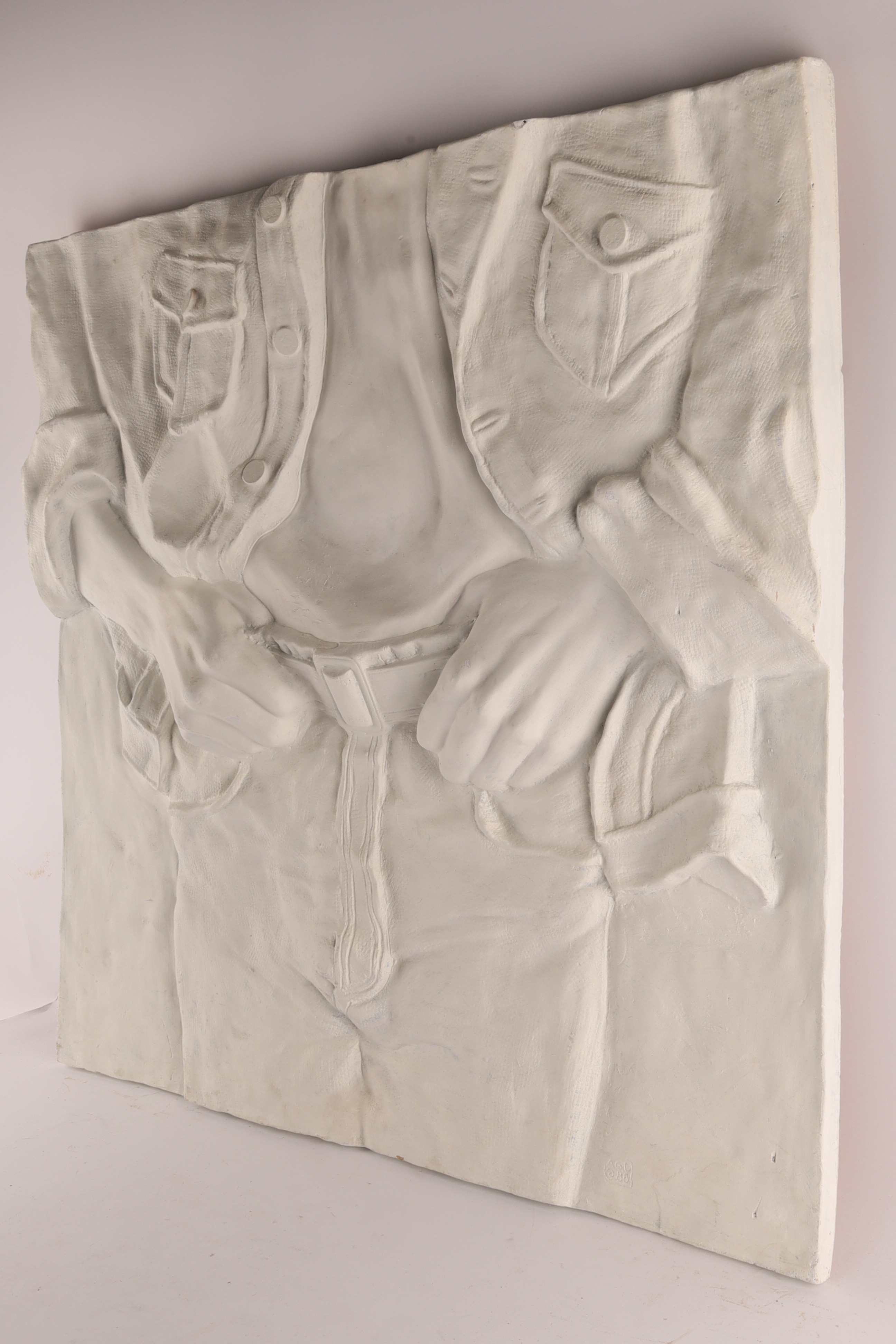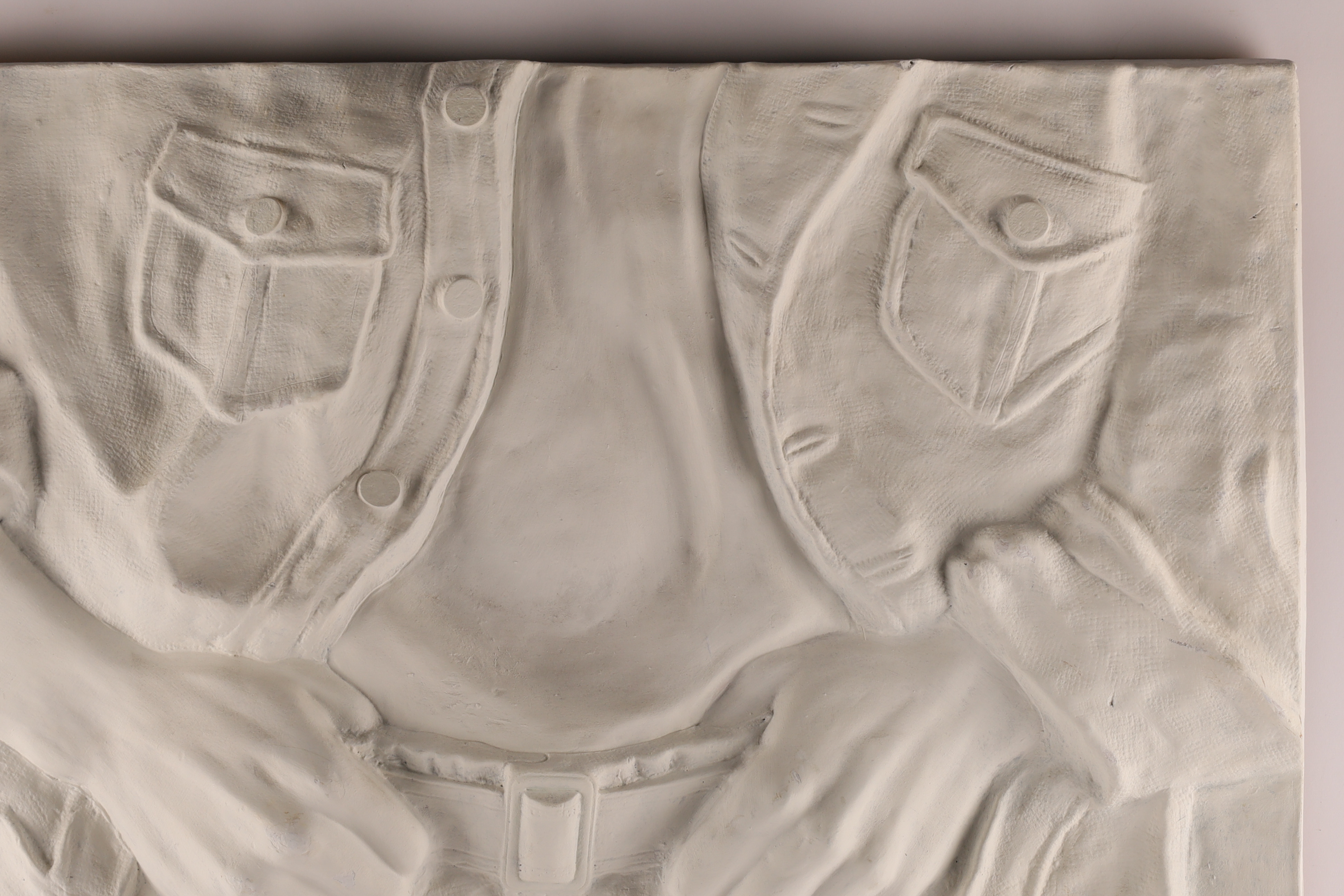 A bold 1980s pyrofoam bas-relief sculpture titled Jeans – Crotch Shot, impressed with the studio mark “AGD / 88” . Crafted from high-density pyrofoam and coated to mimic plaster, the work depicts hands gripping the waistband of denim jeans — a quintessential motif of late-1980s post-modern Pop style. These sculpted fashion vignettes were characteristic of boutique display art and the era’s playful mix of commercial imagery, attitude, and sculptural illusion.