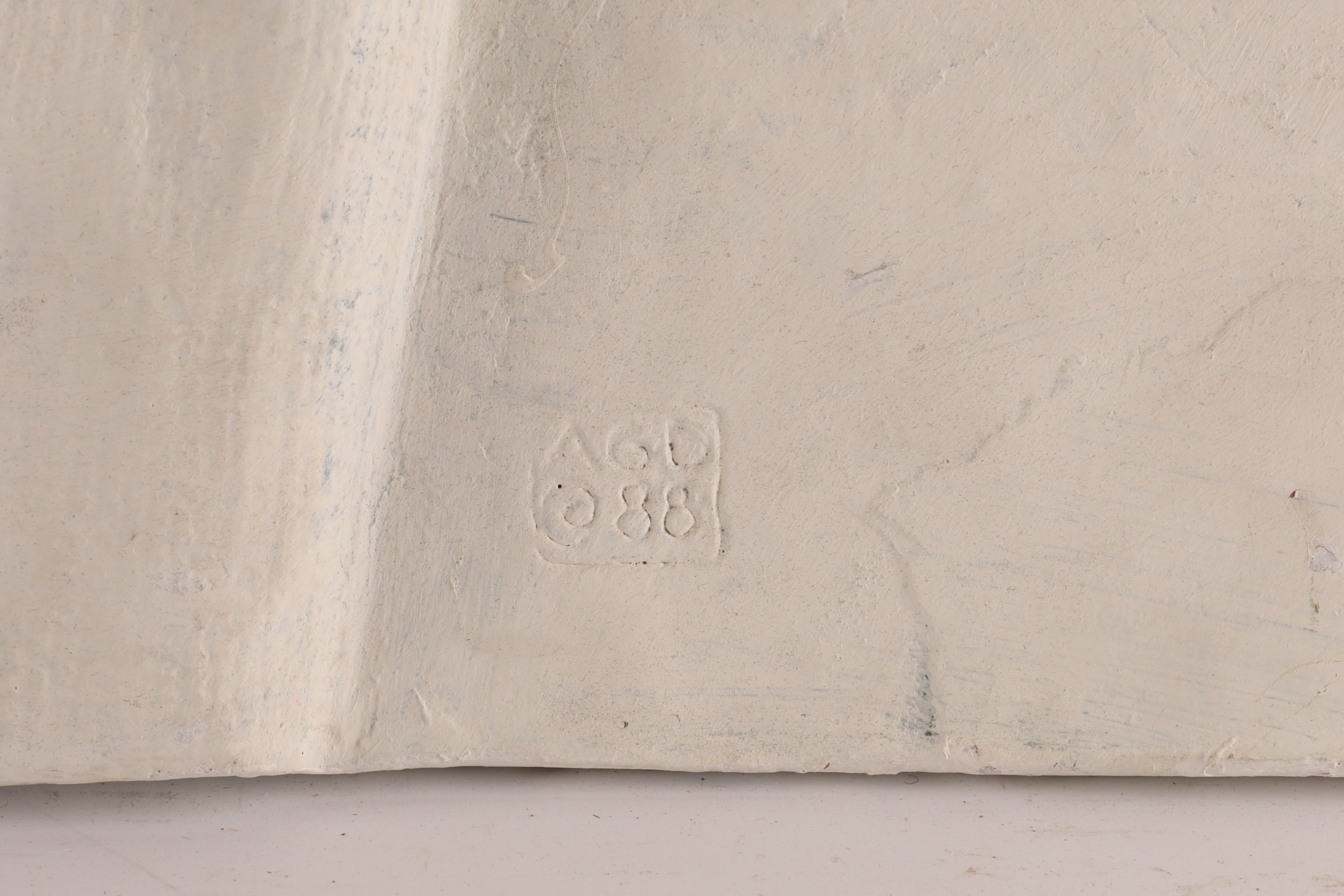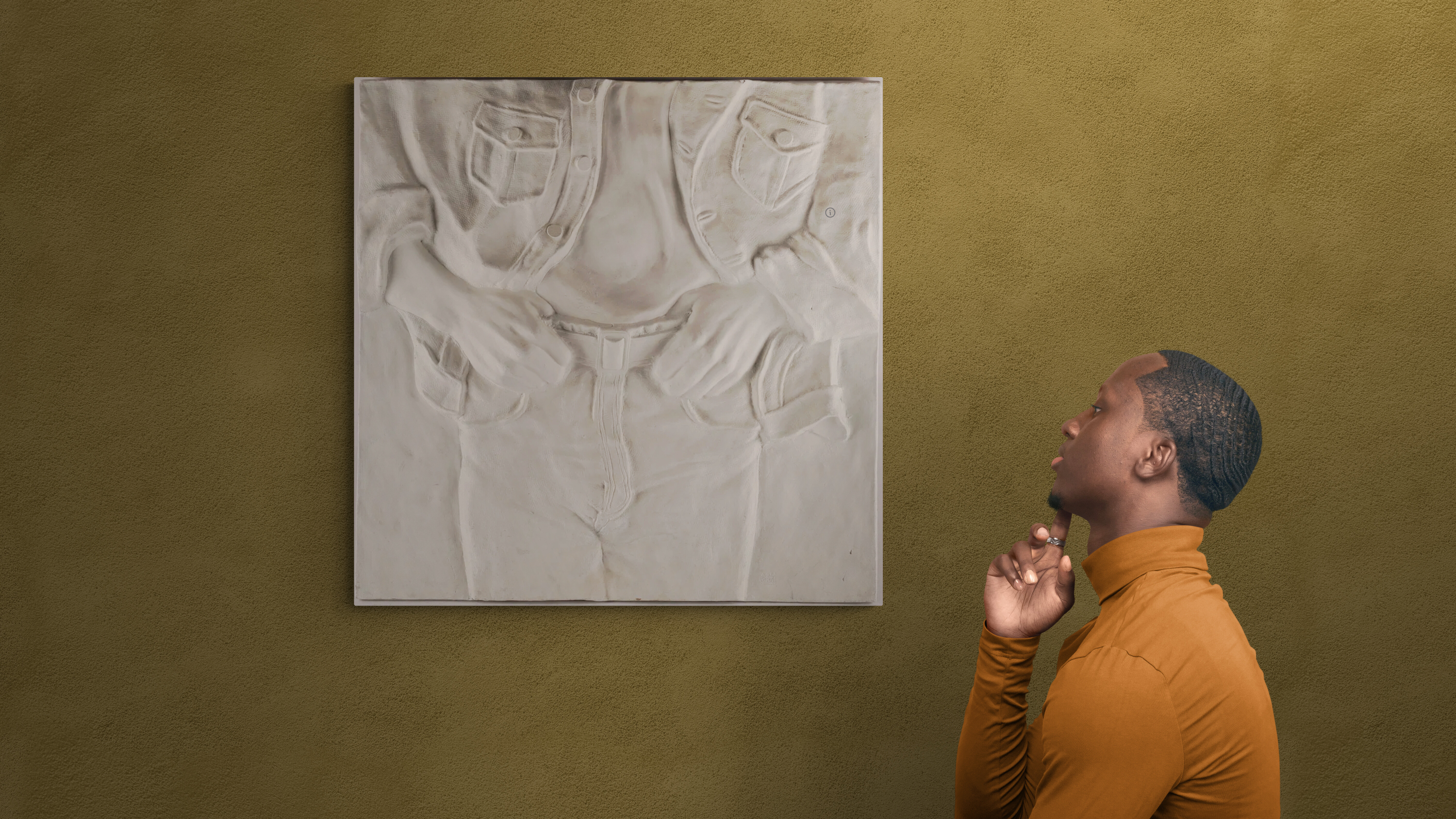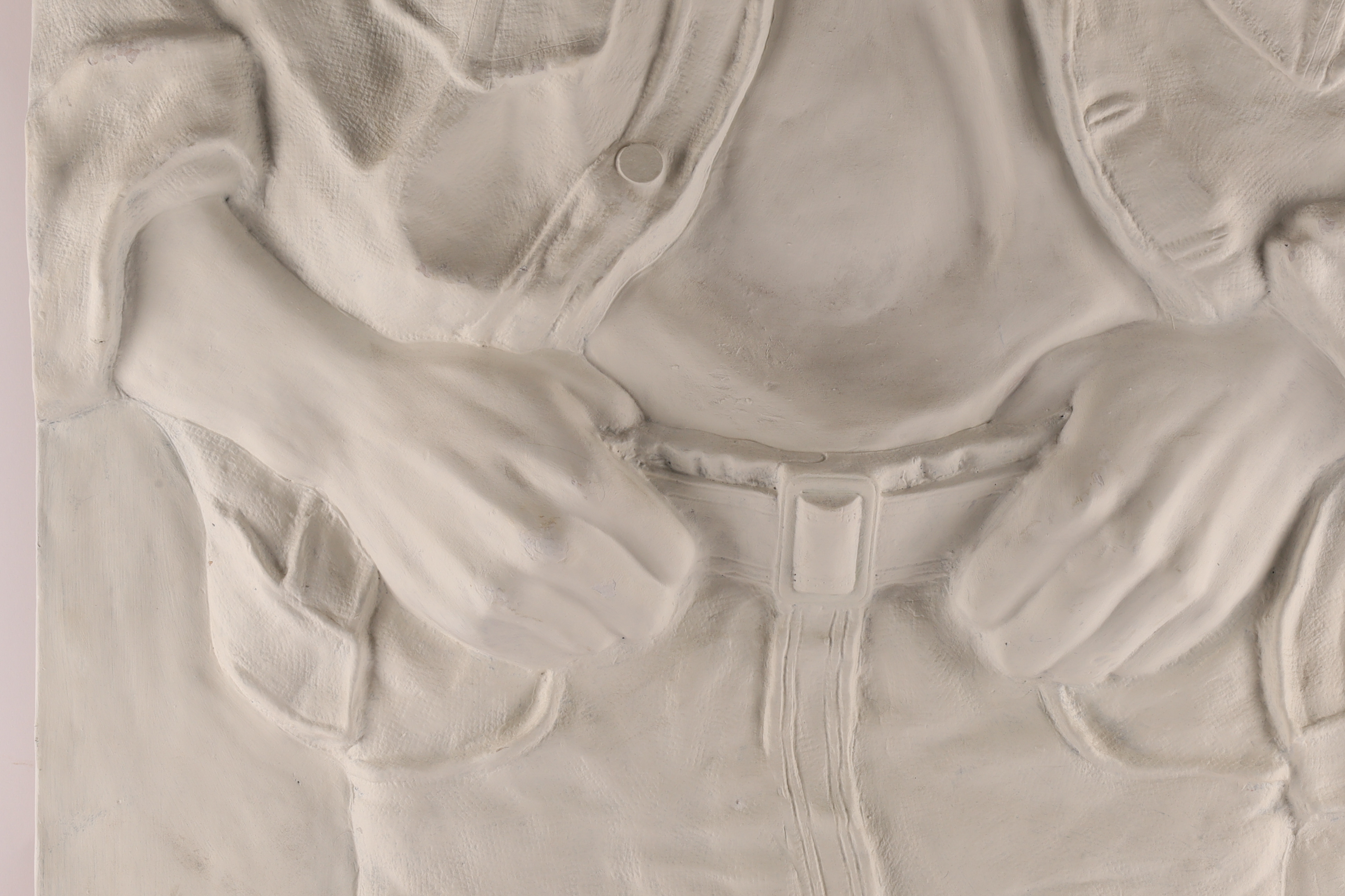 A bold 1980s pyrofoam bas-relief sculpture titled Jeans – Crotch Shot, impressed with the studio mark “AGD / 88” . Crafted from high-density pyrofoam and coated to mimic plaster, the work depicts hands gripping the waistband of denim jeans — a quintessential motif of late-1980s post-modern Pop style. These sculpted fashion vignettes were characteristic of boutique display art and the era’s playful mix of commercial imagery, attitude, and sculptural illusion.