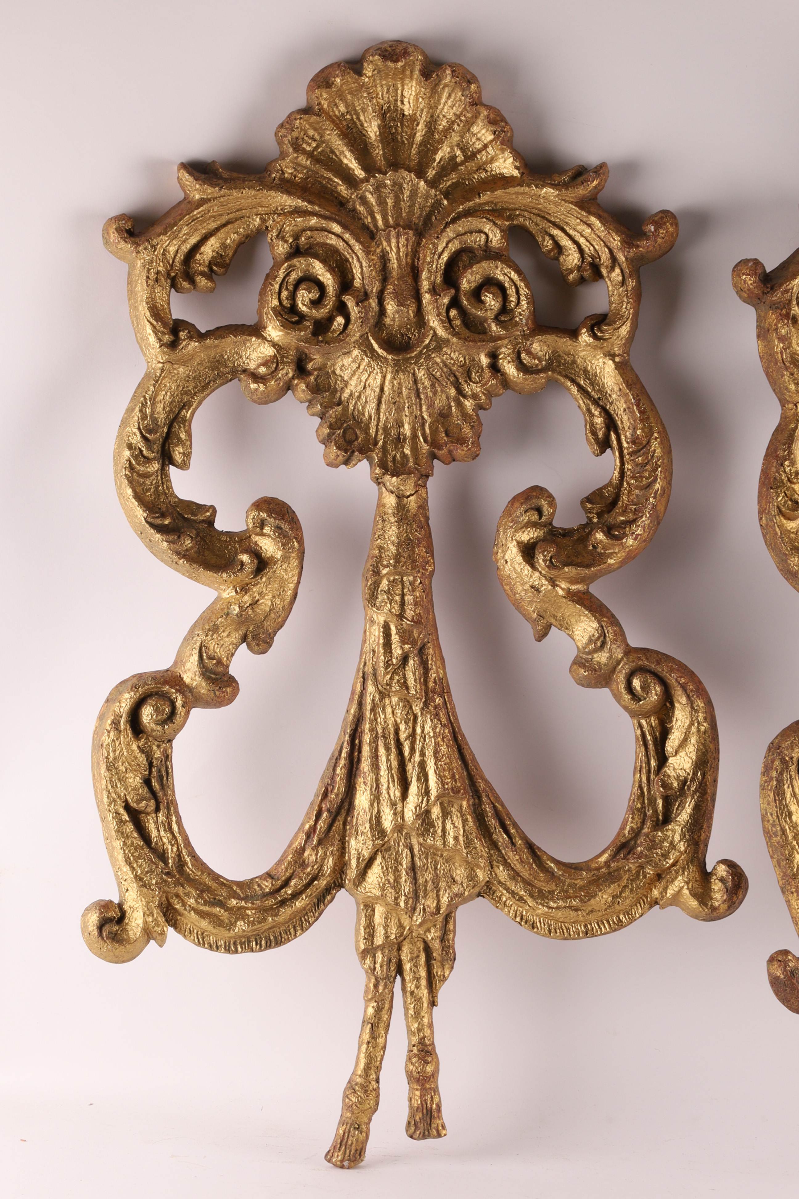 Pair of Hollywood Regency Rococo Style Ornate Gilt Composite Wall Decorations. Measuring 34 inches H x 20 W.