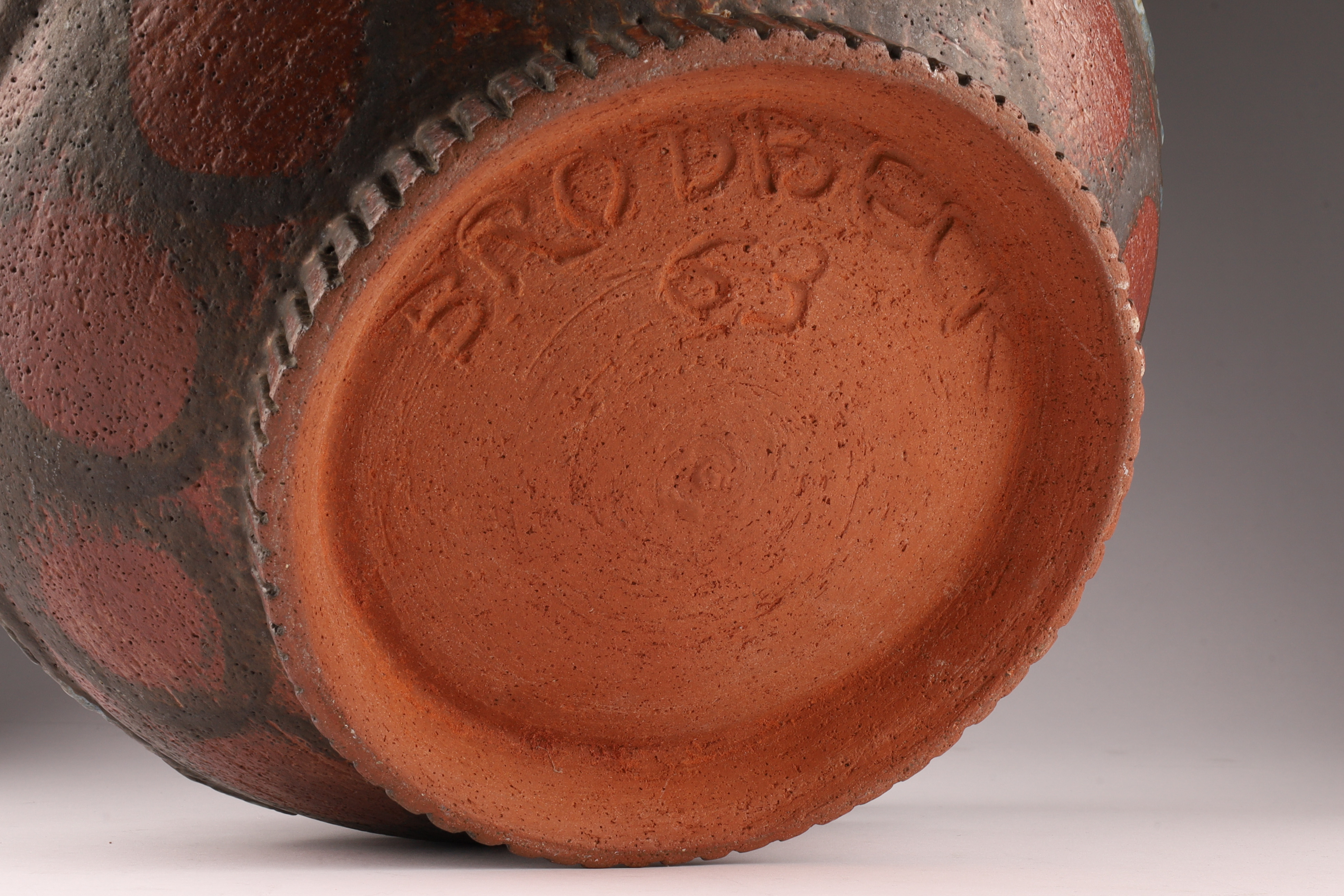 Mid Century Large Art Pottery Bowl Signed Nicolas Broadbeck 63 on underside. Measures 7.25 inches H x 12 W.
