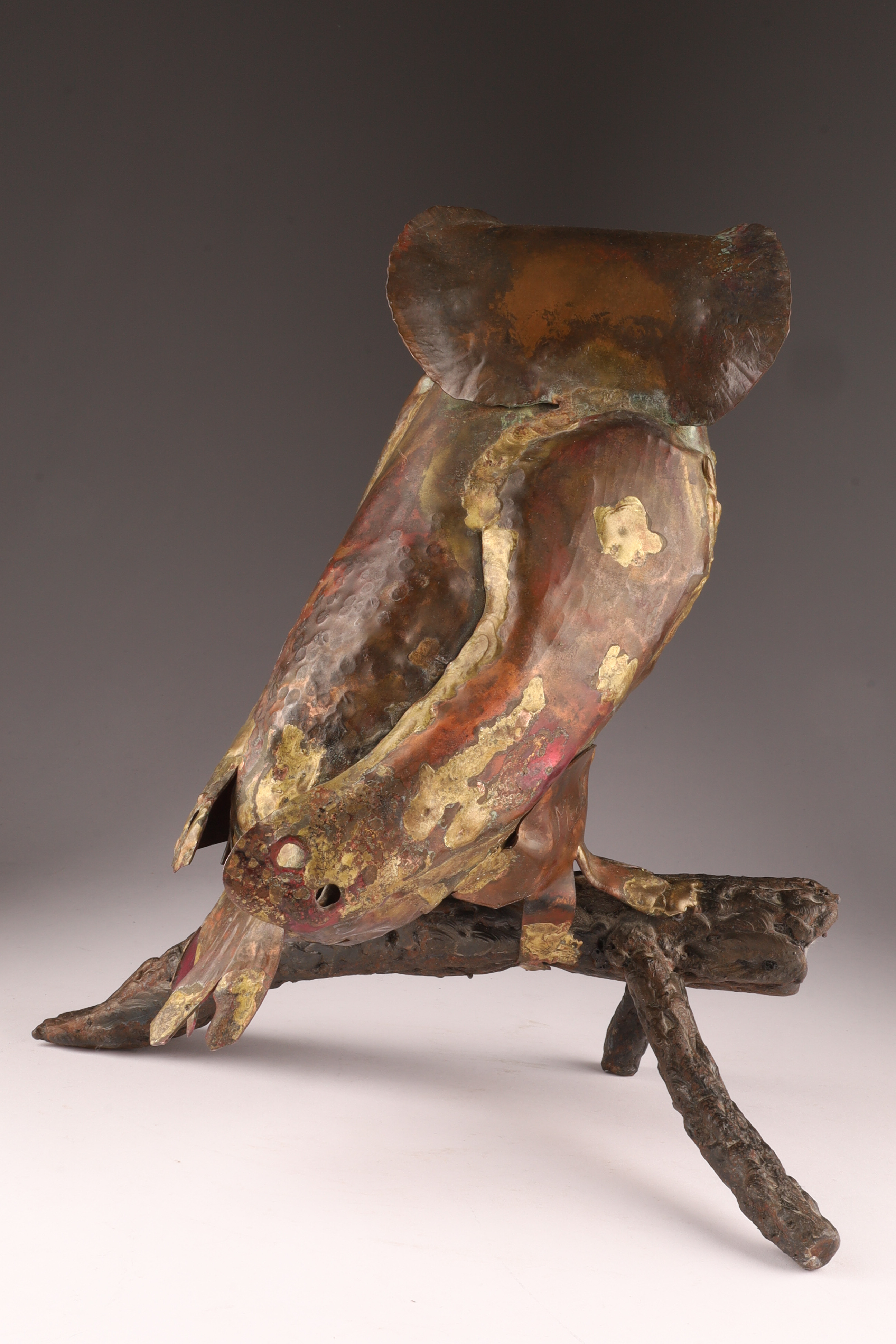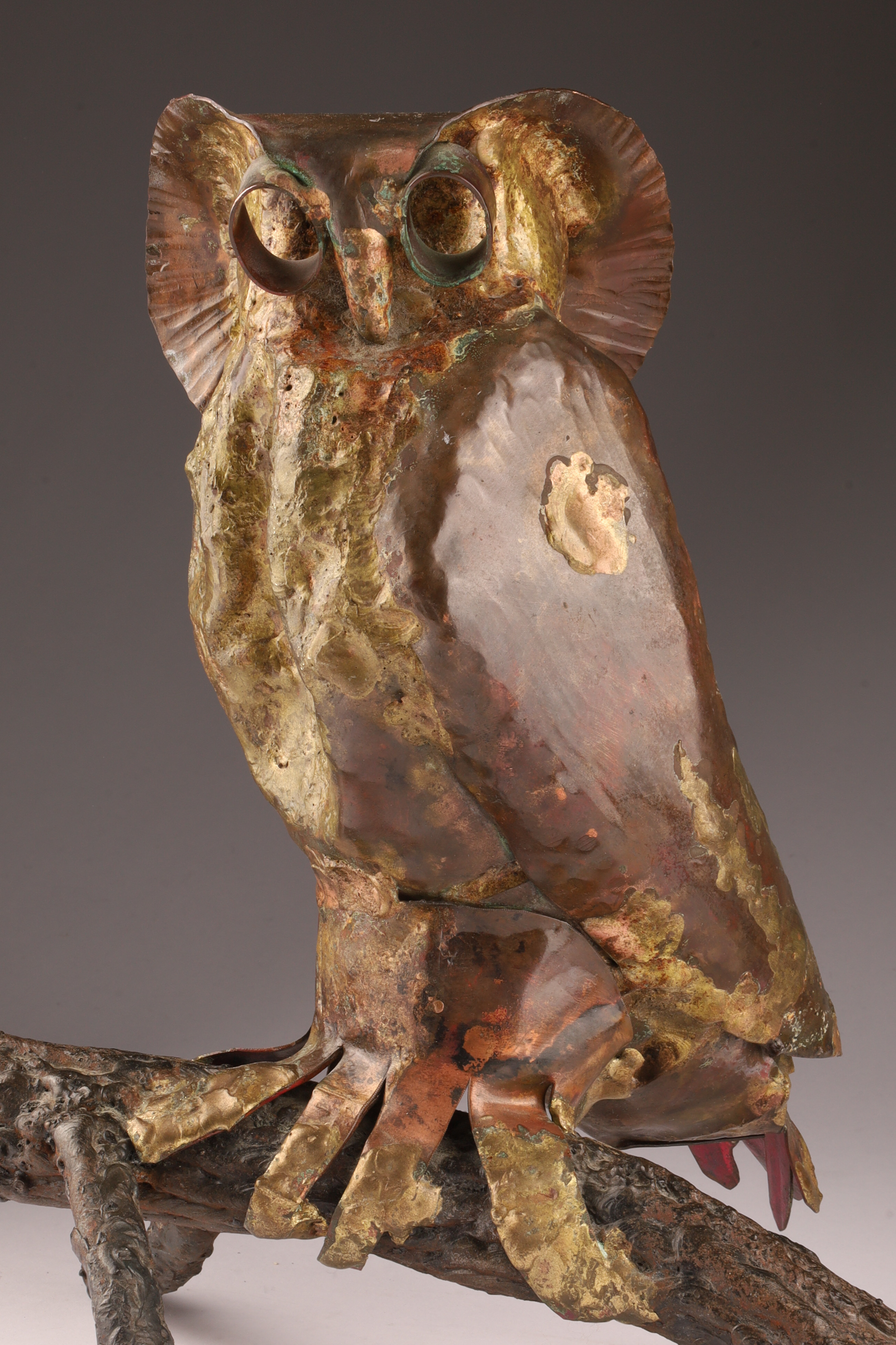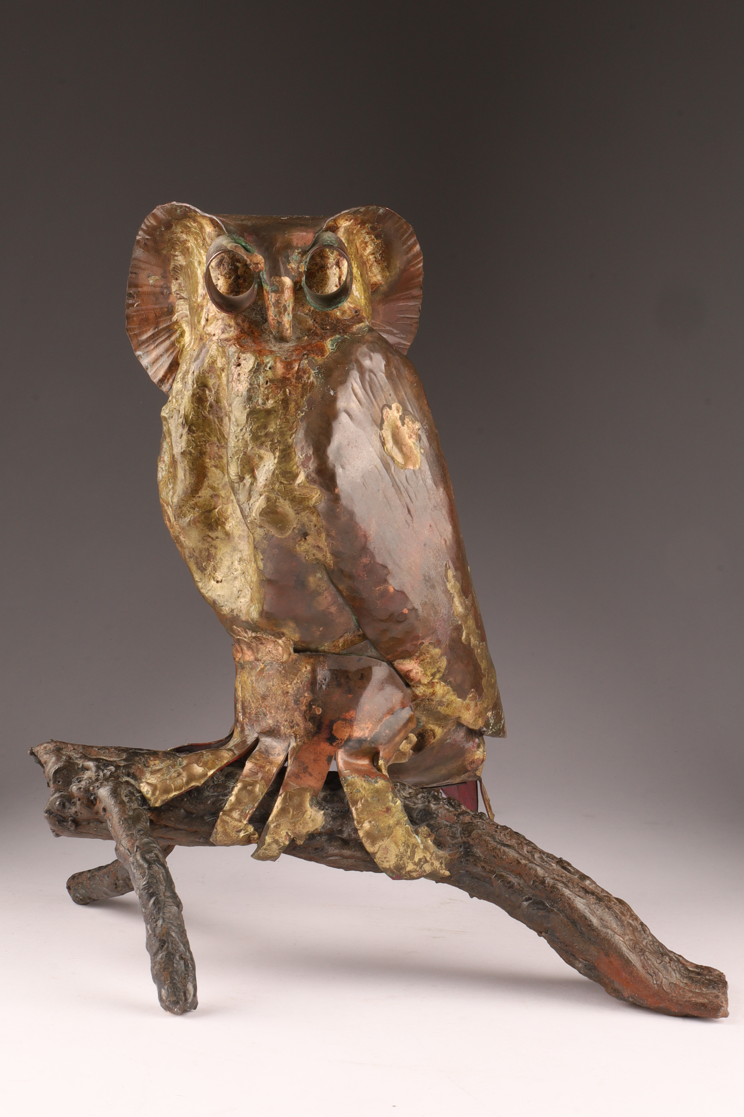 A striking hand-forged mixed-metal sculpture of an owl perched on a naturalistic branch, executed in copper, brass, and iron. The body is crafted from hammered and welded copper sheet with brass highlights, accented by deeply set tubular eyes and stylized feather texturing. The forged iron branch base provides both balance and a Brutalist, organic quality.