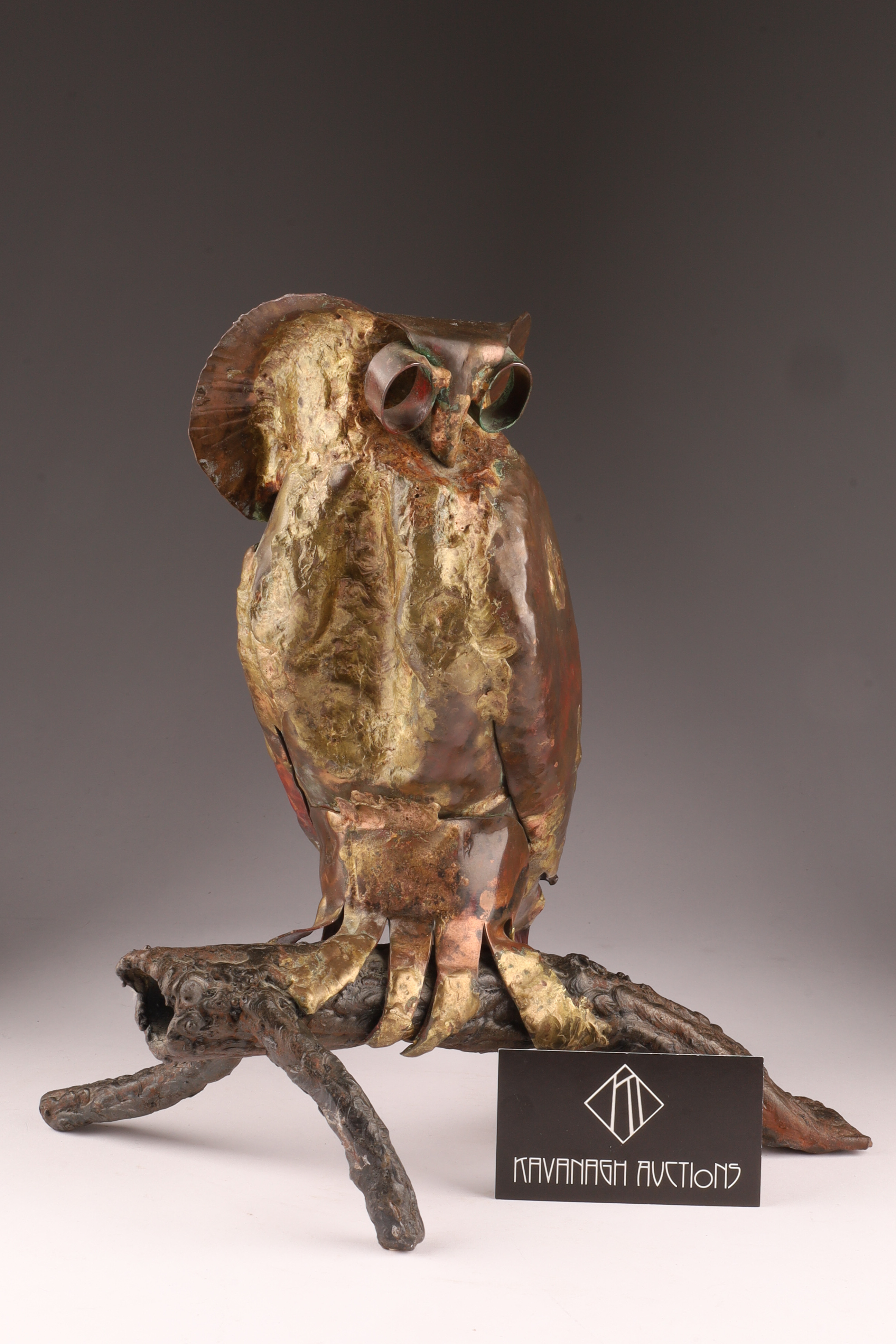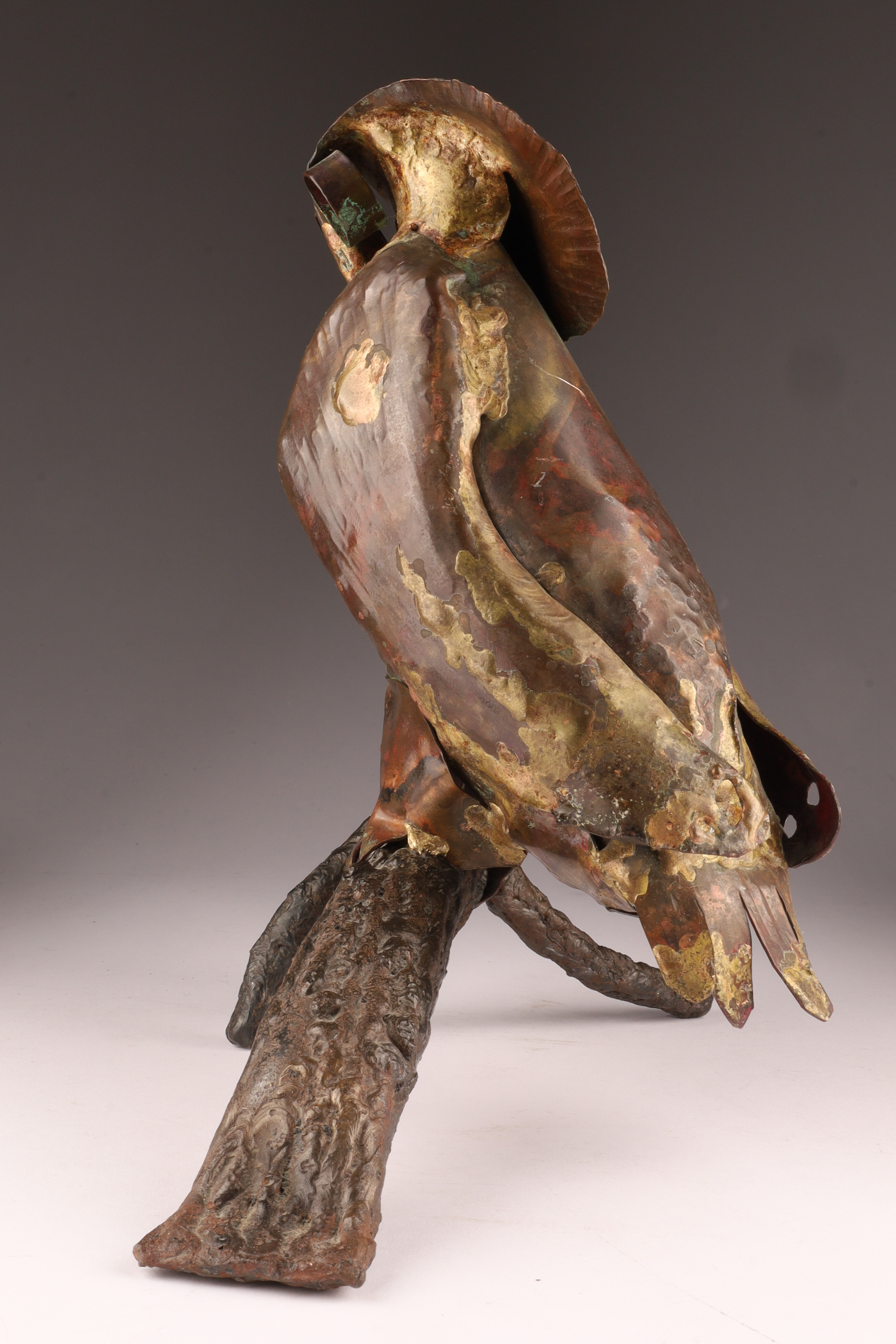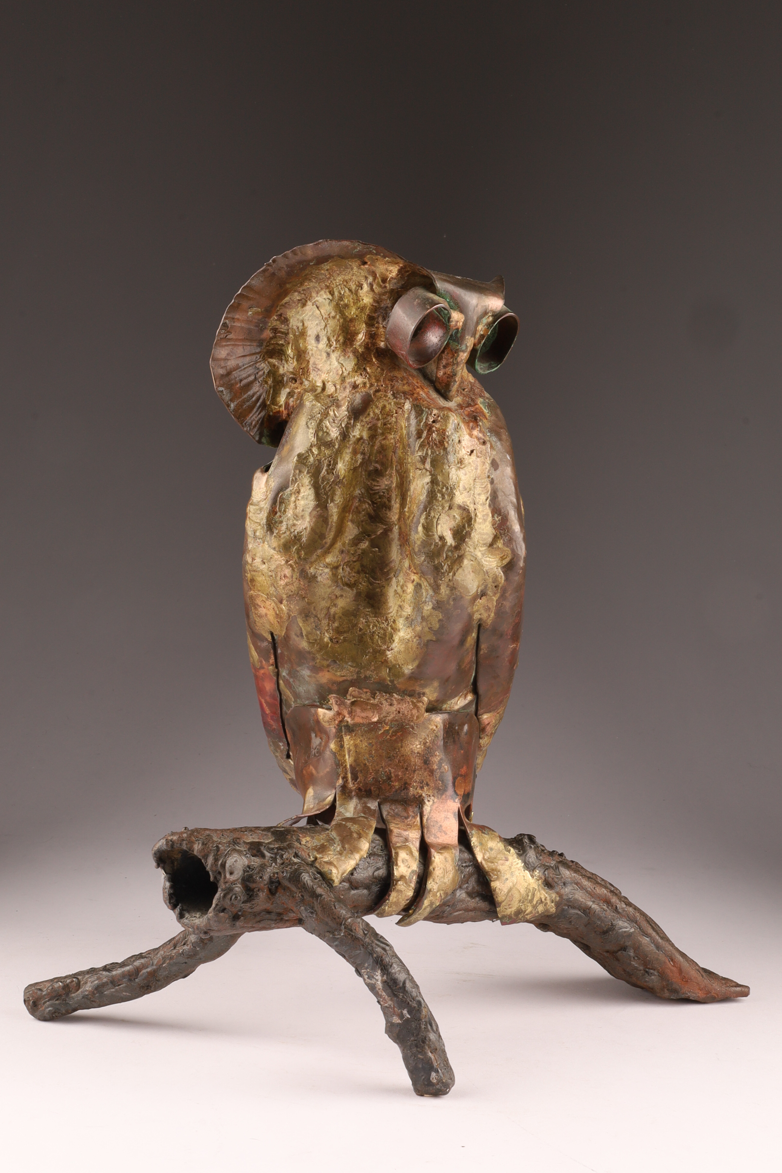 A striking hand-forged mixed-metal sculpture of an owl perched on a naturalistic branch, executed in copper, brass, and iron. The body is crafted from hammered and welded copper sheet with brass highlights, accented by deeply set tubular eyes and stylized feather texturing. The forged iron branch base provides both balance and a Brutalist, organic quality.