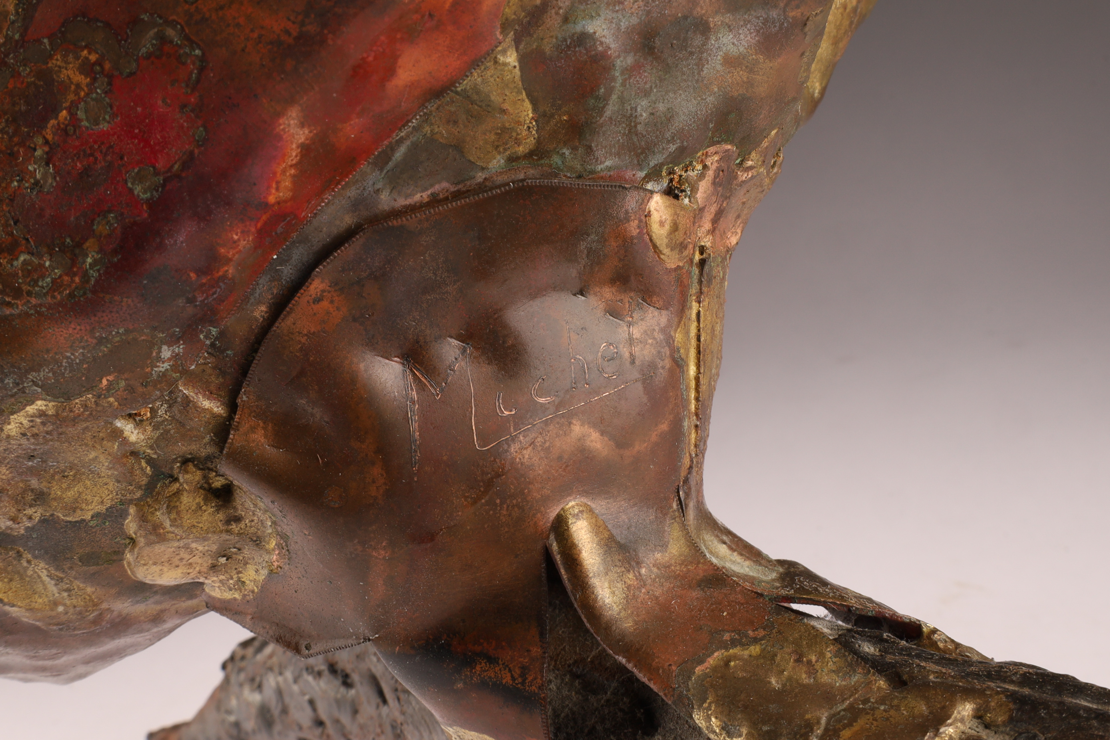 Signed Michel Souillard on the body. Souillard is known for his mid-century decorative metalwork, often depicting owls and birds with a modernist, Brutalist aesthetic, akin to the work of Curtis Jere and François Melin.