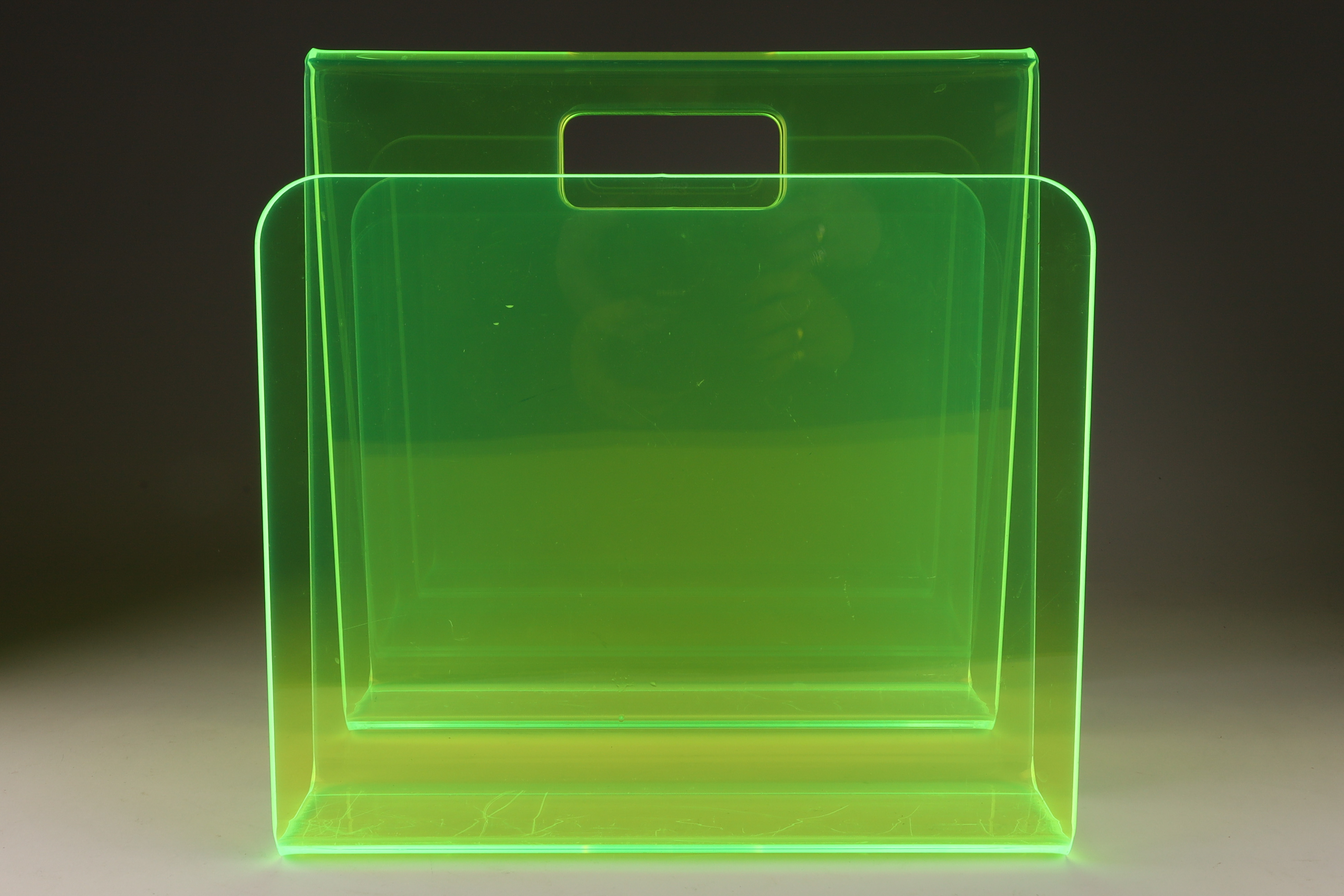 Mid Century Space Age Glow Lime Lucite Magazine Rack. 12 x 12 x 8 inches.