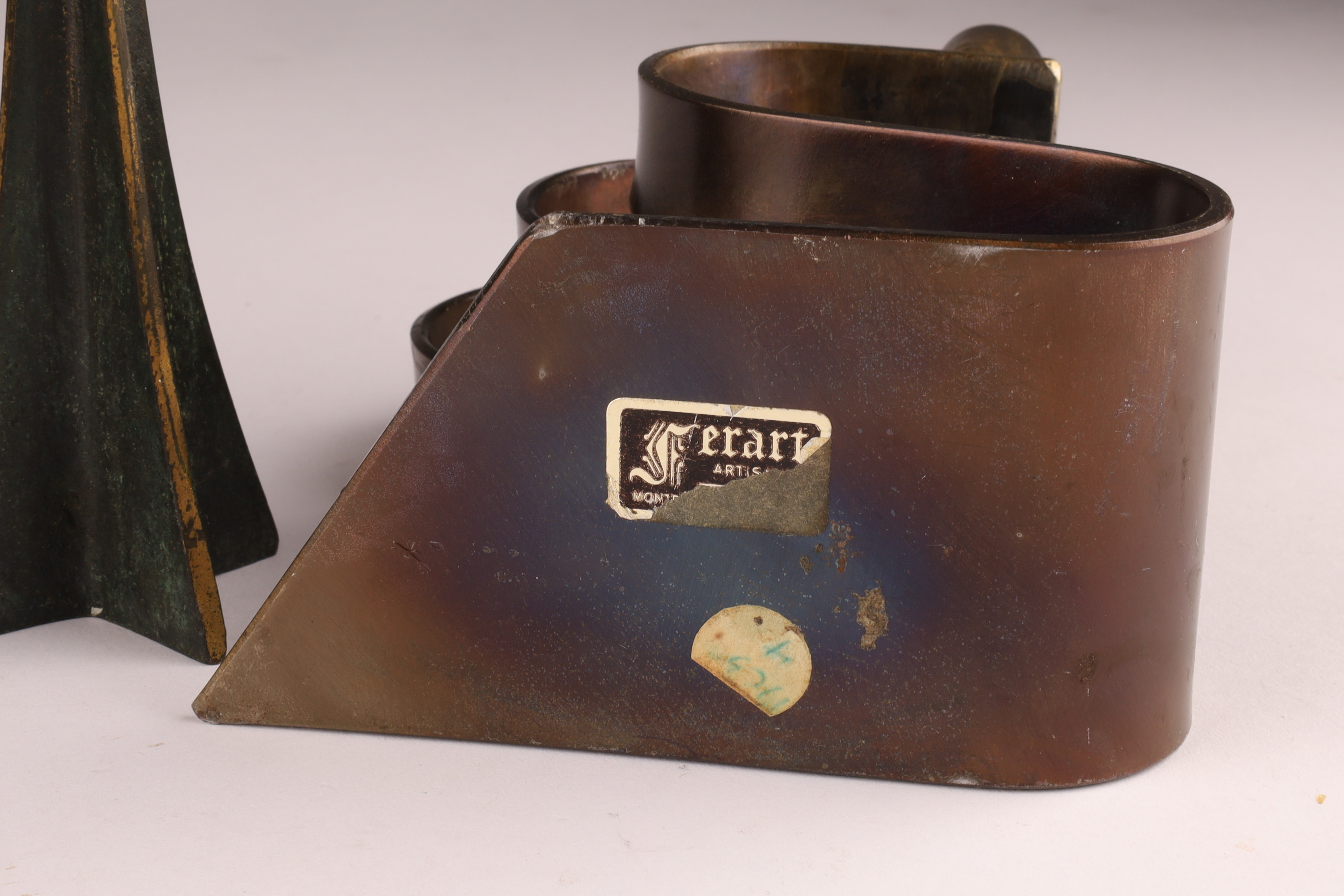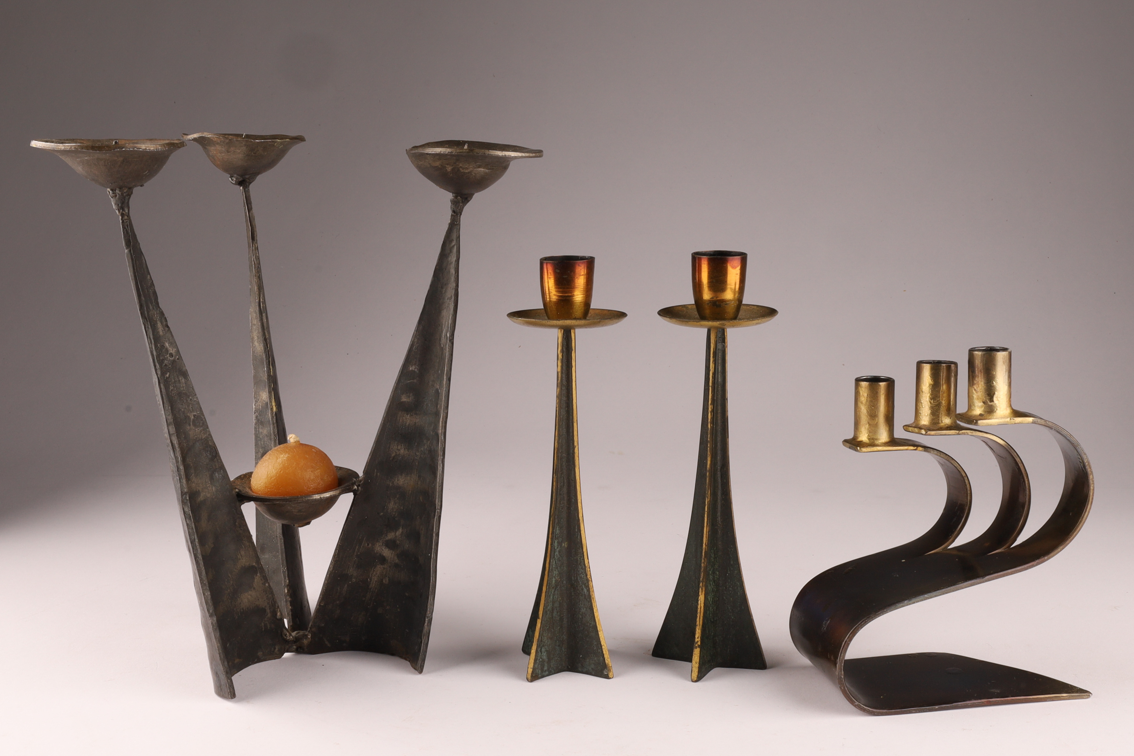 Lot of Brutalist Brass and Iron Candelabras Candlesticks. Tallest measures 8.5 inches H x 8 W, smallest measures 6 inches H x 2.5 W (marked Ferart Montreal). Israel Pal Bell style candlesticks measure 7 inches.