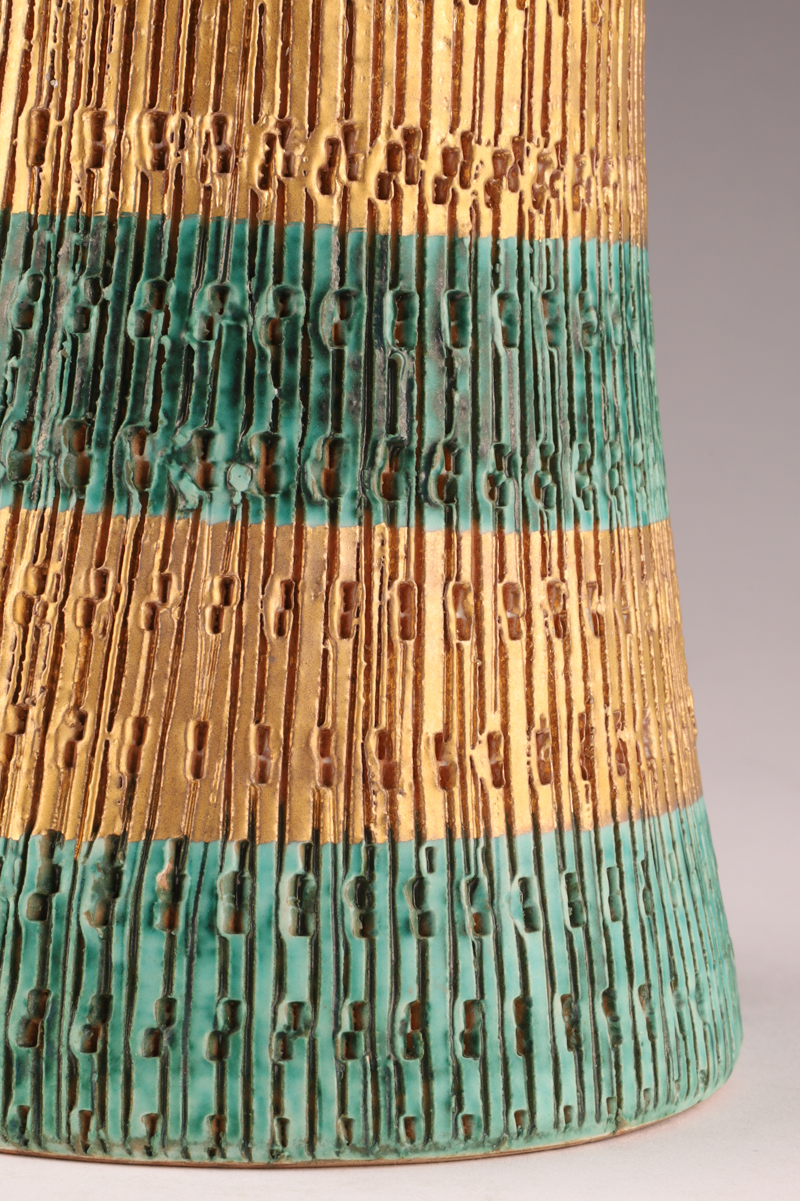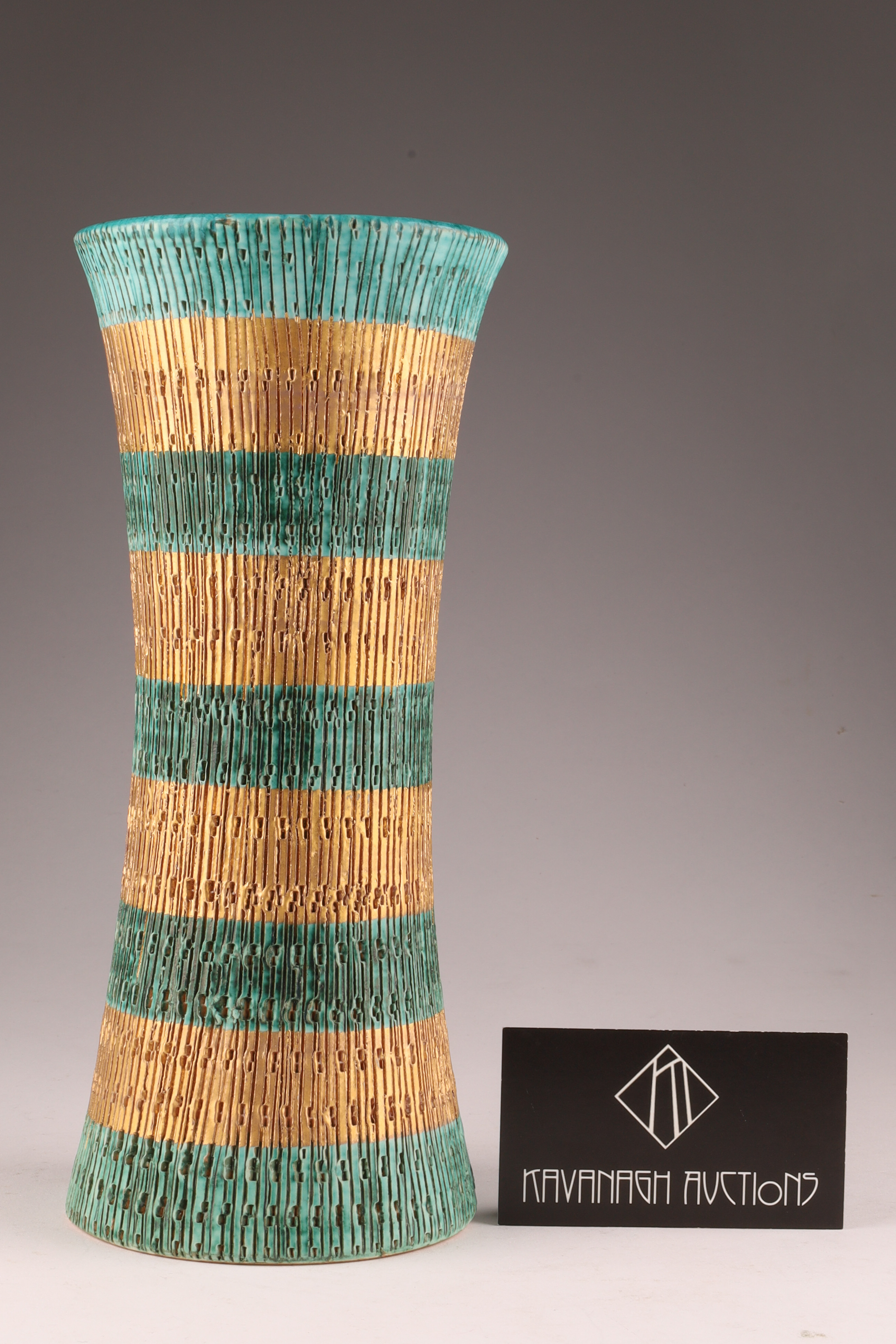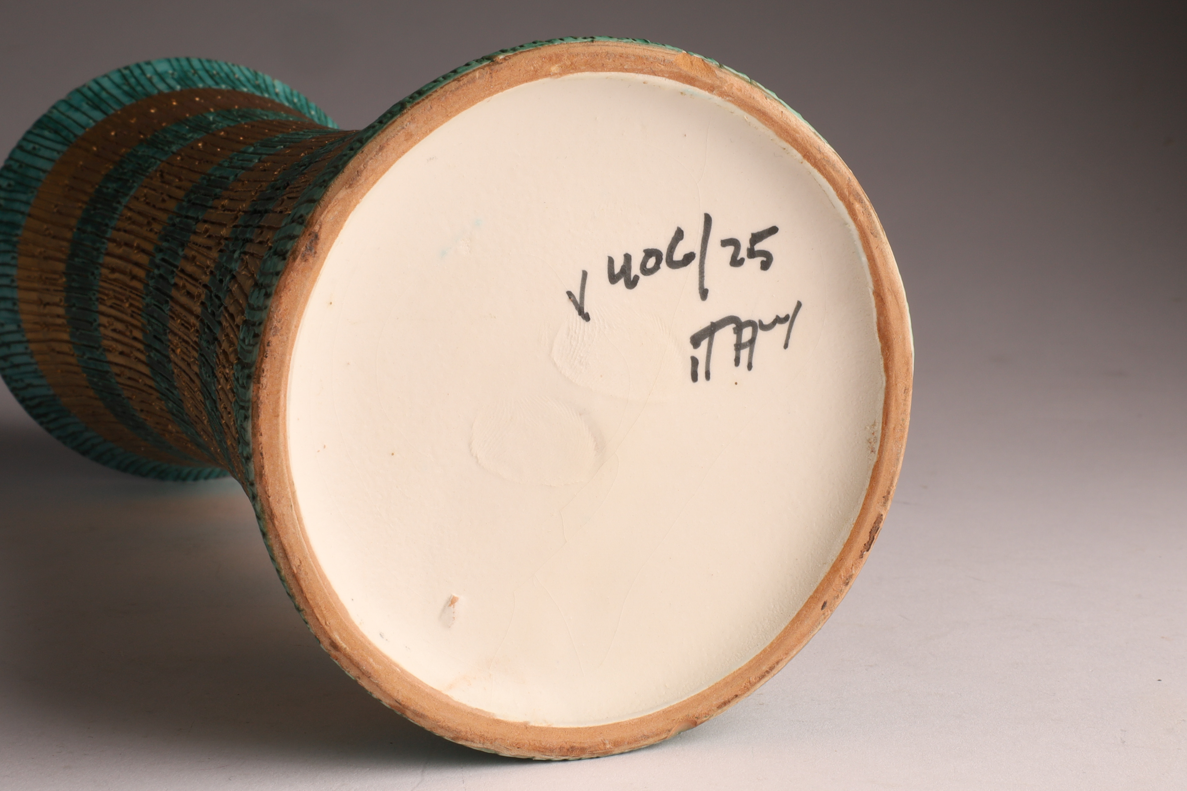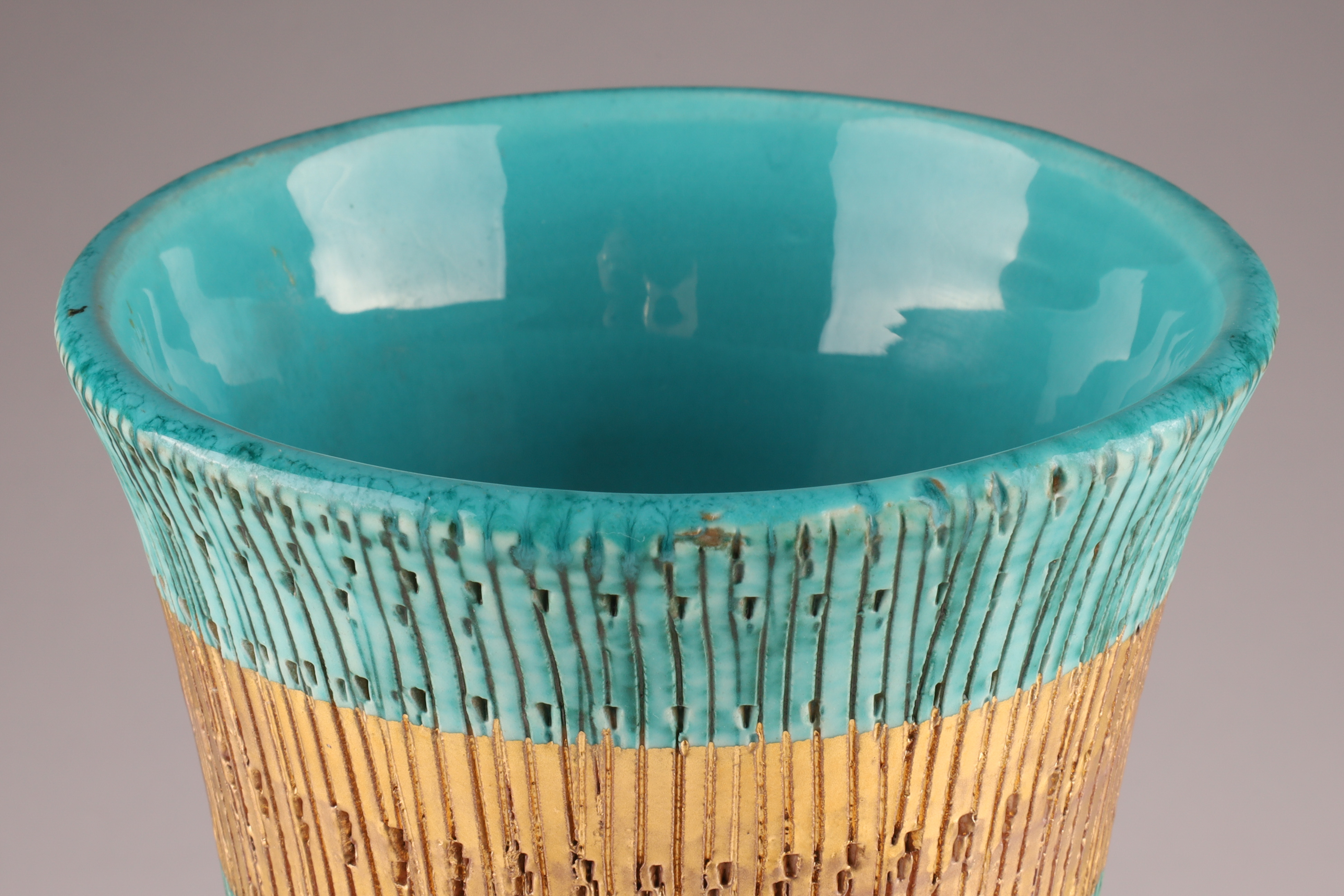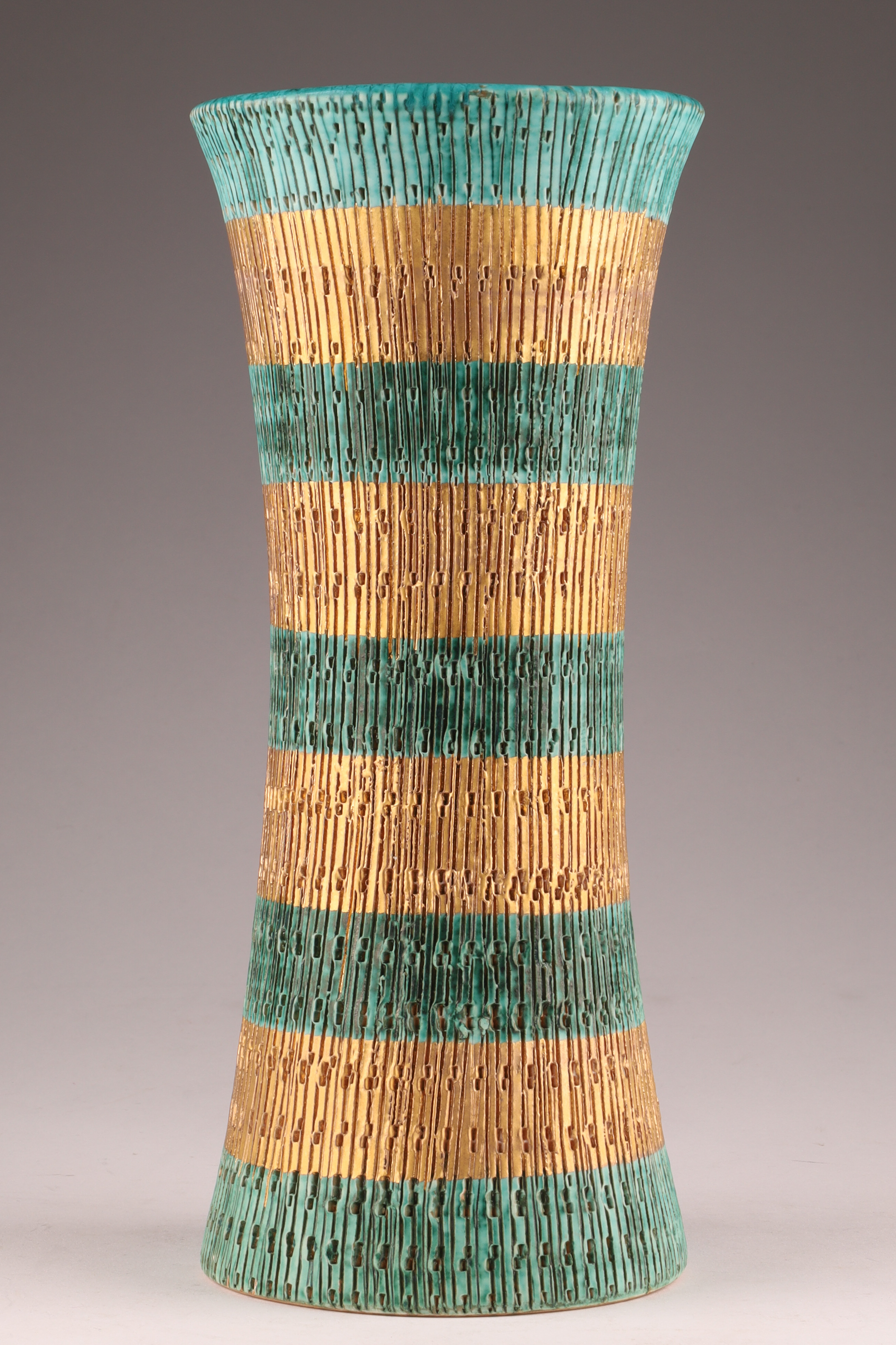 Mid Century Modern Aldo Londi for Bitossi Italy Sgraffito Ceramic Seta Design Vase. Marked on underside, V 406/25 Italy, sgraffito design with teal and gold stripes. Measuring 10 inches H x 4 W.