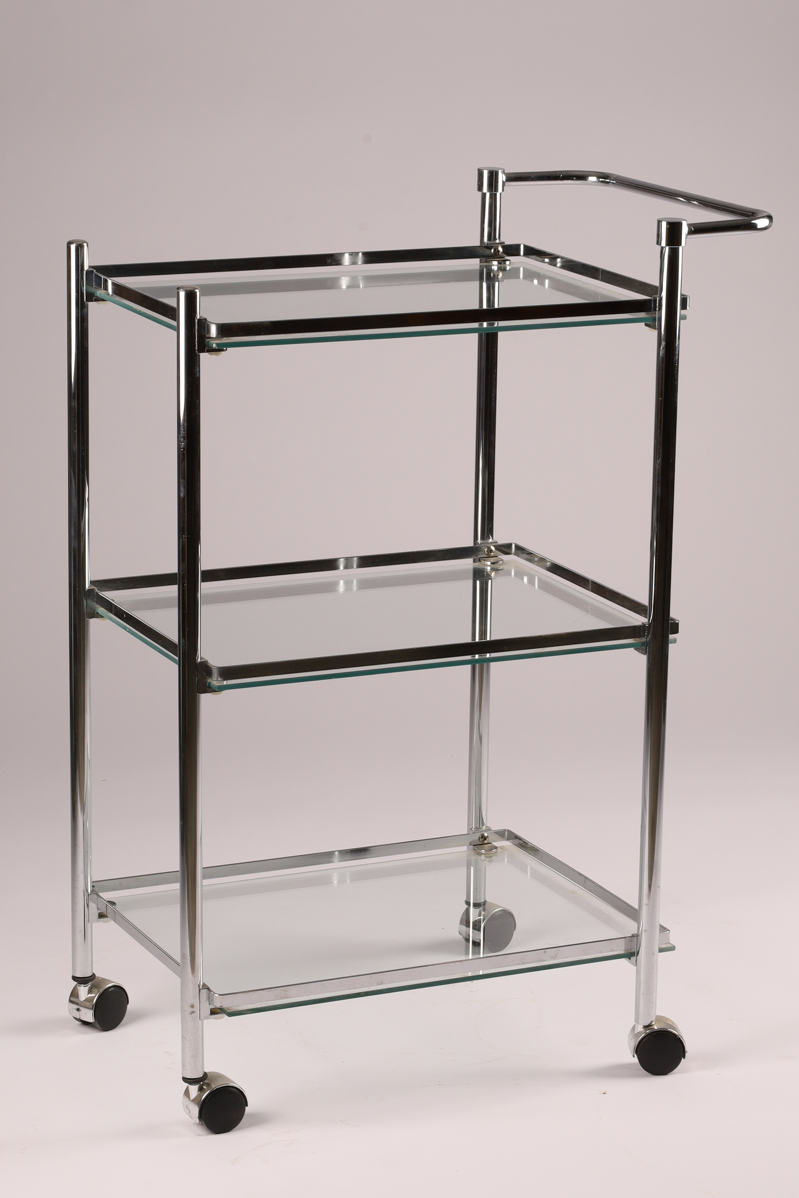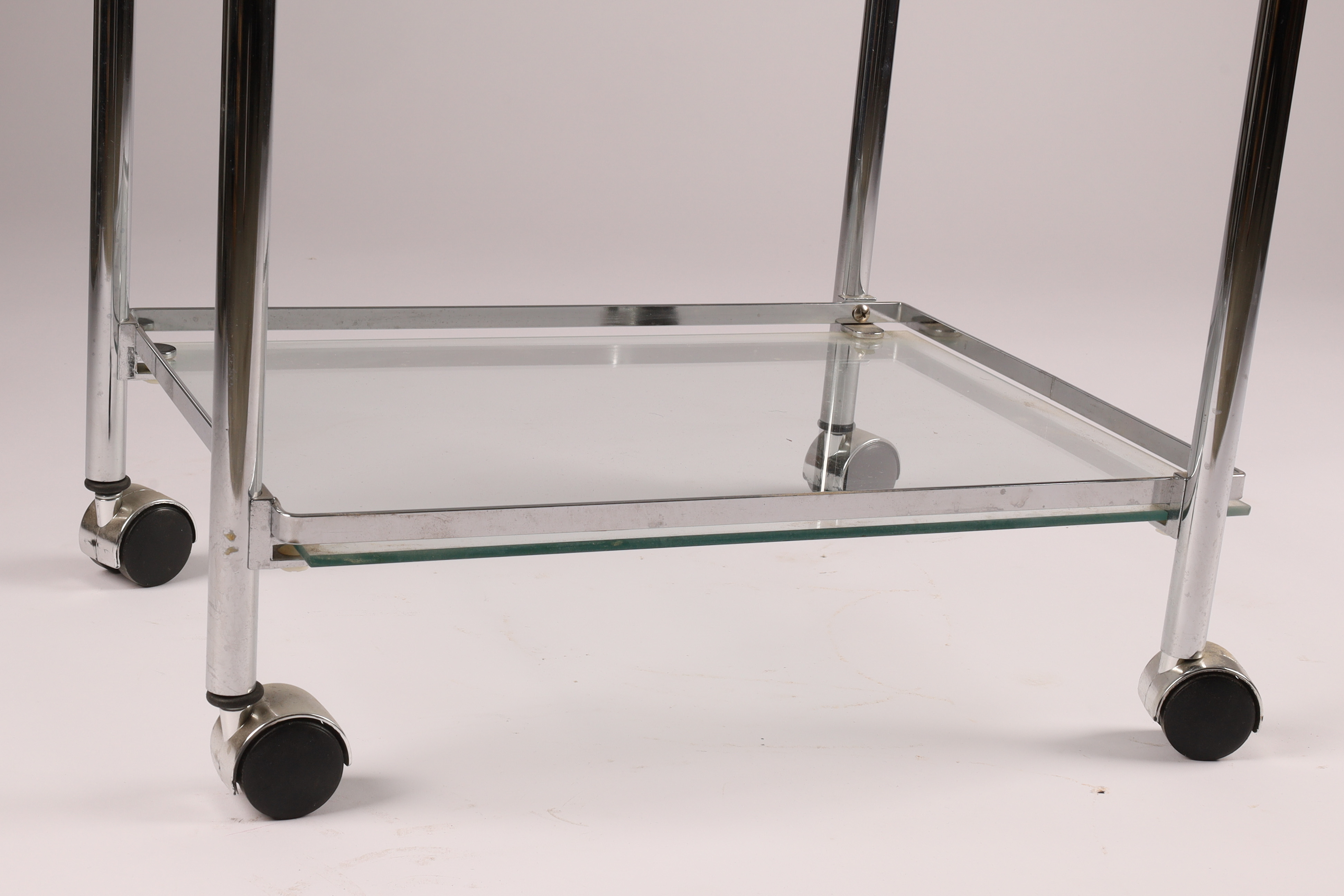 Mid Century Chrome and Glass Tiered Rolling Bar Cart. Measuring 30 inches H x 21 W x 14.5 deep.