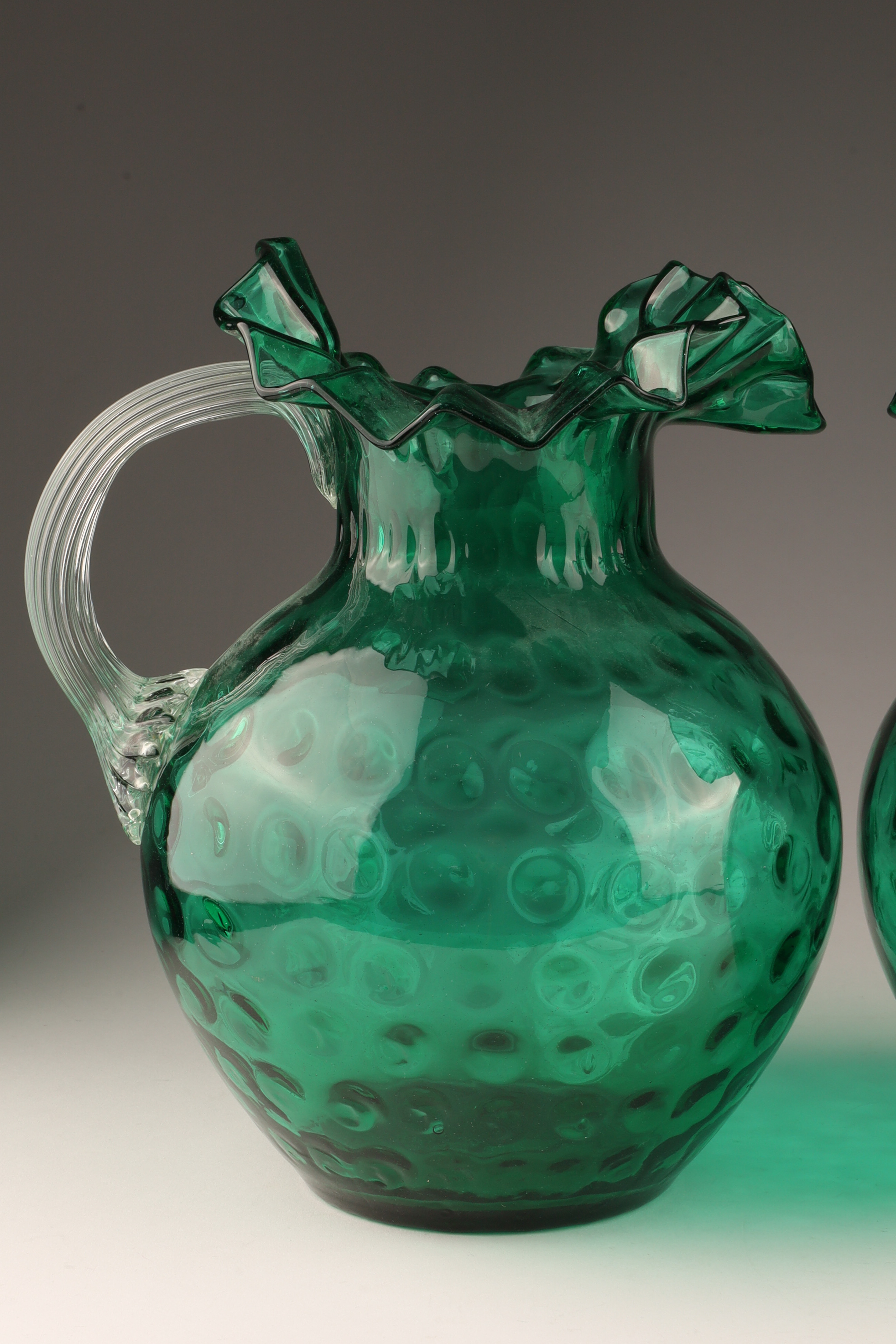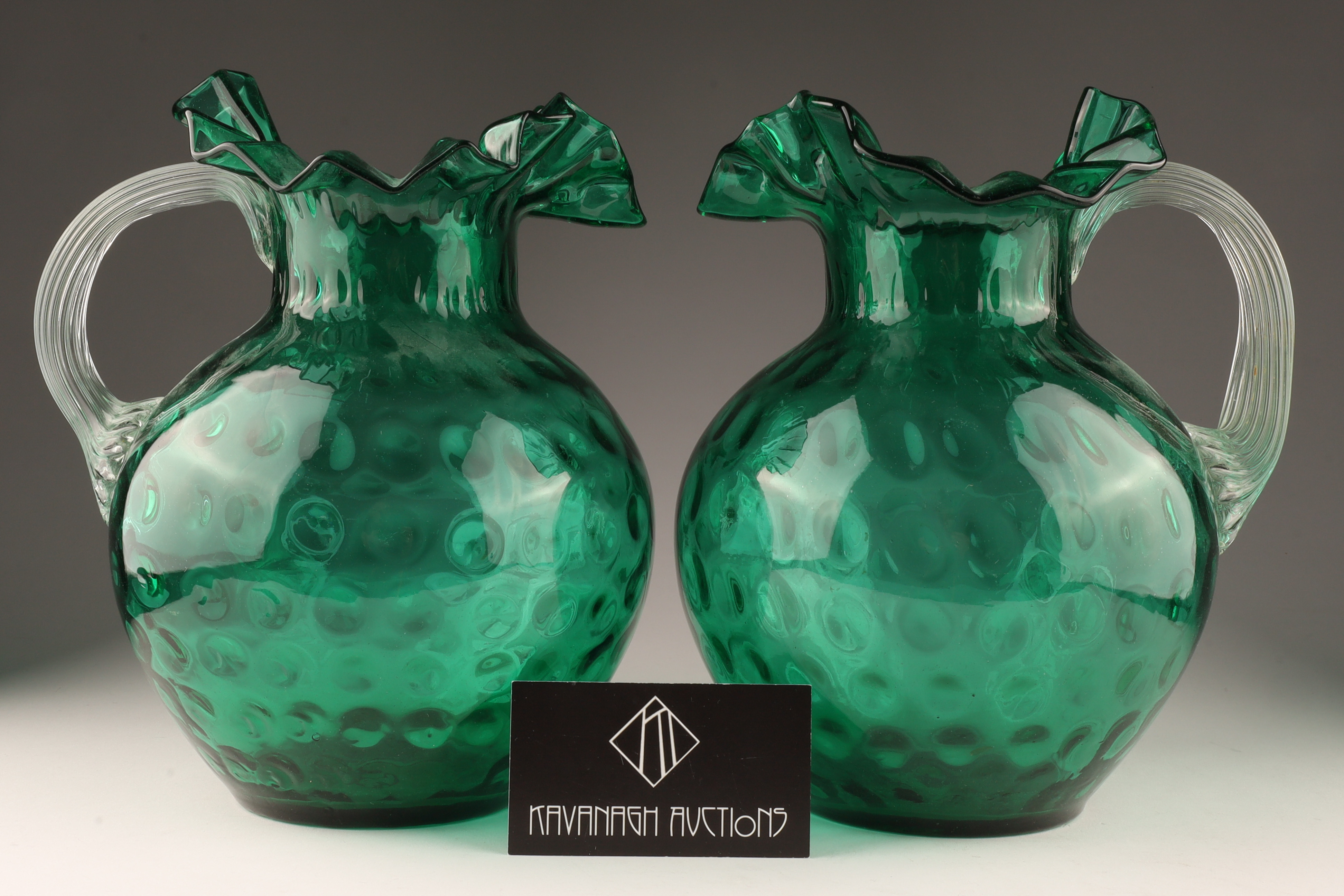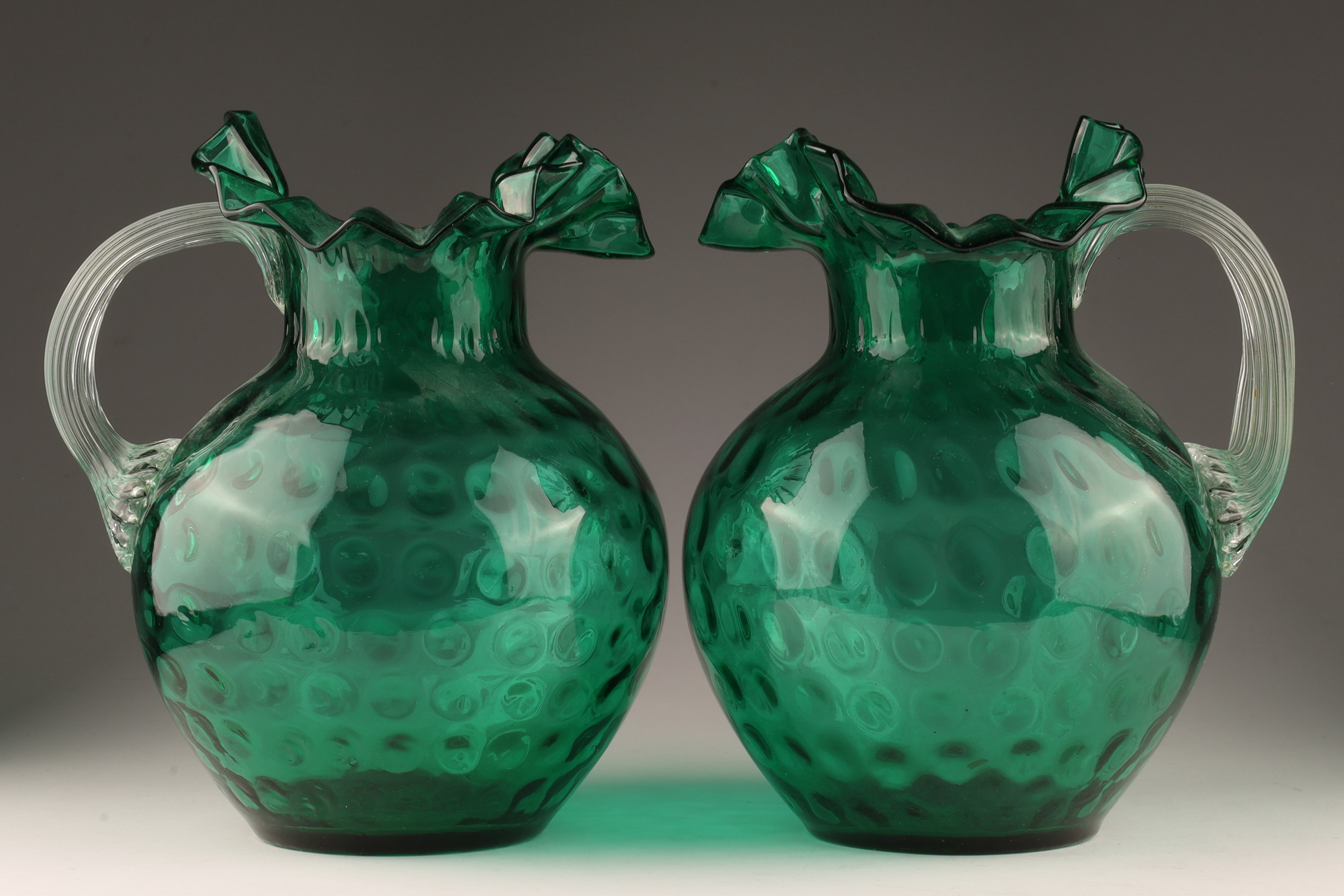 Pair of Fenton Colonial Green Art Glass Ruffled Georgian Thumbprint Pitchers