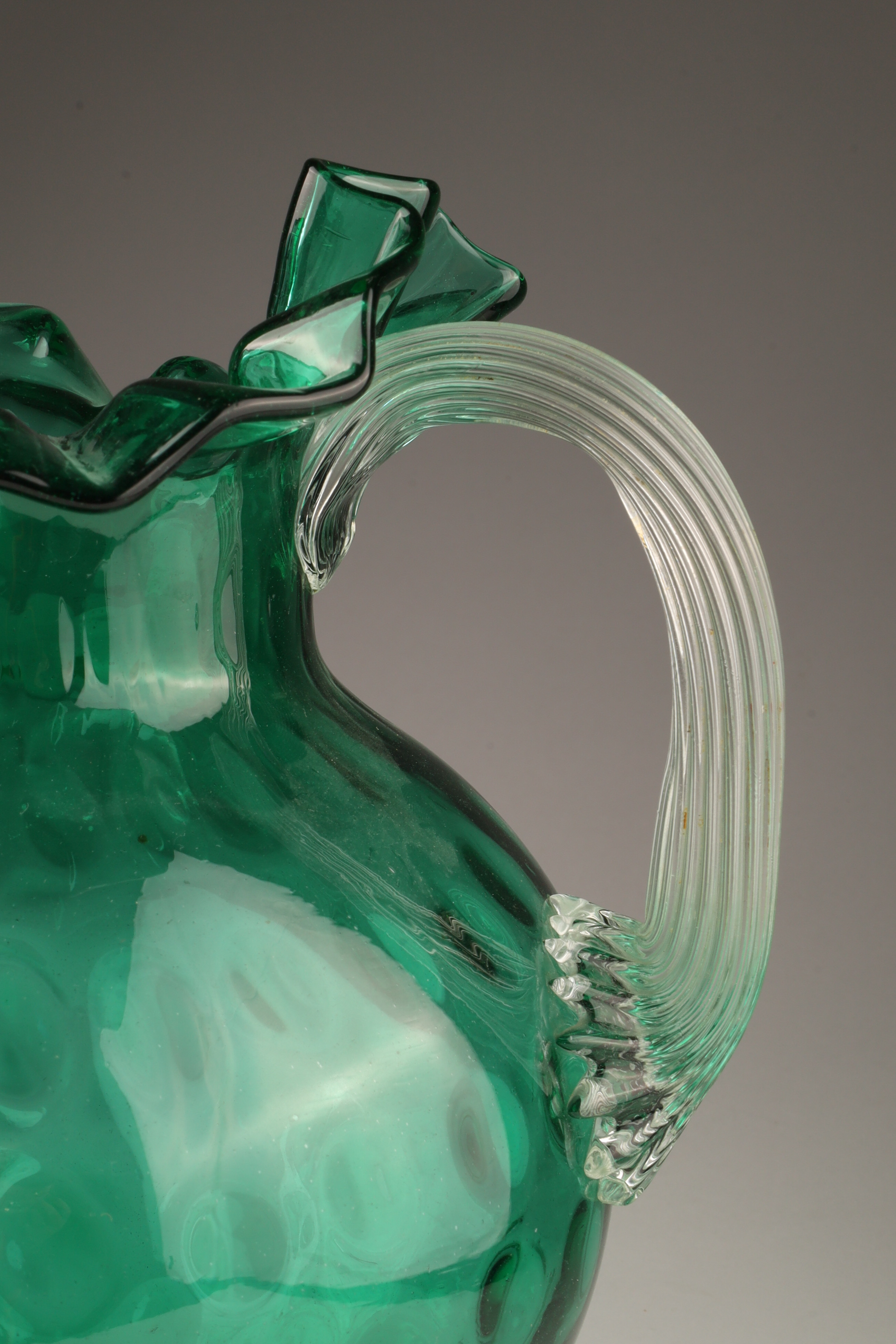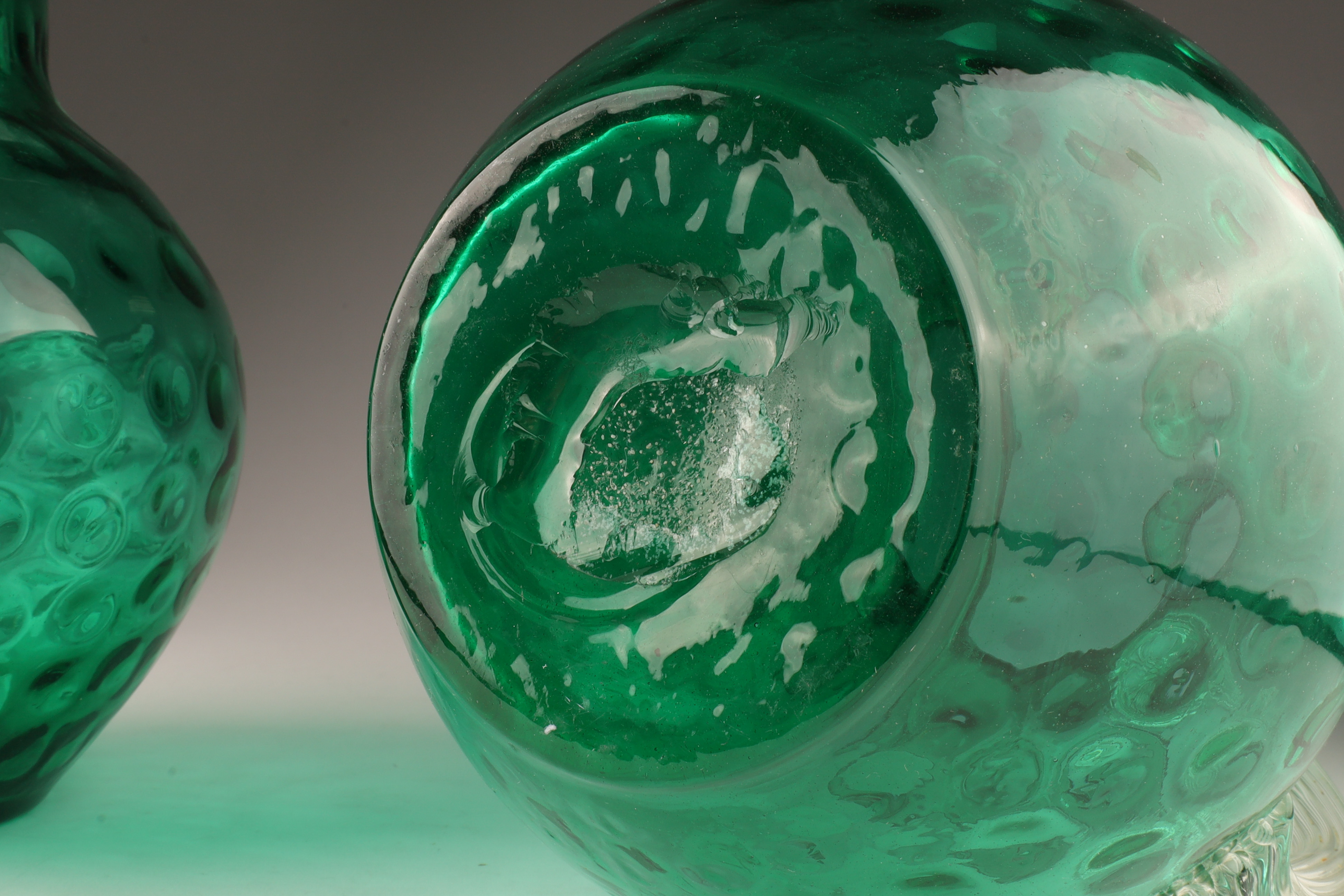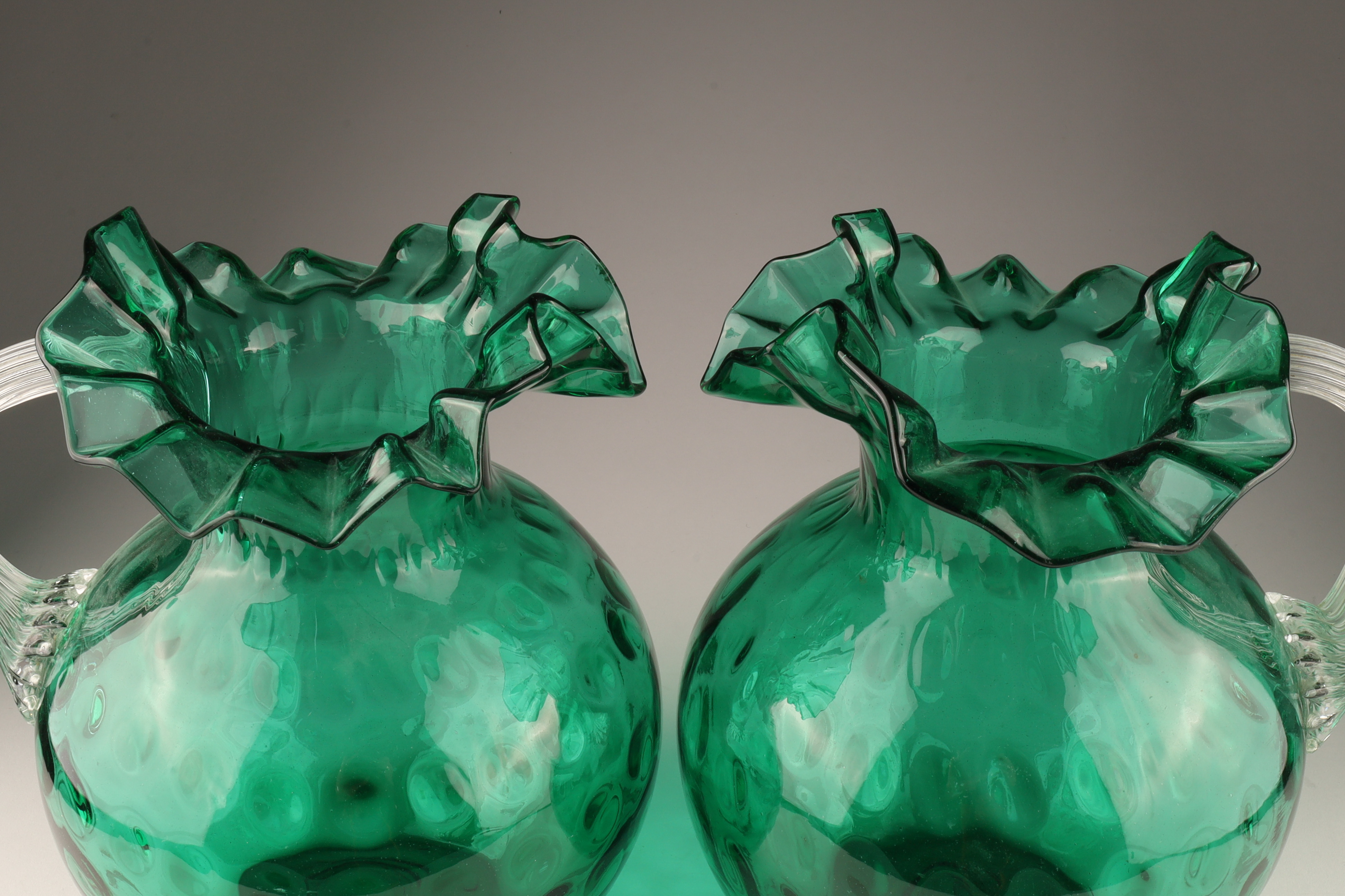 Pair of Fenton Colonial Green Art Glass Ruffled Georgian Thumbprint Pitchers