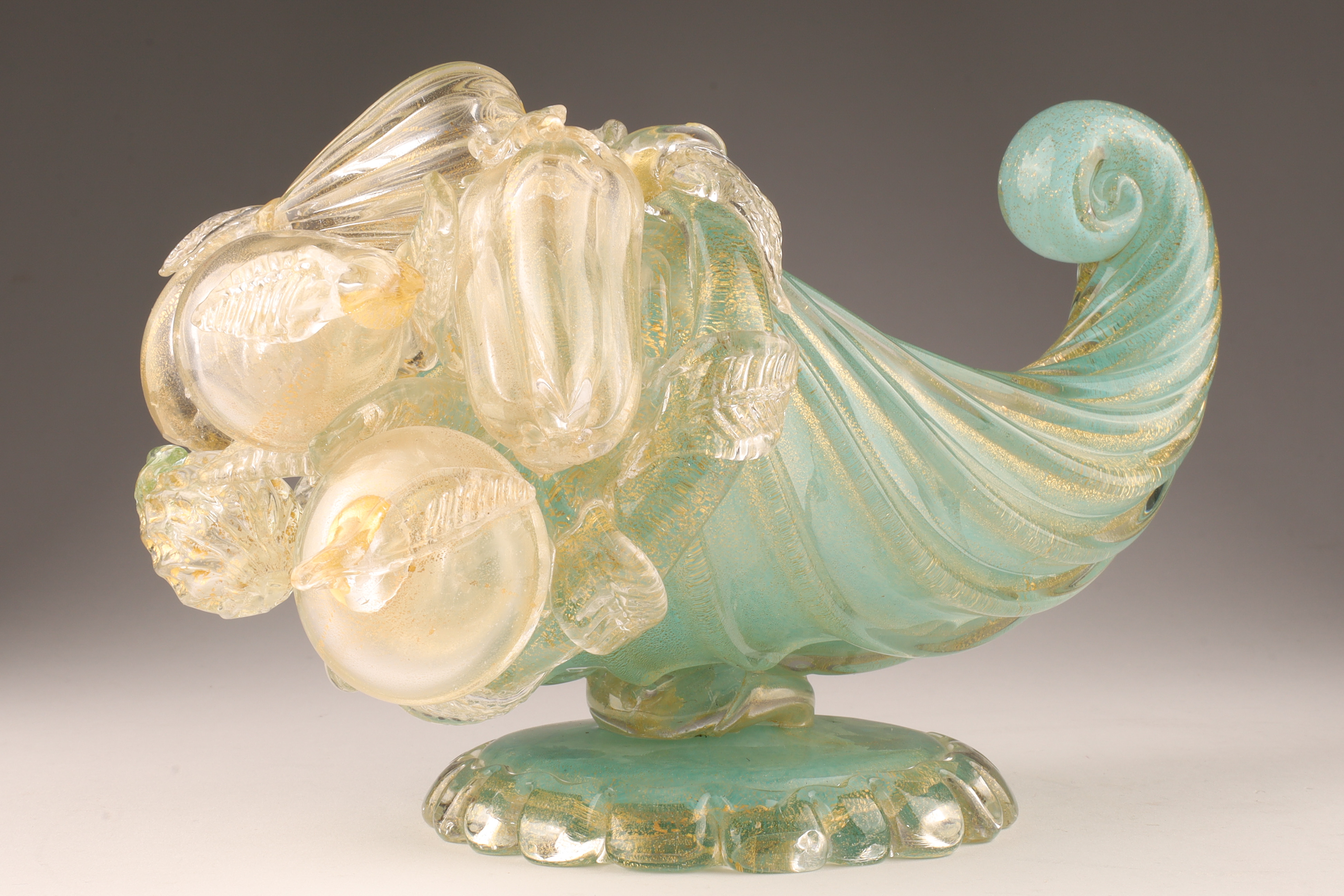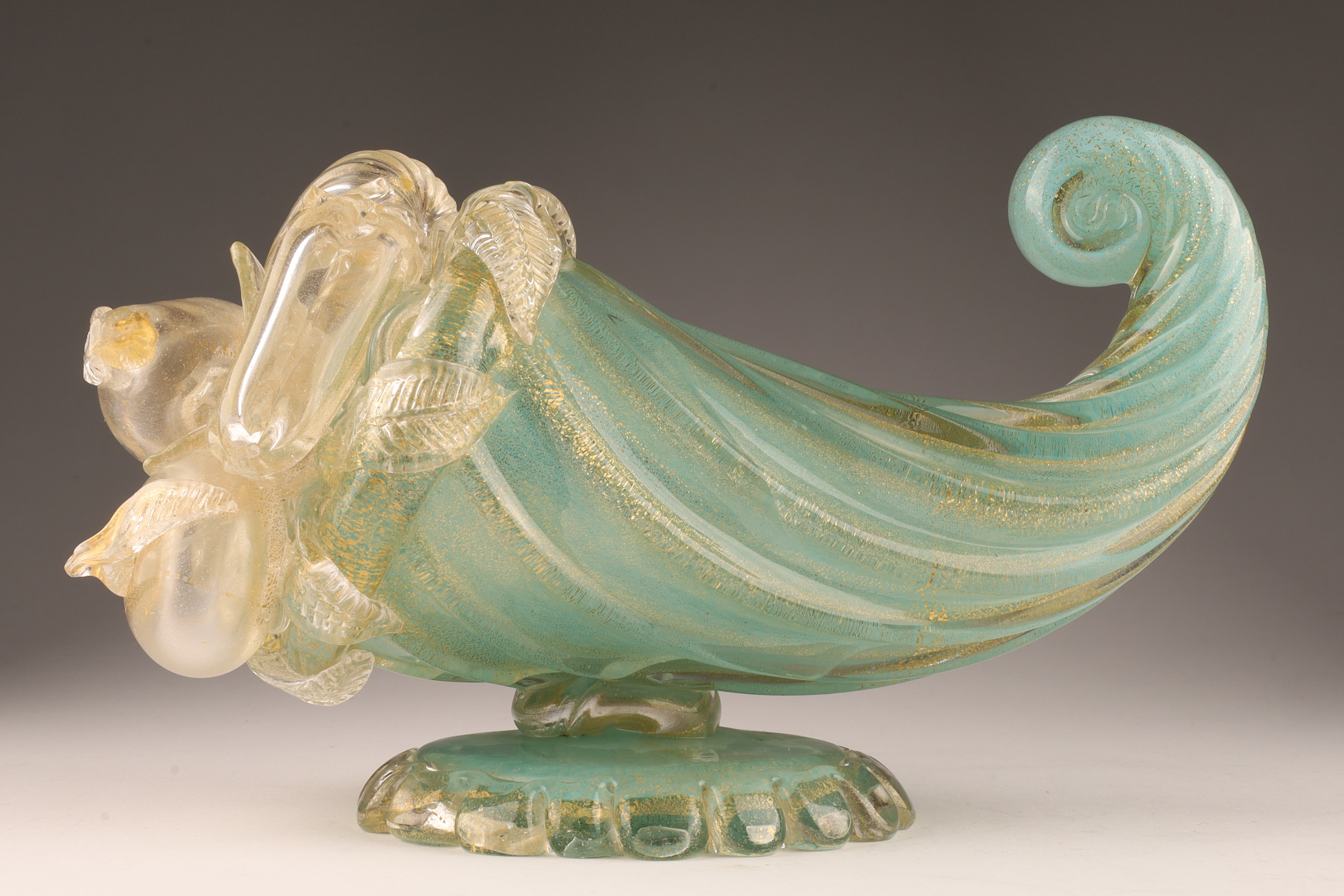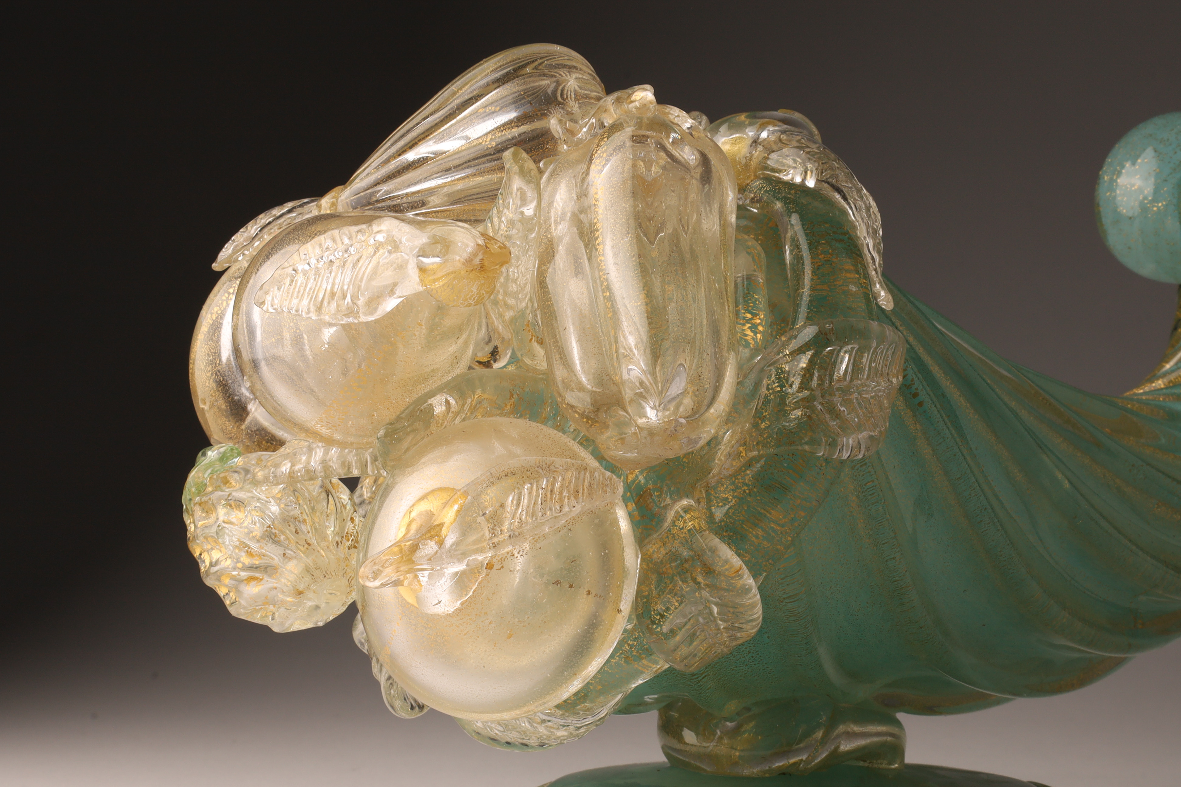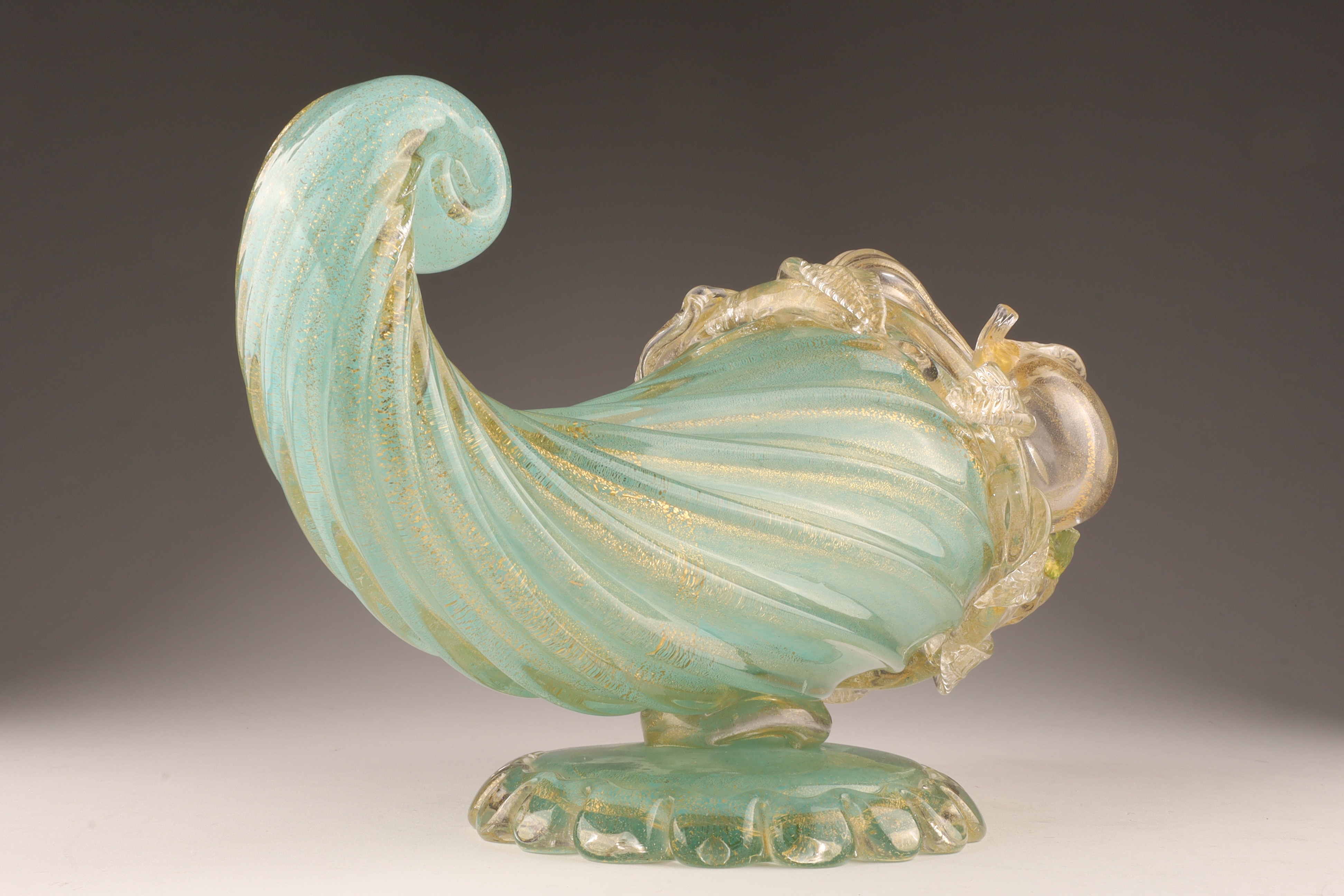 Vintage Art Glass Attr. Ercole Barovier Murano Cornucopia Gold Flecks. Internal crack to horn. Measuring 6 inches x 10 inches x 5 inches.