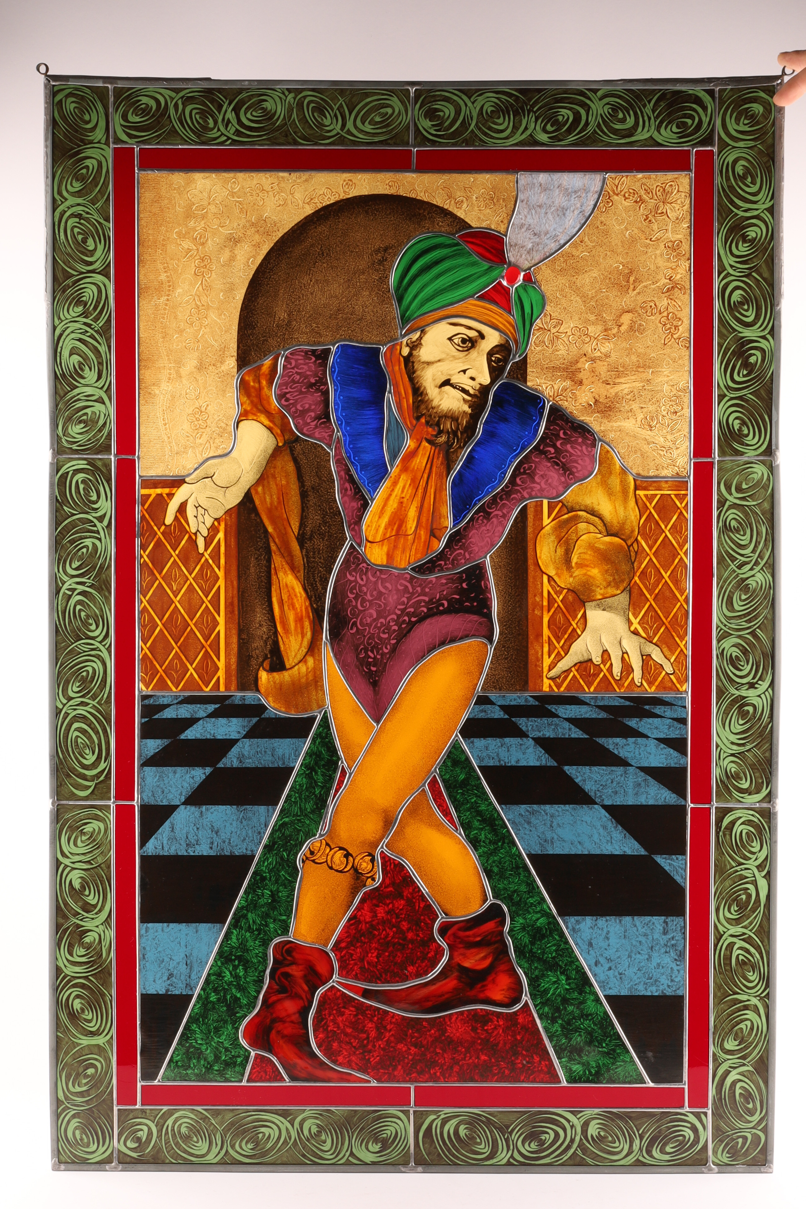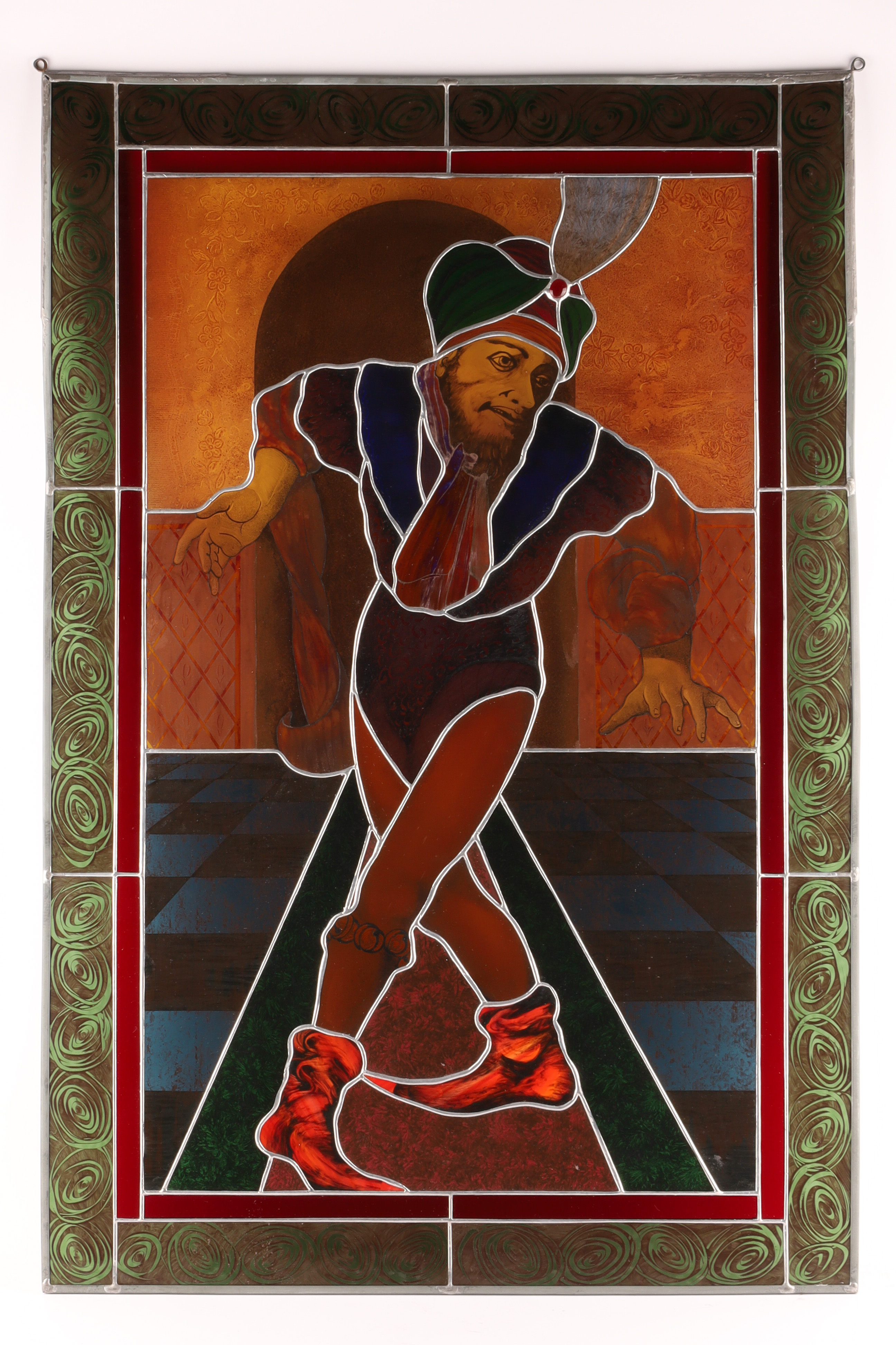 A vibrant mid-century stained-glass panel depicting a theatrical court jester in richly colored costume, posed against a Renaissance-inspired arch and checkered floor.