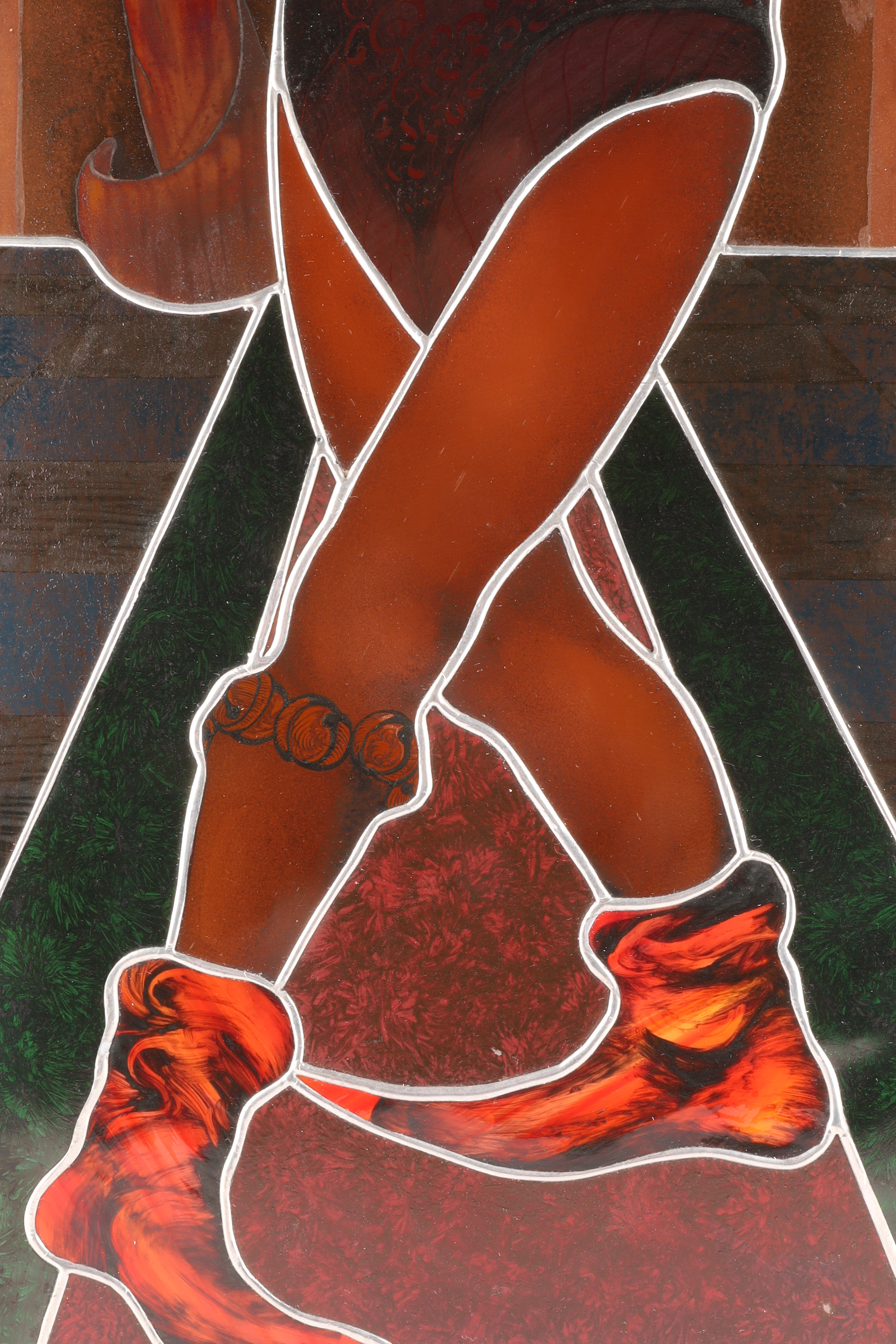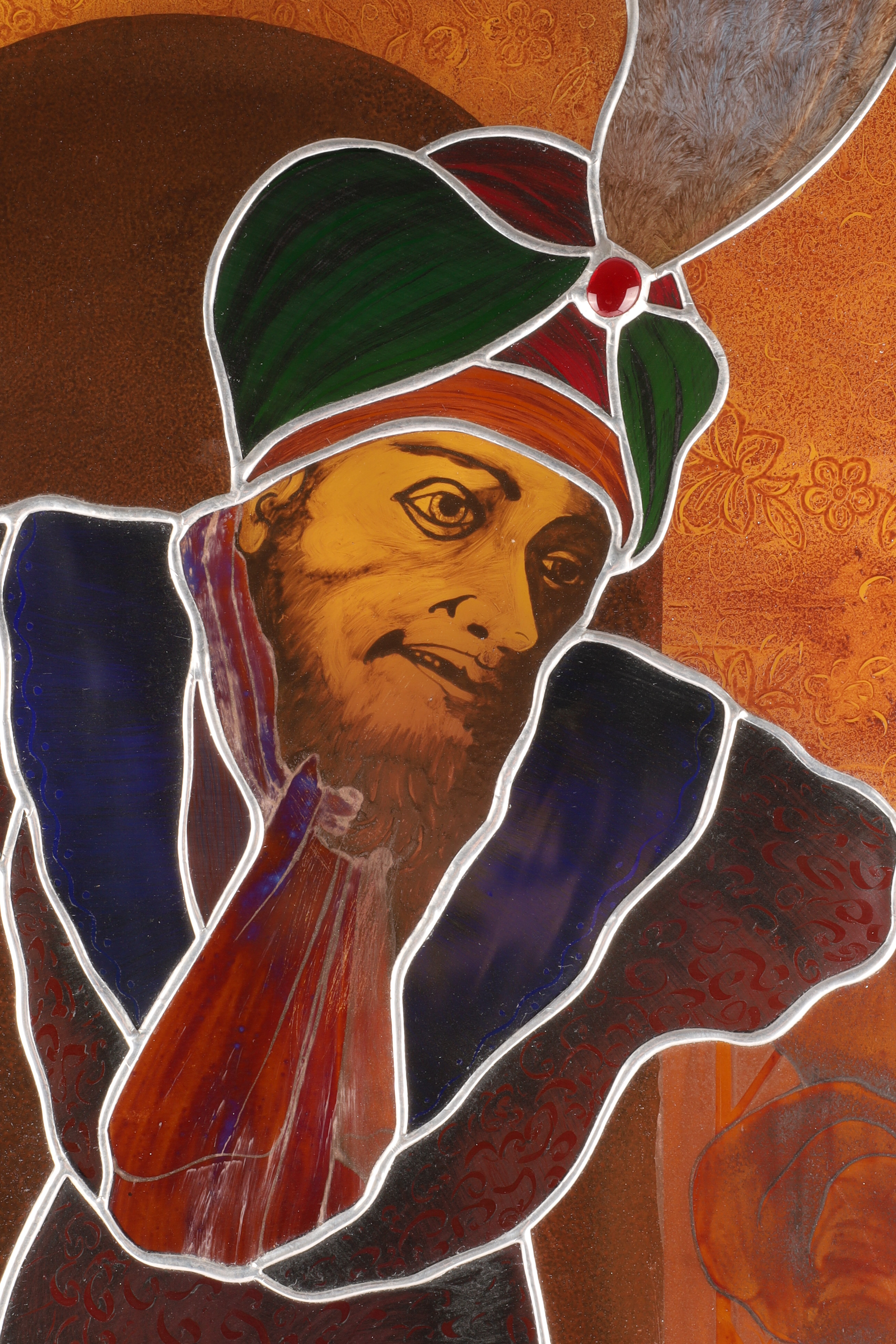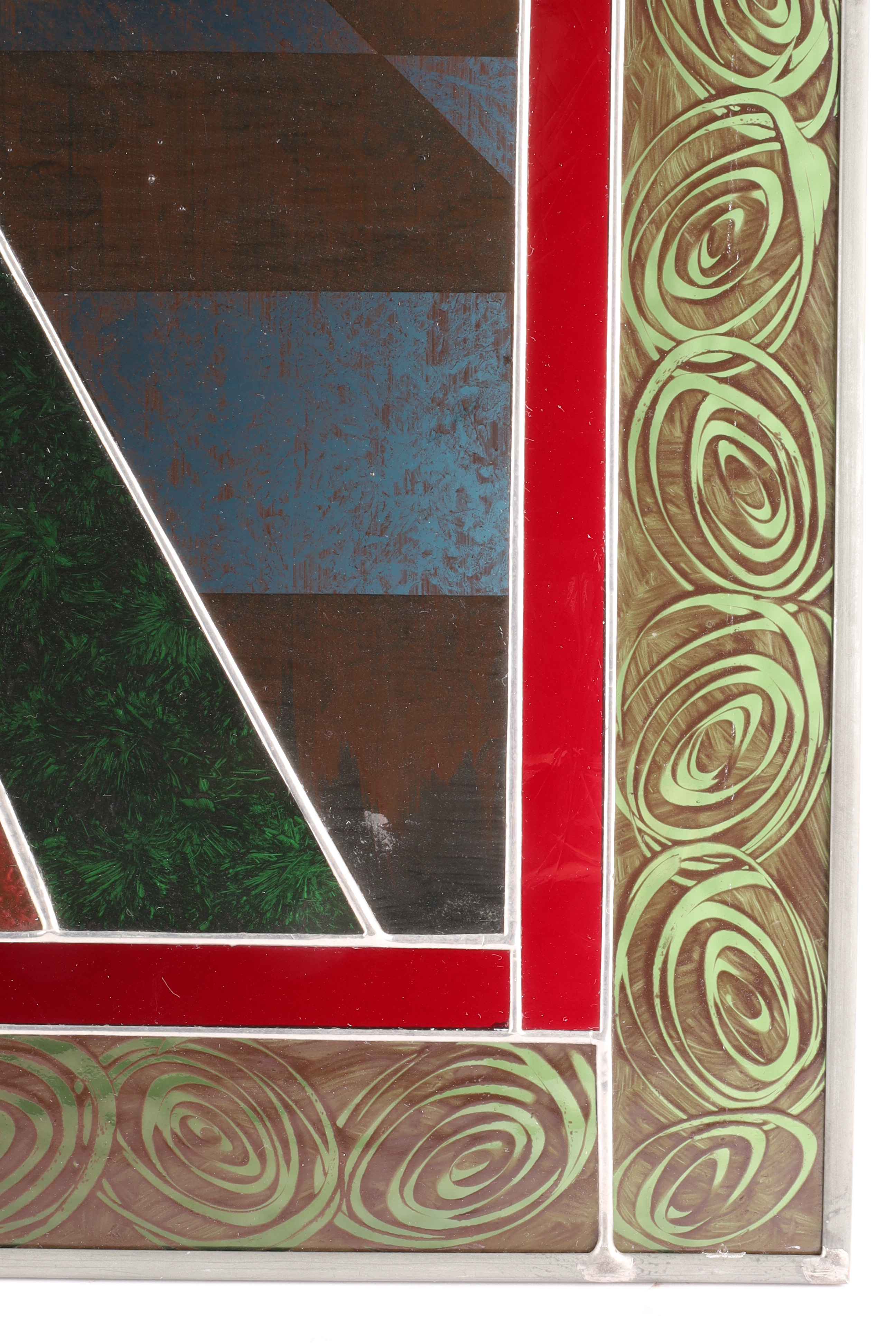 Painted and leaded stained glass with enamel details and gilt-embossed background; mounted within a decorative green glass border.