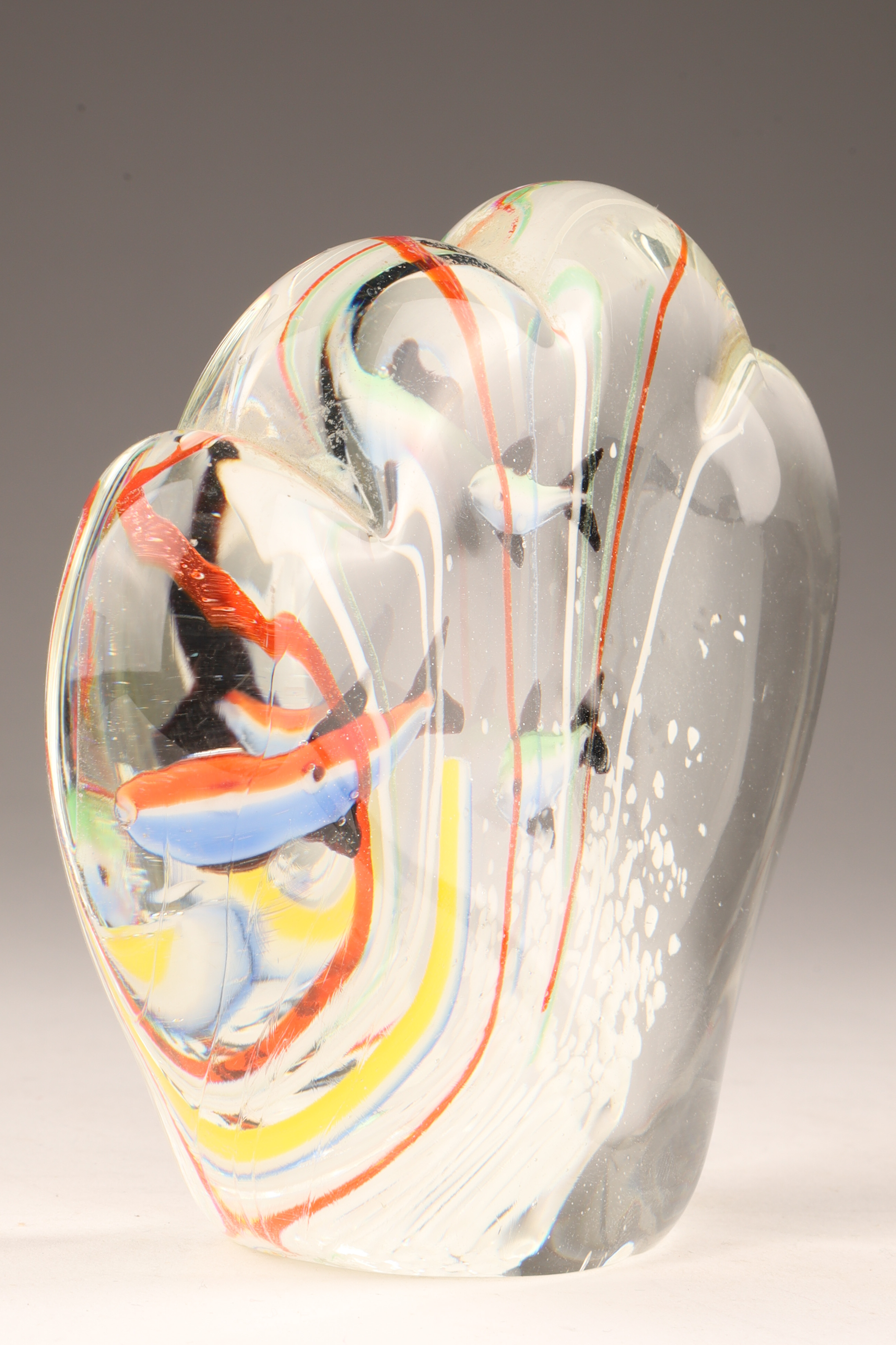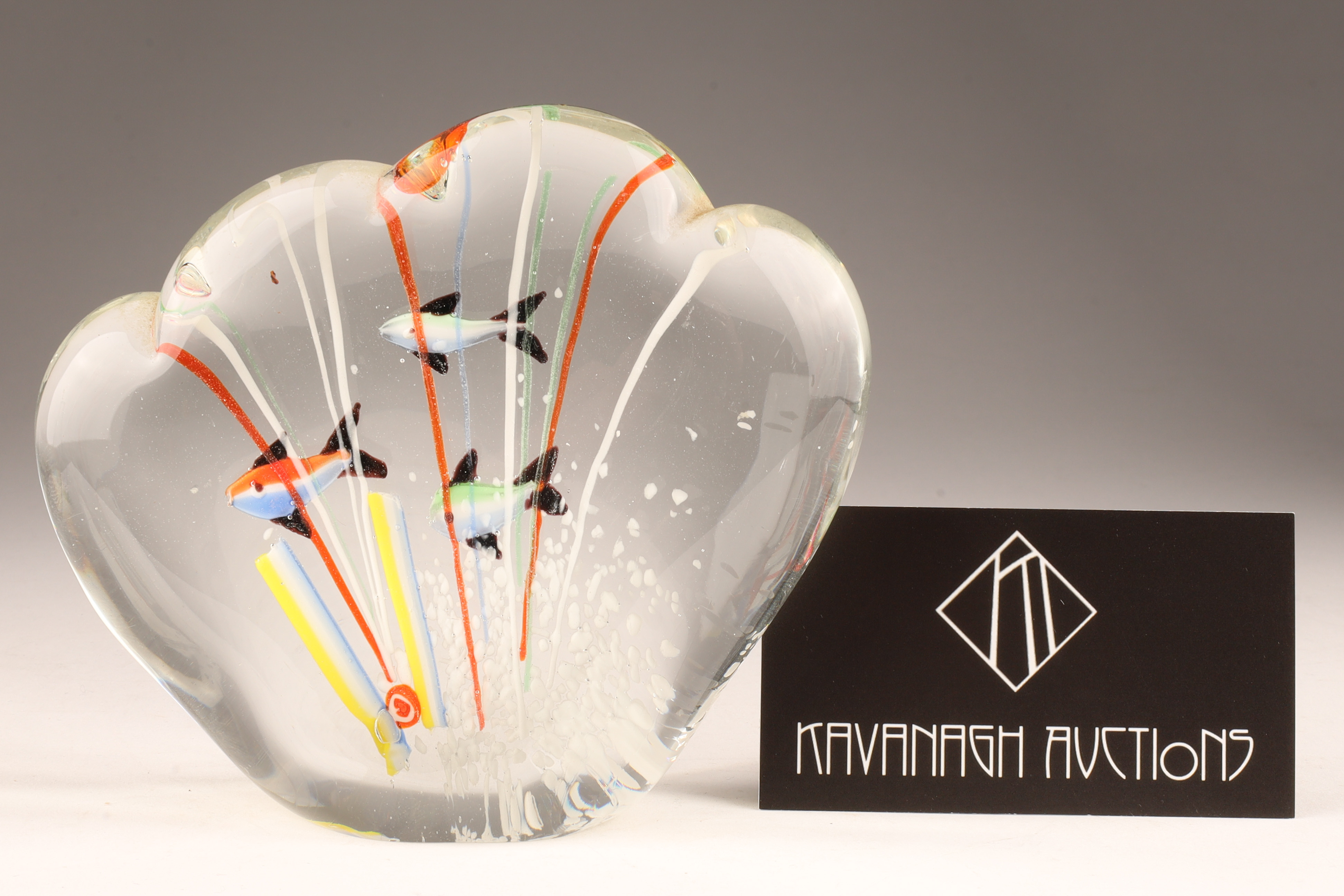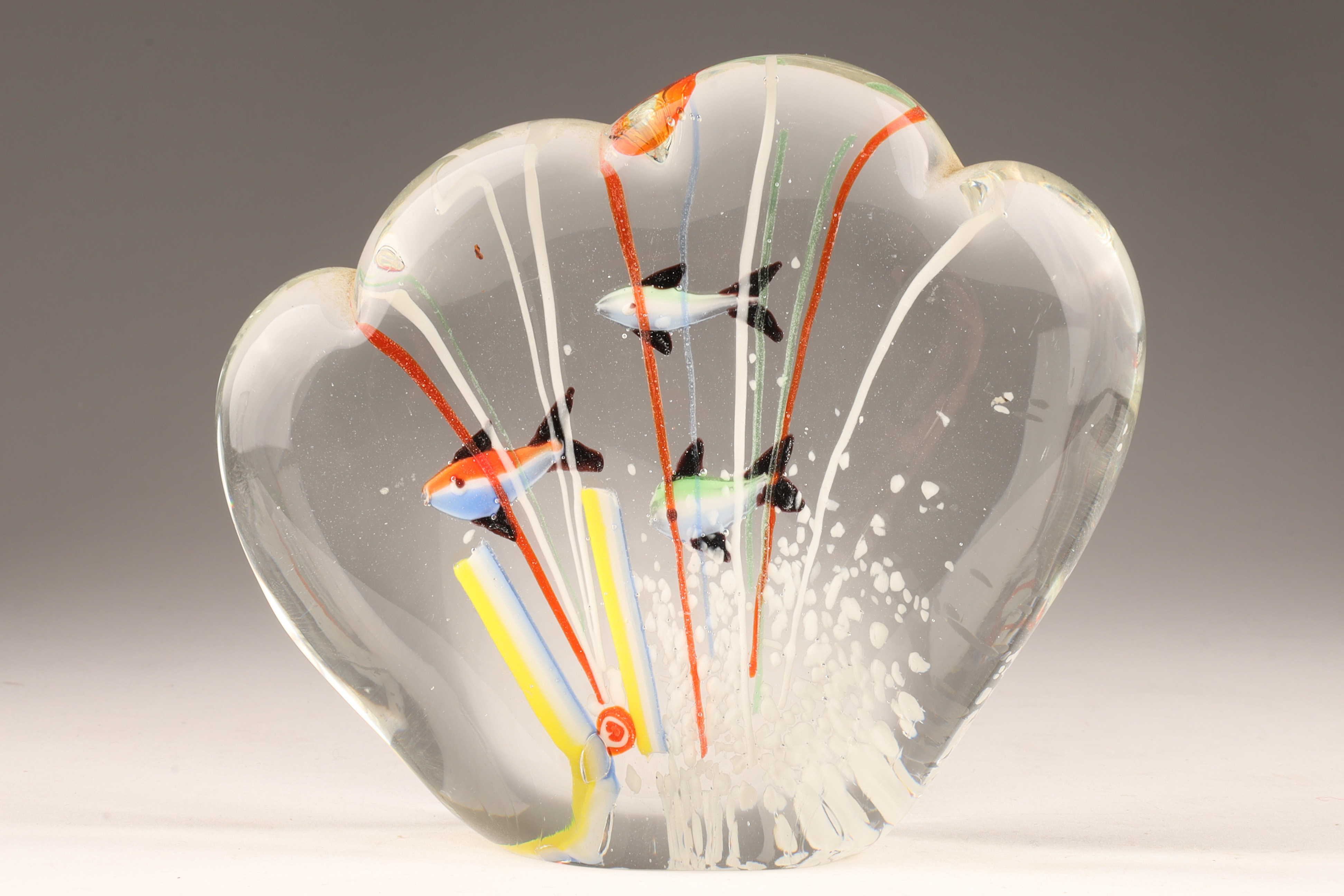 Vintage Murano art glass aquarium paperweight, shaped like a shell, with fish inside. Measuring 4.75 inches x 5.5 inches 1.75 inches.