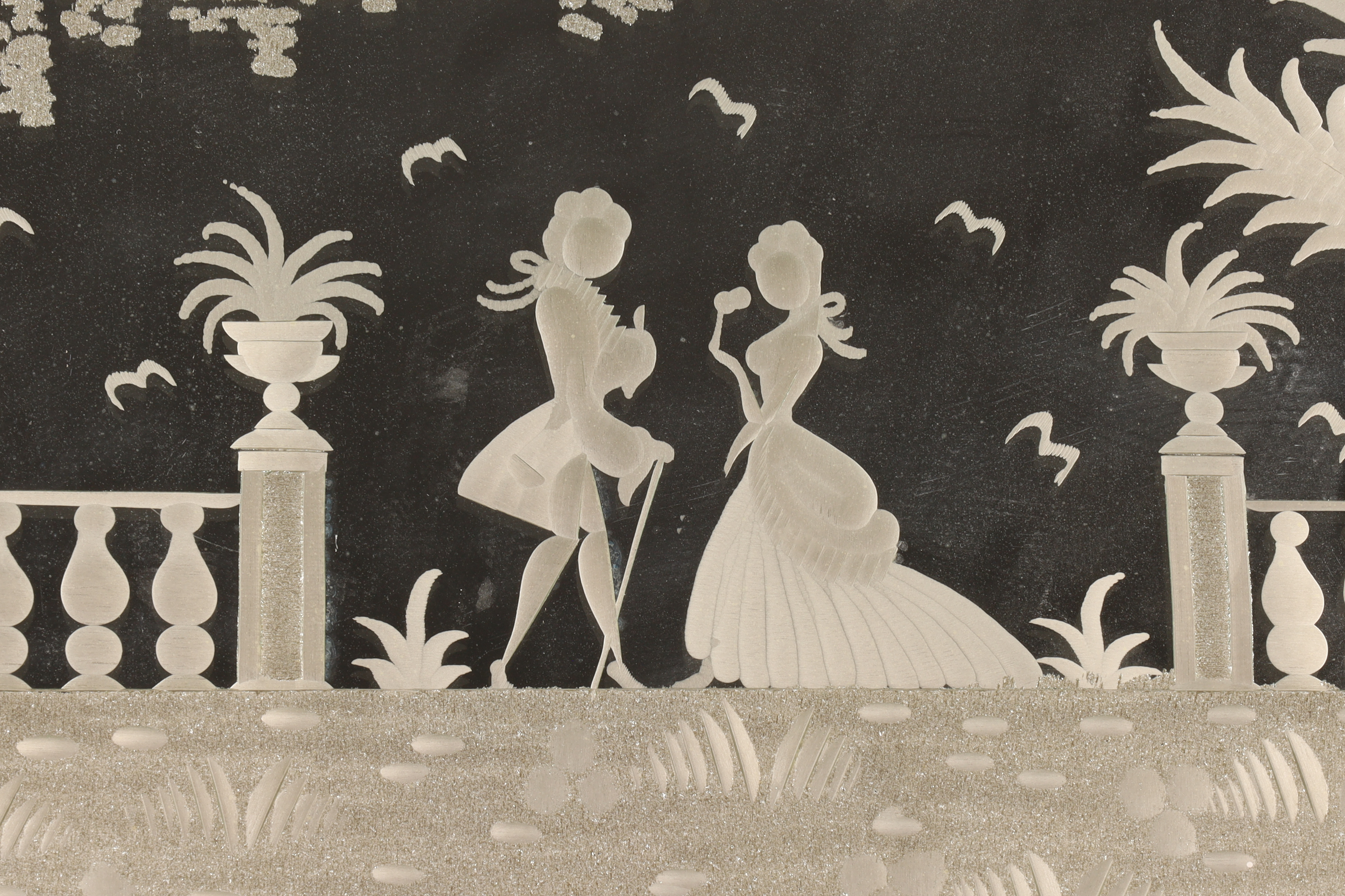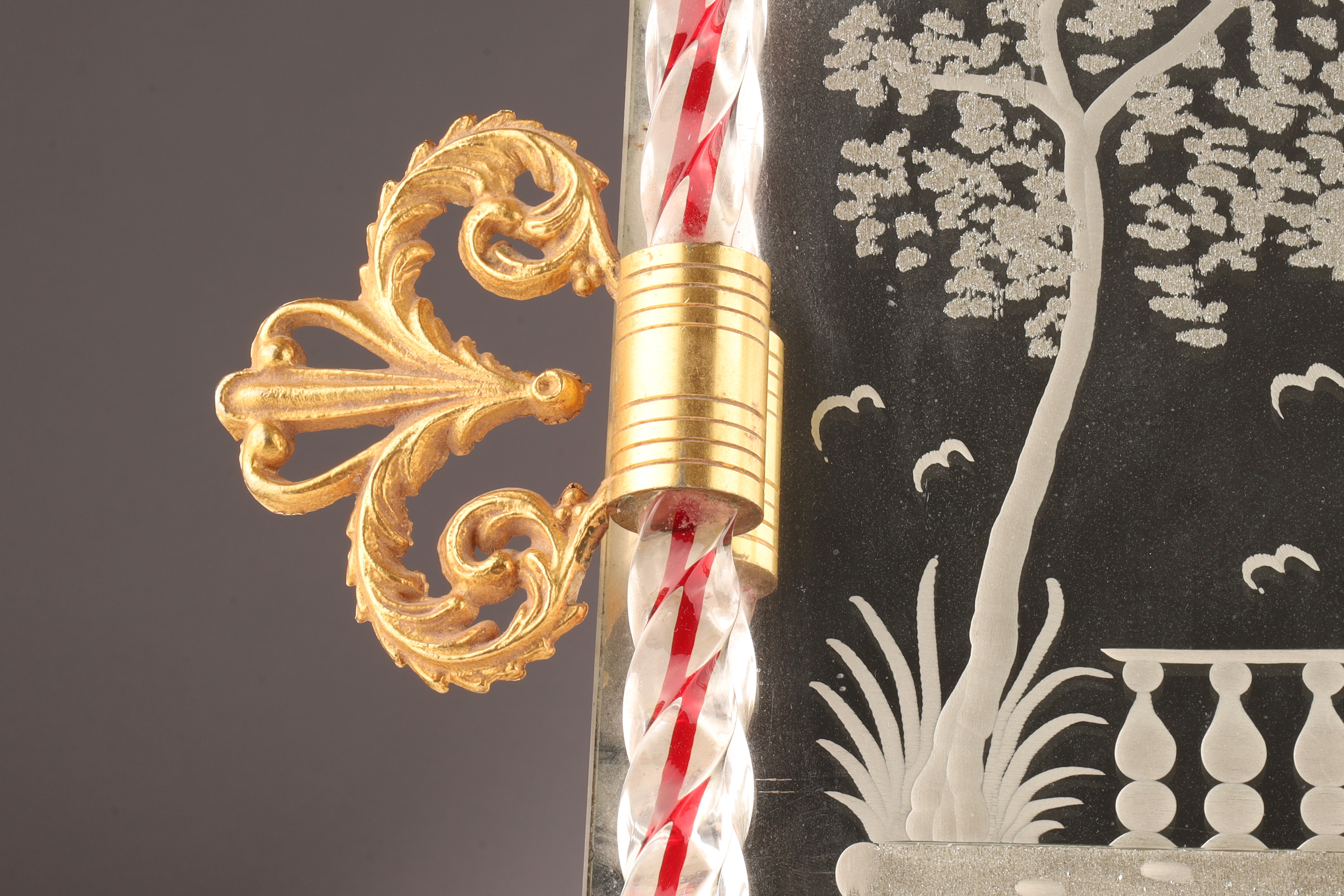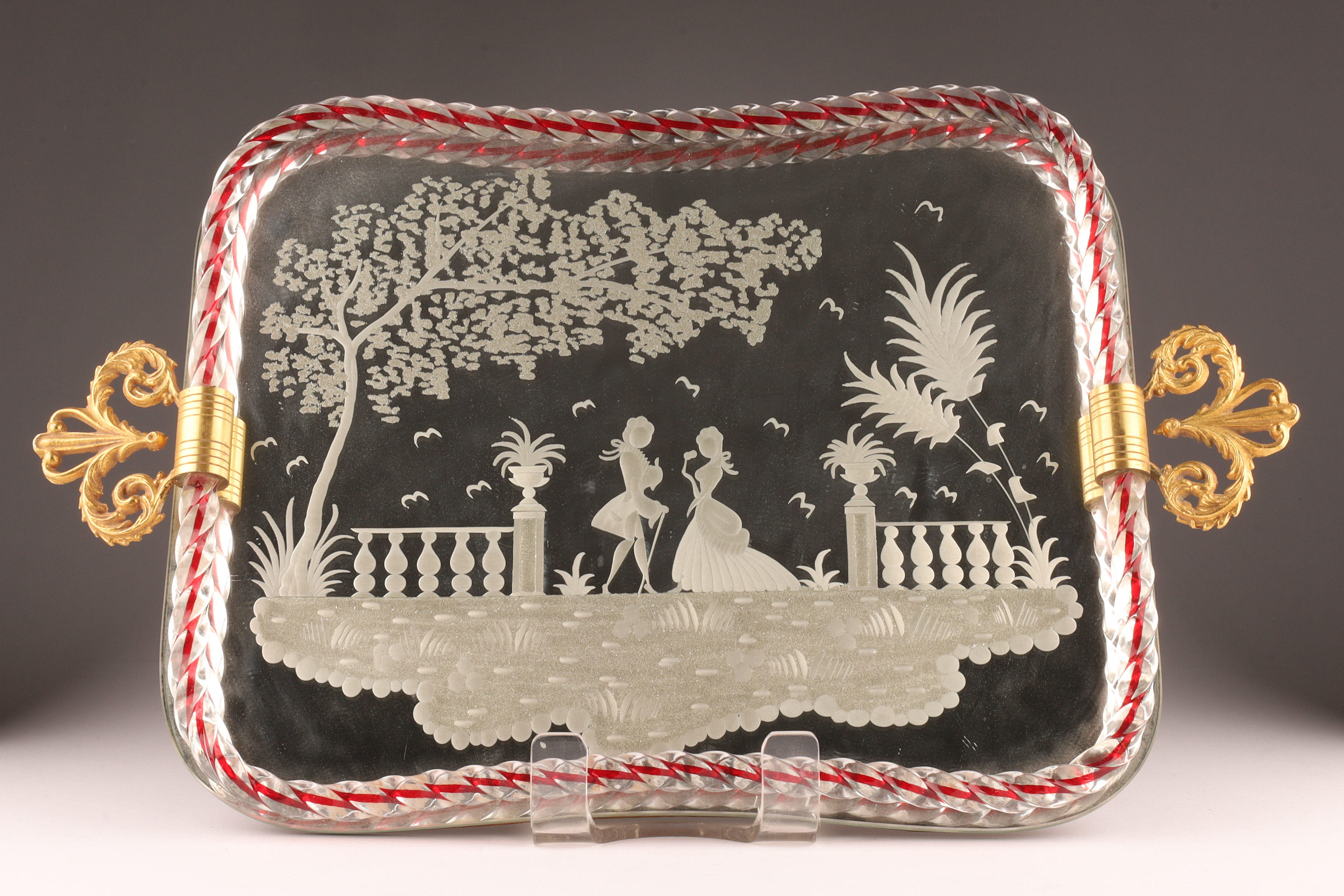 Mid Century Murano Salviati Mirrored and Engraved Serving Plate, engraved courtship scene with gold handles. Measuring 20.5 inches L x 1.25 H x 13 deep.