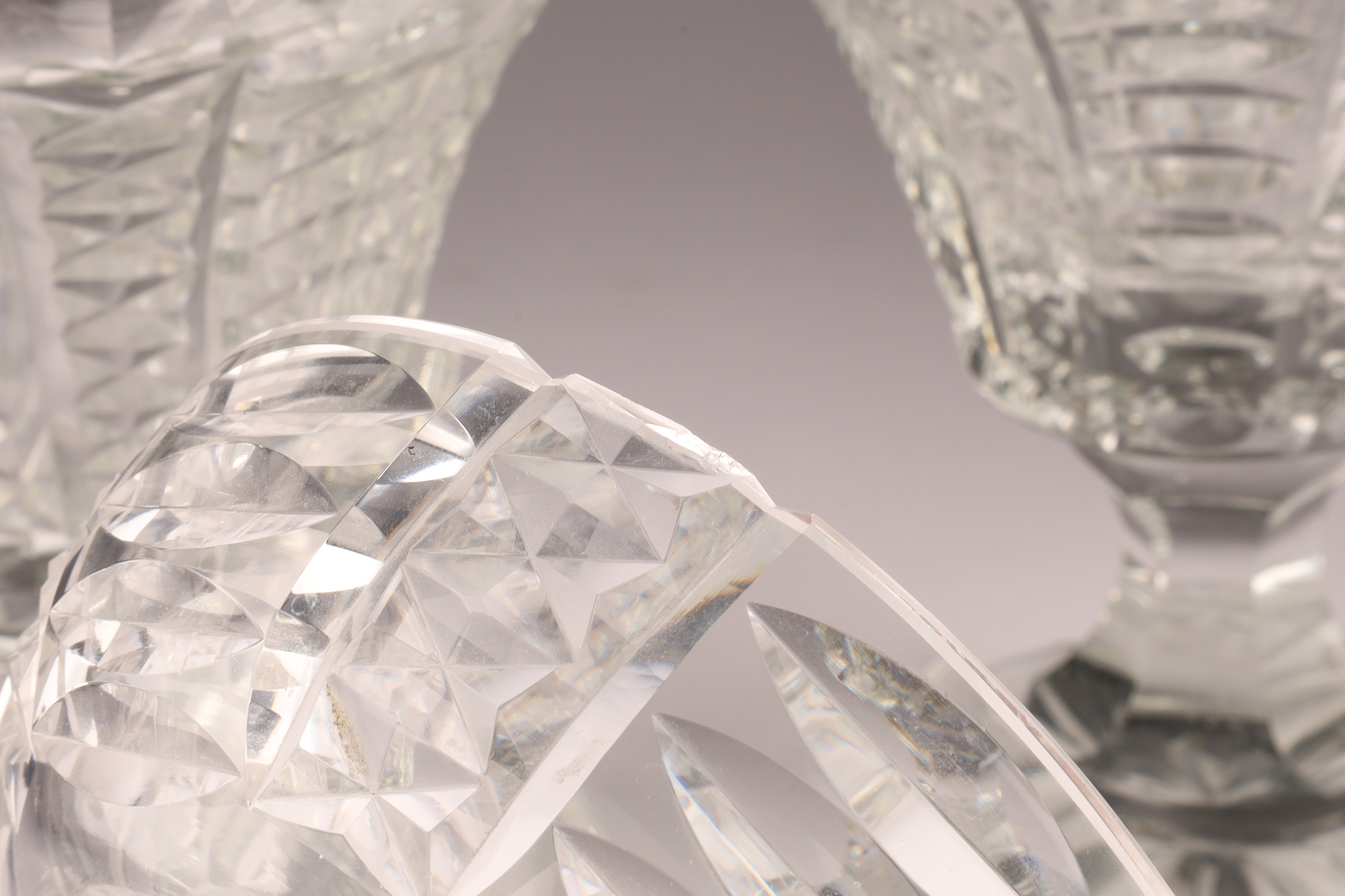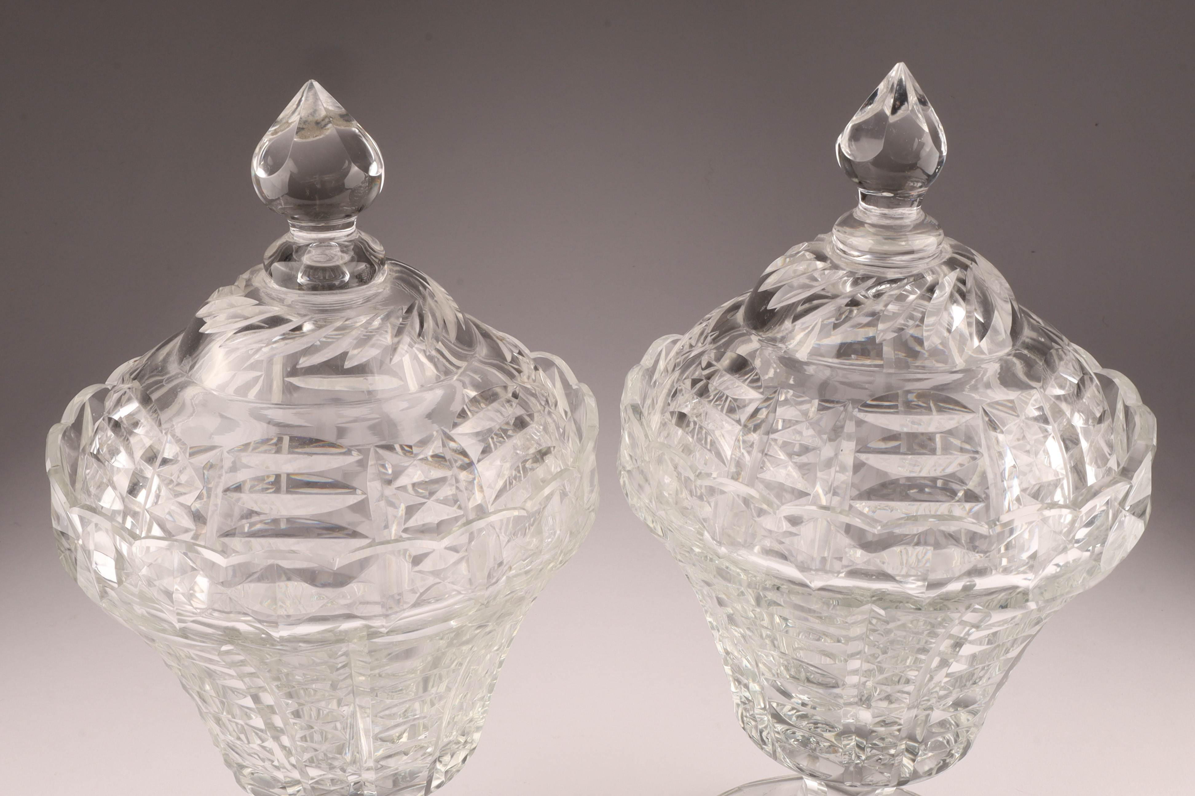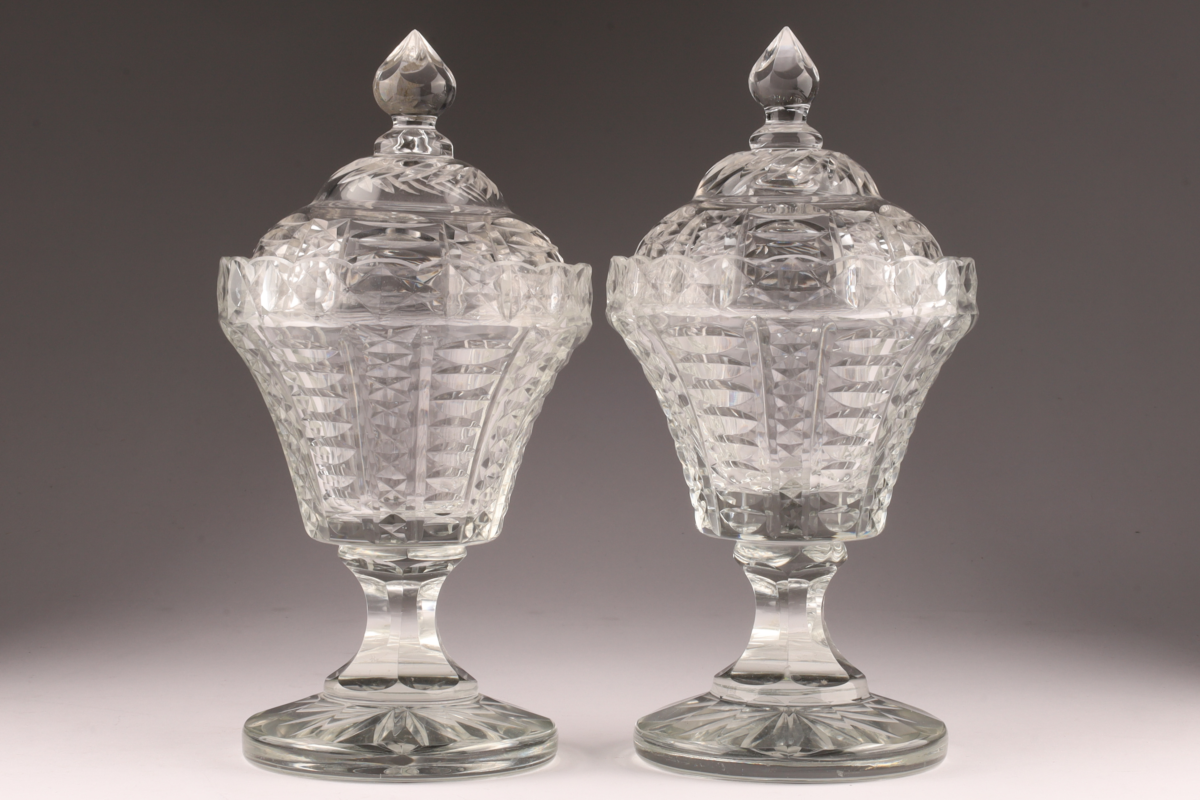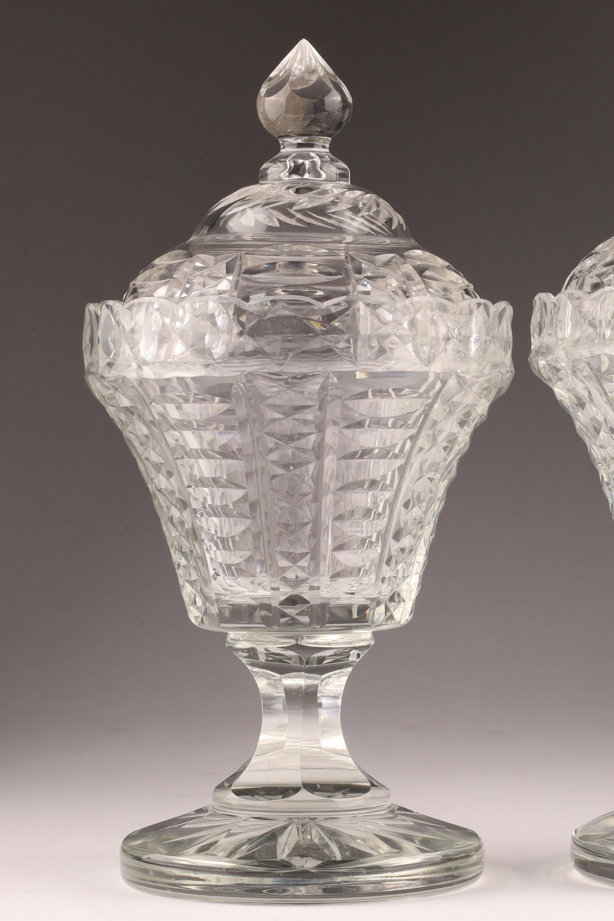 An antique pair of cut crystal sweetmeat urns or conserve jars. 10.5 inches H 5 W. Some Small fleabites as shown.