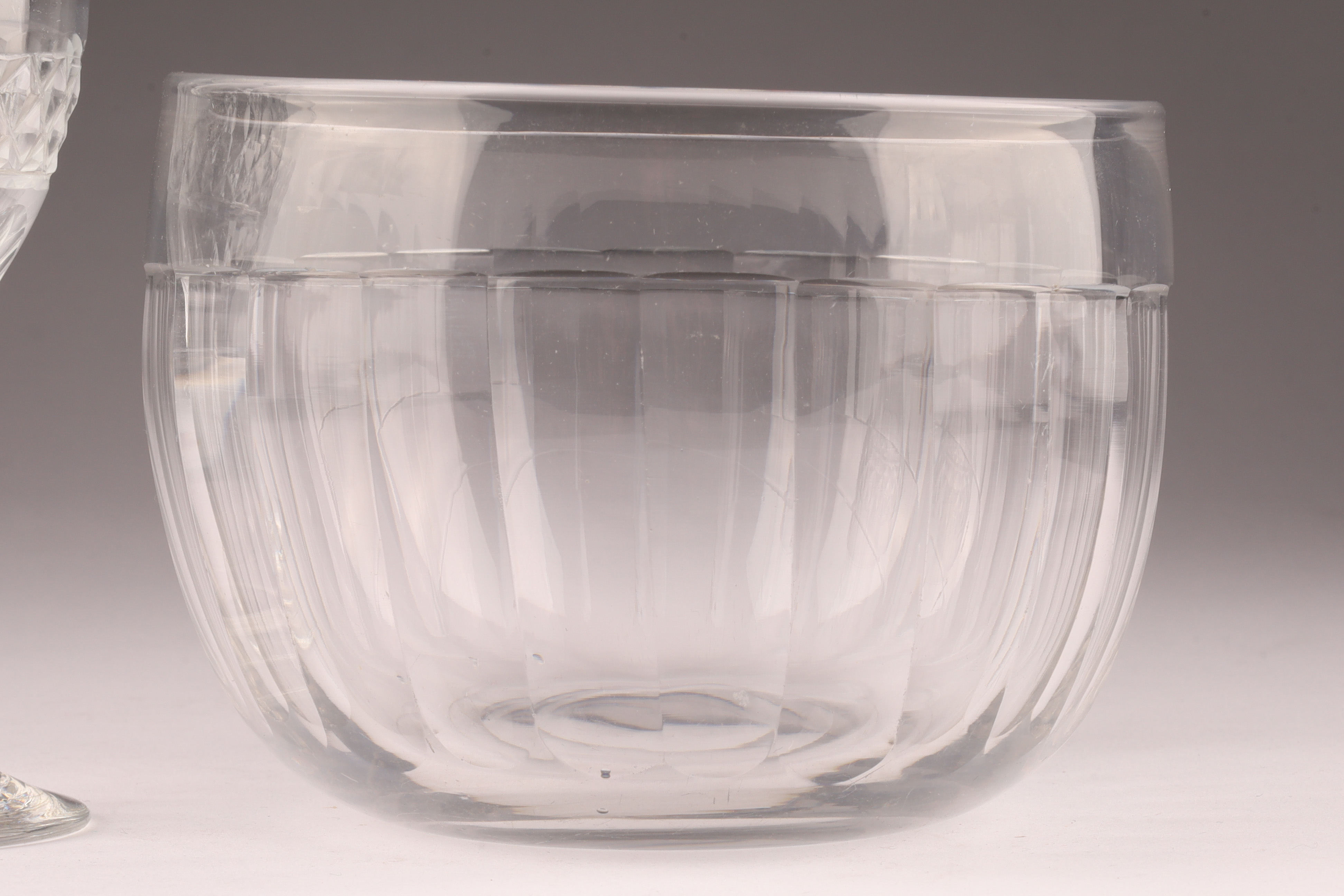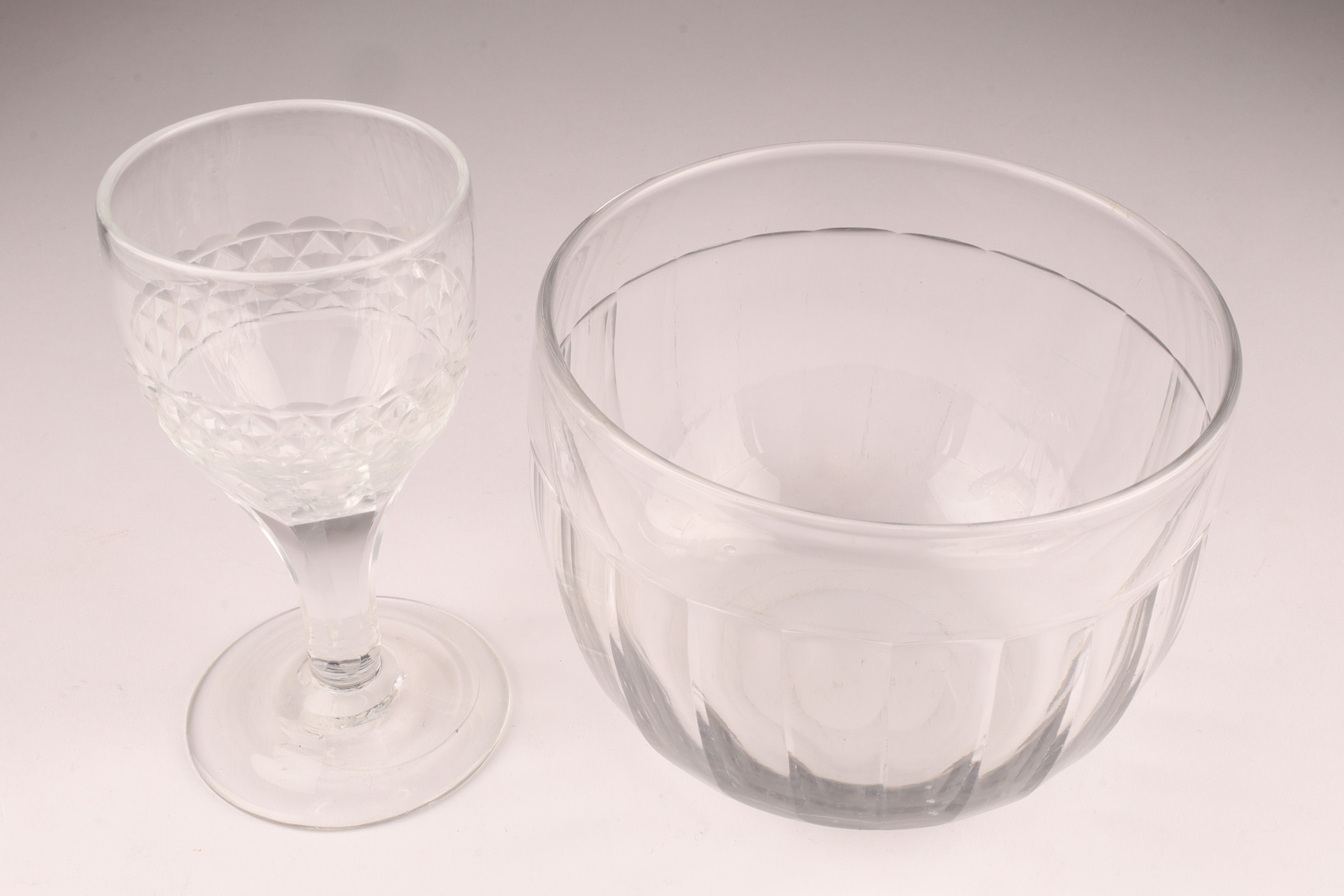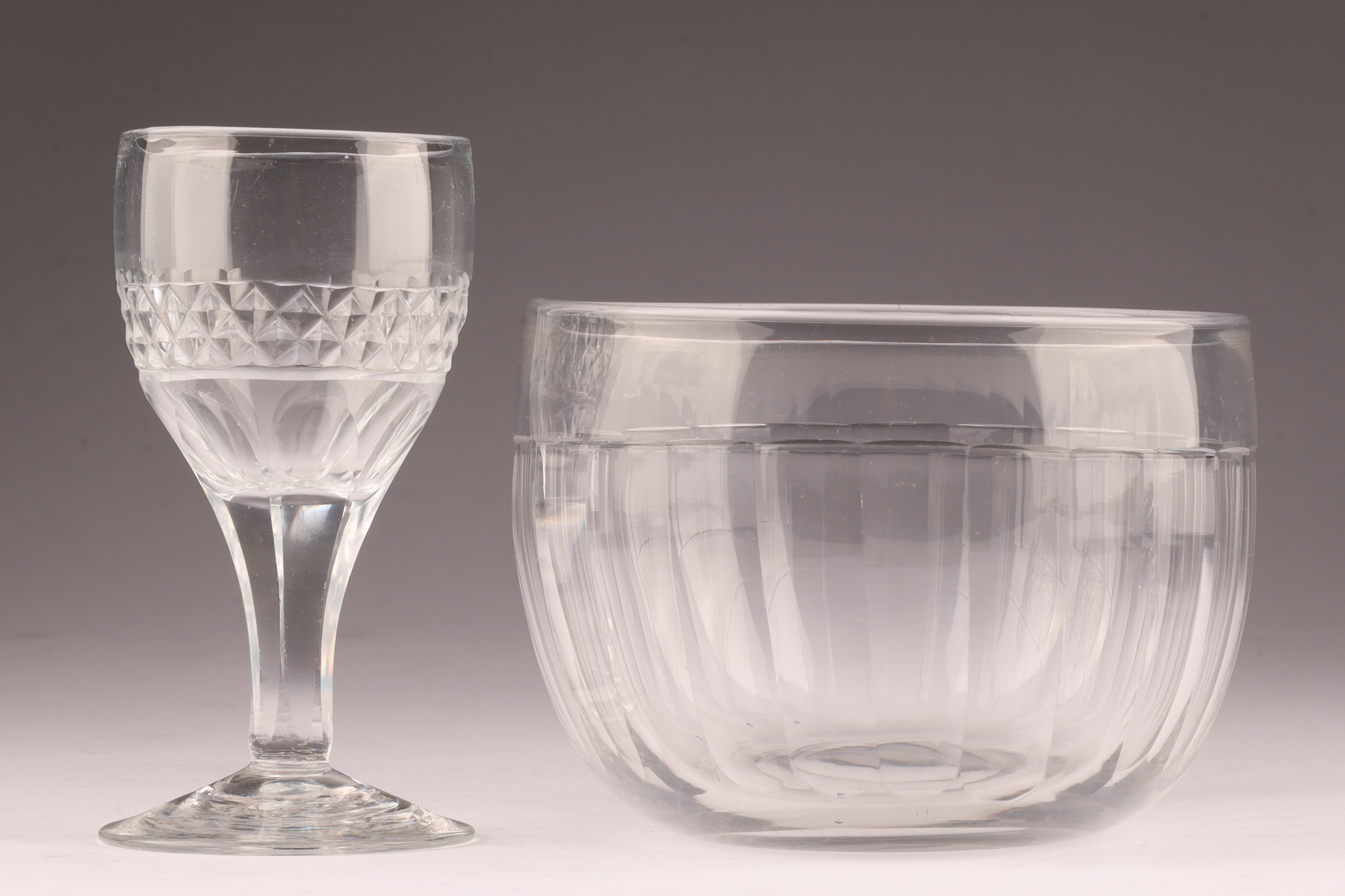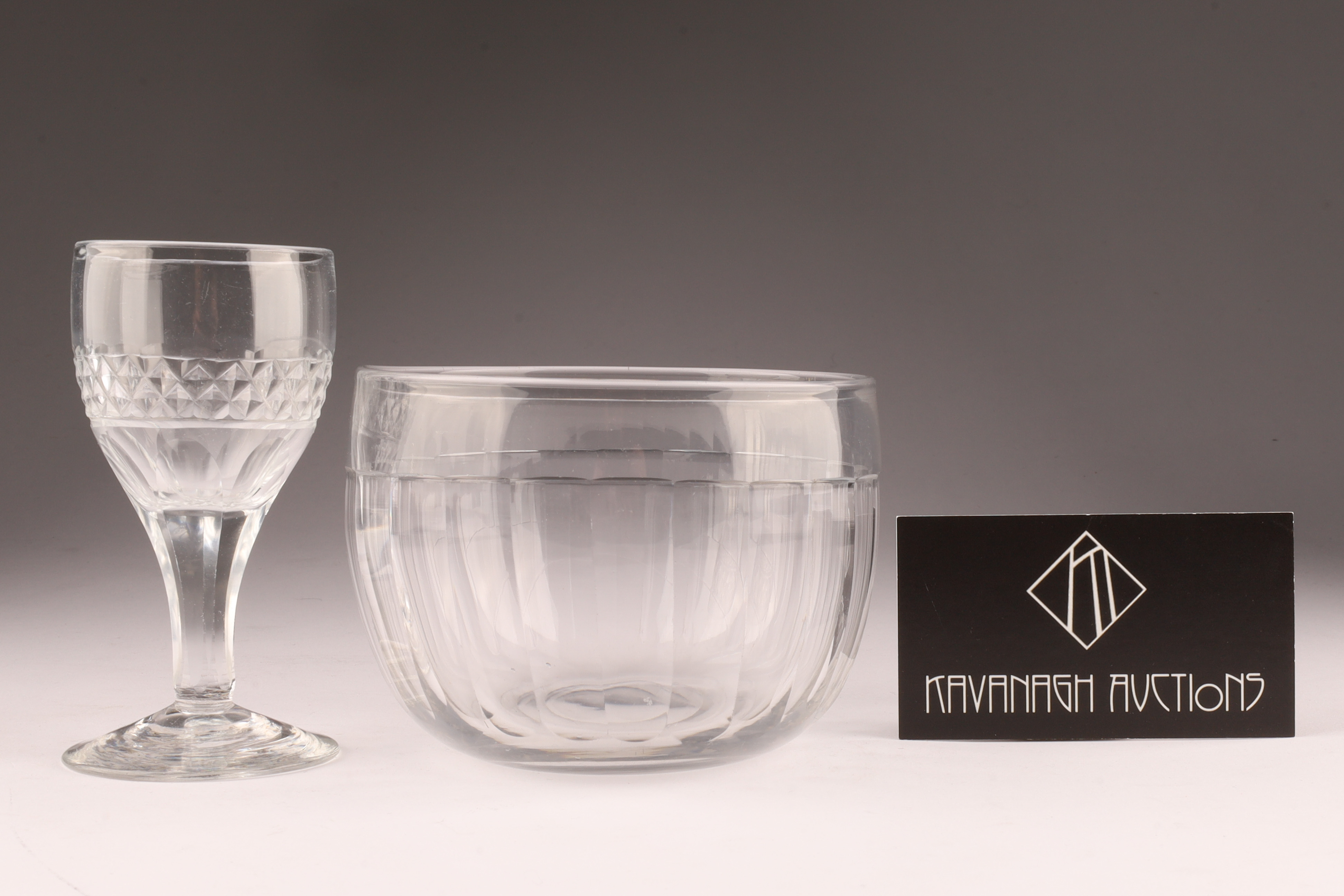 Georgian glass wine rinser c.1820s with Regency wine glass c.1840. Rinser measures 4.5 inches diameter x 3.25, glass measures 4.5 inches x 2.25 W.