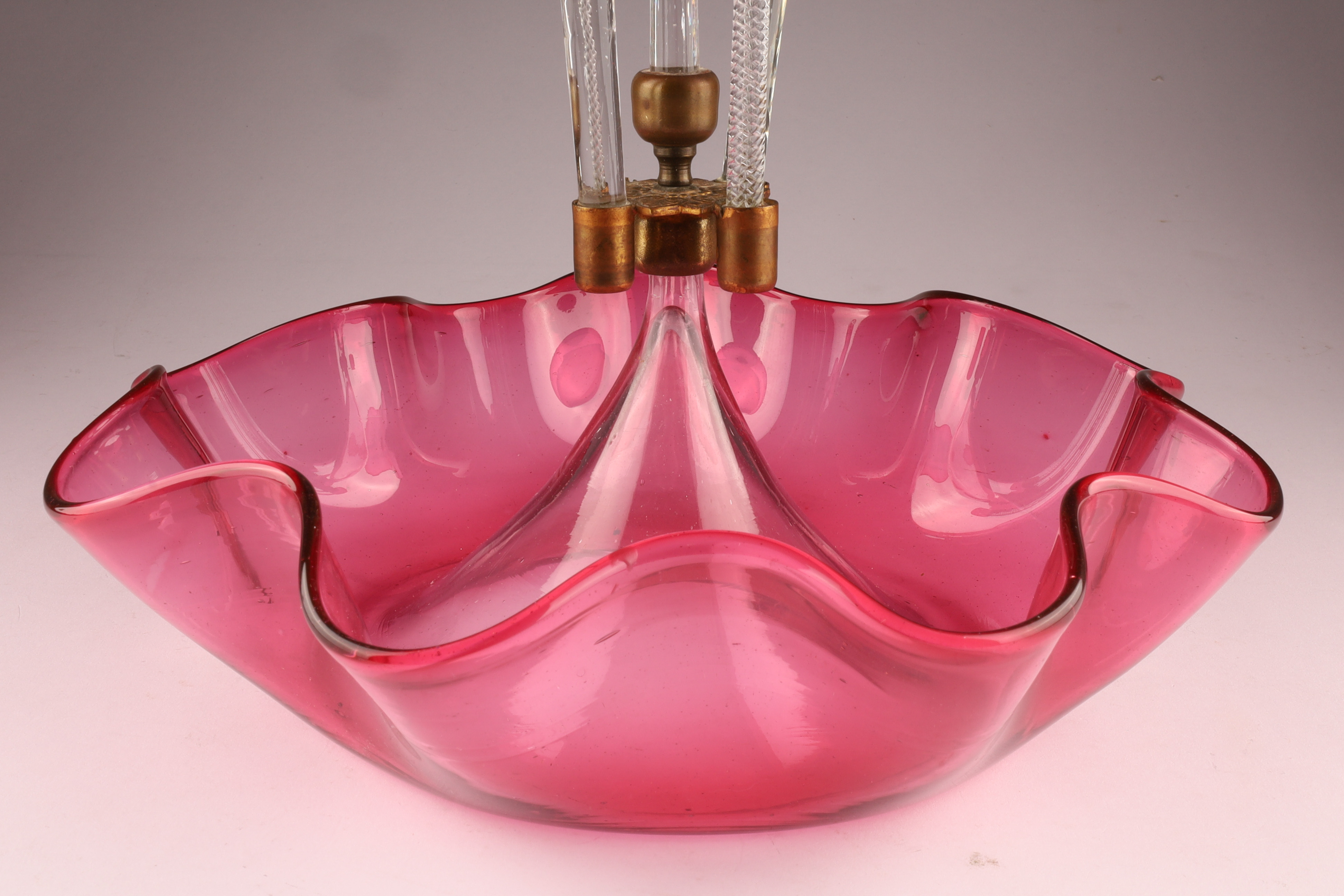 Large antique Victorian cranberry glass epergne having one tall trumpet to the centre, two smaller trumpet shaped flower holders and two hanging baskets on transparent shaped canes standing on a circular shaped wavy edge dish. Measuring 22 inches H x 12 W.