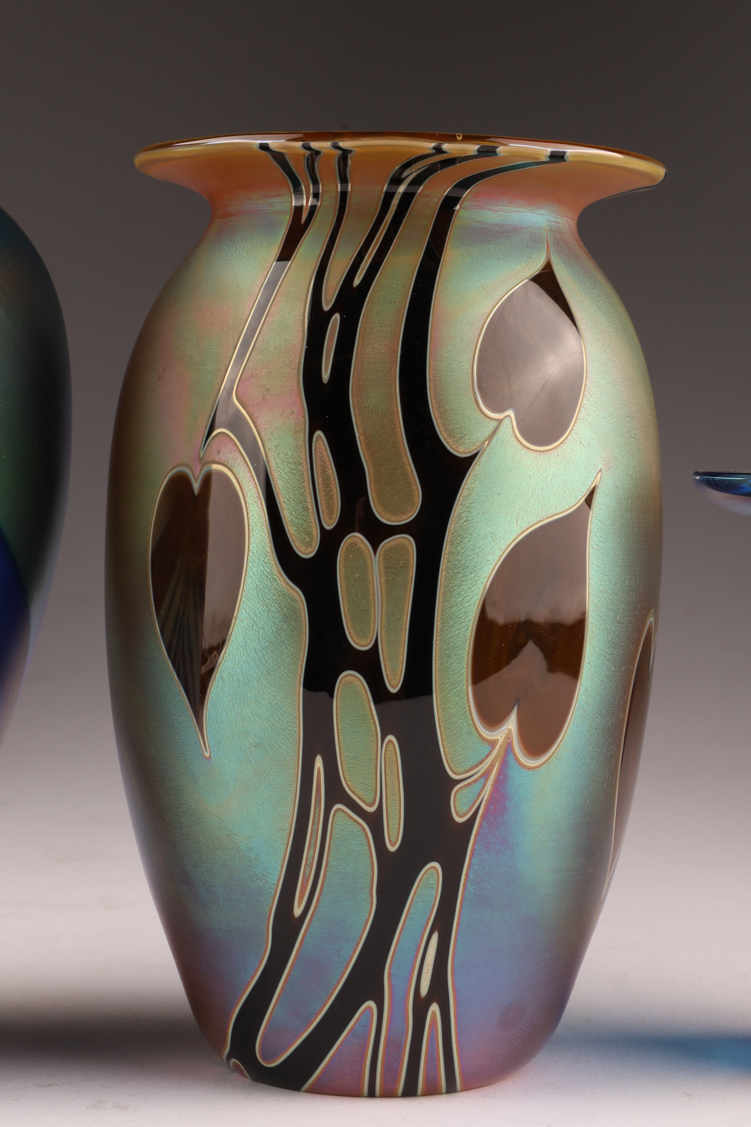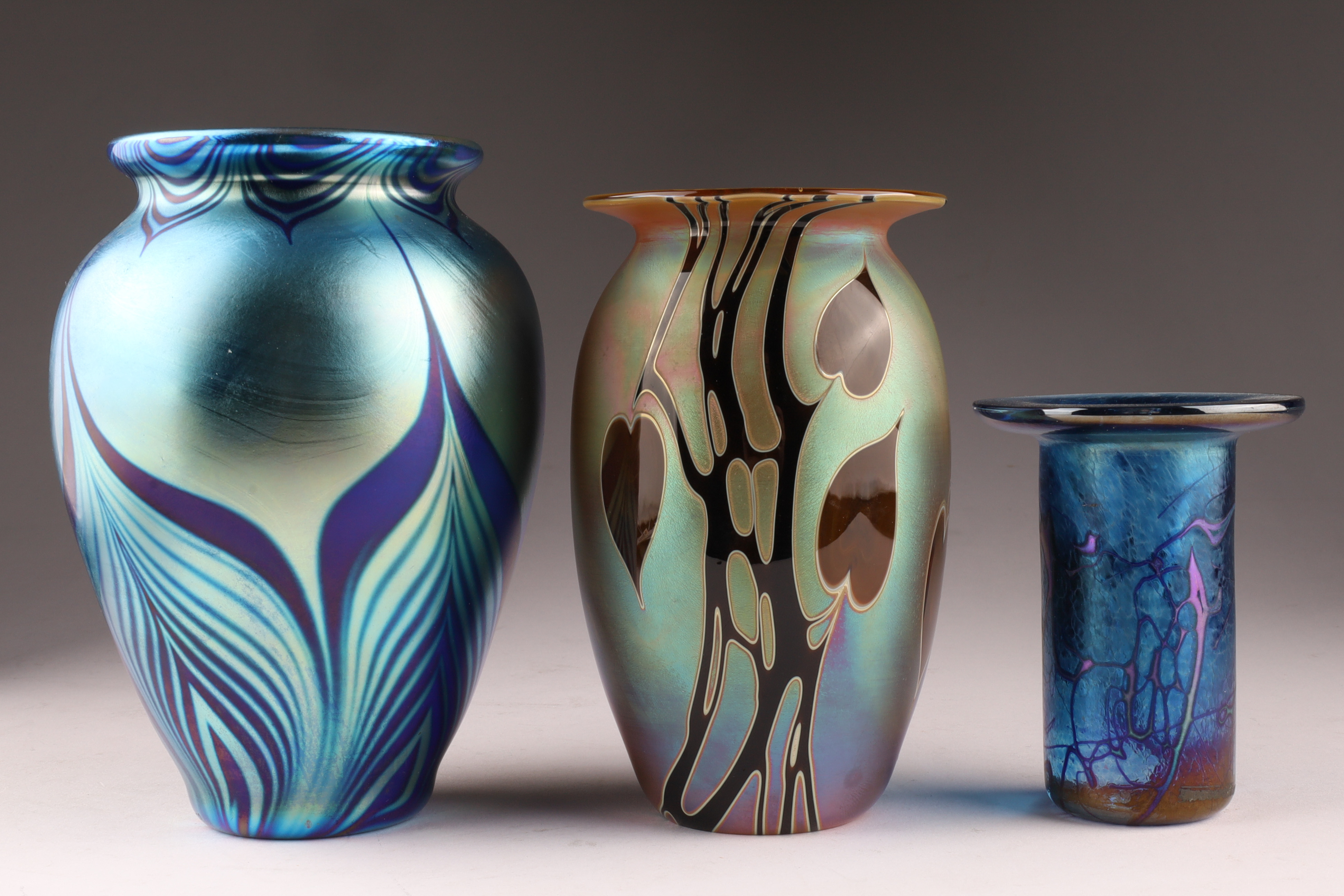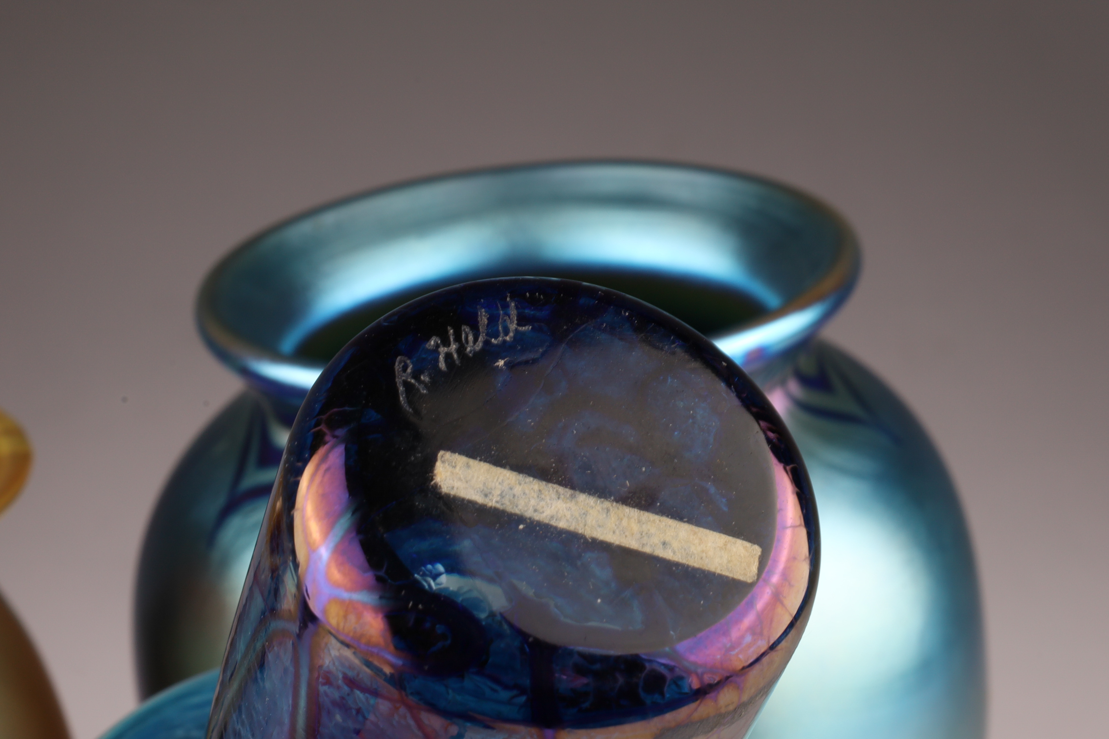 Lot of 3 Robert Held (American/Canadian, b. 1943) Art Glass Vases. Smallest signed on base, measures 3.25 inches H x 2.5 W, pulled feather vase signed on side, measures 5.5 inches H x 4 W, gold aurene vase measures vase 5 inches H, no apparent signature.