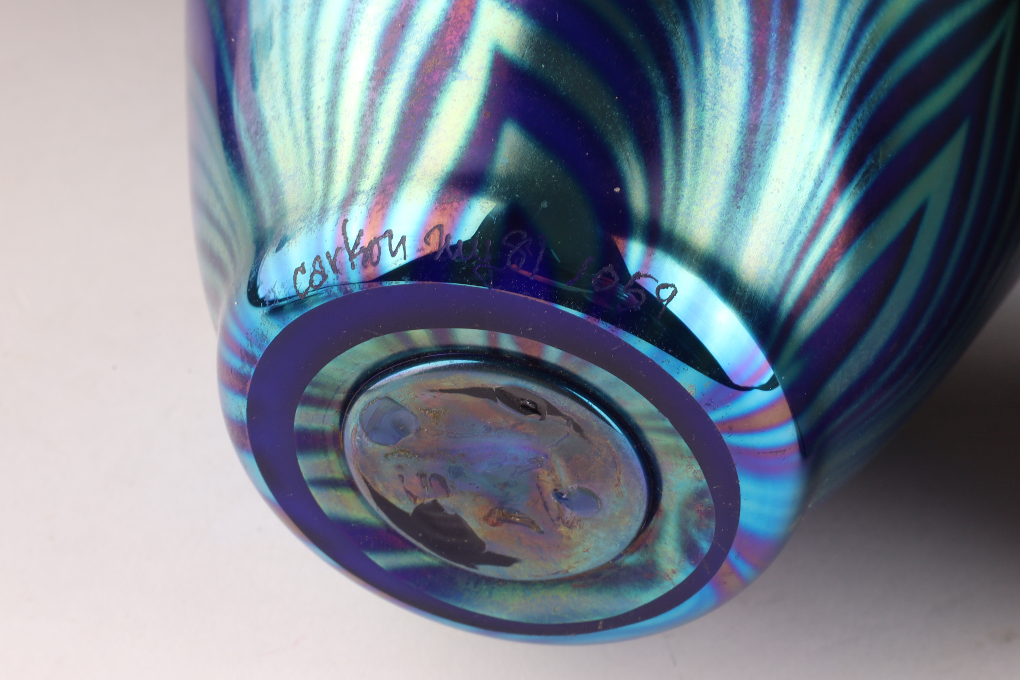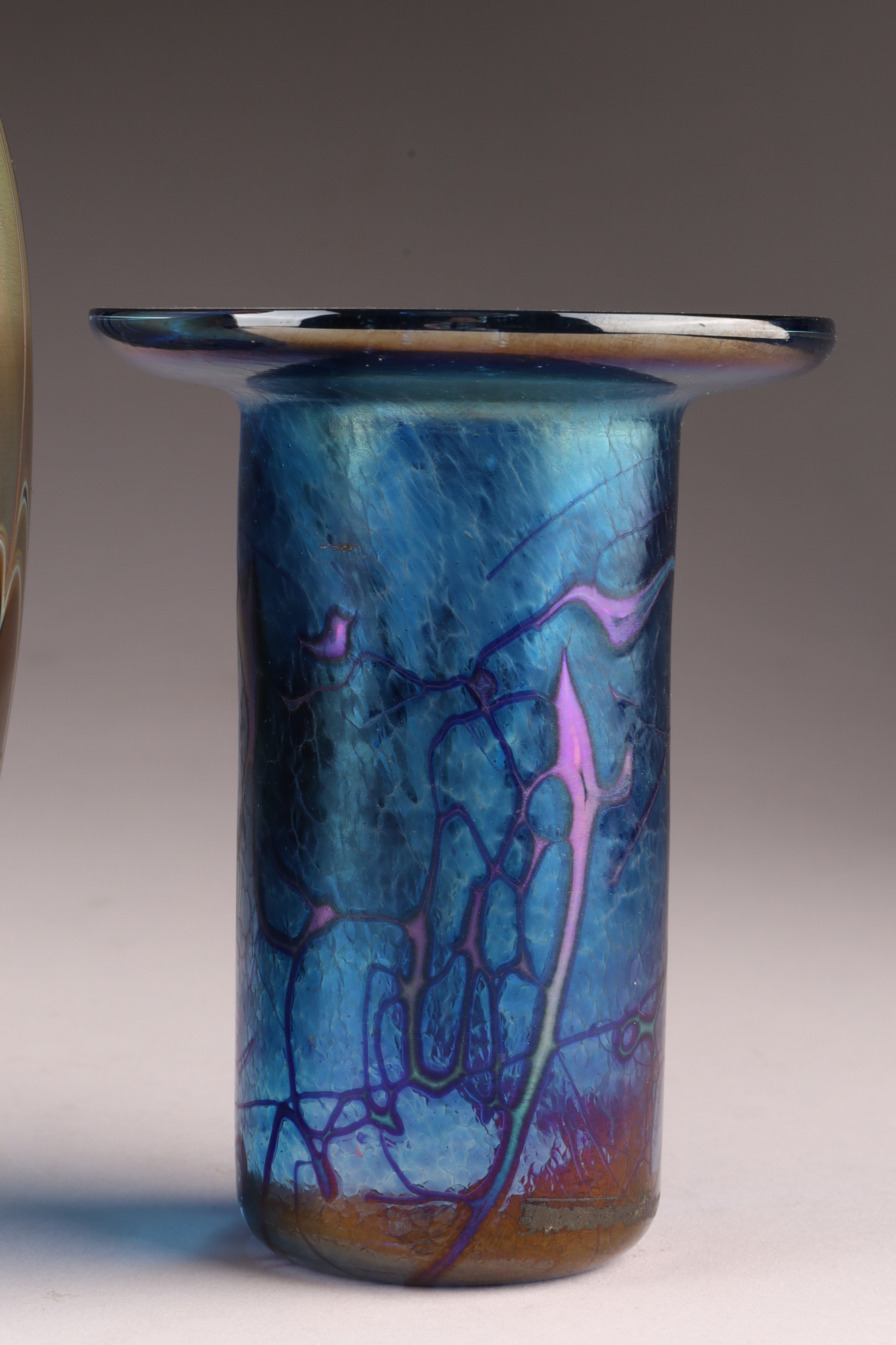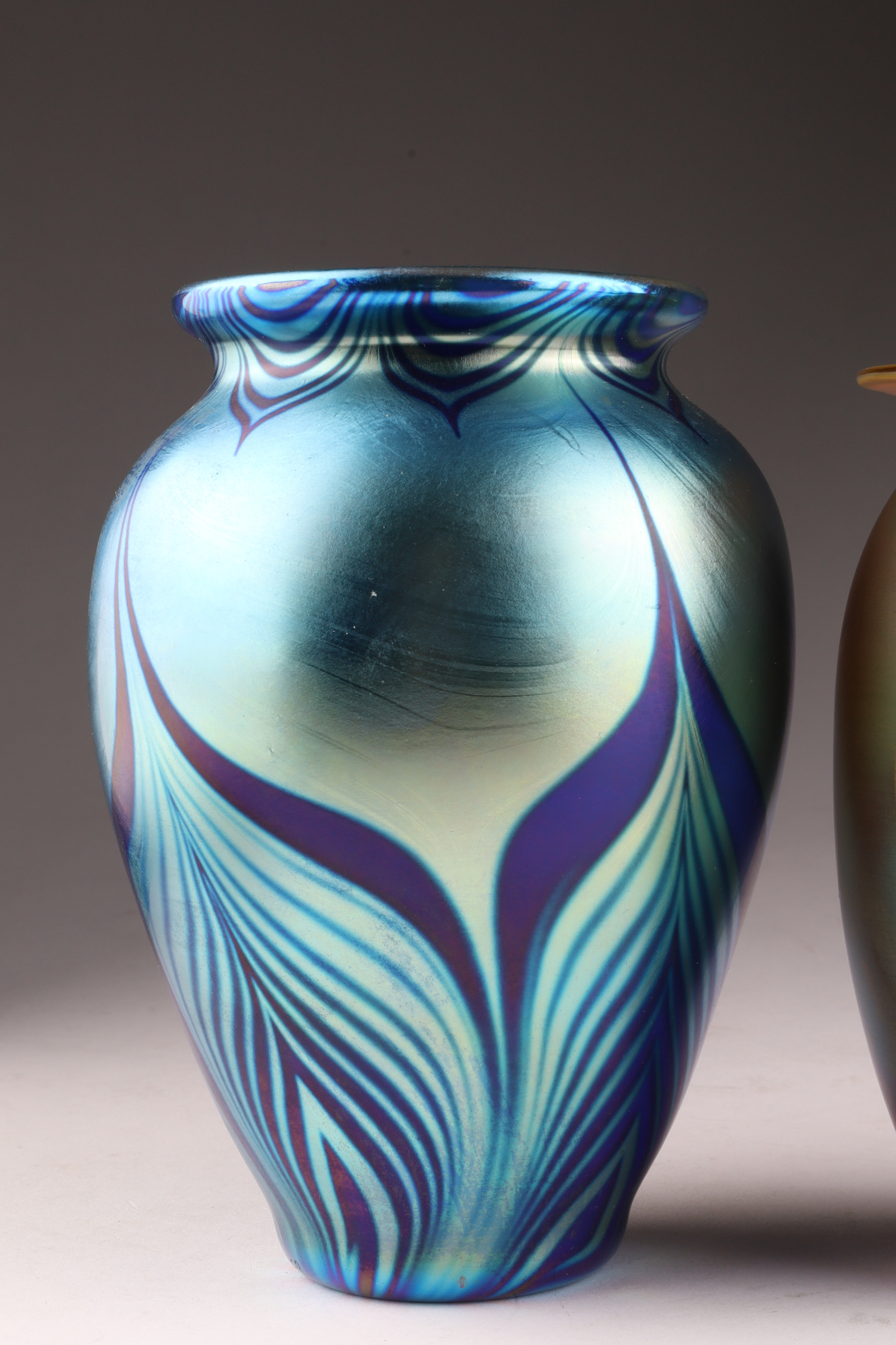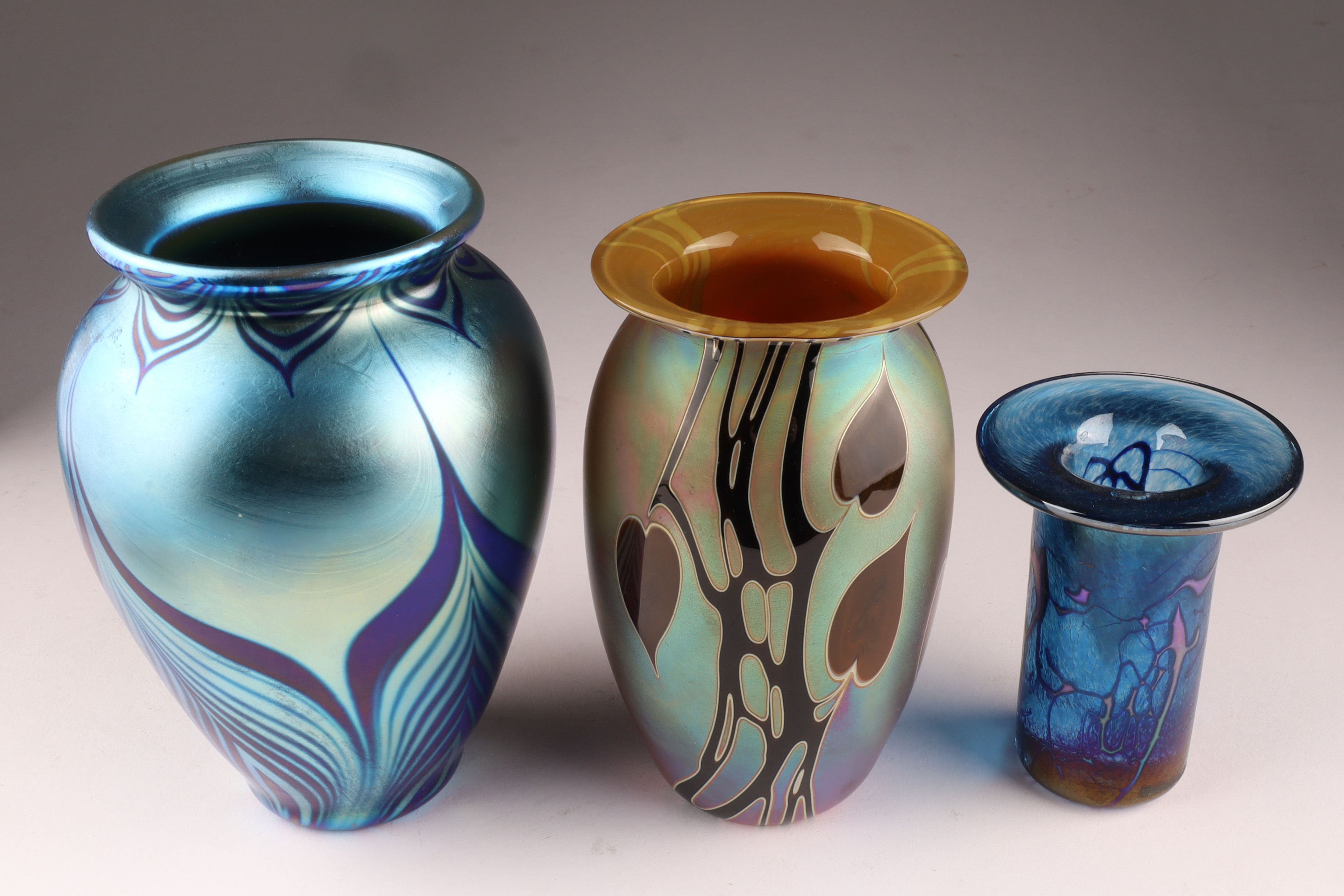 Lot of 3 Robert Held (American/Canadian, b. 1943) Art Glass Vases. Smallest signed on base, measures 3.25 inches H x 2.5 W, pulled feather vase signed on side, measures 5.5 inches H x 4 W, gold aurene vase measures vase 5 inches H, no apparent signature.