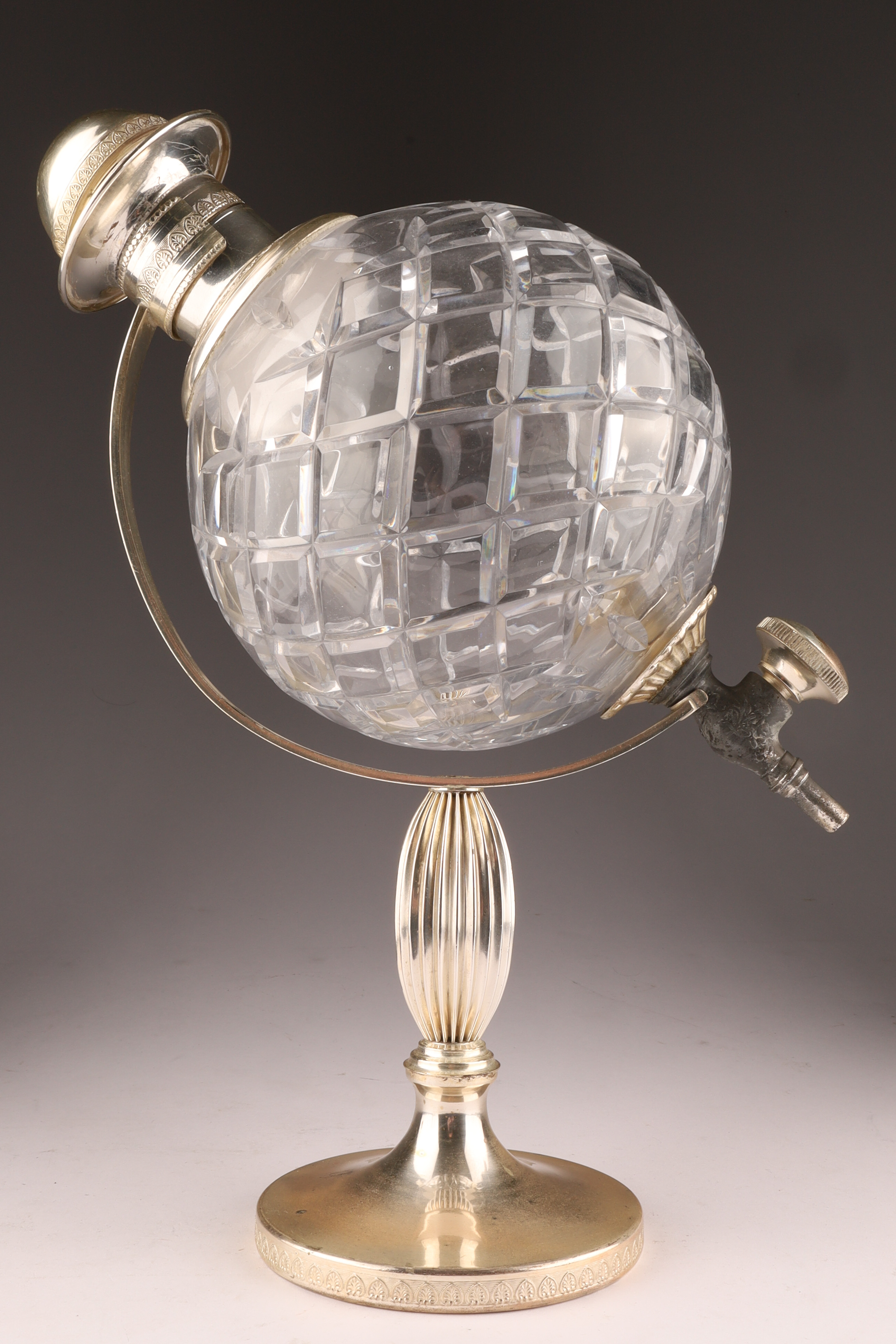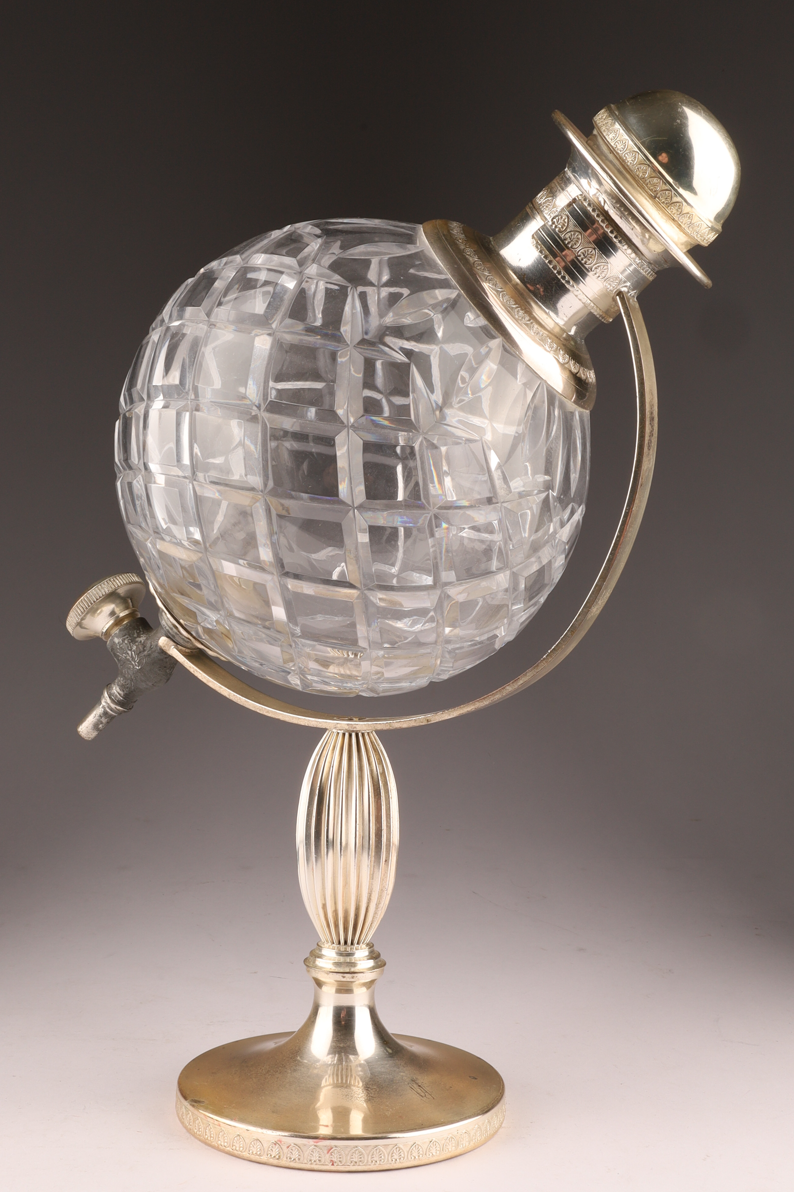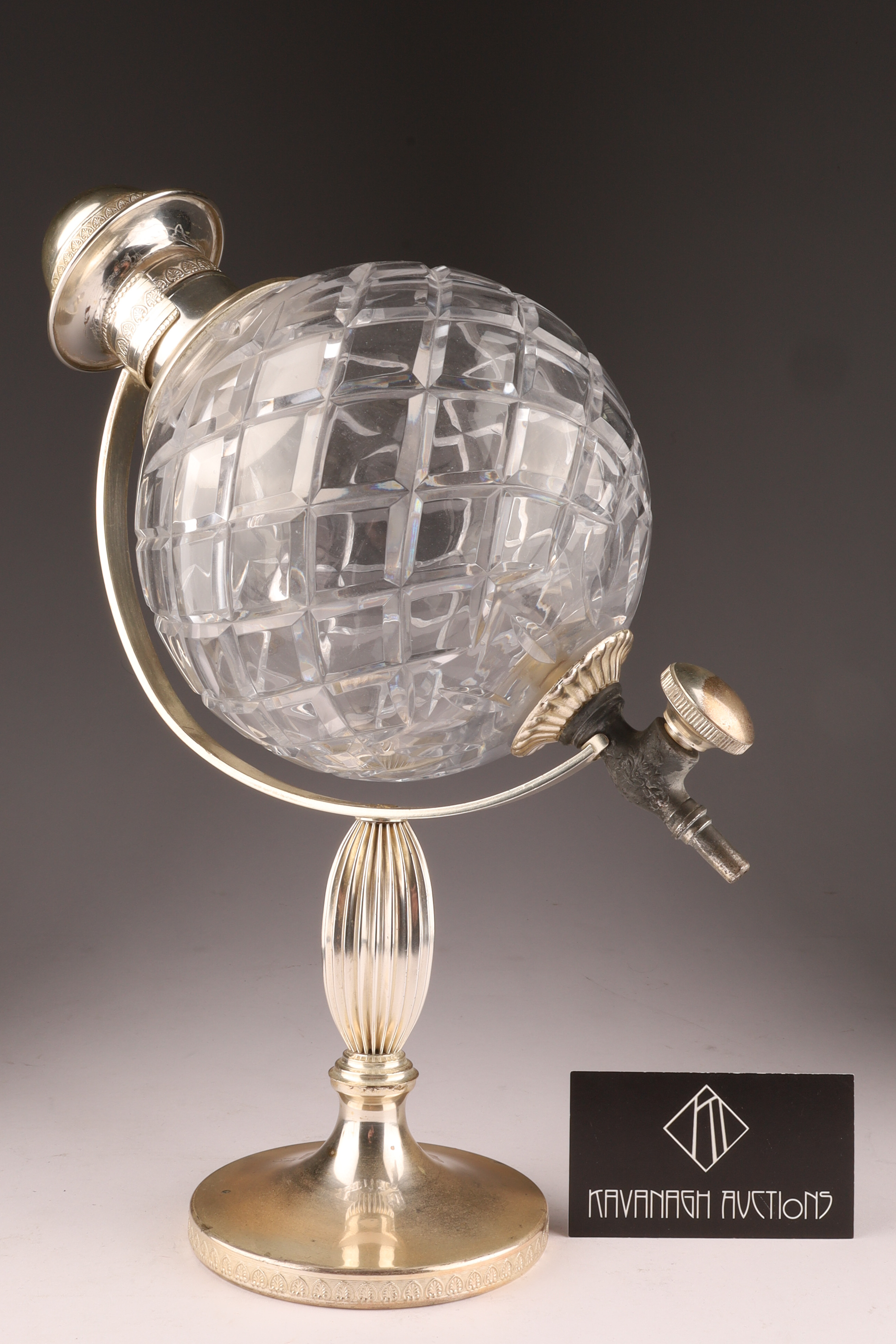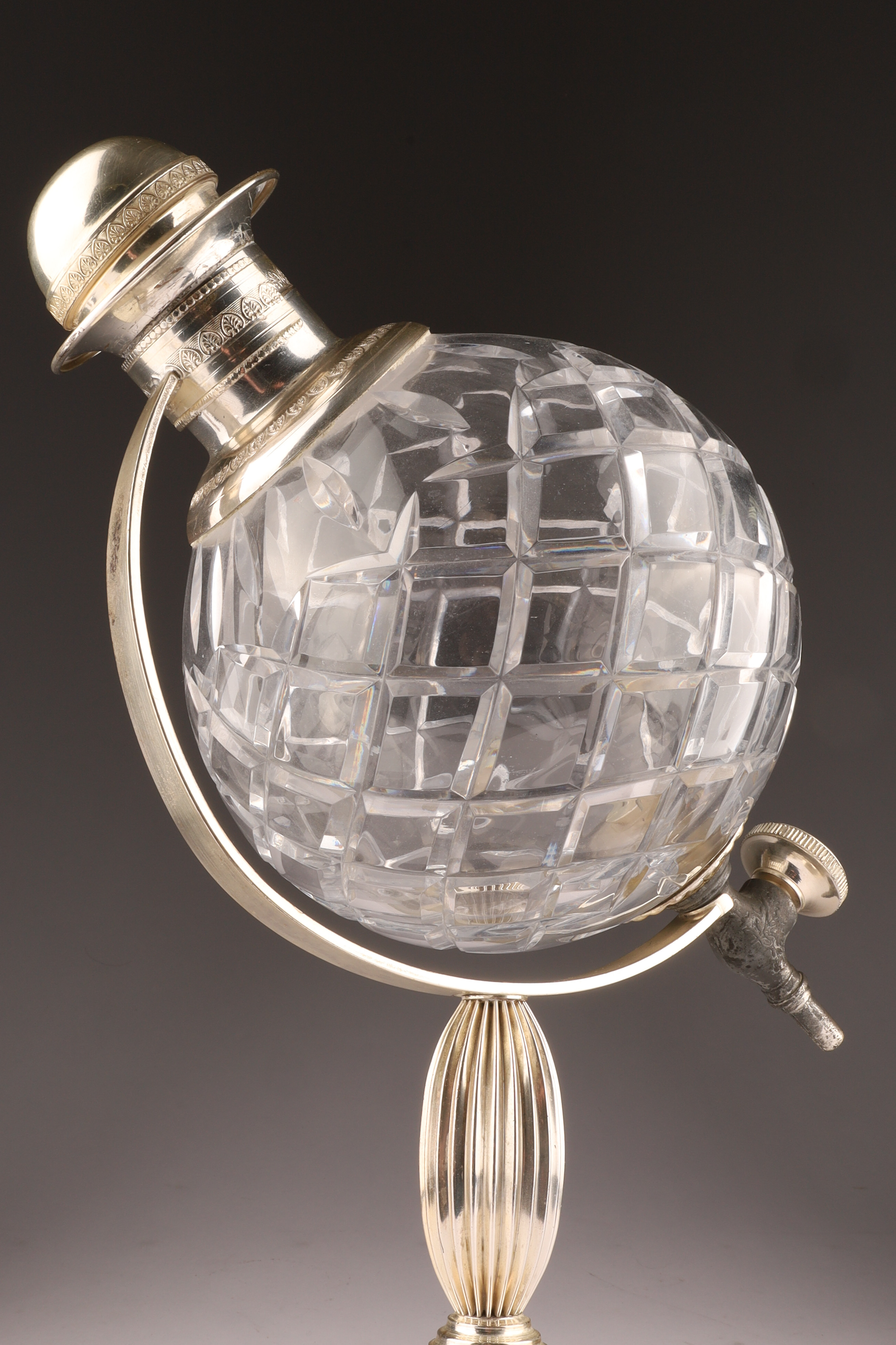 Art Deco Cut Crystal Silver Globe Decanter with Stand