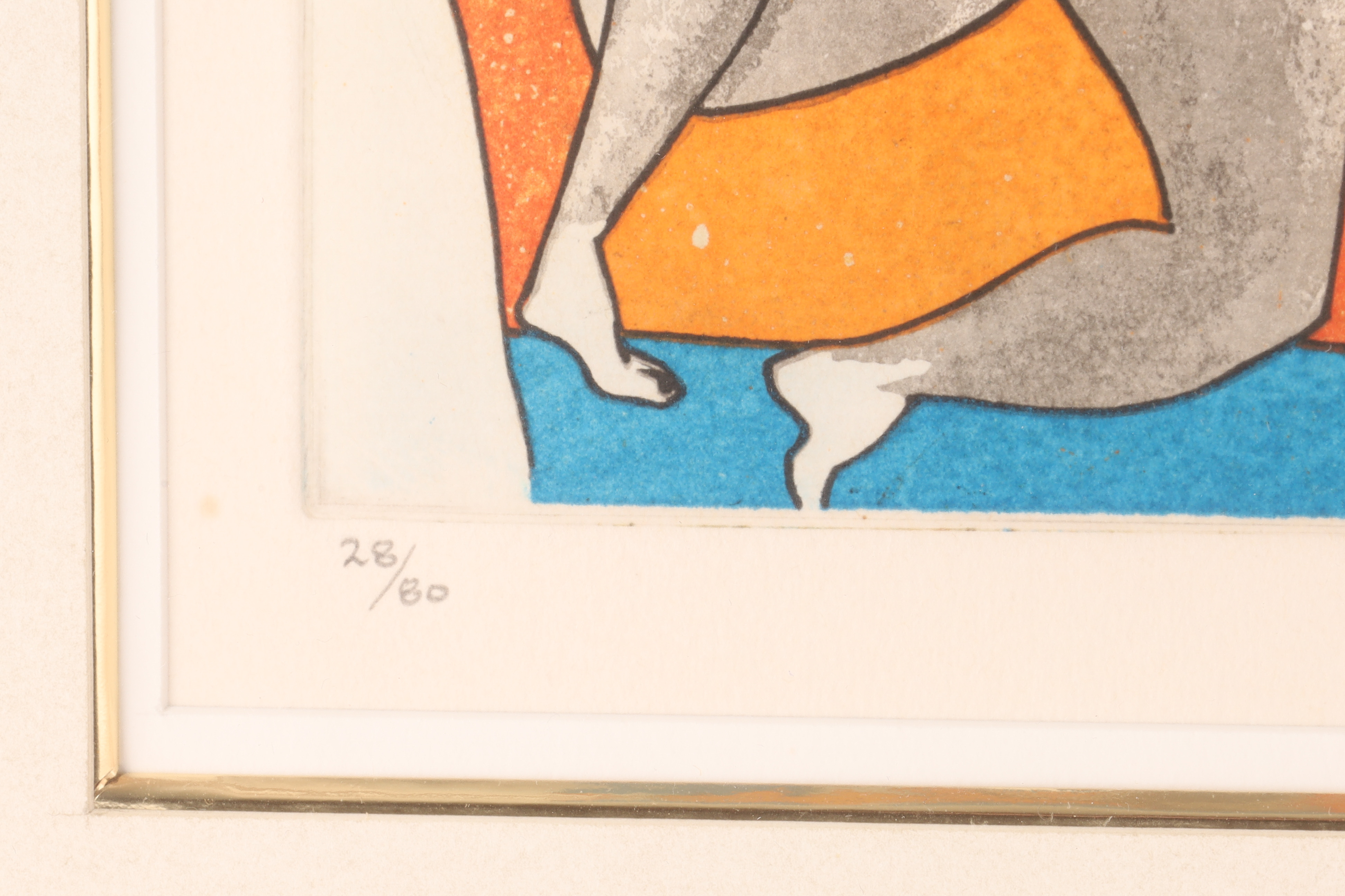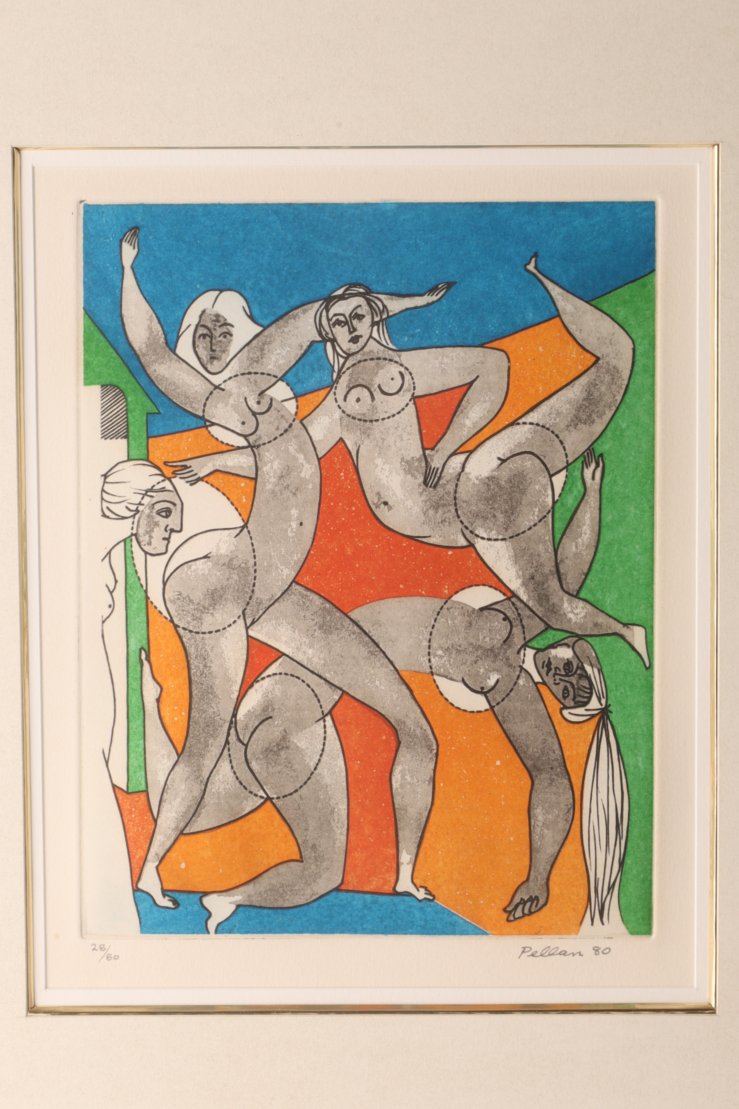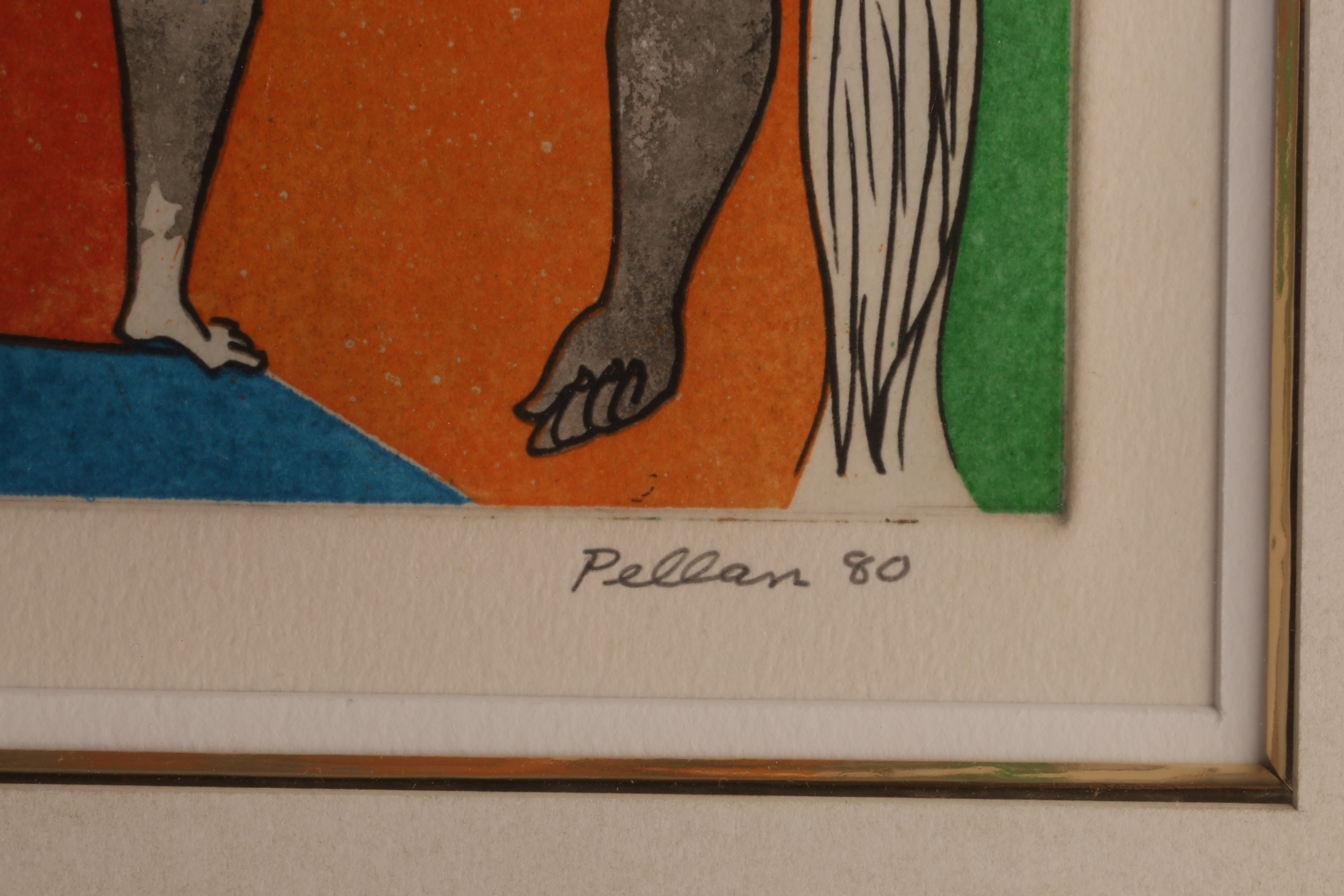 Alfred Pellan (Canadian, 1906-1988) Que le fruit de cette union – extrait du livre d’artiste “Le Cirque Sacré”, 1980 Eau-Forte en couleur sur papier signé et daté / Color etching on paper, signed and dated. Image measures 11.75 inches H x 9.5 W, frame measures 21.25 inches x 18.