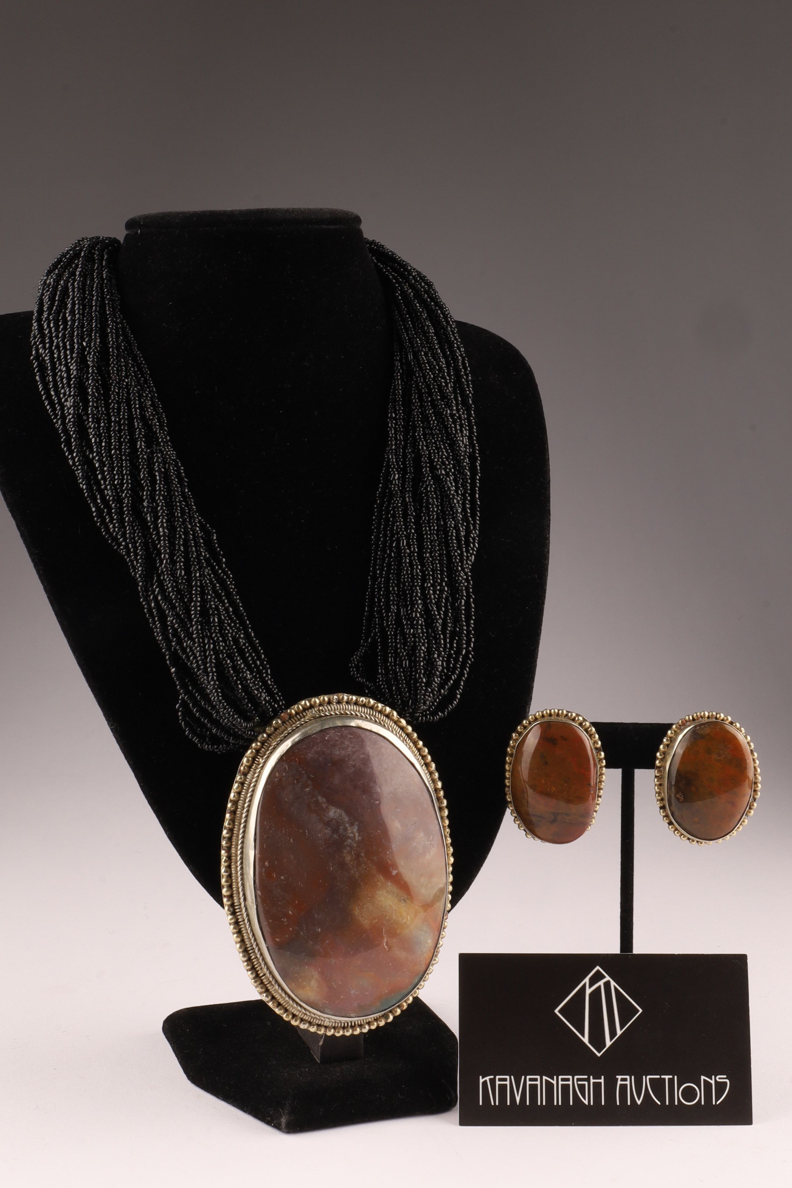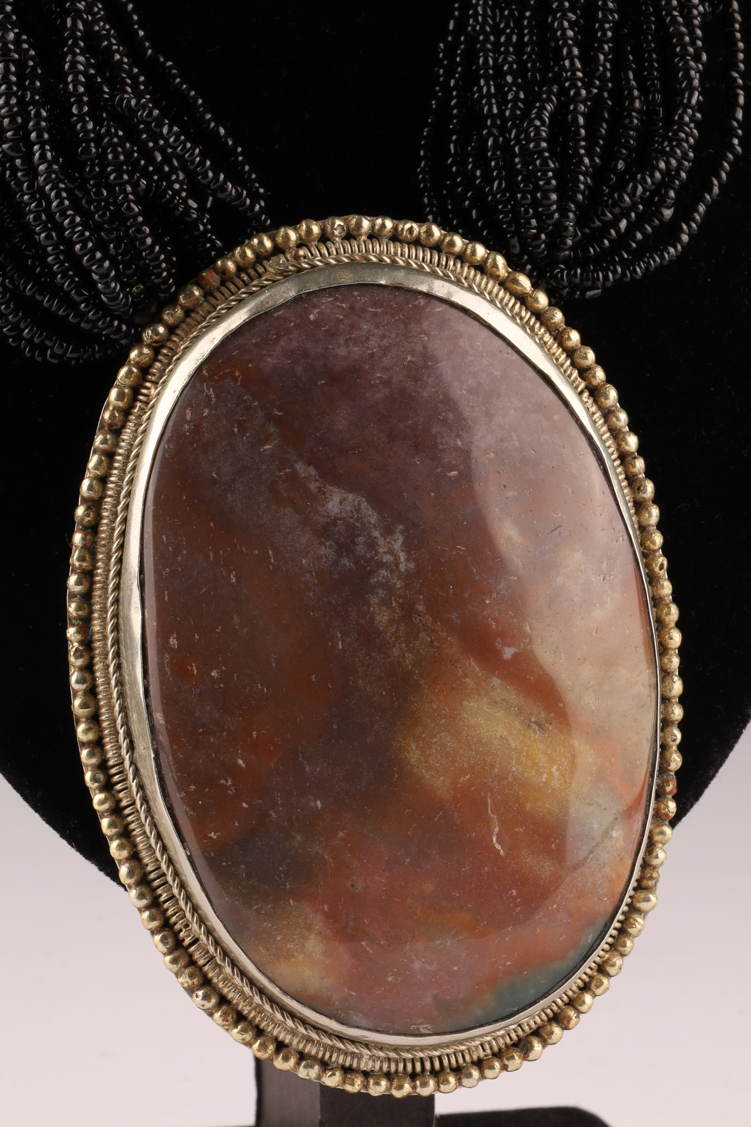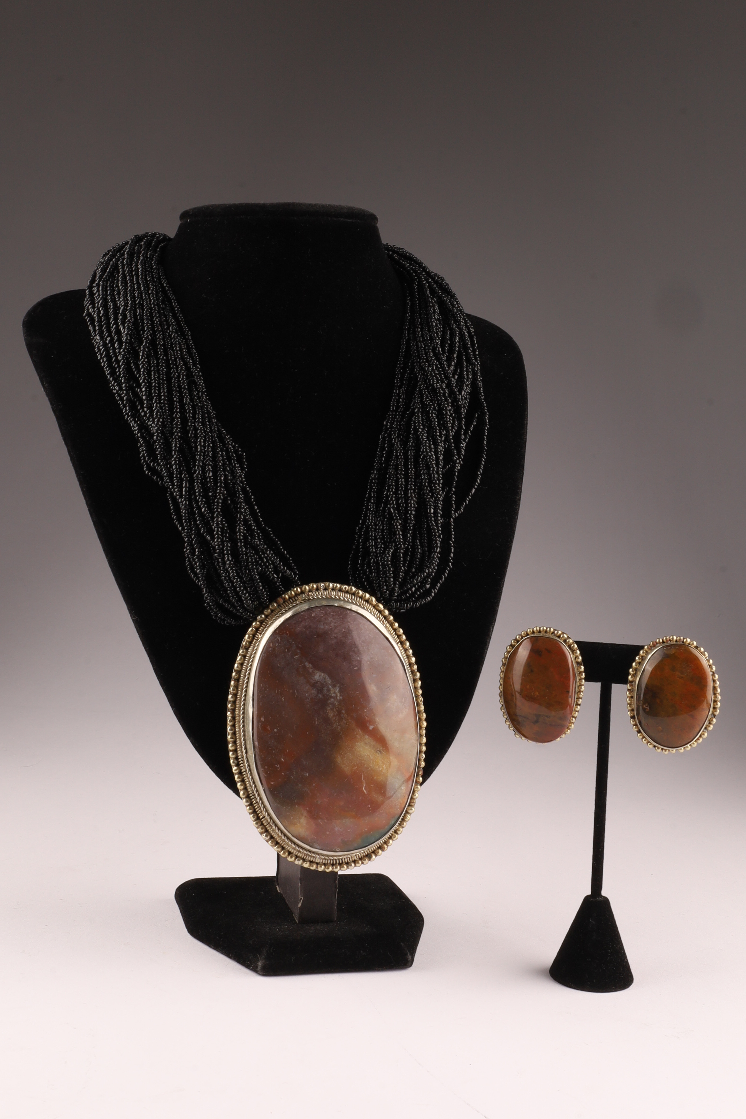 Set Multi Strand Black Beaded Necklace with Large Stone Pendant and Earrings